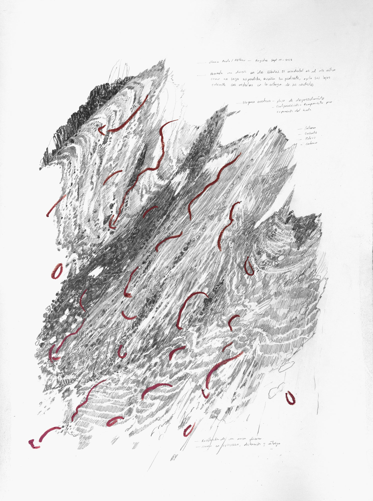 Natalia Castañeda’s work moves between a rationalist and scientific approach to the mountain that is topographic and documentary and a mythical and poetical, loving and sensitive attitude. In order to exhibit this methodological heterodoxy the pieces selected show its comprehensiveness as well as its fragmented incompleteness. It is an exploration of the limits of rational knowledge through the amalgam of evasion and chaos.