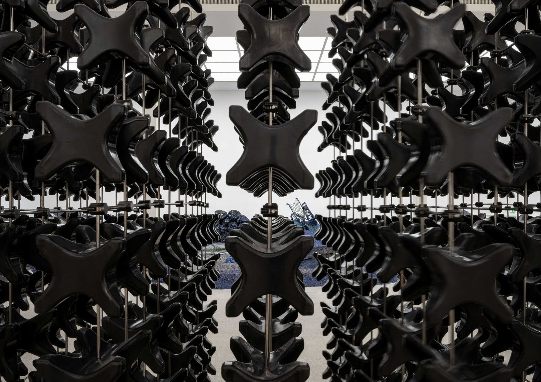 The exhibition unfolds as a large-scale installation structured around absence, death, and mourning. Suspended from the ceiling, a monumental sculpture composed of approximately nine hundred autopsy neck rests forms a bullet-like shape facing a large circular mirror. The object evokes both the lethal economies of extraction and historical loading plans of slave ship plans, in which enslaved bodies were densely packed into cargo holds, pointing to the continuities of brutality against and commodification of Black bodies. Rather than depicting violence directly, the work activates memory and imagination, allowing associations to emerge in the minds of viewers. As the artist explains: