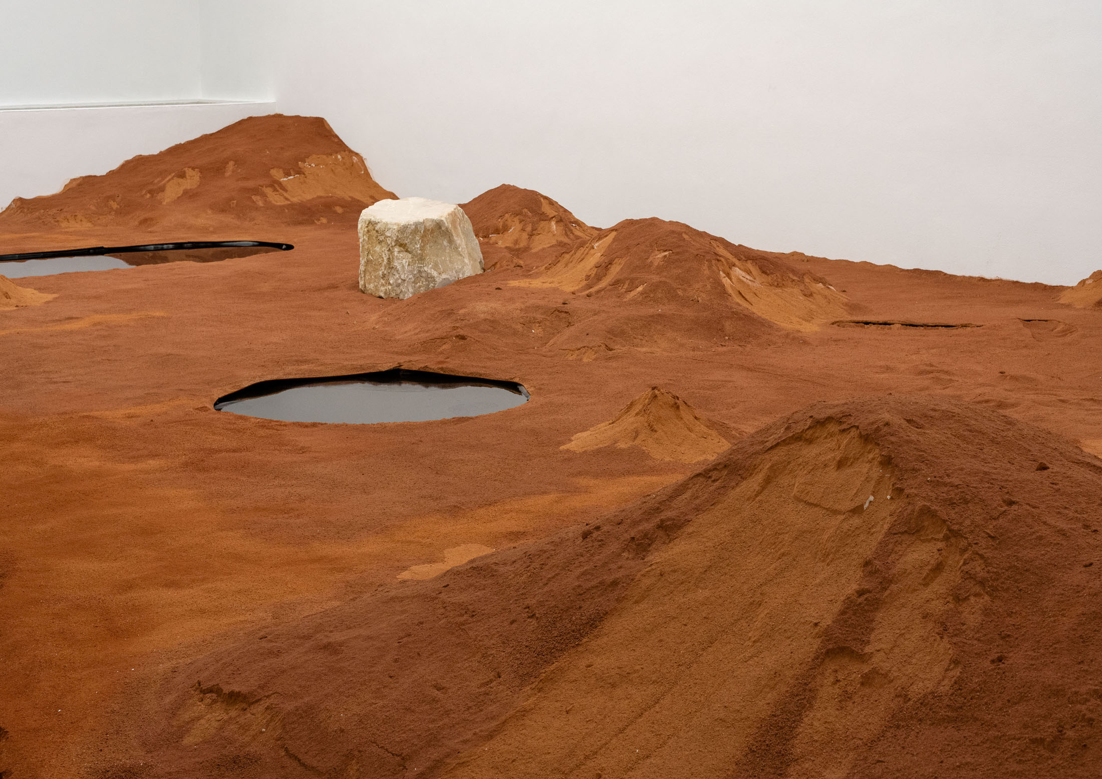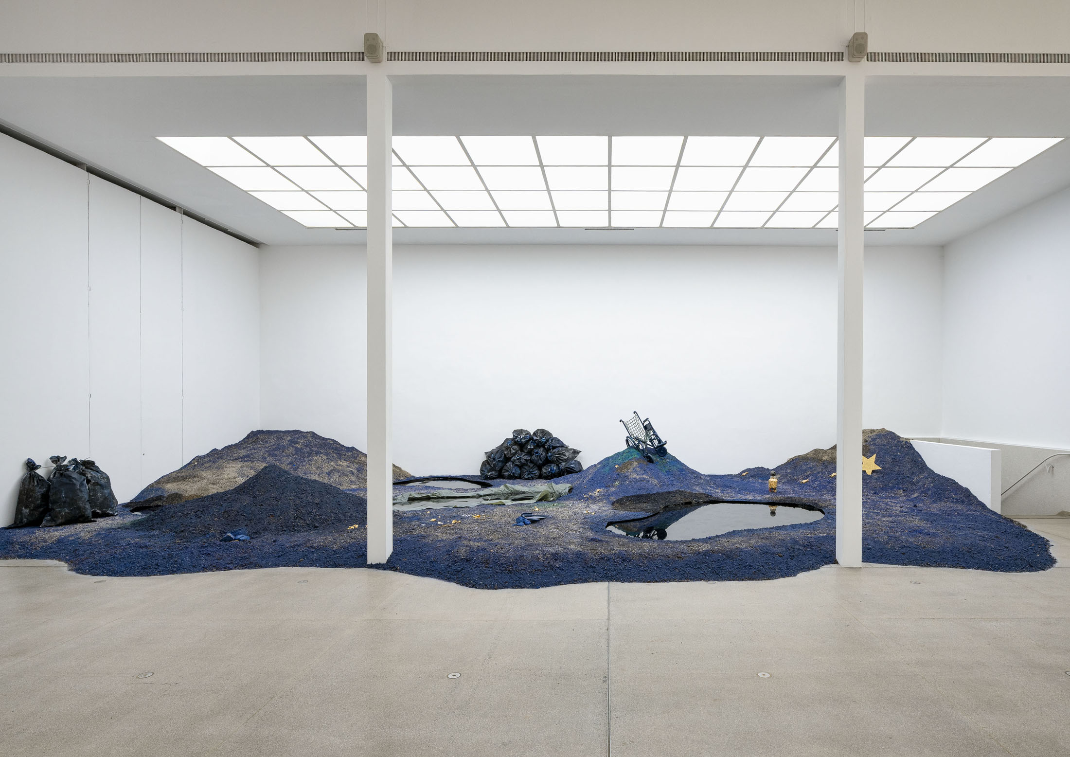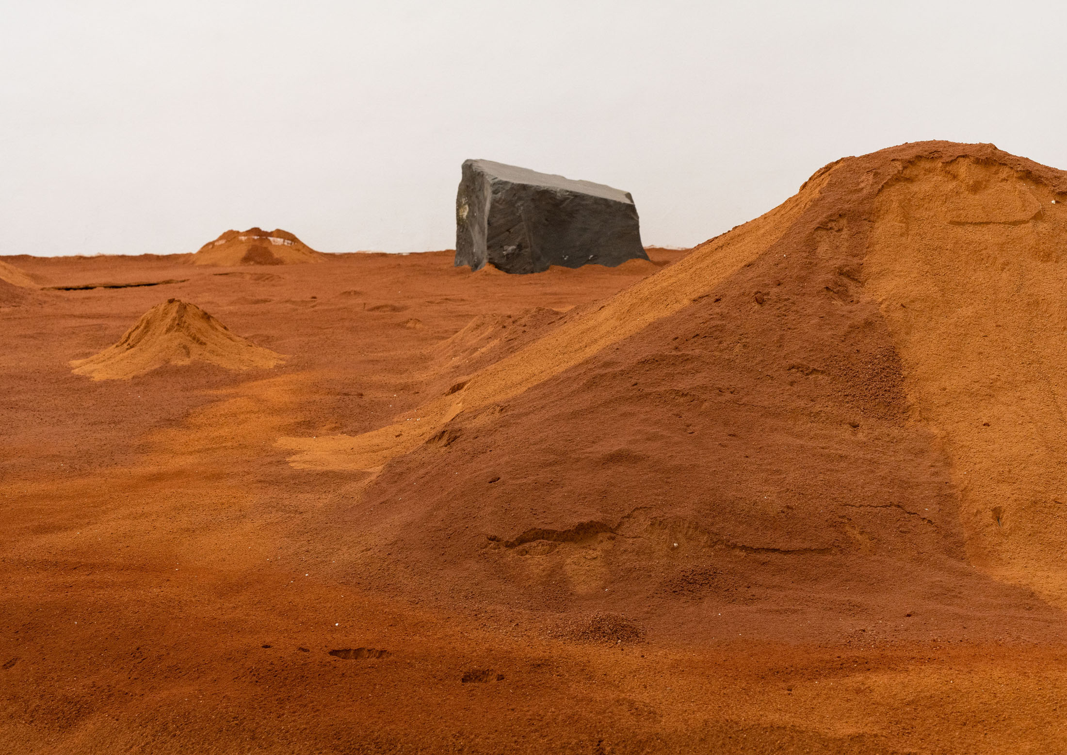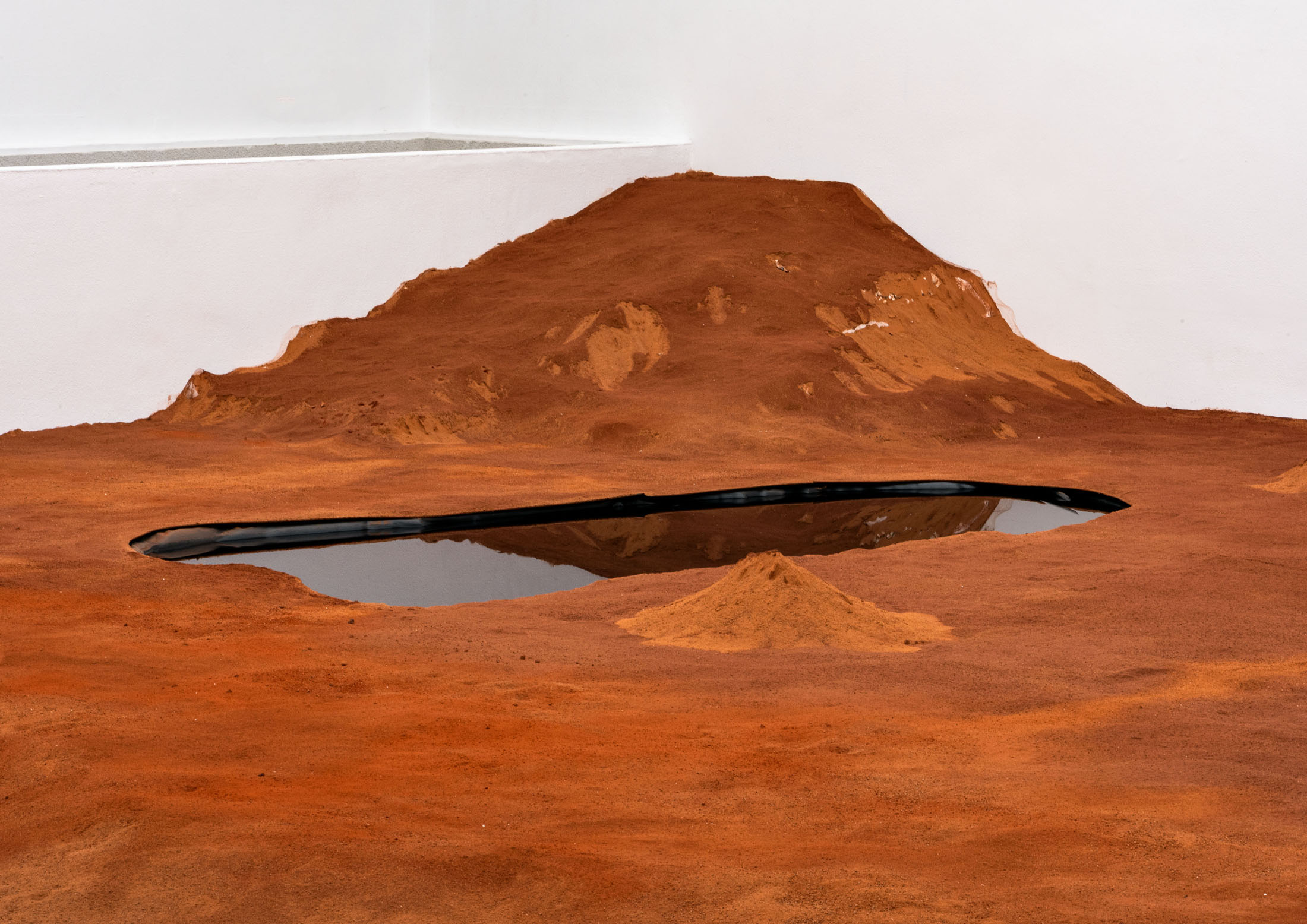 Surrounding the central sculpture are artificial topographical landscapes in white, red, and blue: white stands for white hegemony, kaolin, and sand; red references the distinctive colour of soil in the artist’s south-eastern Nigerian homeland; and blue alludes to industrial and artisanal cobalt mining sites, where youths, women, and children work under inhumane conditions. The colours also invoke the national colours of Global North countries and China that are deeply implicated in global resource