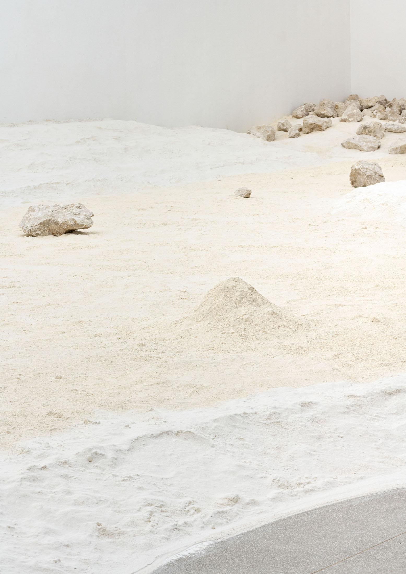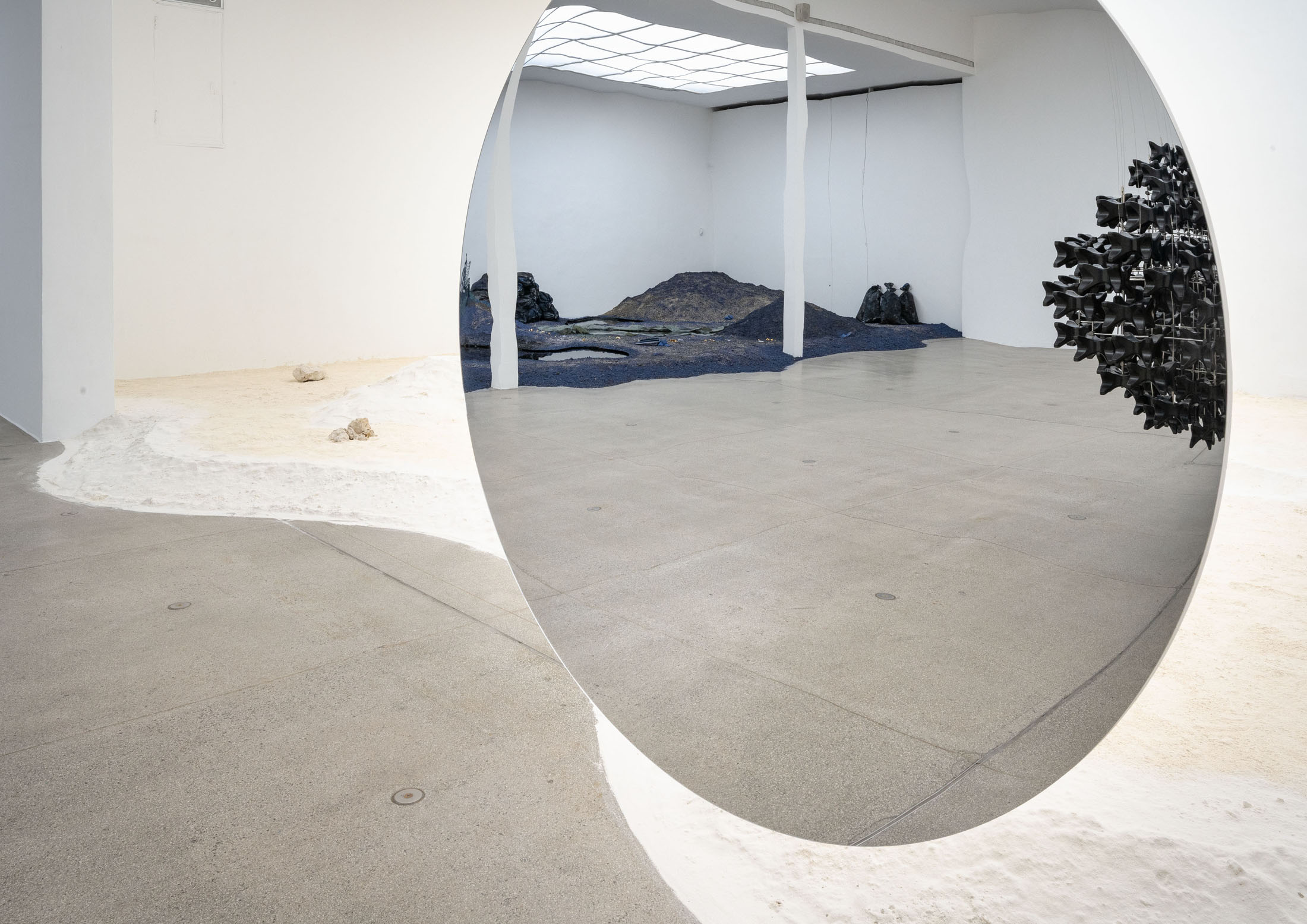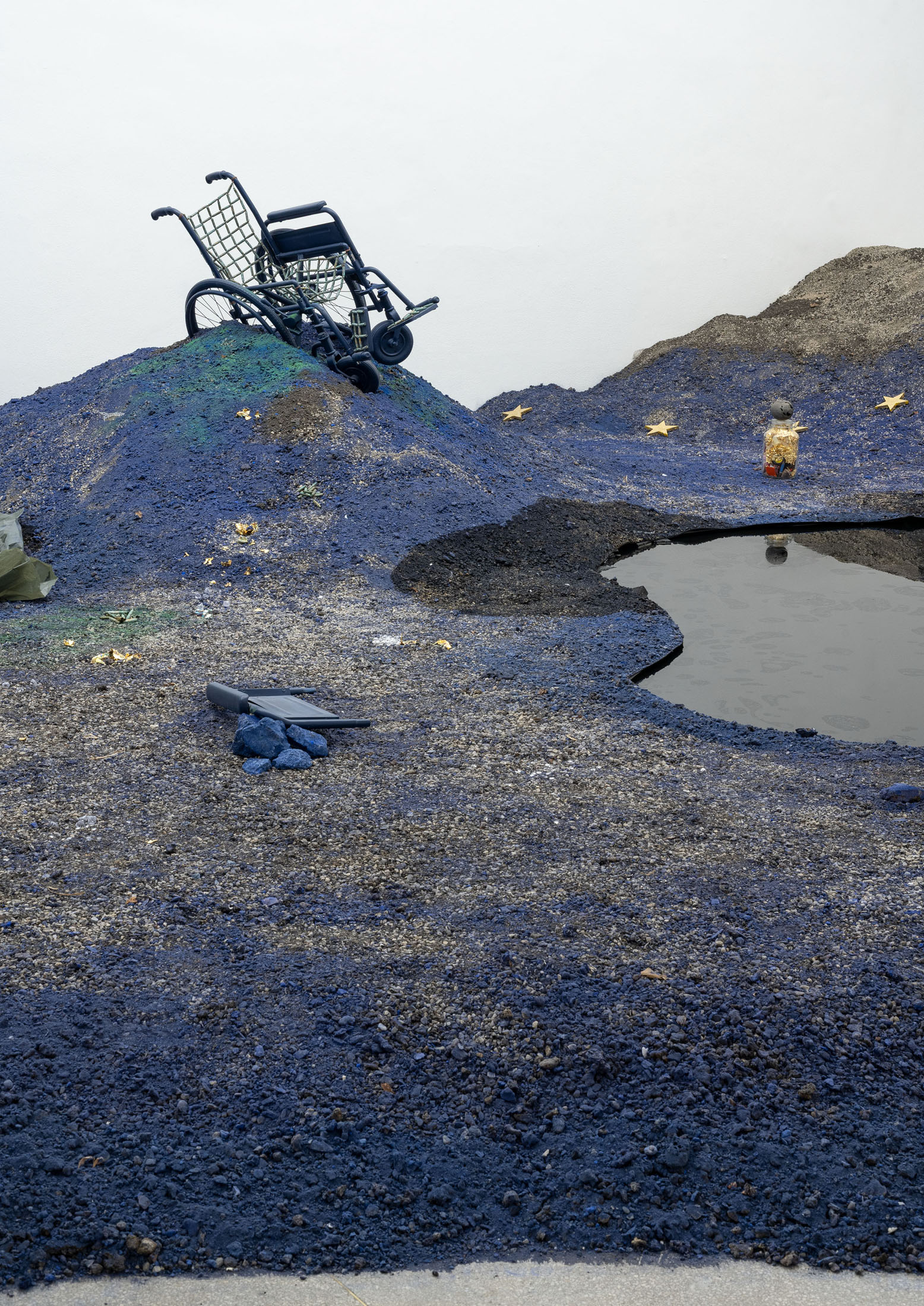 Surrounding the central sculpture are artificial topographical landscapes in white, red, and blue: white stands for white hegemony, kaolin, and sand; red references the distinctive colour of soil in the artist’s south-eastern Nigerian homeland; and blue alludes to industrial and artisanal cobalt mining sites, where youths, women, and children work under inhumane conditions. The colours also invoke the national colours of Global North countries and China that are deeply implicated in global resource