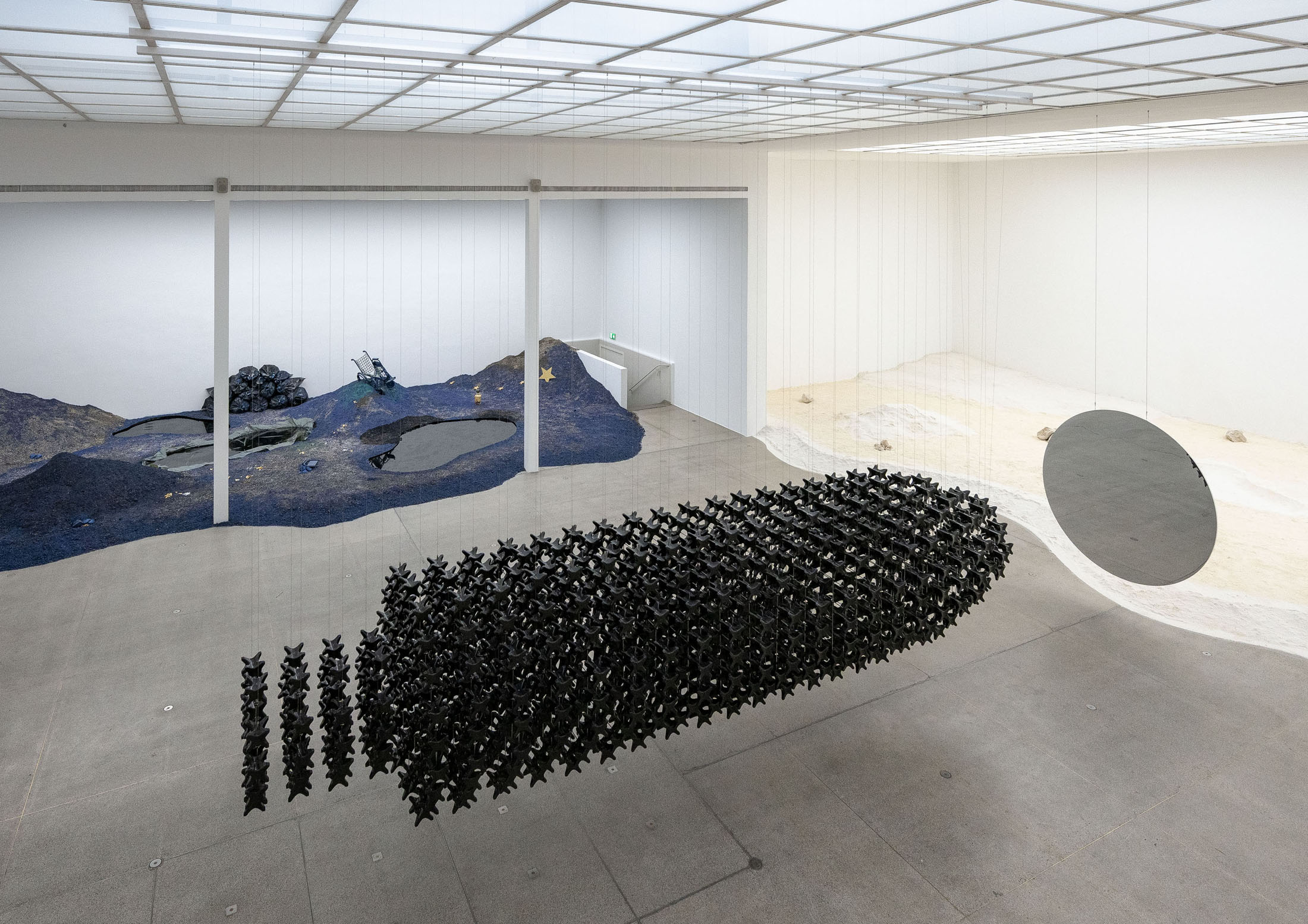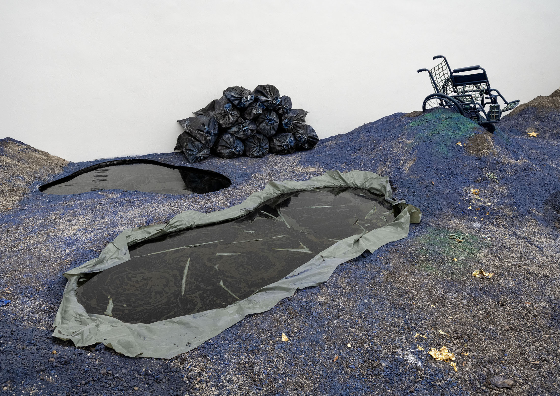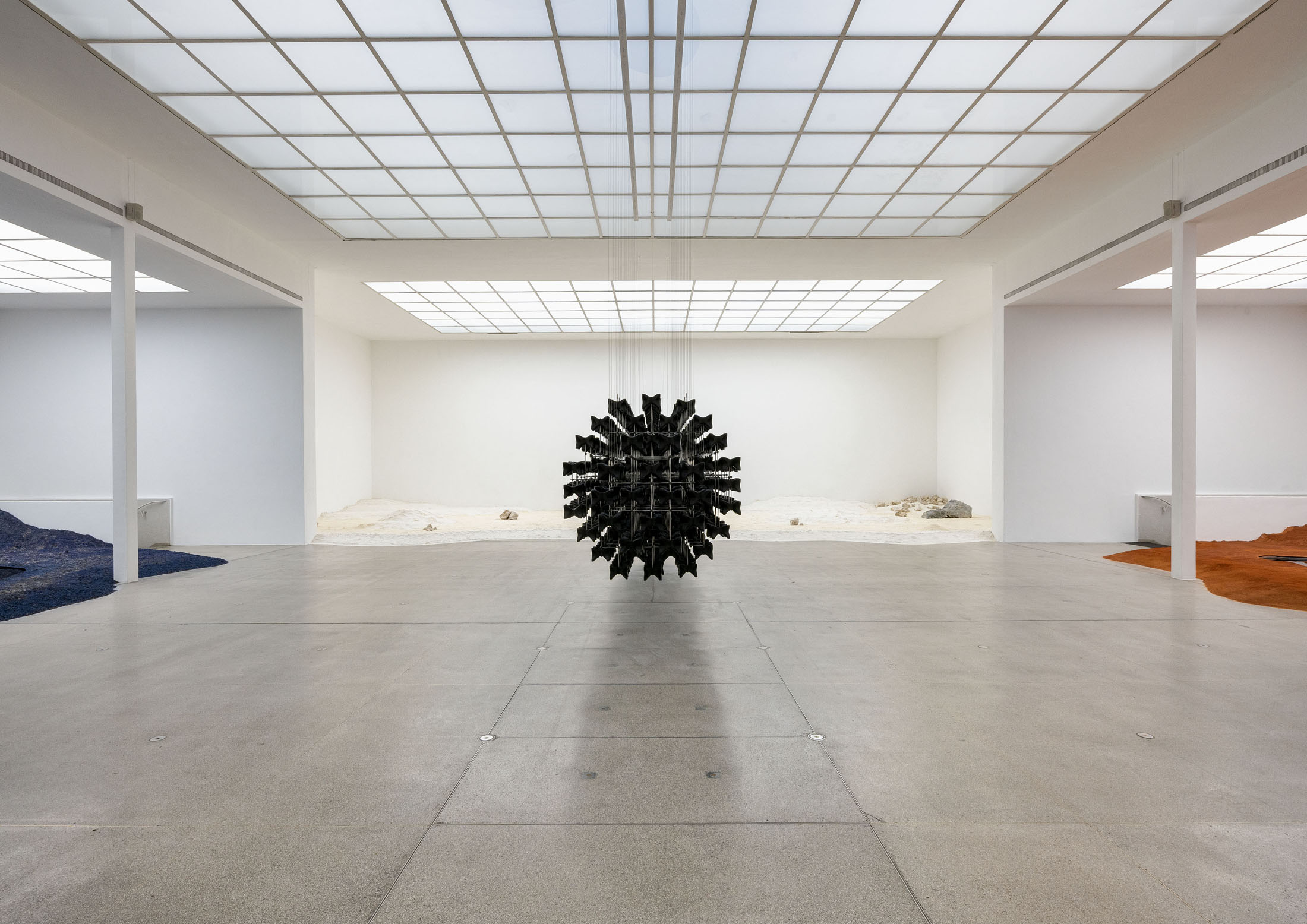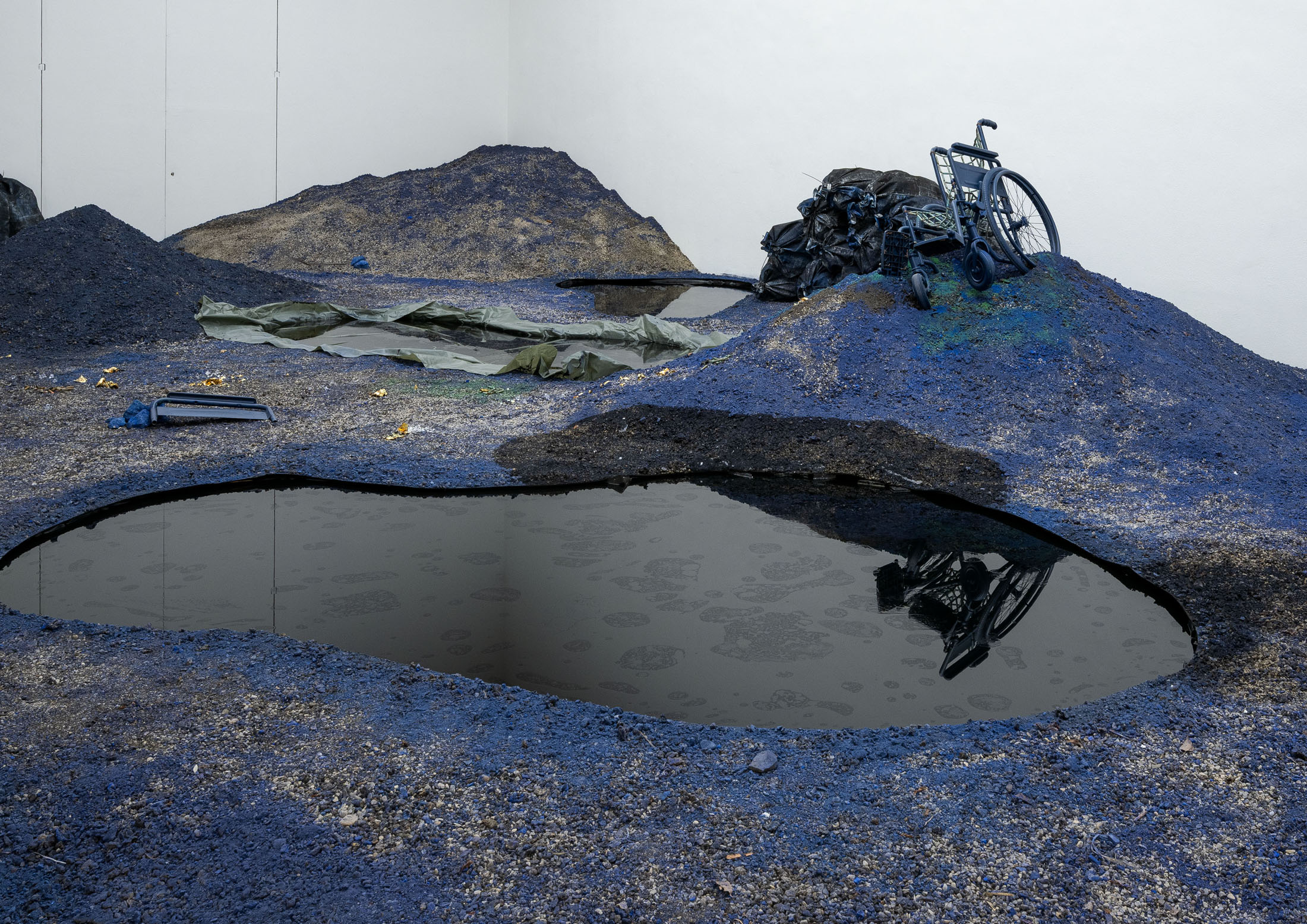 Surrounding the central sculpture are artificial topographical landscapes in white, red, and blue: white stands for white hegemony, kaolin, and sand; red references the distinctive colour of soil in the artist’s south-eastern Nigerian homeland; and blue alludes to industrial and artisanal cobalt mining sites, where youths, women, and children work under inhumane conditions. The colours also invoke the national colours of Global North countries and China that are deeply implicated in global resource