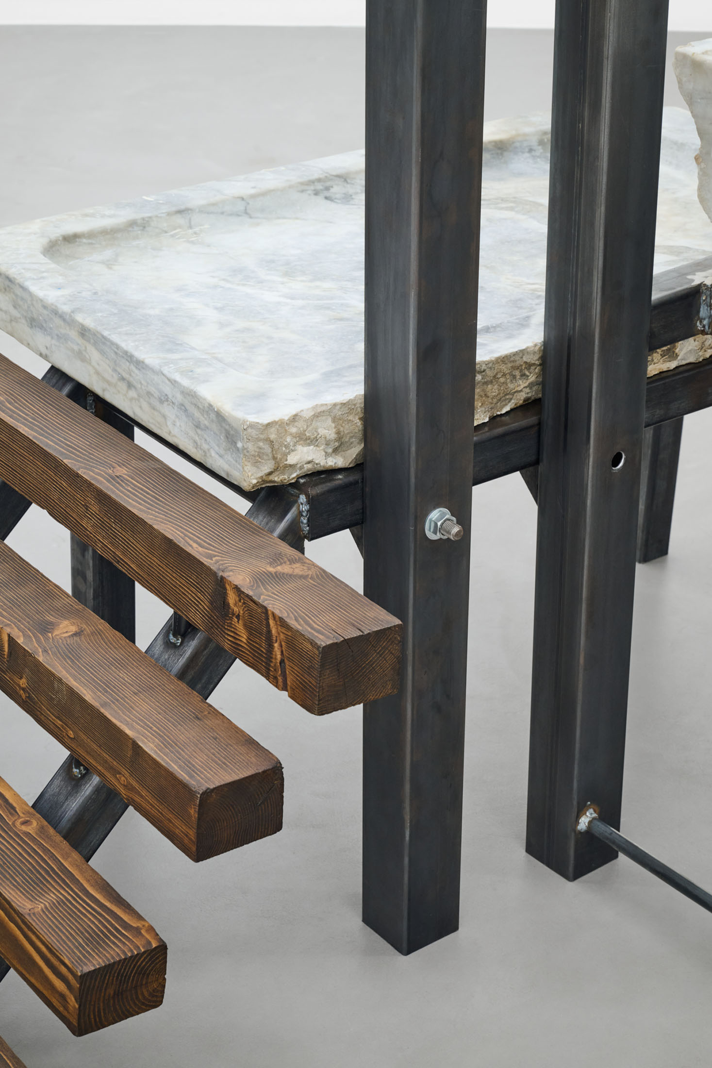 Within the exhibition, artistic practices are presented that address, from different perspectives, the tensions between control, space, and the possibility of escape. Francesca Pionati investigates the relationships between urban infrastructures, governance, and contemporary rituals. Her work transforms controlled spaces into sites of informal resistance and autonomous architectures, staging political and aesthetic tensions while redefining ways of inhabiting and perceiving the urban environment. Andrea Zittel, meanwhile, explores modes of dwelling as artistic and social practice, questioning how spaces, objects, and daily routines can be reimagined to challenge conventions and stimulate new forms of existence. In Friedrich Andreoni’s works, objects overturn their roles: instruments designed to open become barriers, escape routes turn into dead ends; while Zazzaro Otto traverses social hierarchies by transforming heterogeneous materials into ironic devices that stage alienation and the contradictions of contemporary precarity. Marko Tadić investigates utopia and exhibition politics, exploring the idea of display through narrative devices and visual forms that redefine both the exhibition format and the ways of experiencing the gallery space. Hernán Pitto Bellocchio reinterprets centers of power as ruins, stripping them of their aura of stability. Simon Starling interweaves natural, colonial, and cultural histories, transforming objects, spaces, and processes into discursive operations that reveal the deep dynamics of memory, historical traces, and the ways the past is constructed and reinterpreted.