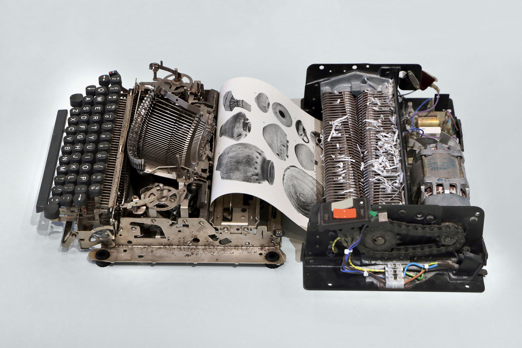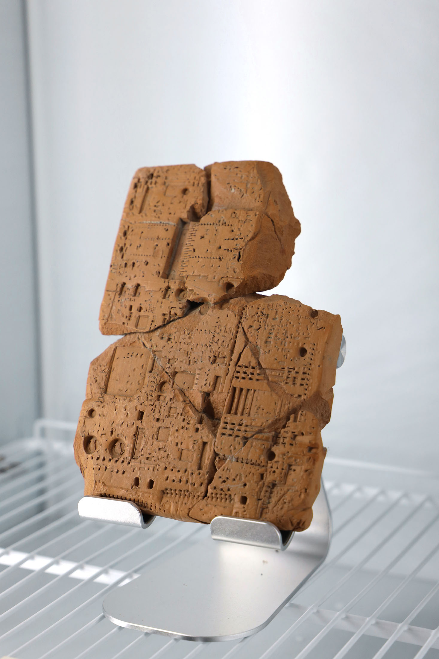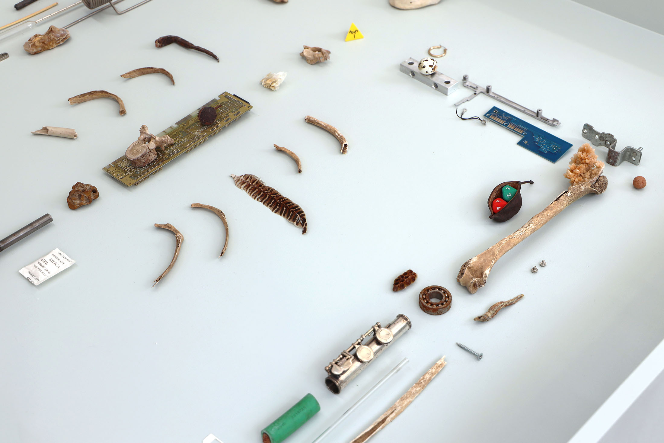 The exhibition space itself mirrors this vision. It refuses stability, instead provoking astonishment around every corner. Materials shift between states: organic remains blur into industrial waste, digital fragments appear fossilized, images are torn and recombined into ambiguous narratives. These juxtapositions propose a different mode of historiography—one not governed by clarity, sequence, or hierarchy, but by erosion, mutation, and recomposition. In this landscape, memory is distributed and partial; knowledge emerges not through control, but through entanglement.