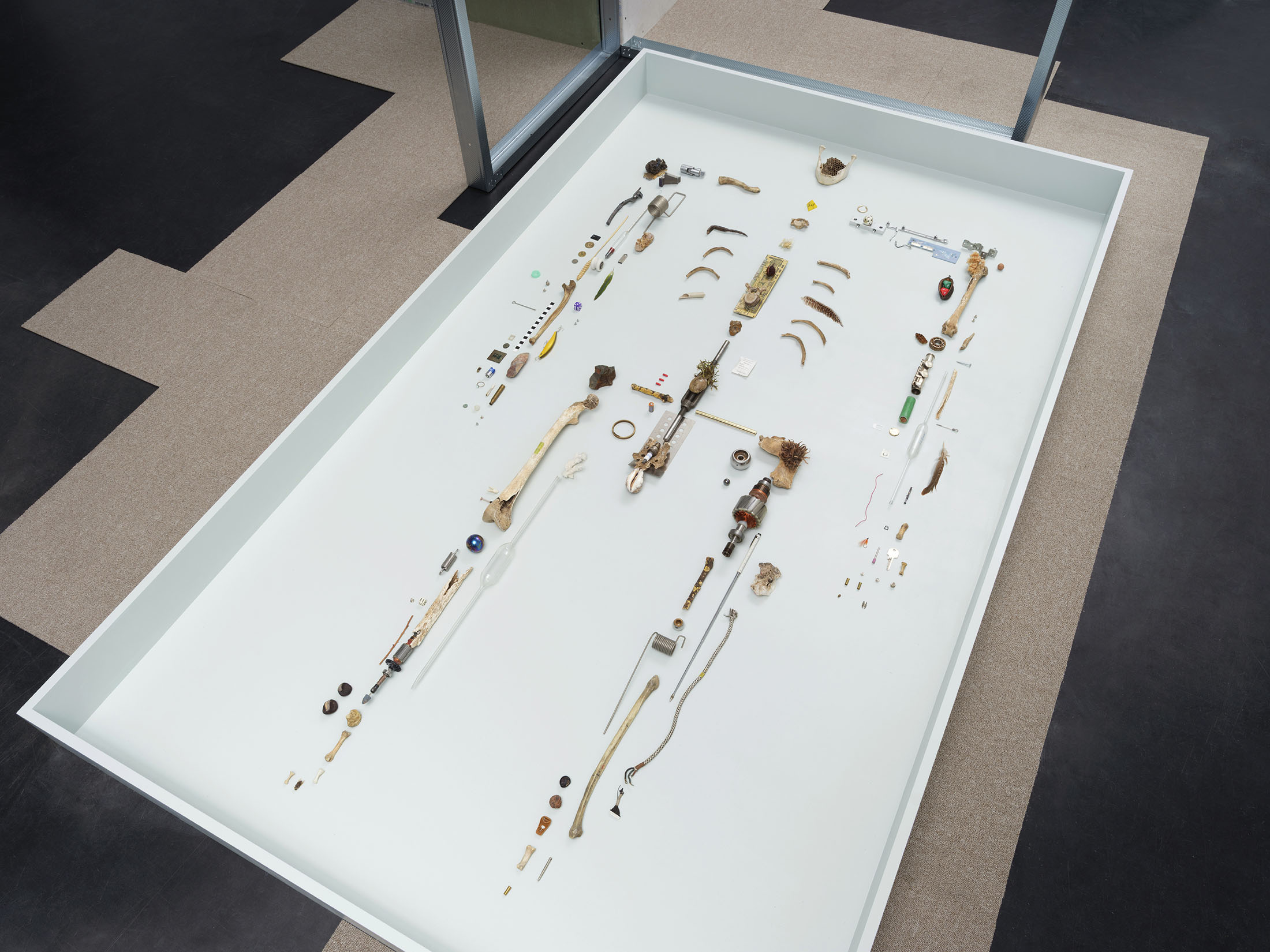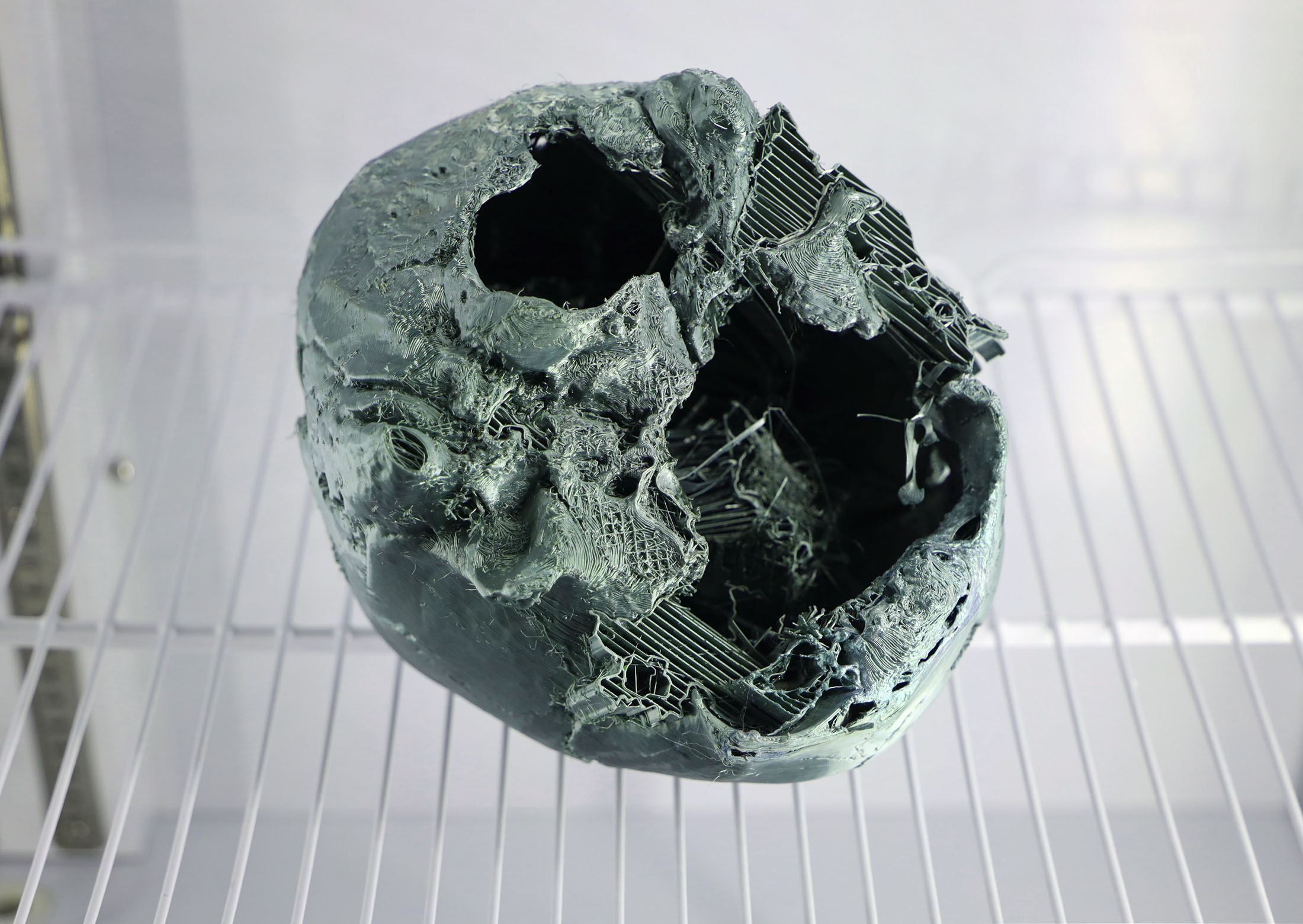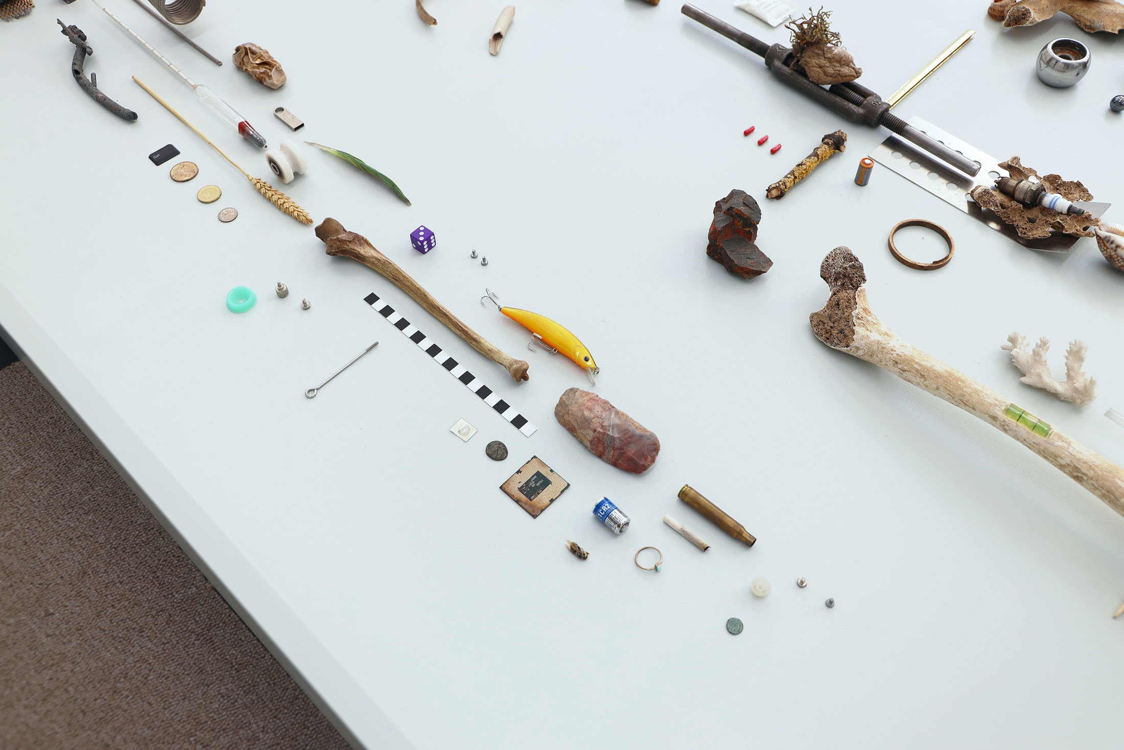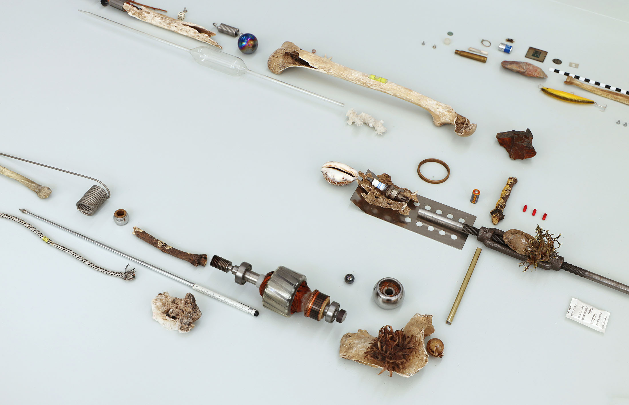 The exhibition space itself mirrors this vision. It refuses stability, instead provoking astonishment around every corner. Materials shift between states: organic remains blur into industrial waste, digital fragments appear fossilized, images are torn and recombined into ambiguous narratives. These juxtapositions propose a different mode of historiography—one not governed by clarity, sequence, or hierarchy, but by erosion, mutation, and recomposition. In this landscape, memory is distributed and partial; knowledge emerges not through control, but through entanglement.