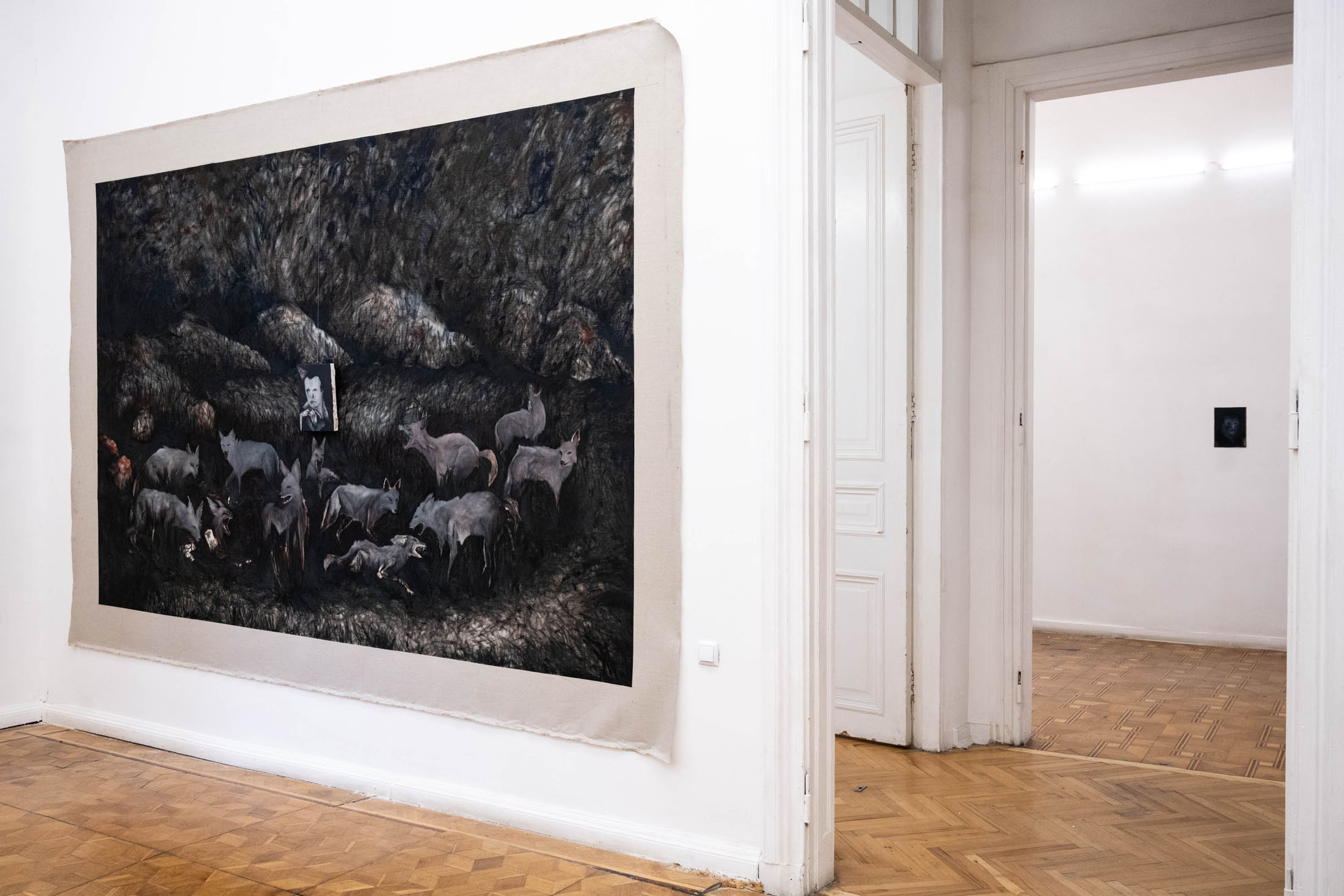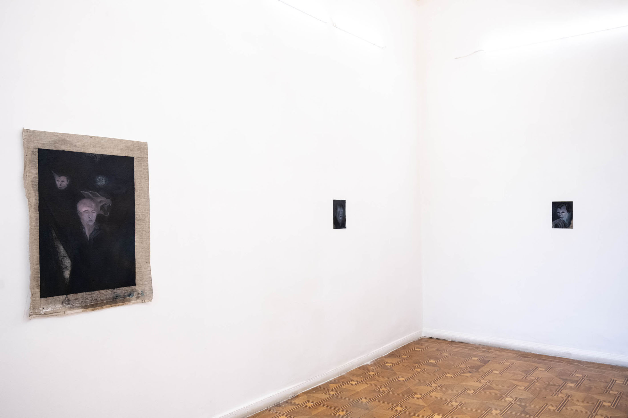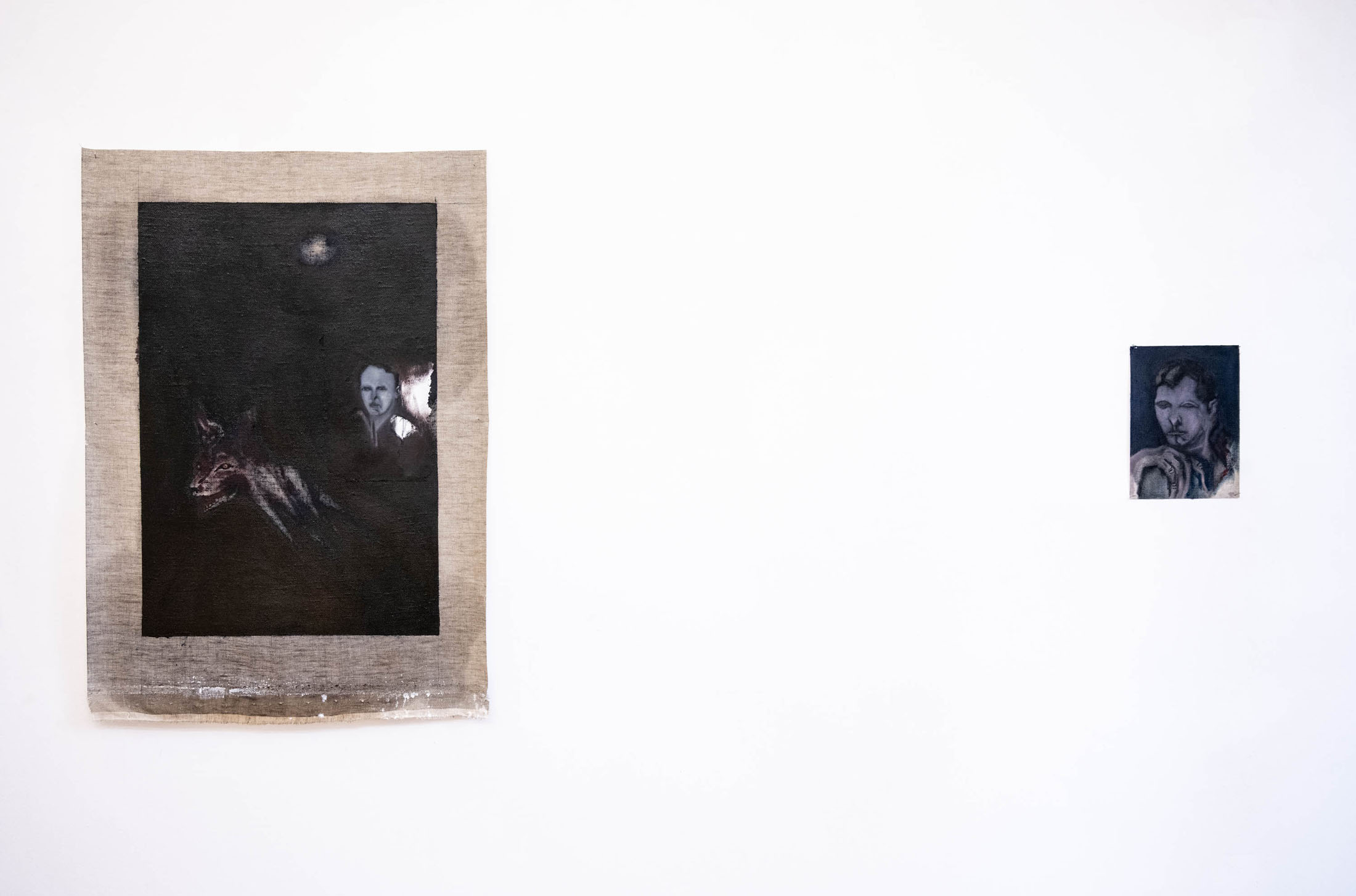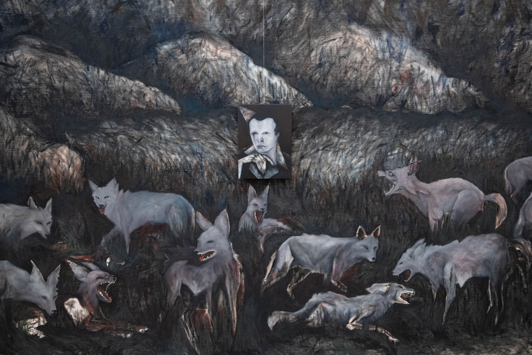 His paintings – made with oil on grounded wood (following the tradition of Orthodox iconographic paintings in the region) and more recently with oil on canvas — convey an atmosphere of wordlessness. Feral jackals live silently with human figures; darkness and cold seeming to seep through all sense of communication between these solitary characters, who themselves appear to have disintegrated into the wilderness. In some paintings, human figures almost disappear into nature entirely. In these scenes Kutateladze portrays people seeming to merge with their wild surroundings but growing more distant from one another.