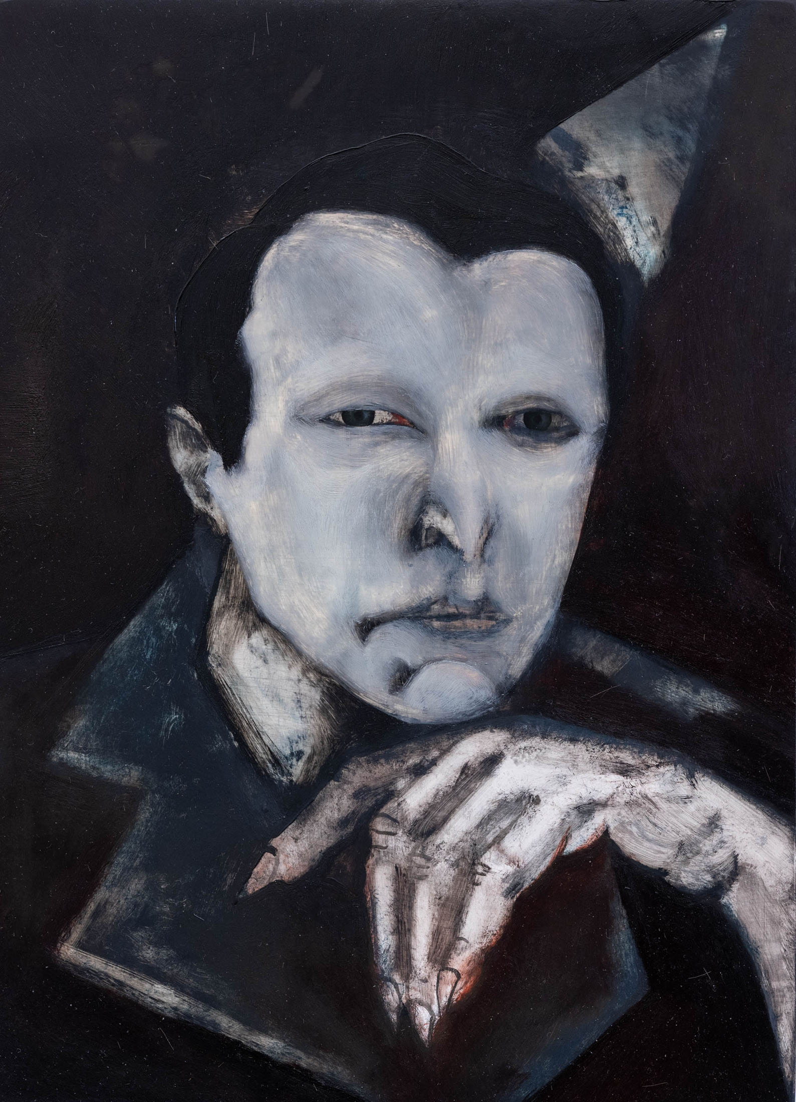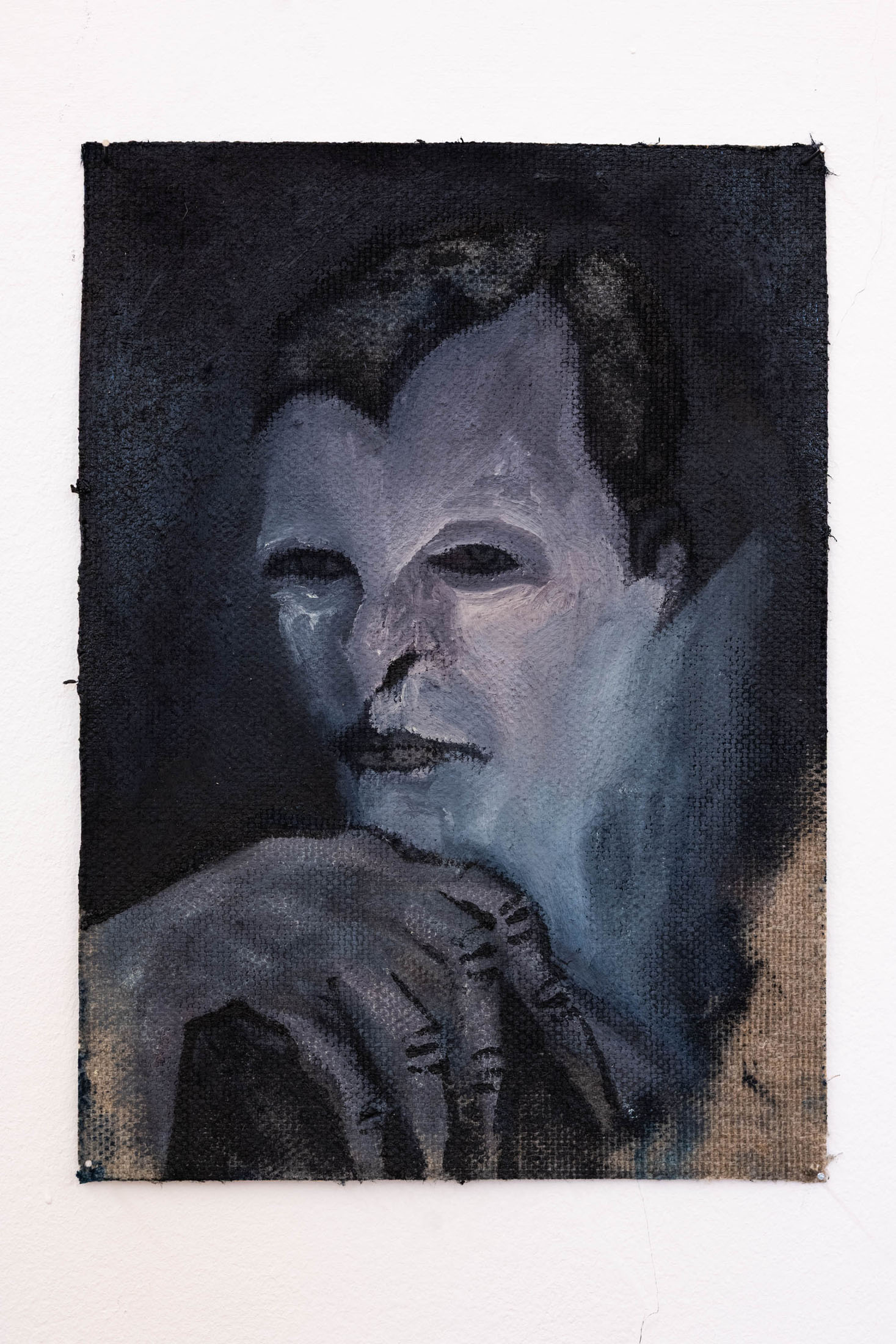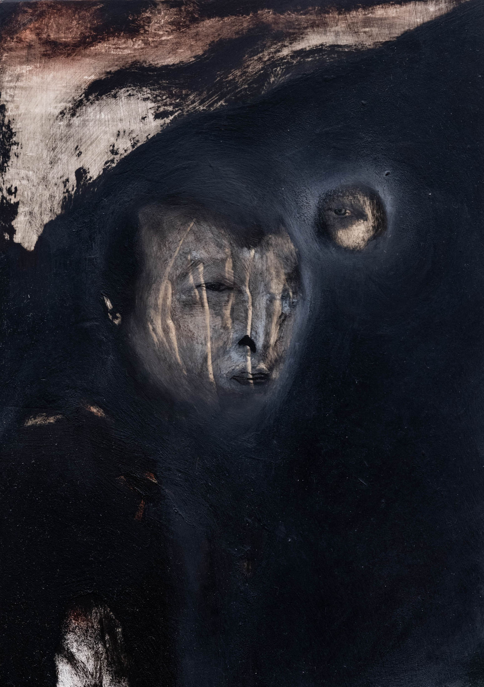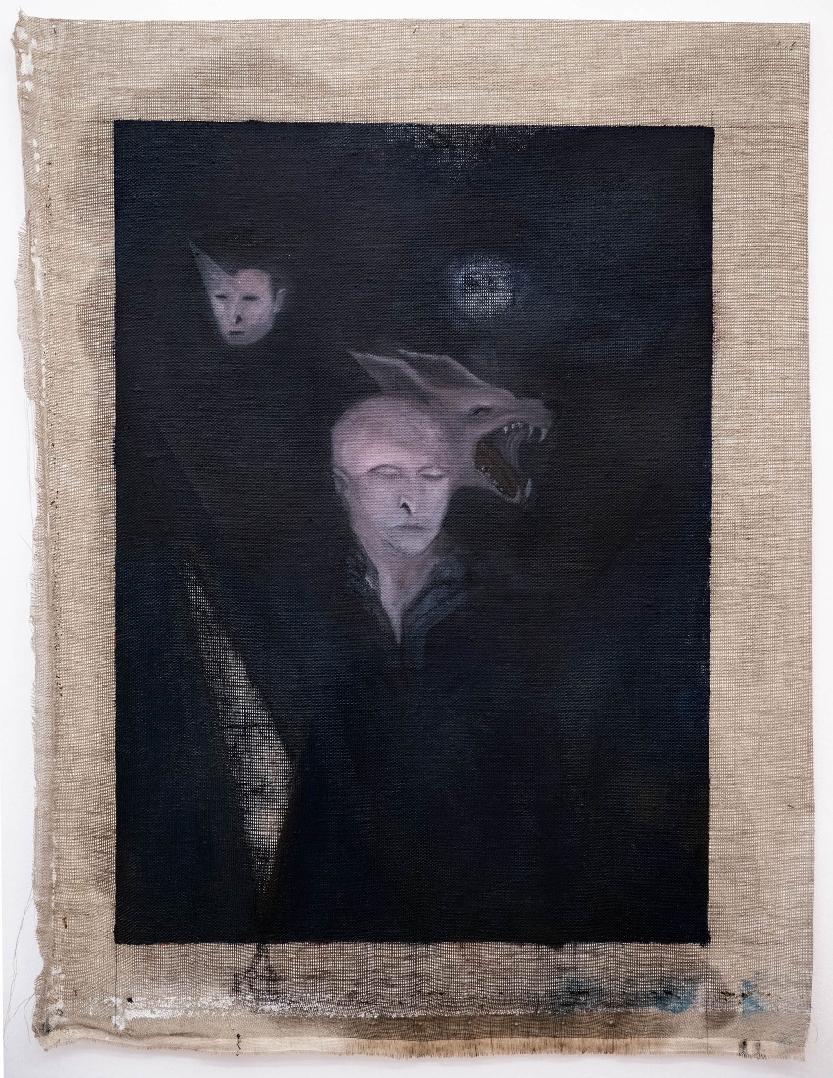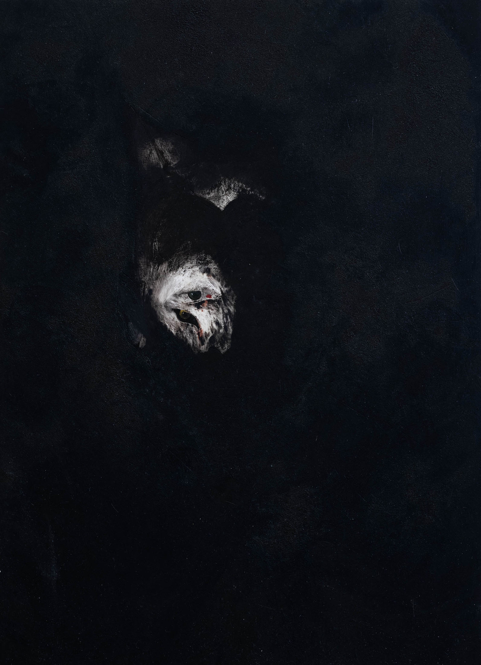 His paintings – made with oil on grounded wood (following the tradition of Orthodox iconographic paintings in the region) and more recently with oil on canvas — convey an atmosphere of wordlessness. Feral jackals live silently with human figures; darkness and cold seeming to seep through all sense of communication between these solitary characters, who themselves appear to have disintegrated into the wilderness. In some paintings, human figures almost disappear into nature entirely. In these scenes Kutateladze portrays people seeming to merge with their wild surroundings but growing more distant from one another.