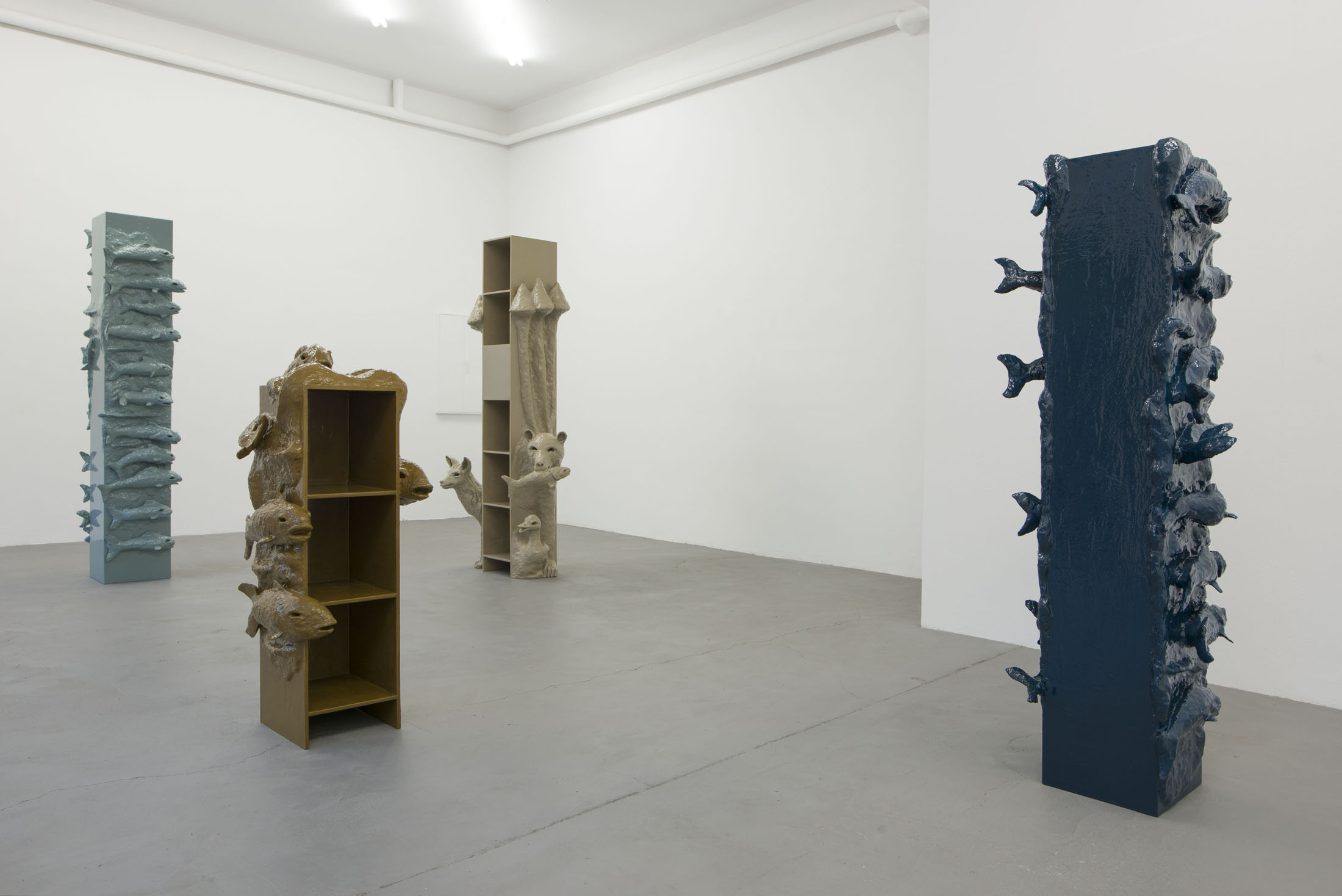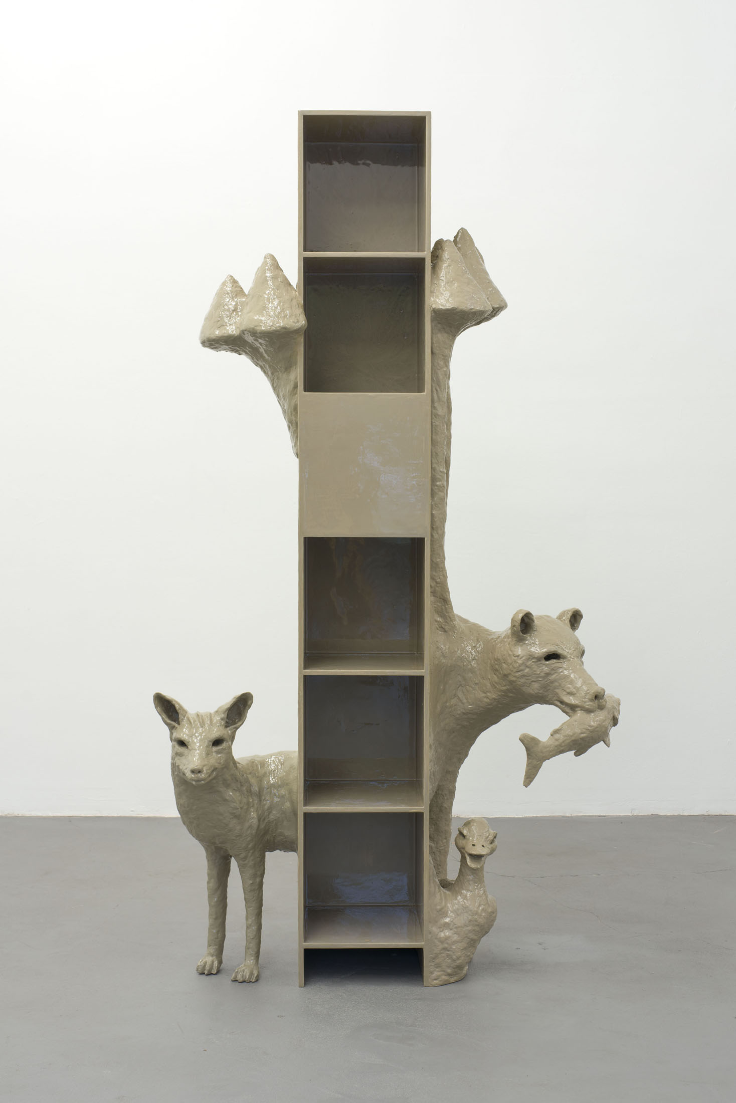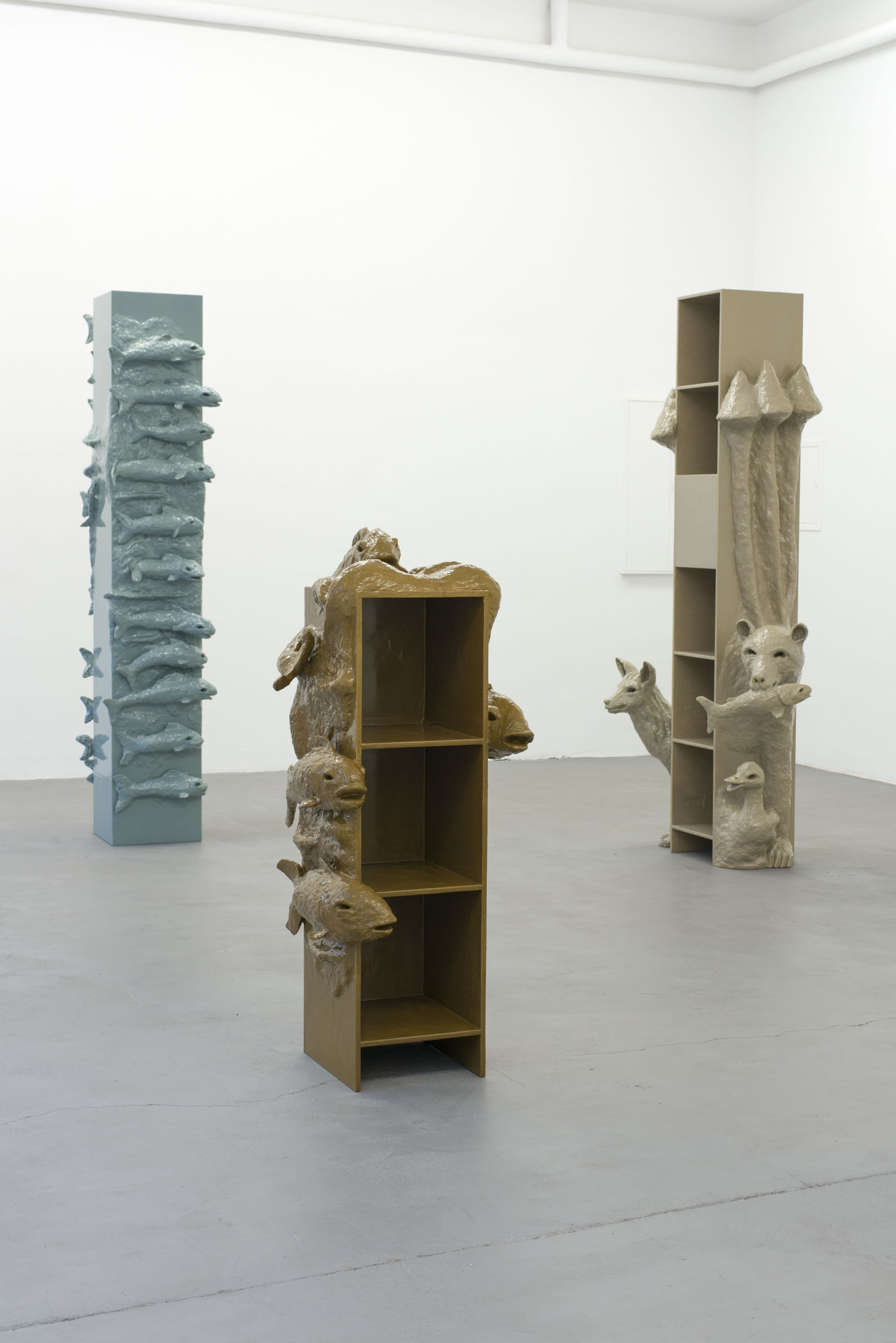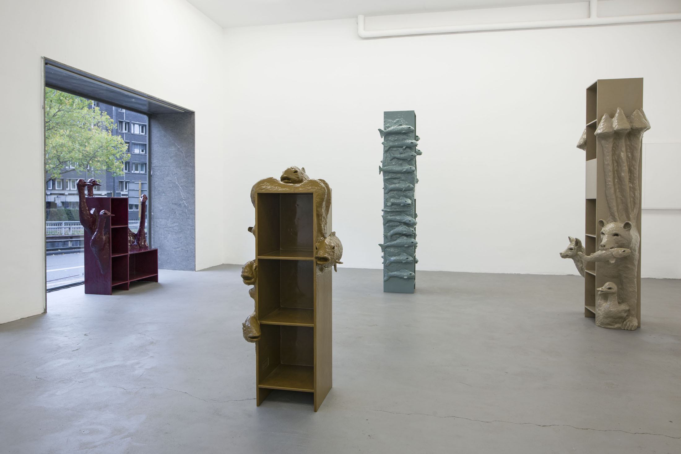 The works in ‘Shelfs’, Koerfer’s exhibition for the Kunstverein, continue her sculptural exploration of the totem, this primordial system of social structure. What does it mean to be assigned an animal or plant as a guardian spirit? To what extent does the totem interact with the psyche and forge a bond between individual and environment? For the first time, Koerfer focuses less on furniture that offers proximity to the human body or can even stand metonymically for it. Instead, attention is drawn to forms of spatial organisation of storage, containers of externalisation. Continuing to reflect on the totem, one might ask which objects and ideas are impressed upon the personality ? Which theories or narratives have we consciously or unconsciously stored within ourselves, leaving us unable to clearly distinguish whether we carry them around with us or whether, perhaps, the opposite is true?