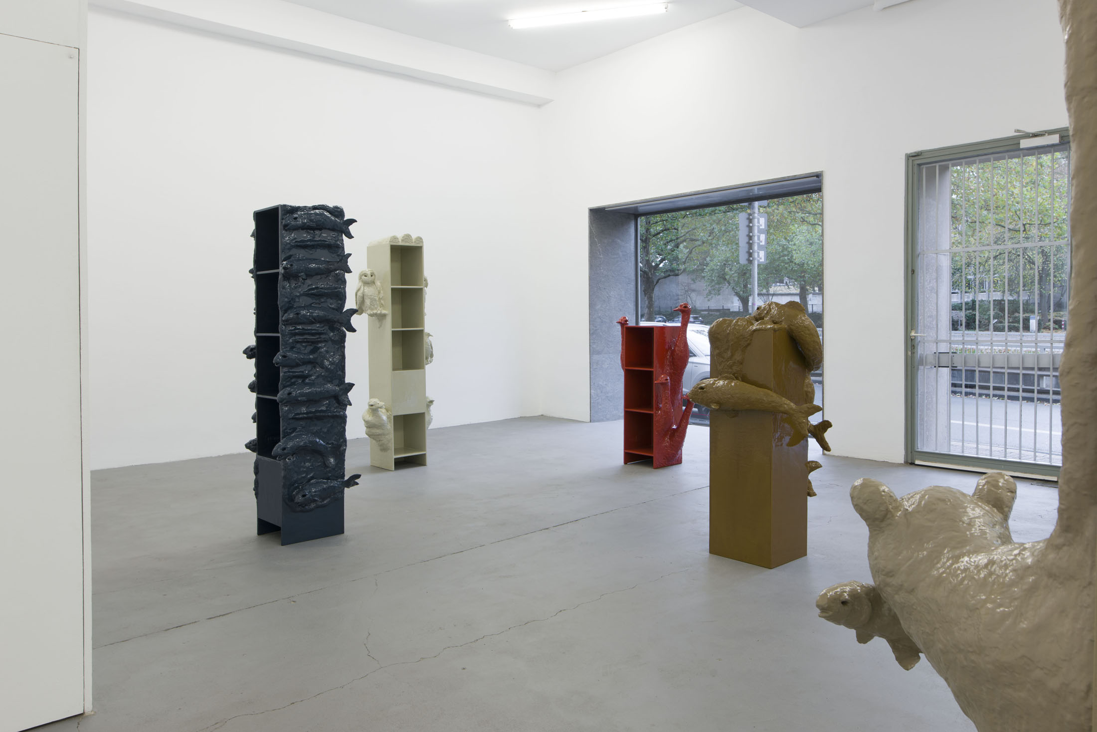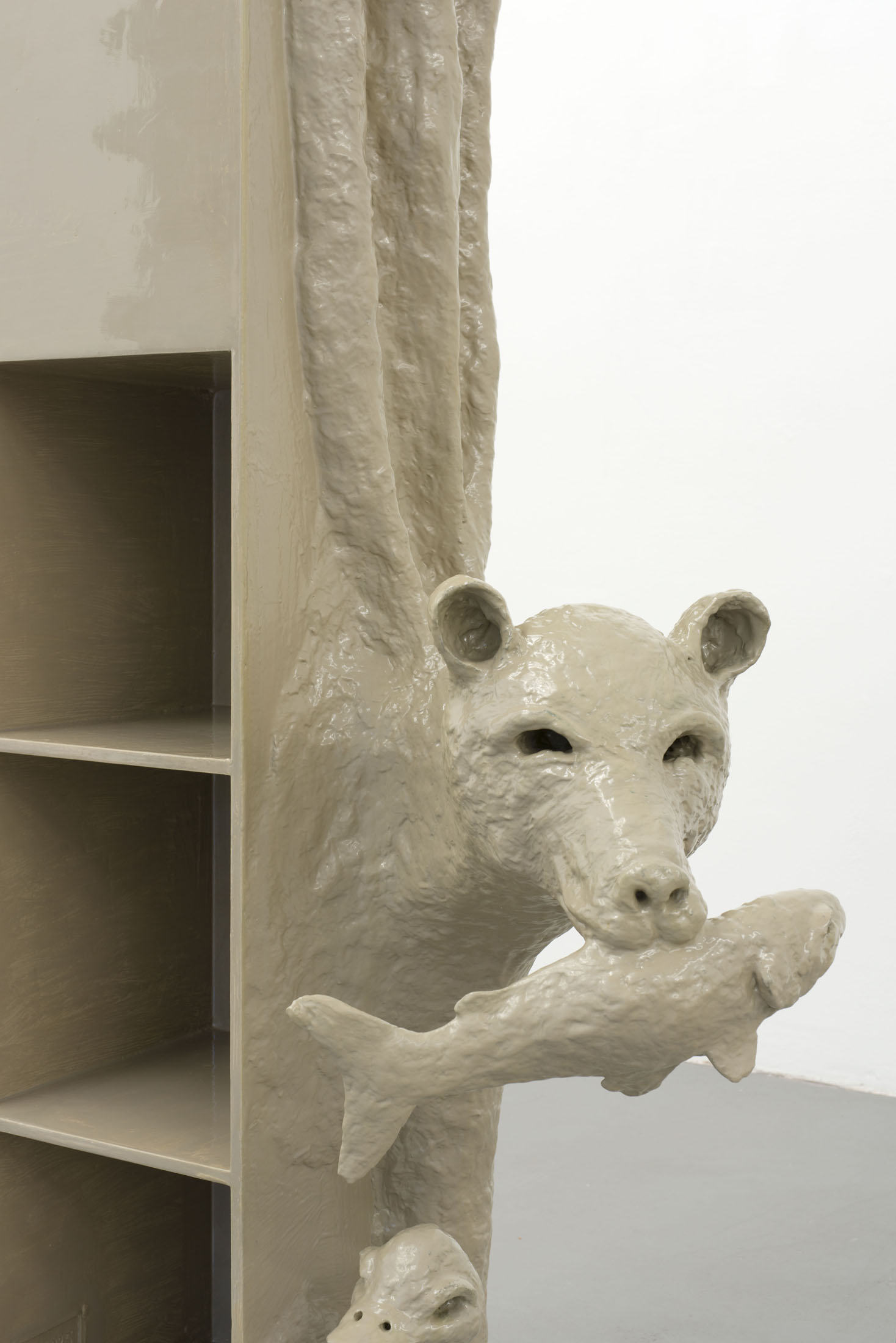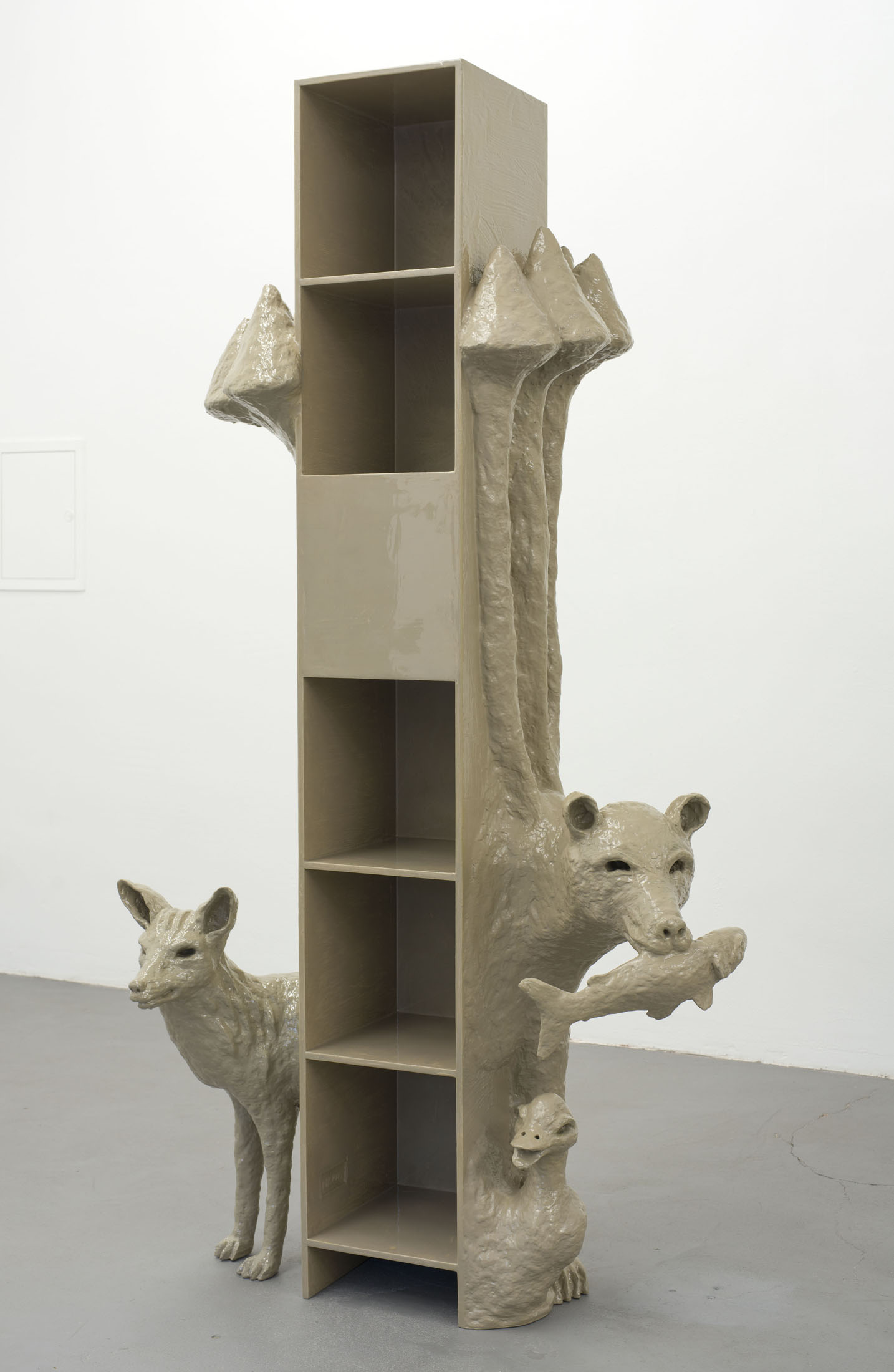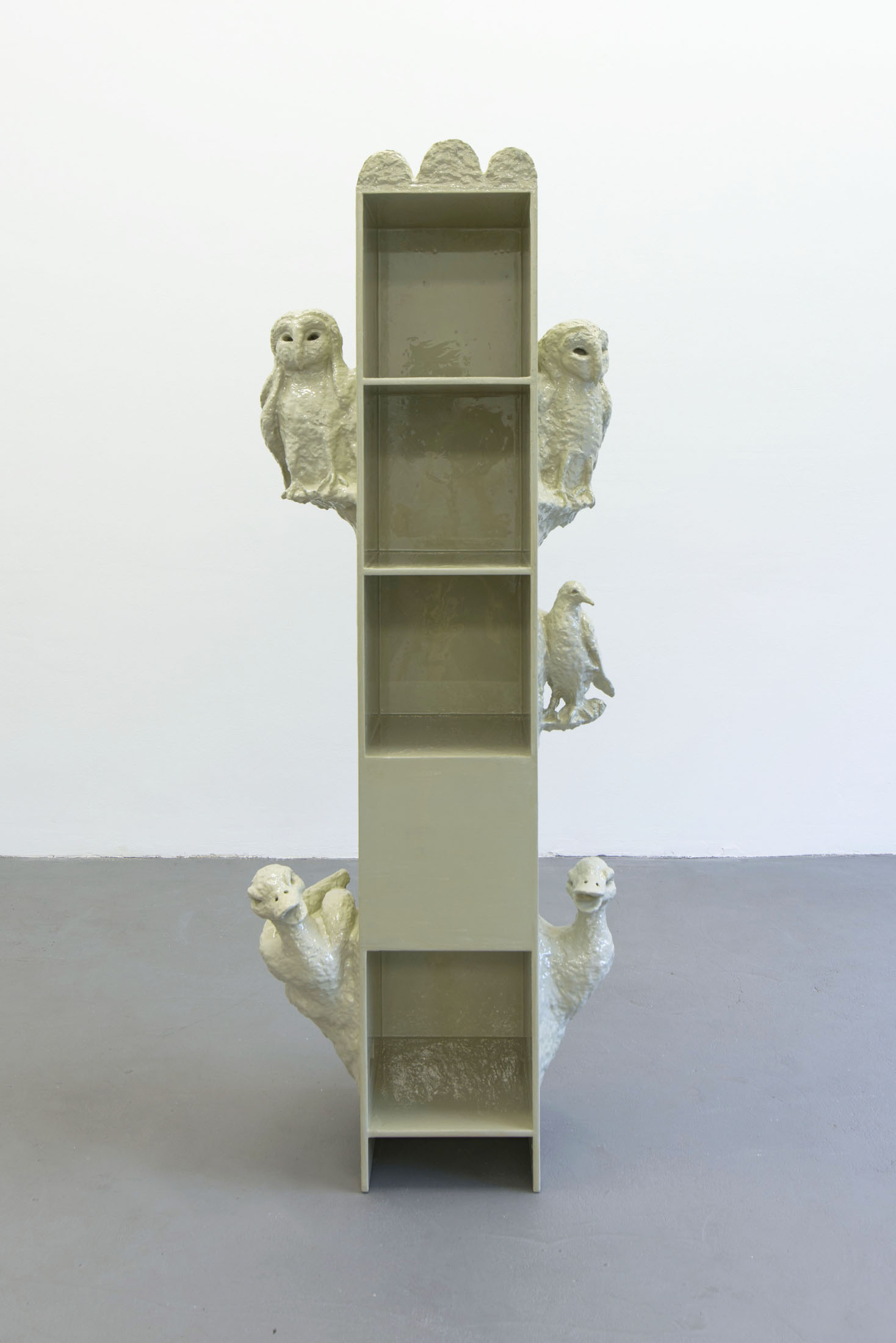 The works in ‘Shelfs’, Koerfer’s exhibition for the Kunstverein, continue her sculptural exploration of the totem, this primordial system of social structure. What does it mean to be assigned an animal or plant as a guardian spirit? To what extent does the totem interact with the psyche and forge a bond between individual and environment? For the first time, Koerfer focuses less on furniture that offers proximity to the human body or can even stand metonymically for it. Instead, attention is drawn to forms of spatial organisation of storage, containers of externalisation. Continuing to reflect on the totem, one might ask which objects and ideas are impressed upon the personality ? Which theories or narratives have we consciously or unconsciously stored within ourselves, leaving us unable to clearly distinguish whether we carry them around with us or whether, perhaps, the opposite is true?