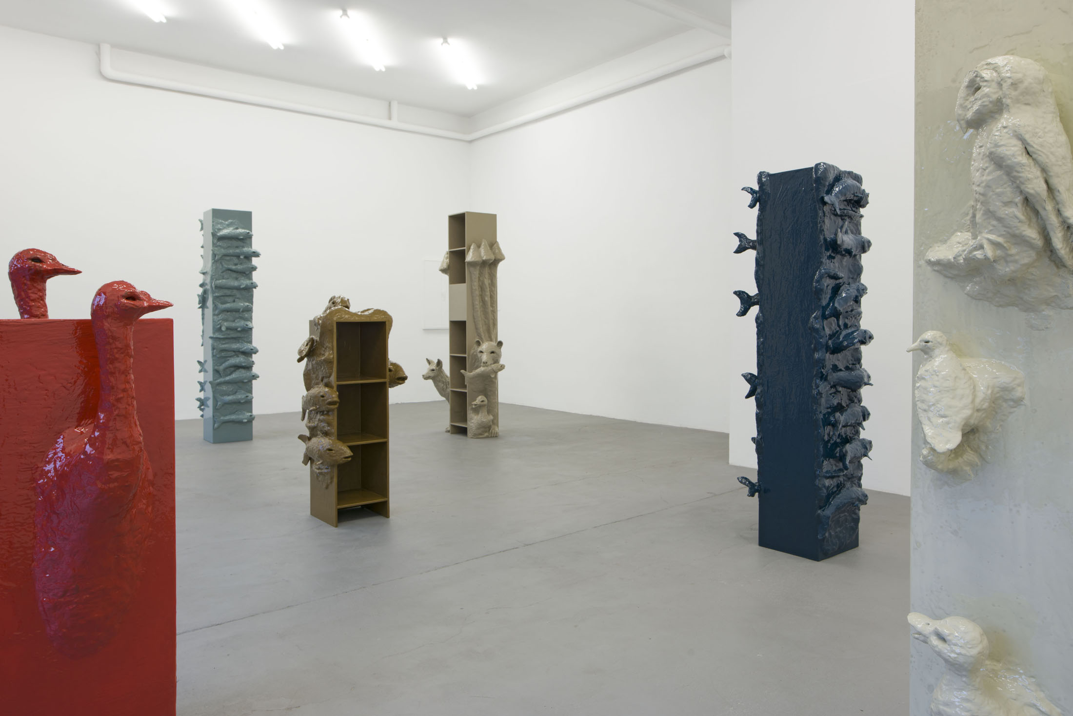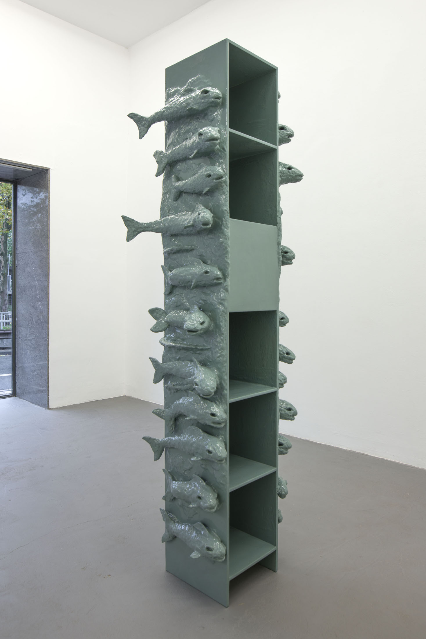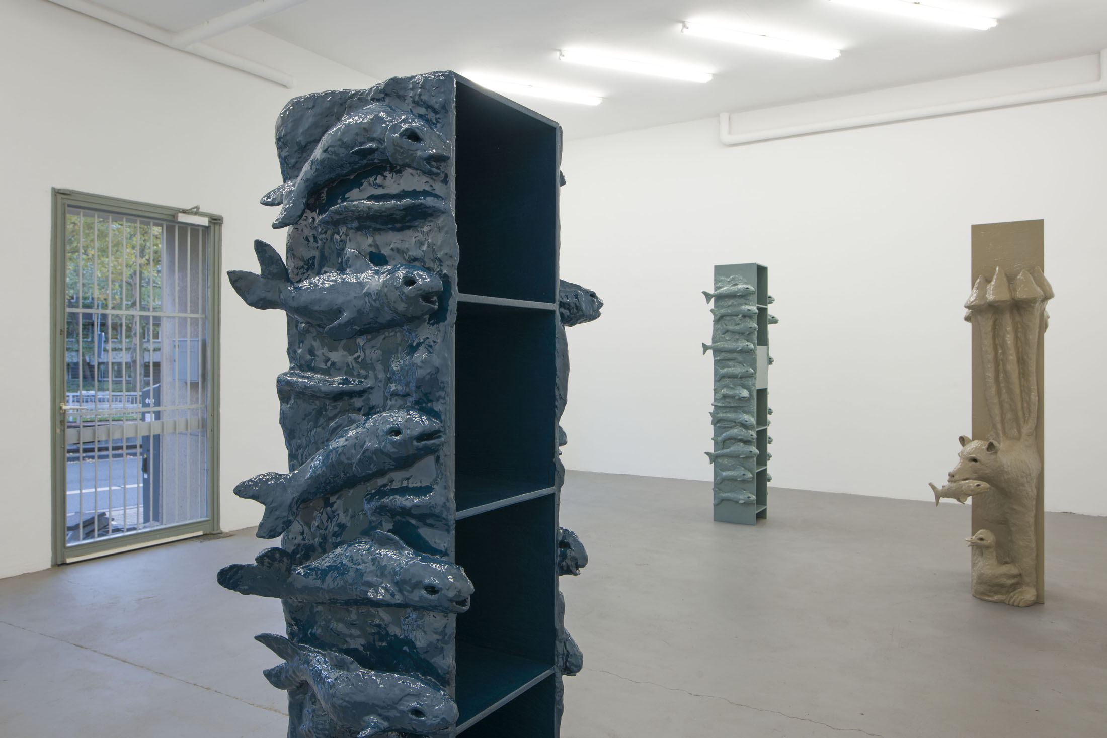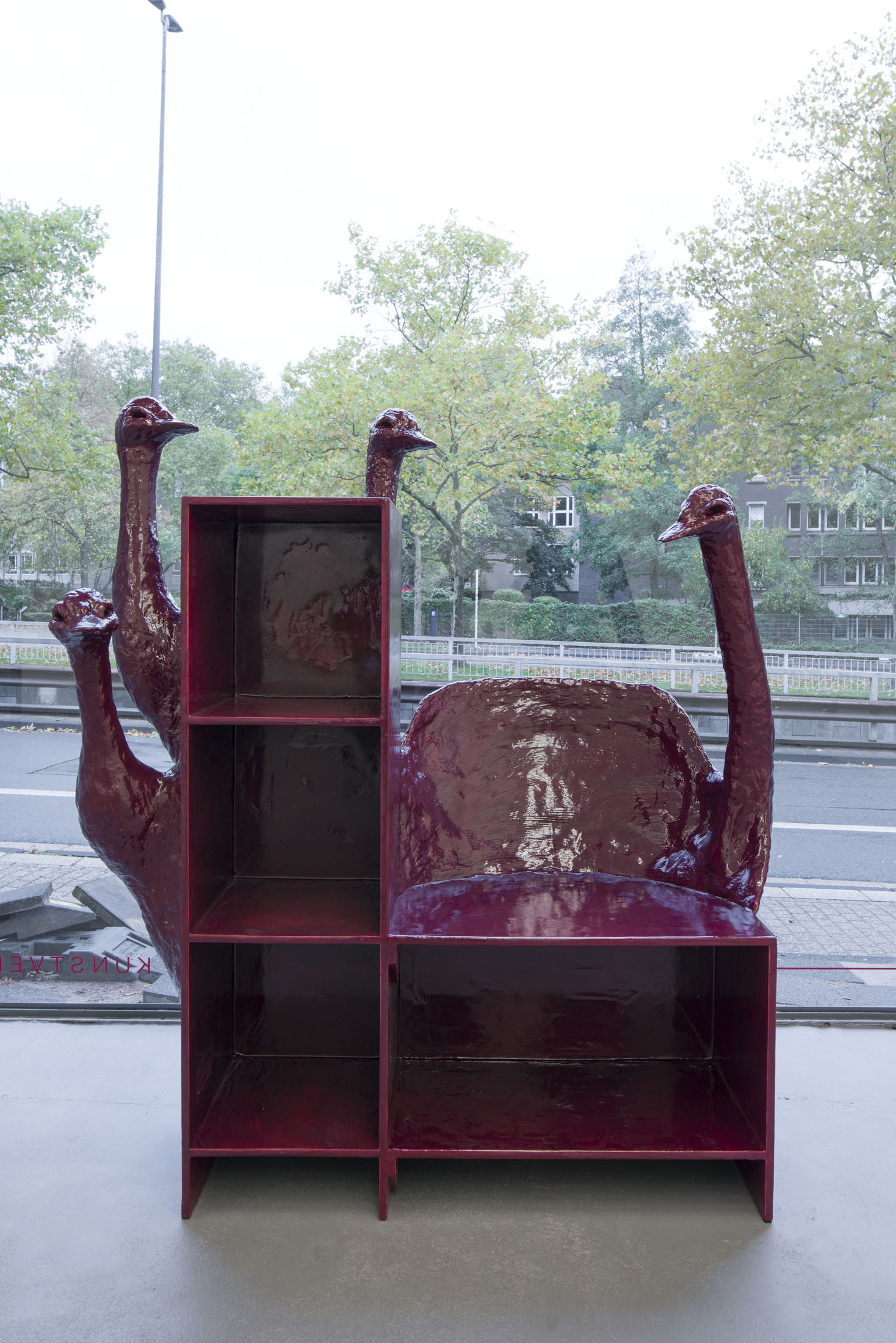 The works in ‘Shelfs’, Koerfer’s exhibition for the Kunstverein, continue her sculptural exploration of the totem, this primordial system of social structure. What does it mean to be assigned an animal or plant as a guardian spirit? To what extent does the totem interact with the psyche and forge a bond between individual and environment? For the first time, Koerfer focuses less on furniture that offers proximity to the human body or can even stand metonymically for it. Instead, attention is drawn to forms of spatial organisation of storage, containers of externalisation. Continuing to reflect on the totem, one might ask which objects and ideas are impressed upon the personality ? Which theories or narratives have we consciously or unconsciously stored within ourselves, leaving us unable to clearly distinguish whether we carry them around with us or whether, perhaps, the opposite is true?
