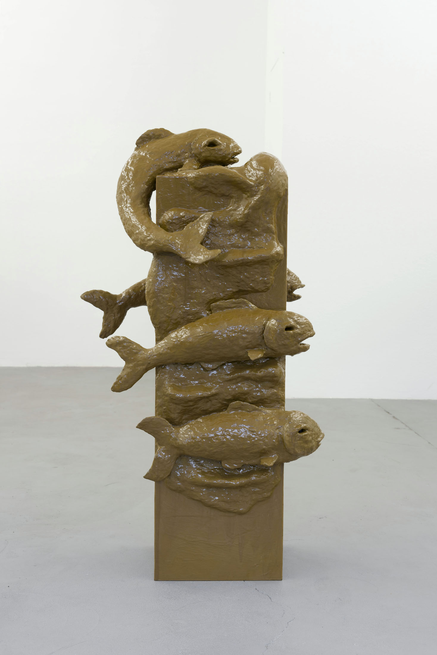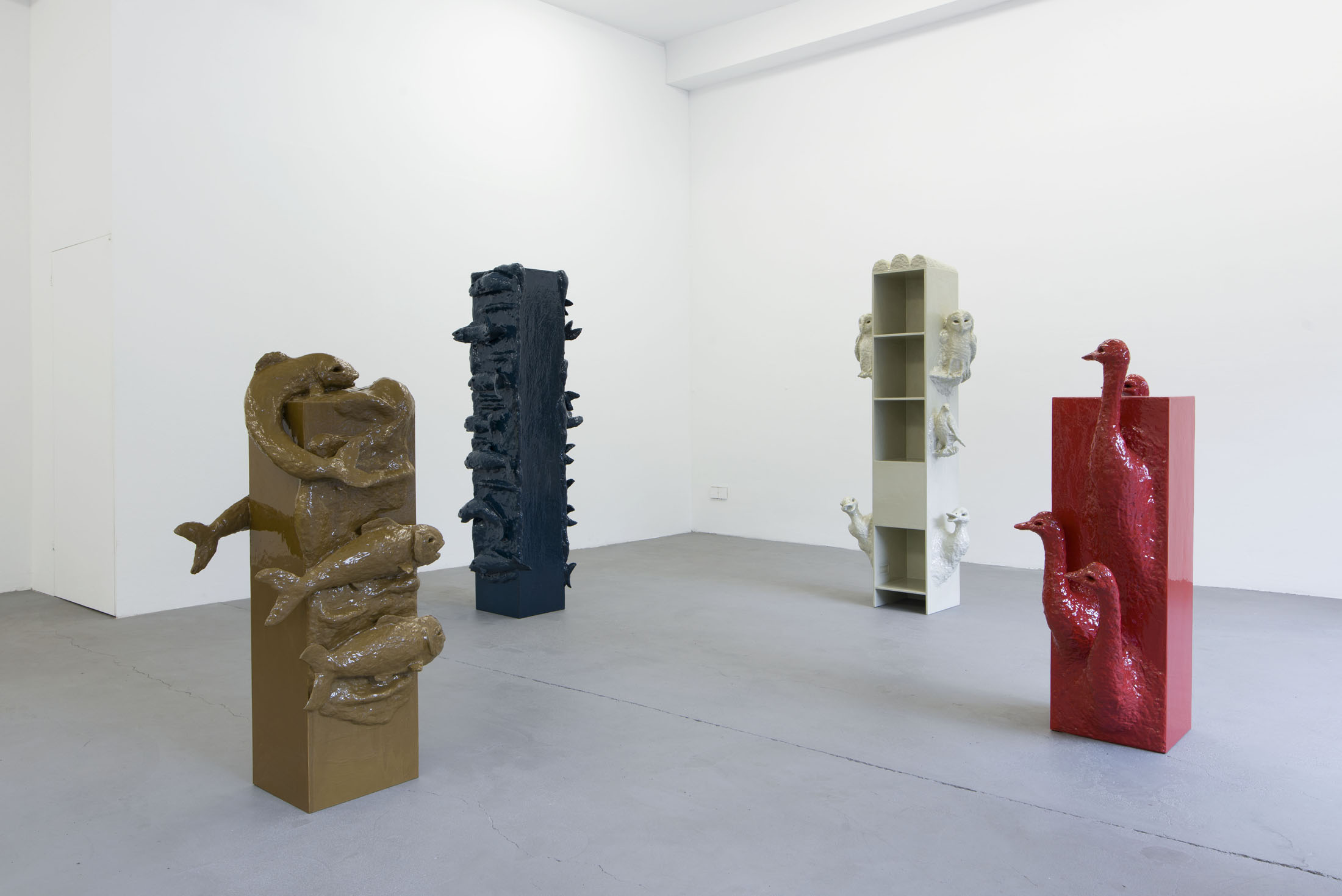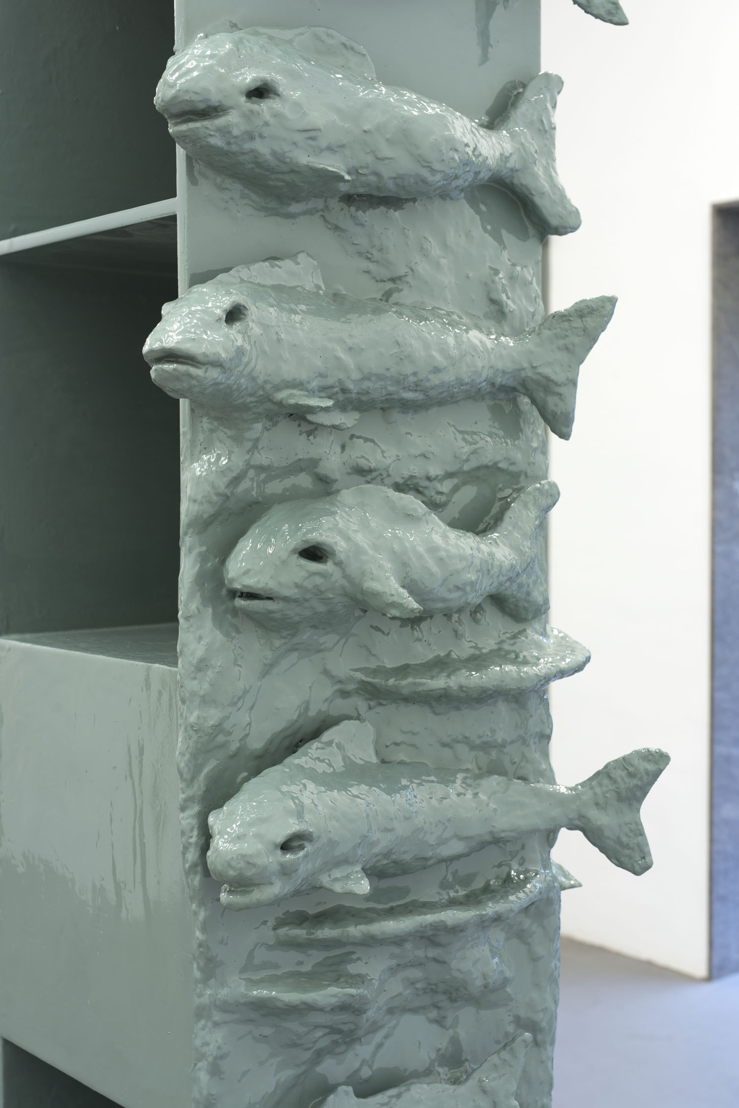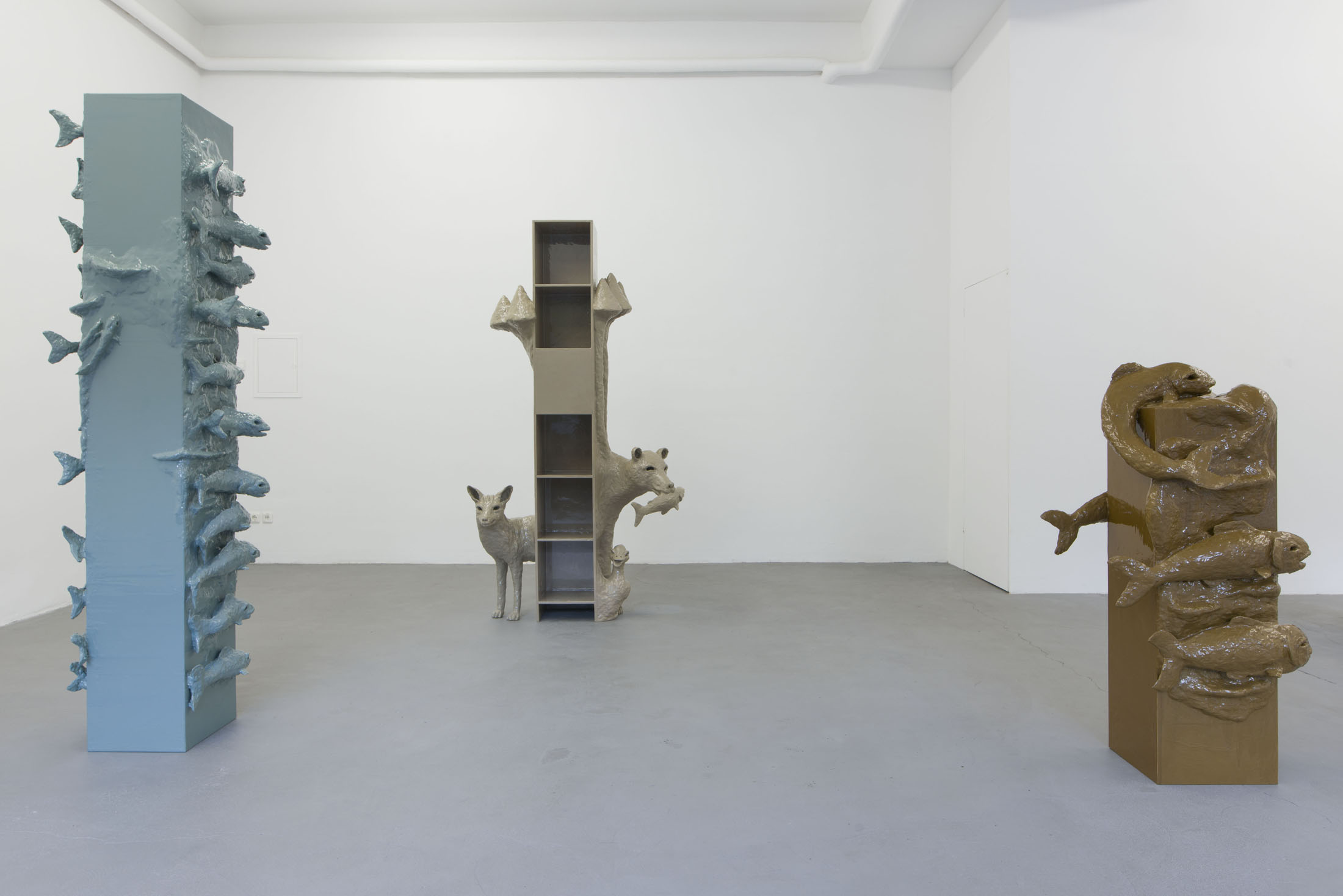 The works in ‘Shelfs’, Koerfer’s exhibition for the Kunstverein, continue her sculptural exploration of the totem, this primordial system of social structure. What does it mean to be assigned an animal or plant as a guardian spirit? To what extent does the totem interact with the psyche and forge a bond between individual and environment? For the first time, Koerfer focuses less on furniture that offers proximity to the human body or can even stand metonymically for it. Instead, attention is drawn to forms of spatial organisation of storage, containers of externalisation. Continuing to reflect on the totem, one might ask which objects and ideas are impressed upon the personality ? Which theories or narratives have we consciously or unconsciously stored within ourselves, leaving us unable to clearly distinguish whether we carry them around with us or whether, perhaps, the opposite is true?