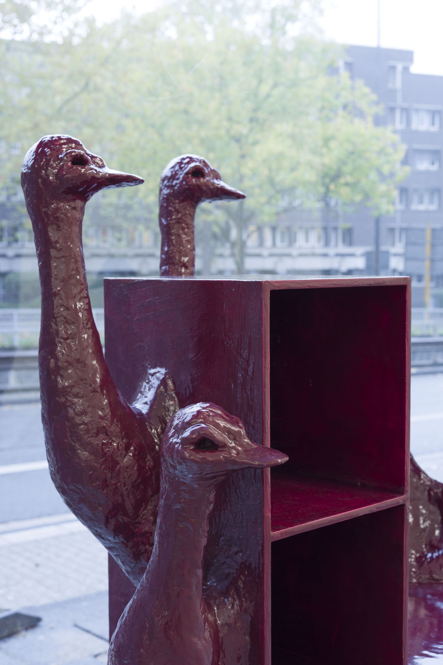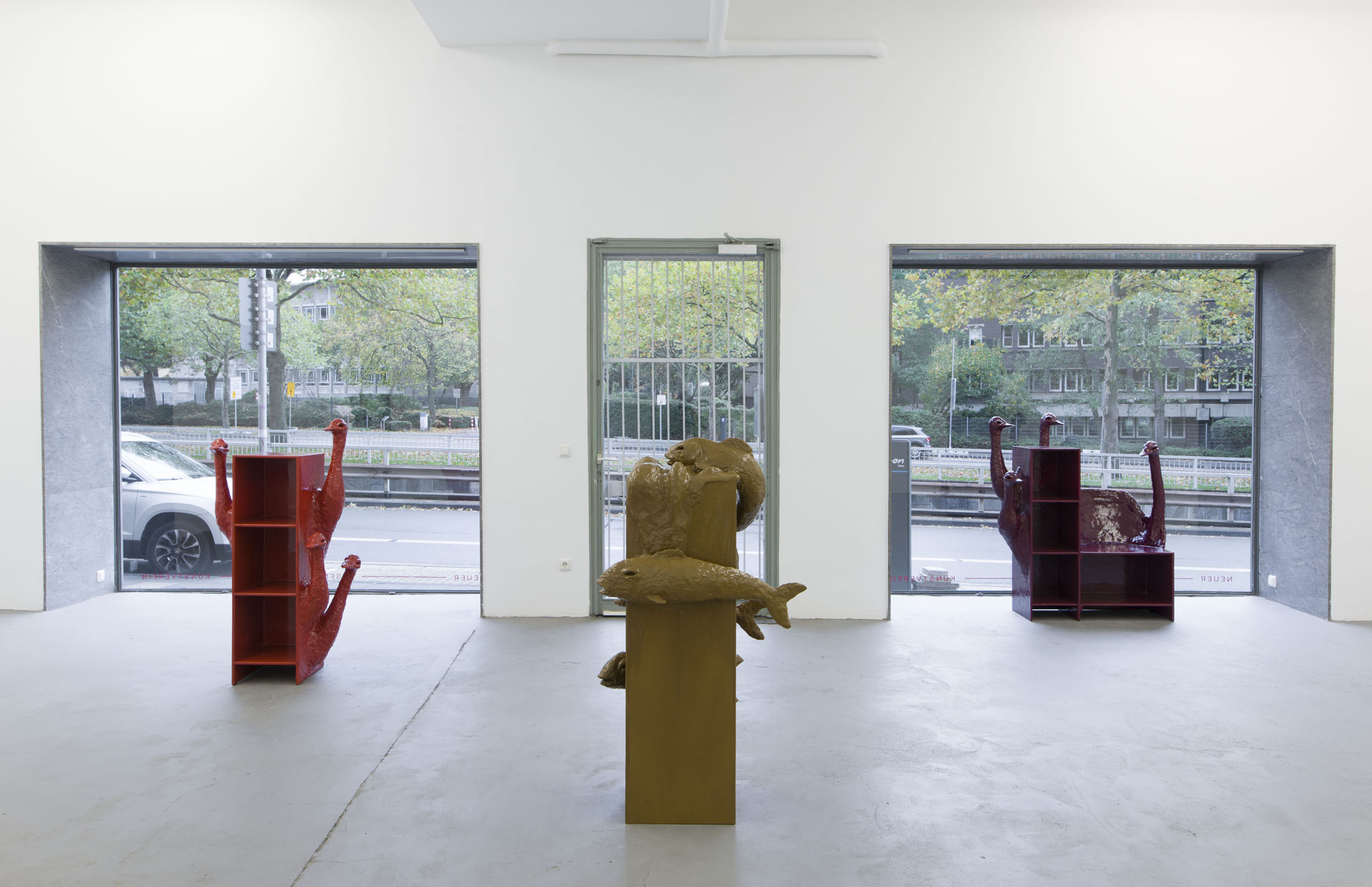 Nuri Koerfer’s sculptural practice hybridises the autonomous artistic concept of the inoperative object with its counterpart, the object of utility. She playfully propels chairs, benches, shelves, and tables towards other, unintended forms of use, without abandoning their original functionality as furniture. In addition, the gravity of Koerfer’s sculptures is altered by the intertwining of the usually strictly separate spheres of the animal world and furniture, the latter already offering numerous empty spaces for the weight of humans and their objects. Relationships and proportionality – initially genuine sculptural questions – expand from the formal to a more general level through these juxtapositions, without offering any rash answers or solutions.