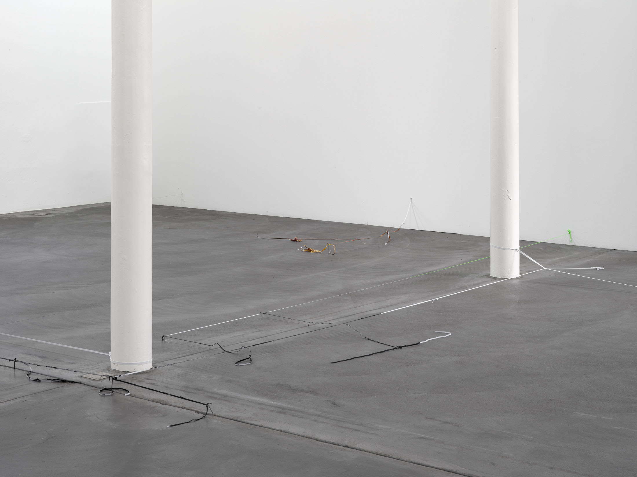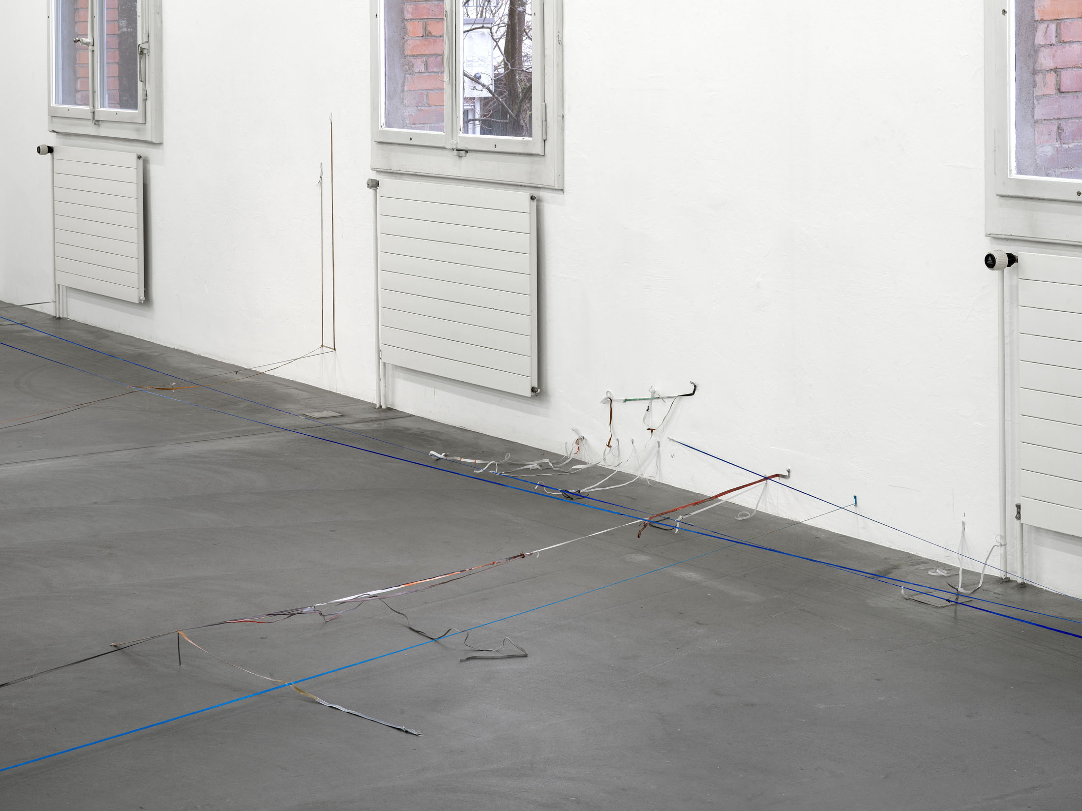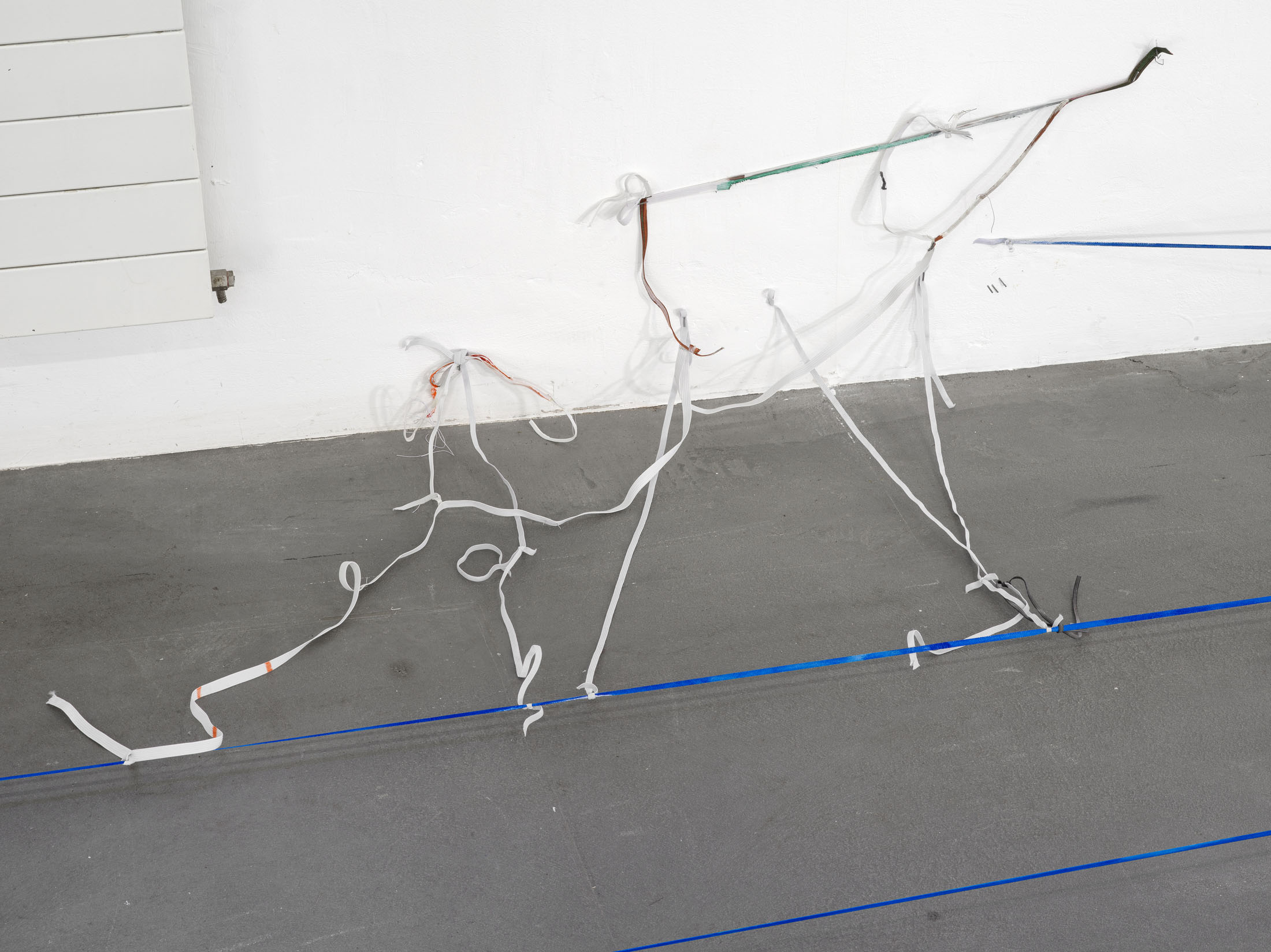 Balema’s ongoing work with elastic bands exhibits a spare materiality that causes it to almost disappear, depending on lighting conditions and background. The work is as provocative as it is sensitive, since it sees sculptural form to emerge almost out of nothing and out of a repeated gesture. Is a line sufficient to define plastic form? What becomes highly tangible here is the sense that a form can announce itself at times through lack and deficiency, perhaps more than through anything else. In all its sparseness, the work radiates a striking physical fragility: at times the elastic bands are stretched almost to the point of tearing, at others they hang down limply, seemingly exhausted and shapeless. Some form a rigid system, while others veer away, hinting at something more dysfunctional and halting, bringing to mind Ba-lema’s repeated use of titles that reference the body’s and the psyche’s vulnerability to failure. The philosophical term “plasticity” resonates here as well: Just as the material is able to dramatically extend and adjust itself, the work itself carries an inherent adaptability.