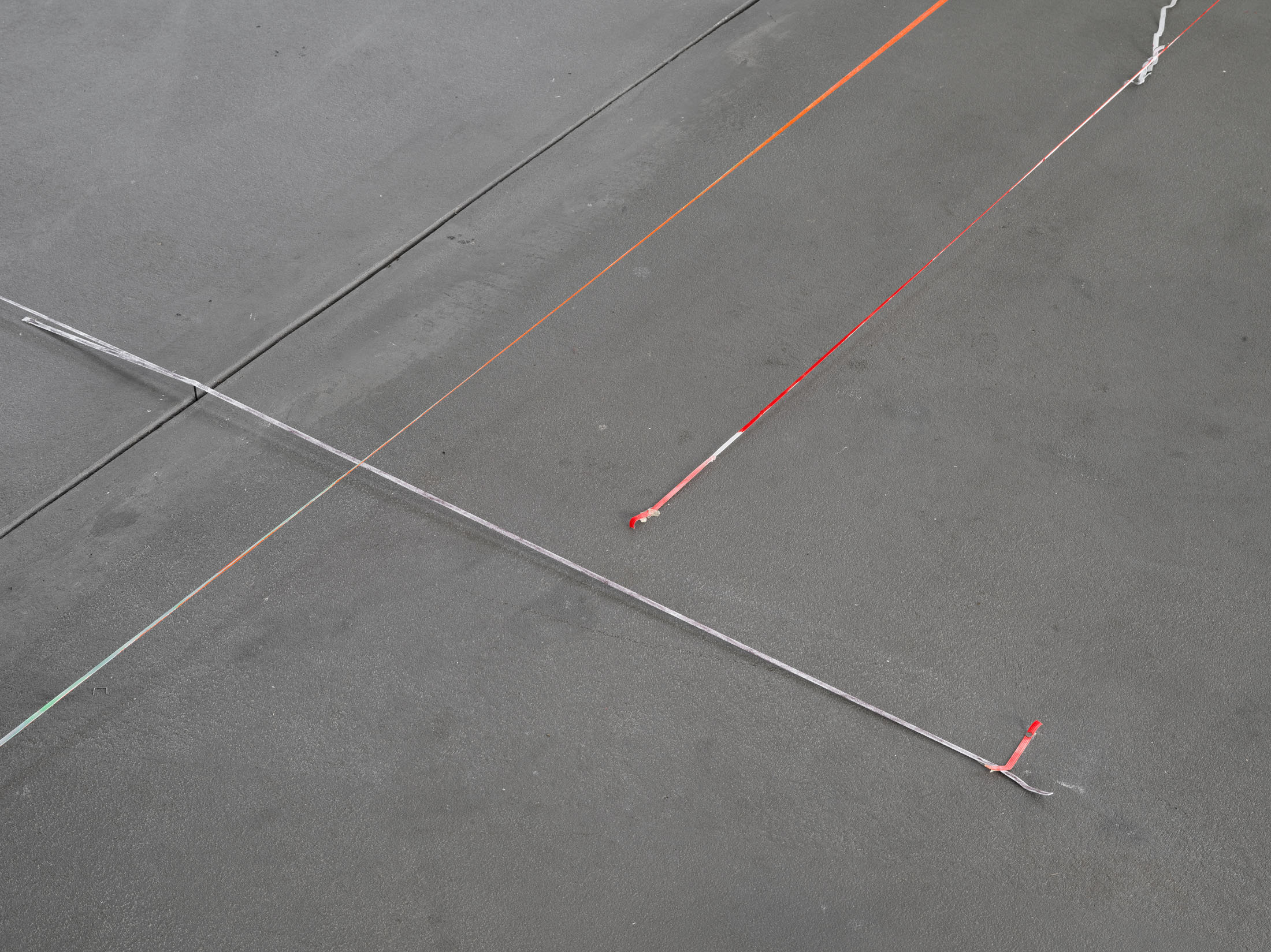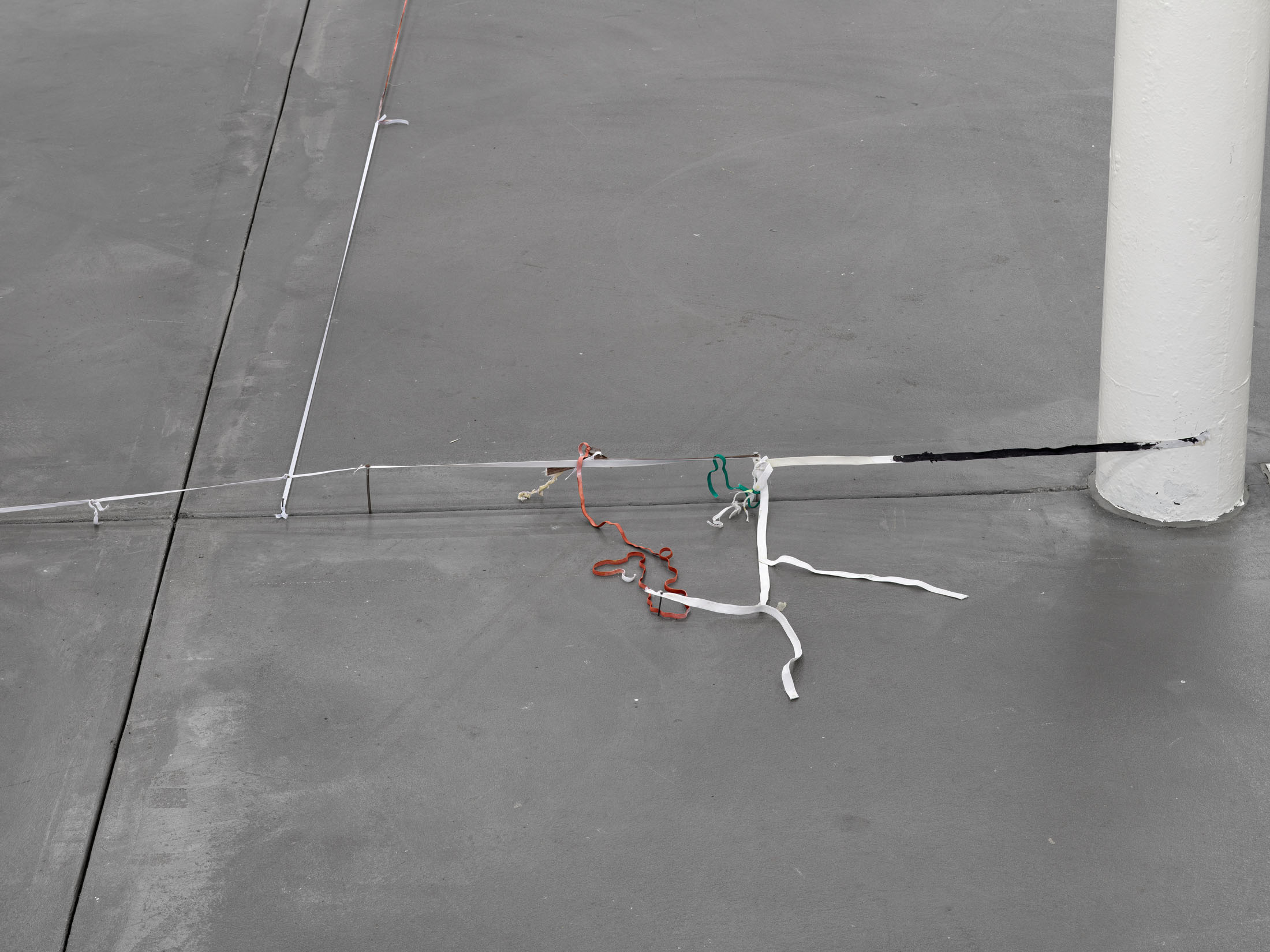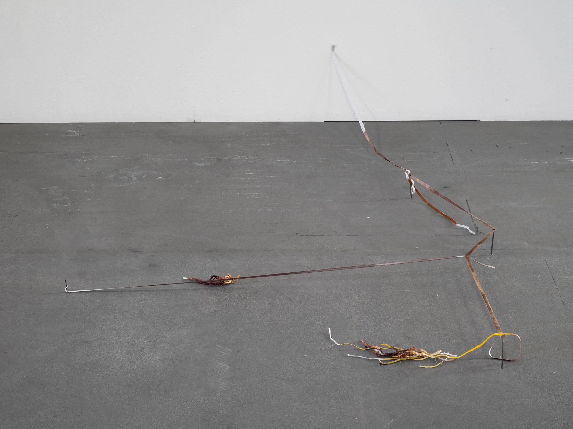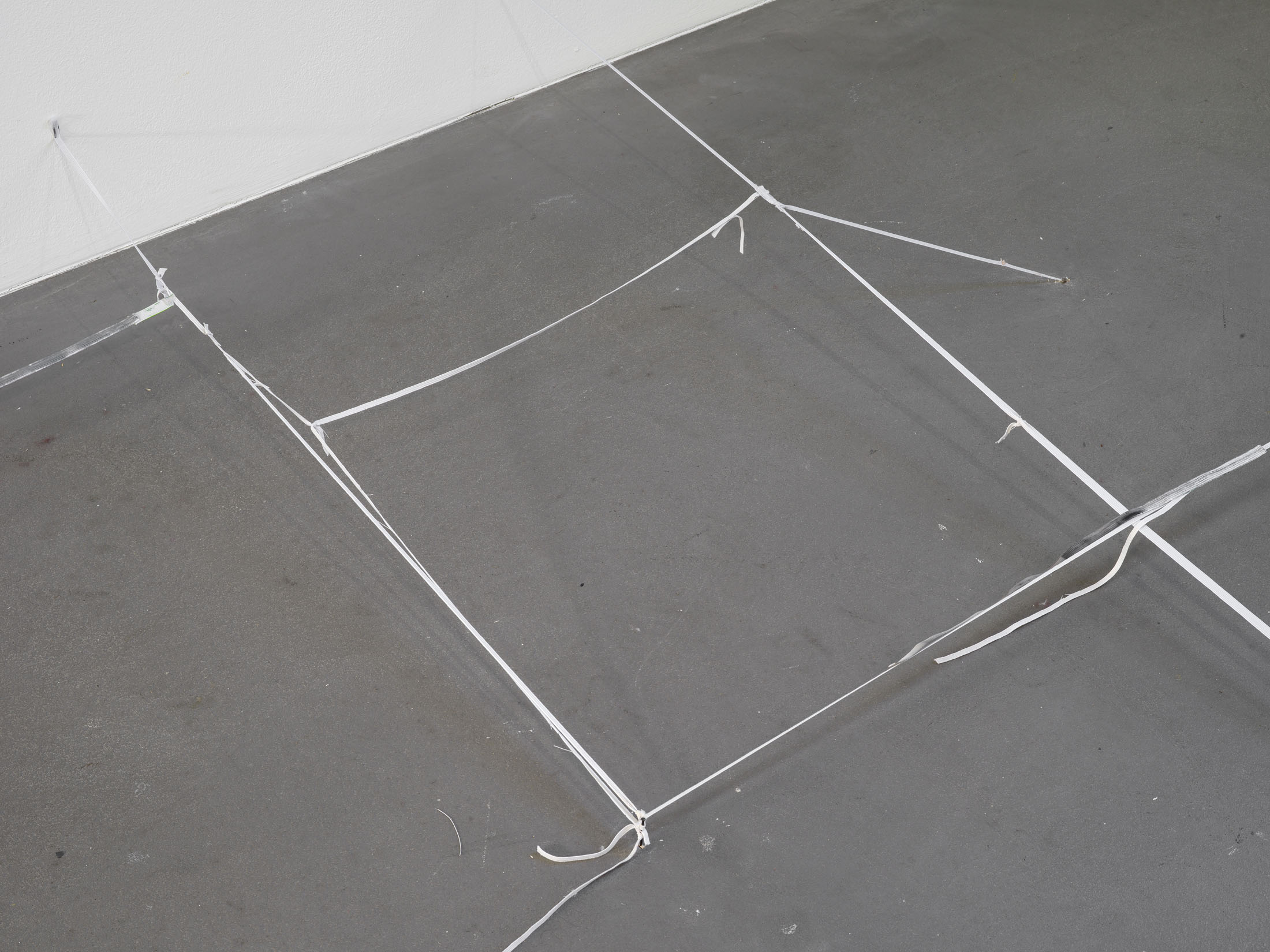 Balema’s ongoing work with elastic bands exhibits a spare materiality that causes it to almost disappear, depending on lighting conditions and background. The work is as provocative as it is sensitive, since it sees sculptural form to emerge almost out of nothing and out of a repeated gesture. Is a line sufficient to define plastic form? What becomes highly tangible here is the sense that a form can announce itself at times through lack and deficiency, perhaps more than through anything else. In all its sparseness, the work radiates a striking physical fragility: at times the elastic bands are stretched almost to the point of tearing, at others they hang down limply, seemingly exhausted and shapeless. Some form a rigid system, while others veer away, hinting at something more dysfunctional and halting, bringing to mind Ba-lema’s repeated use of titles that reference the body’s and the psyche’s vulnerability to failure. The philosophical term “plasticity” resonates here as well: Just as the material is able to dramatically extend and adjust itself, the work itself carries an inherent adaptability.