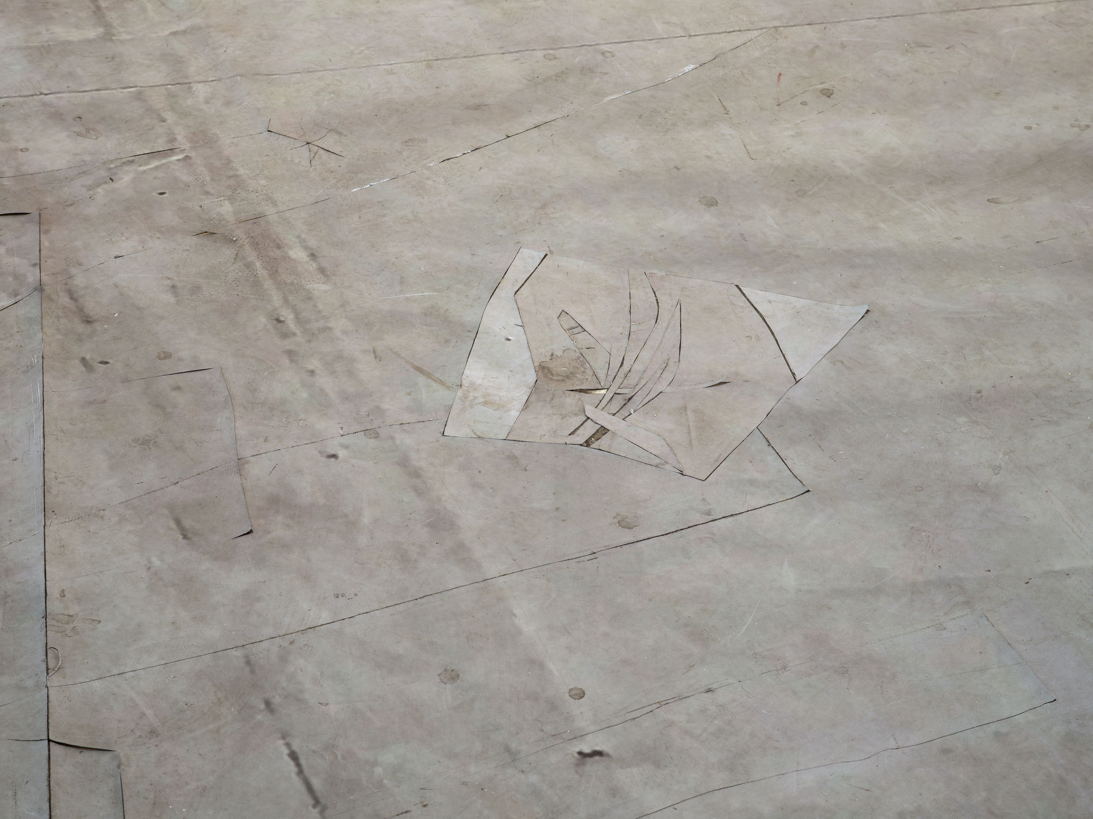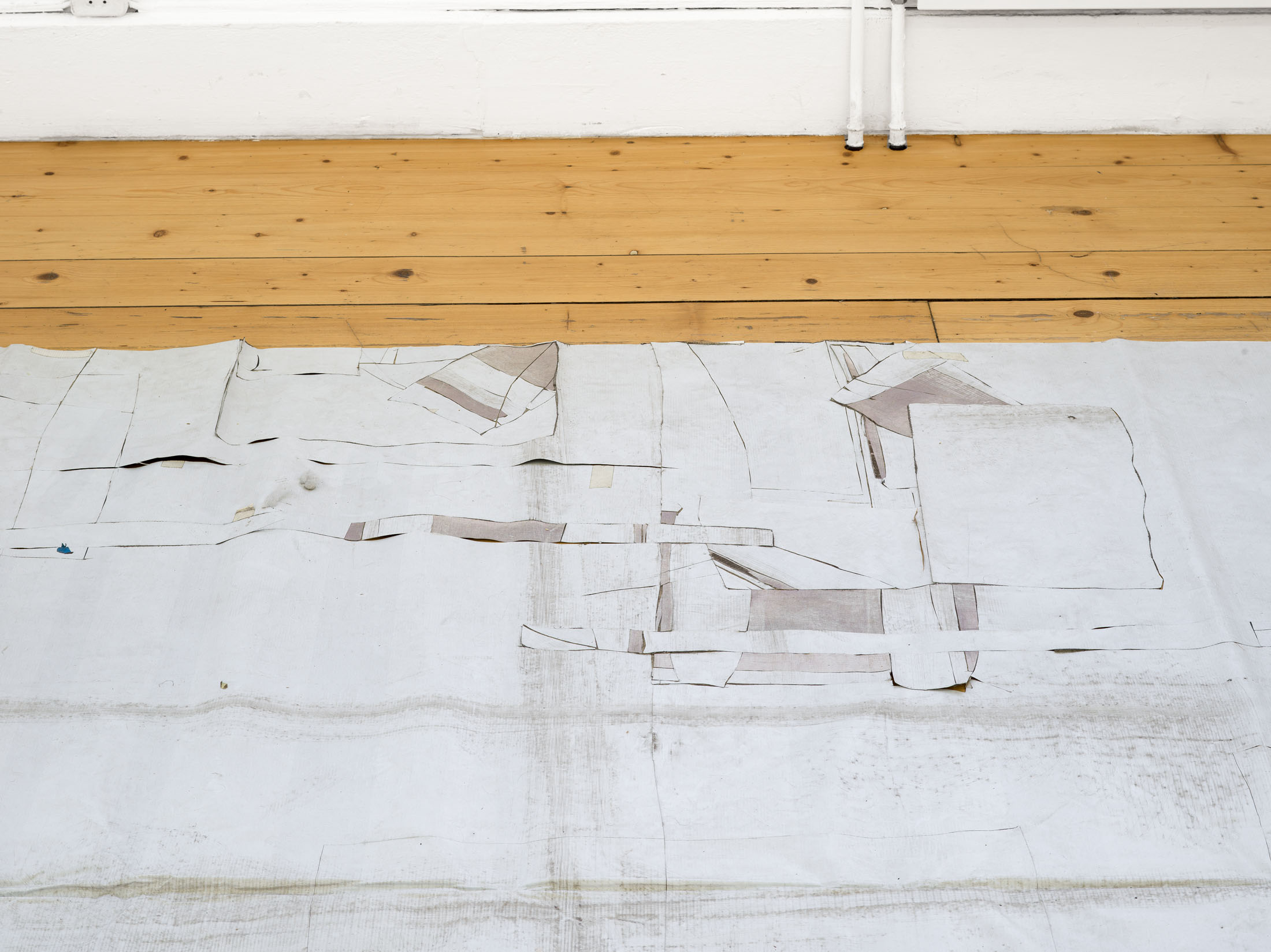 The traces are indicative of what the work has been exposed to over time and how duration makes itself visible in physical terms – Balema carried it to a sidewalk close to her studio to perform a set of frottages on it, and footsteps are accumulating on the work over time. A repeated quotation of a rug with weathered gingko leaves afloat on blue water unfolds over its surface, creating a sense of compositional rhythm. As much as the work exhibits the effects of weathering and disintegration, it speaks of building, and of holding something more constructive against: Through repeated operations of linkage – of provisionally pasting, gluing, and sewing –, Balema arrives at something more whole, in which disparity reads as simultaneity.