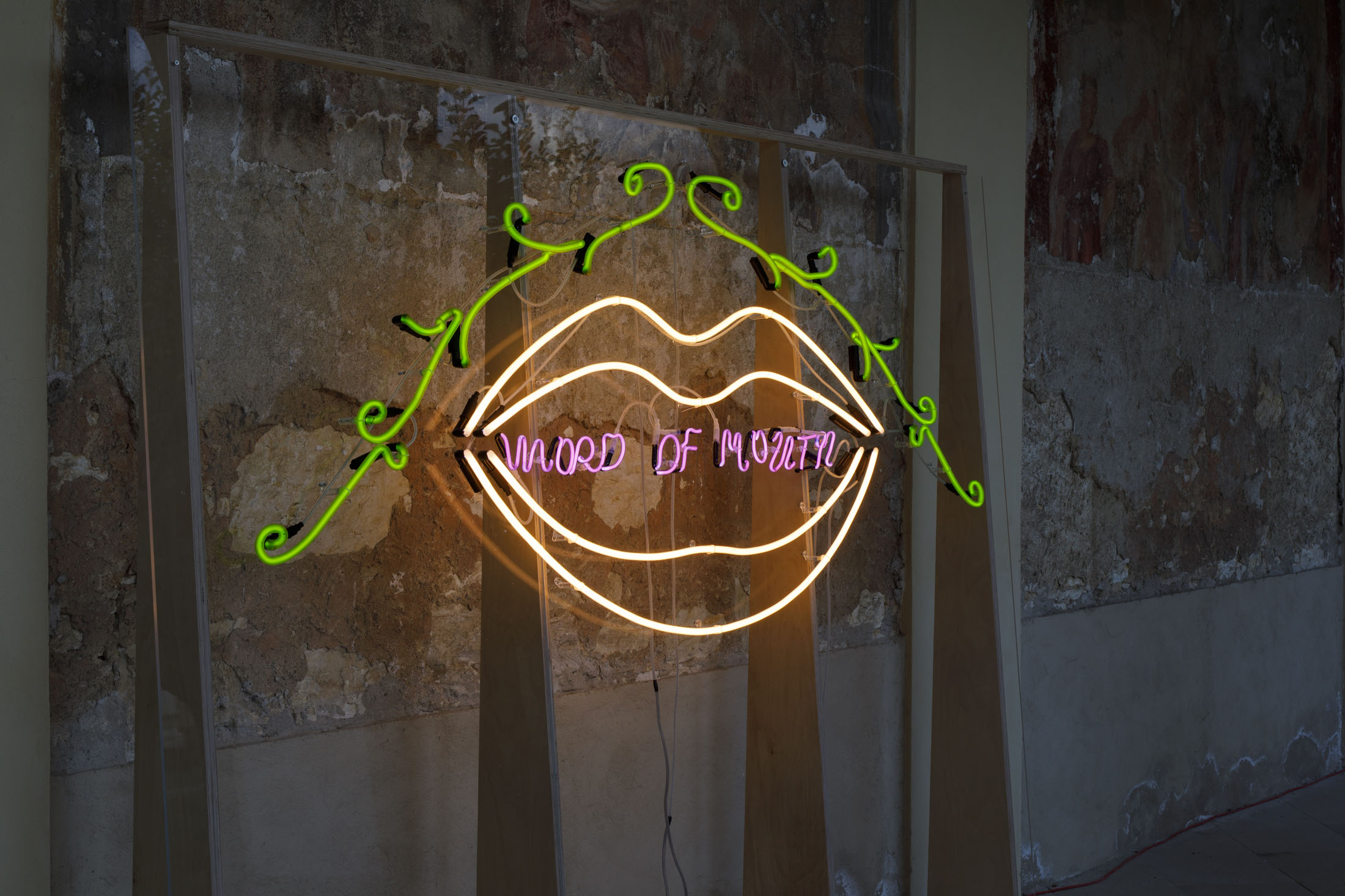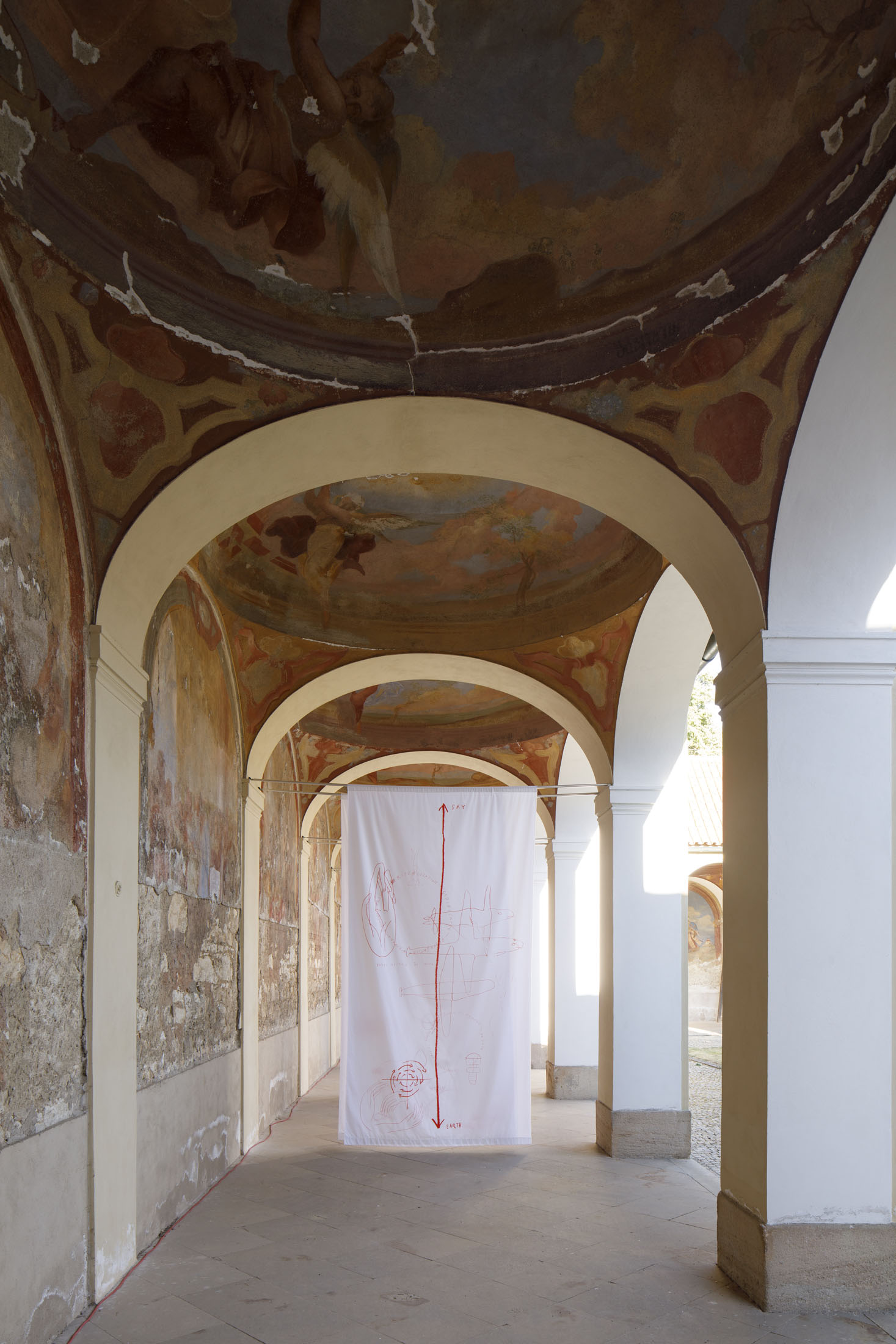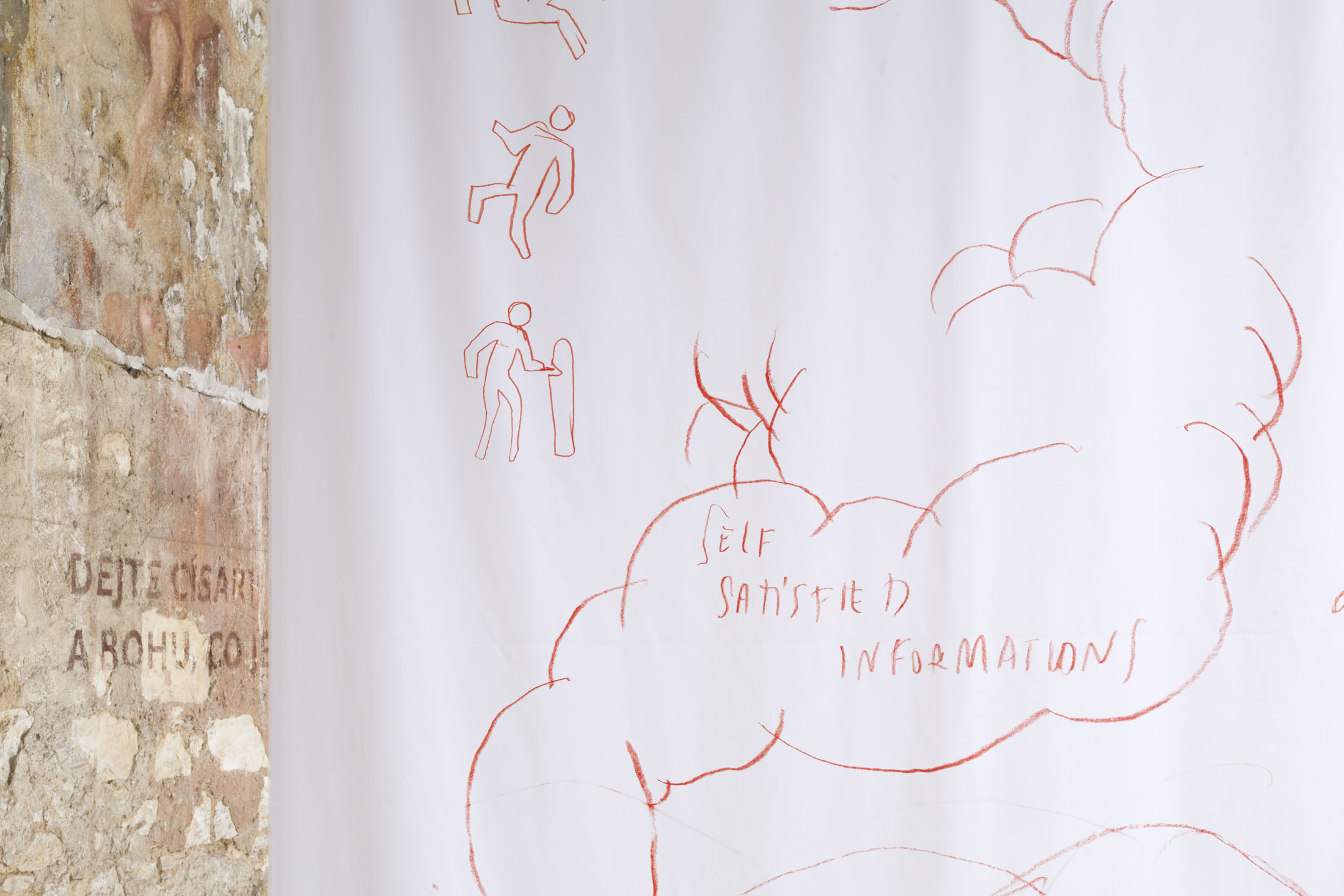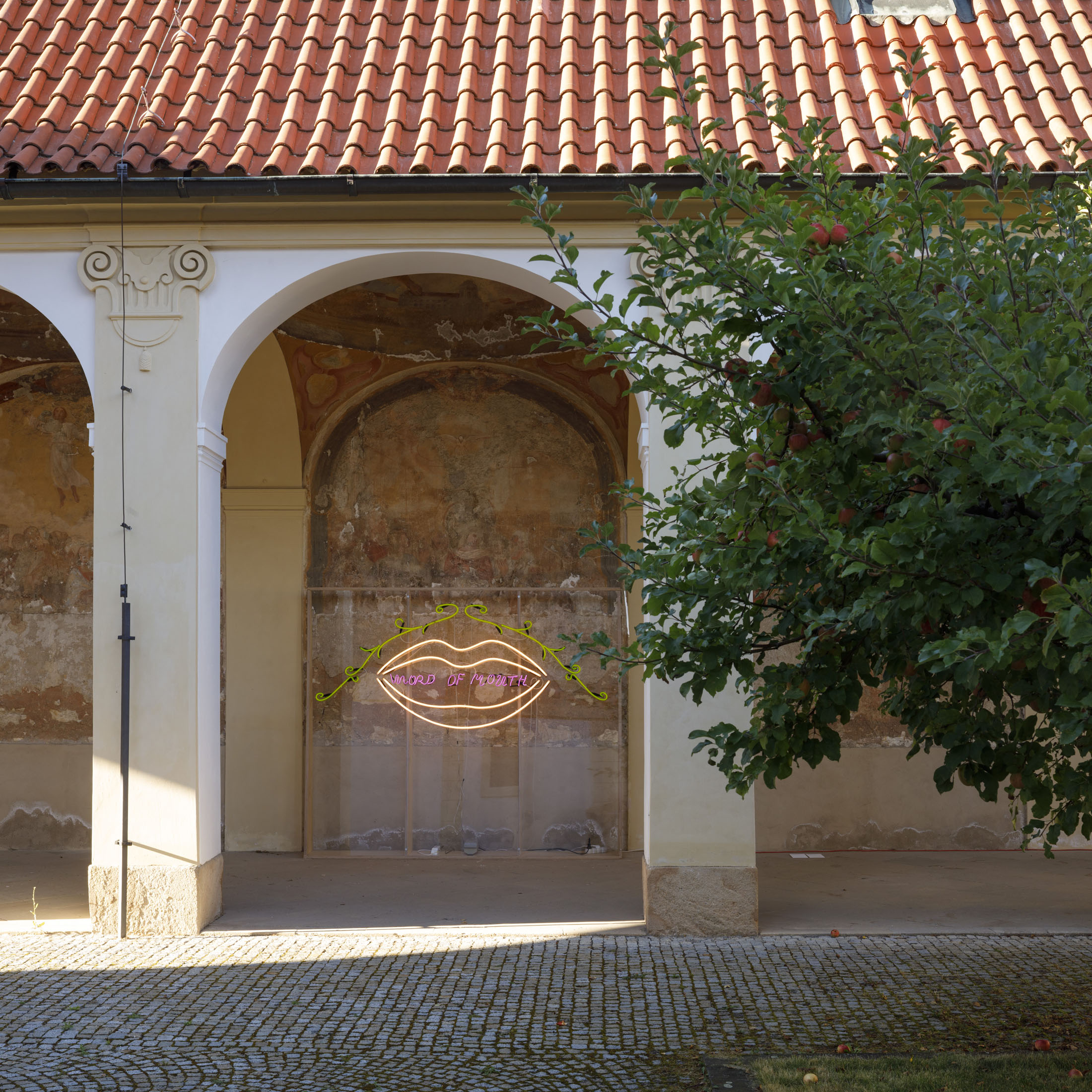 Ana Gzirishvili (b. 1992, Tbilisi, Georgia) recreates one of her pre-existing works, Locale, a site-specific sculpture assembled from second-hand women’s handbags. Acting as an elegant intervention into the space, the work creates a polyphony of unknown female voices. We hear a choir performing in a video, The Ghost (2023), by Lina Lapelytė̇ (b. 1984, Kaunas, Lithuania) installed in one of the side chapels next to the relics of St Felician. Conceived for the exhibition, Maia Naveriani (b. 1966, Tbilisi, Georgia) creates a neon installation of her drawing, Word of Mouth, incorporating text addressing both written and sonic experience and the meanings it embraces when changing contexts. Adéla Součková (b. 1985, Prague, Czech Republic) in The Polyphony of Times in a Single Moment is interested in intersection points between the animist and modern, pagan and religious, or spiritual and technological. A series of mono color digital prints of artist’s drawings on cotton rhythmically follow one another in a hallway of the monastery as if racing thoughts, incorporating various imagery of popular symbols interlaced with short poetic texts. Marie Tučková (b. 1994, Prague, Czech Republic) in her sound installation activates the historic well in the monastery courtyard. As if giving voice to the subterranean waters underneath the architecture, her delicate intervention Would you drink me when I am rotten? addresses questions of power, control and memory, looking at the water not merely as a natural resource, but also in terms of its historical and symbolic meaning.