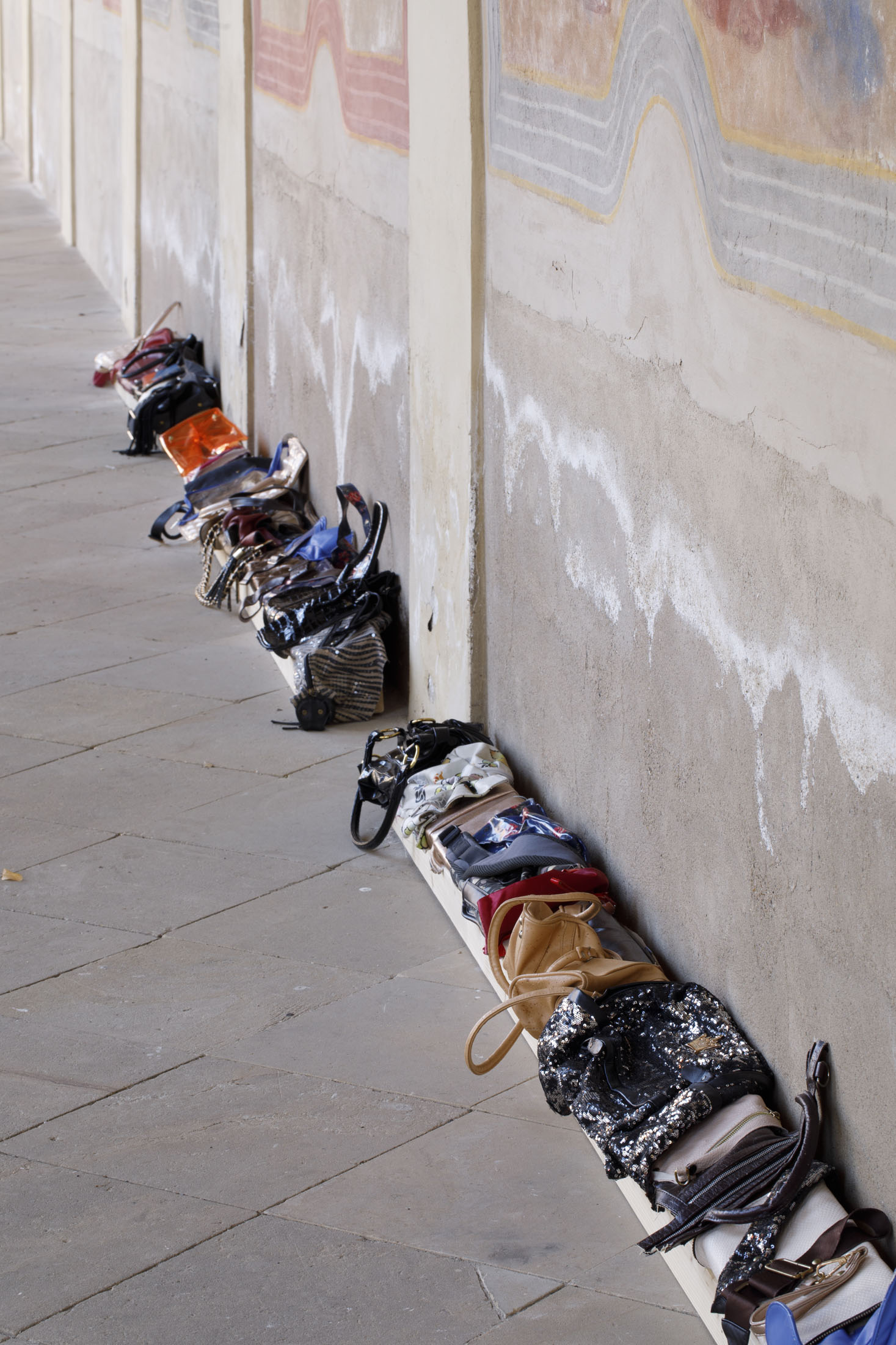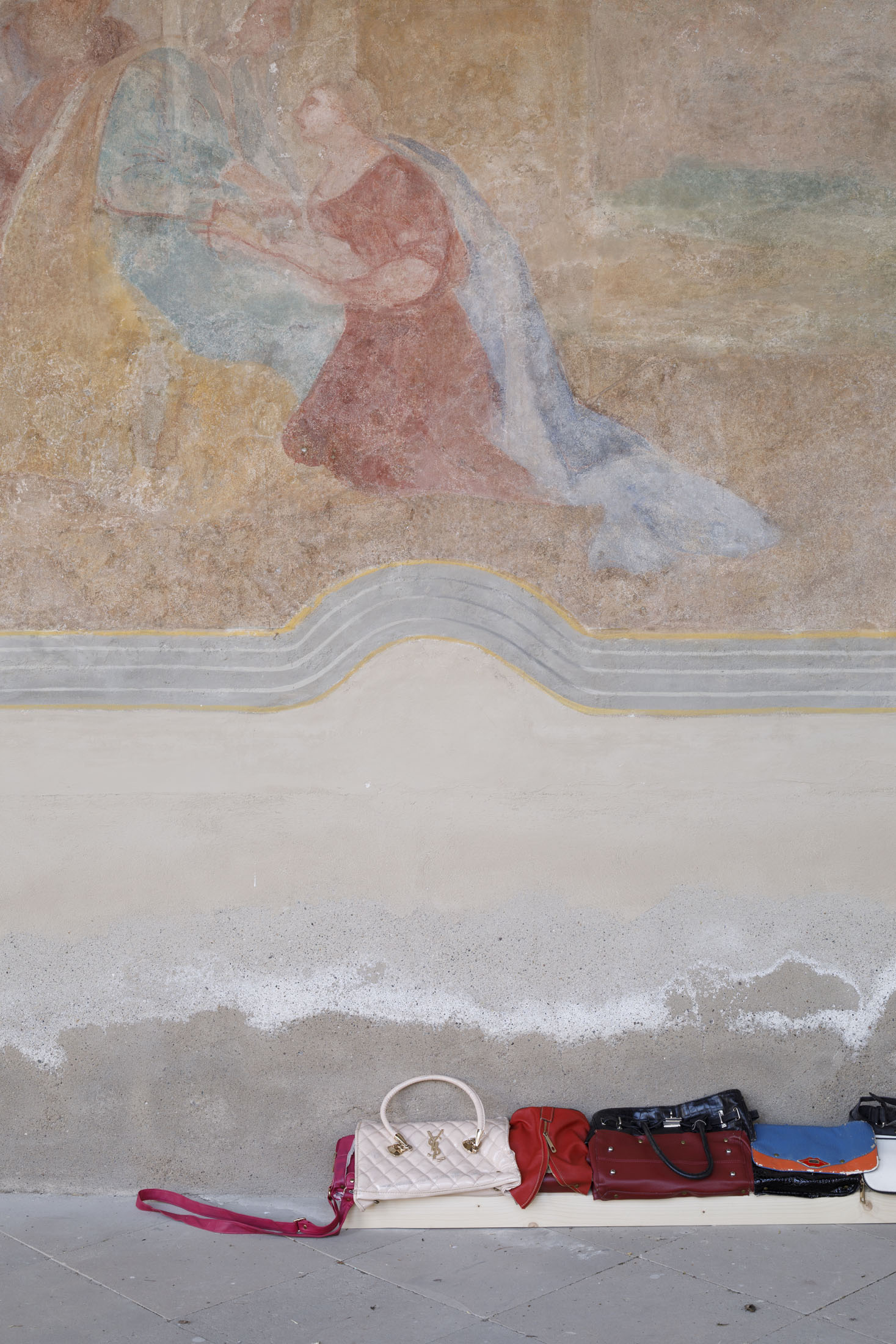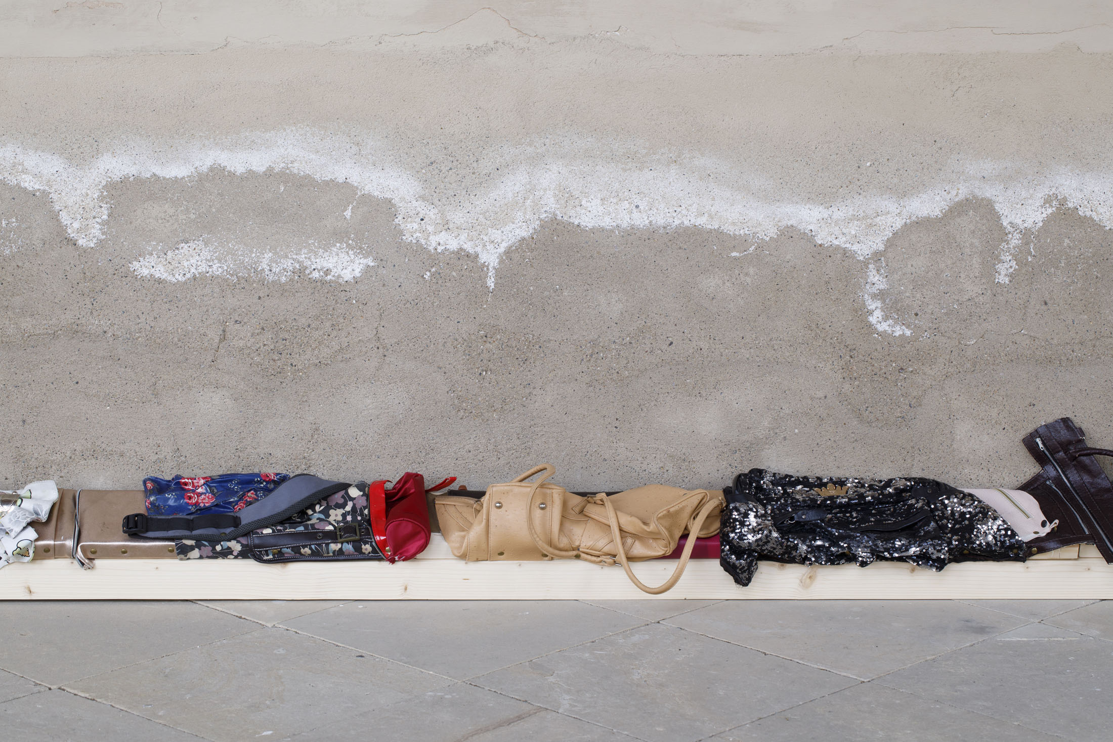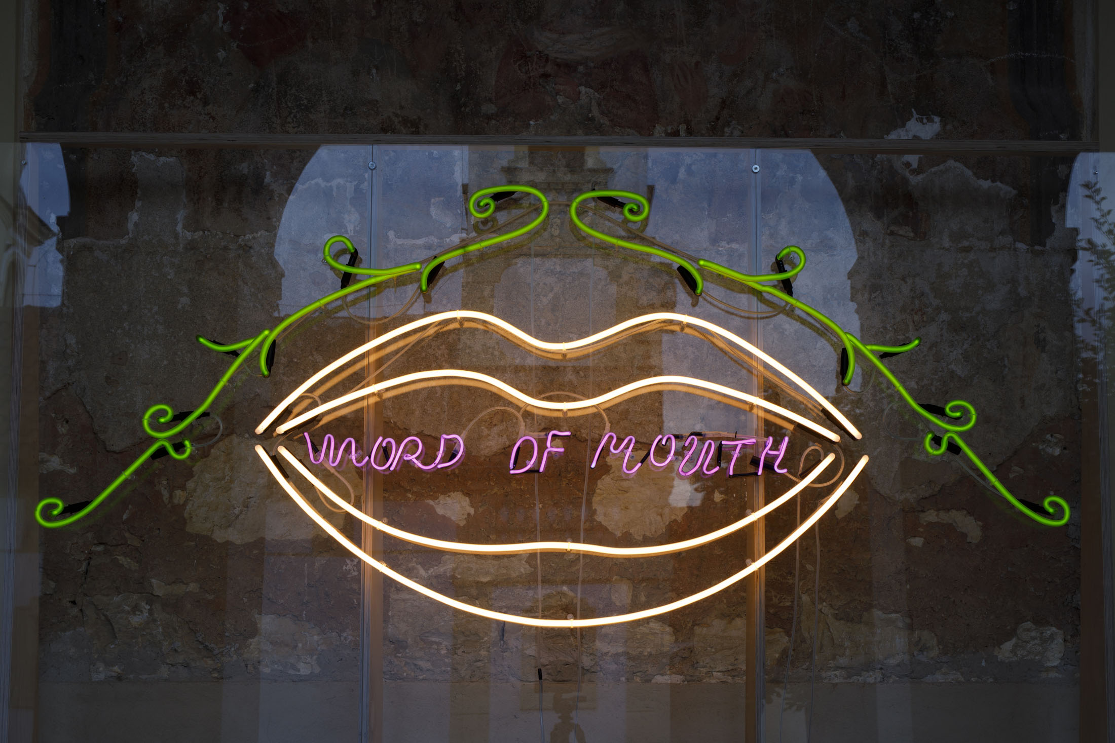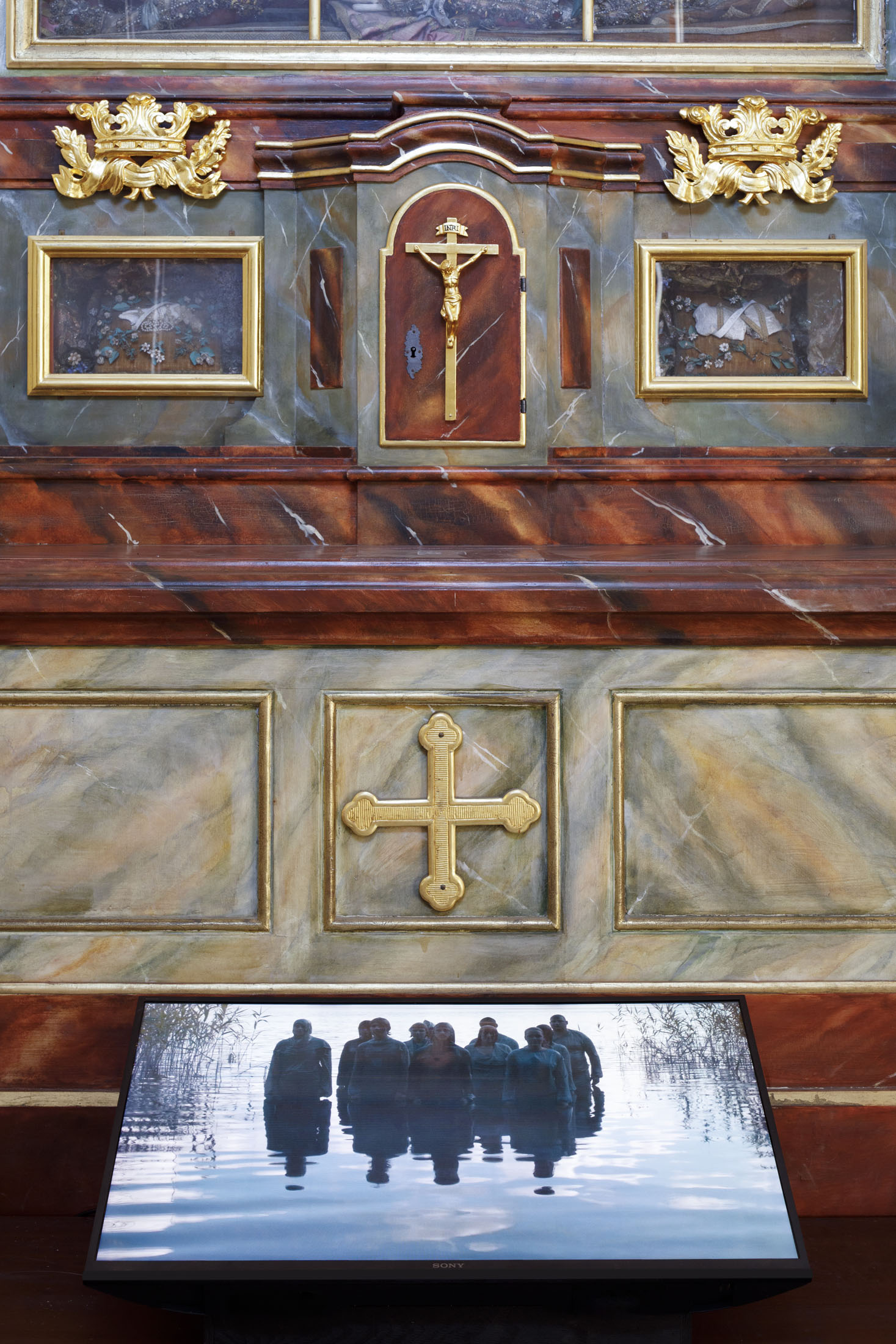 Ana Gzirishvili (b. 1992, Tbilisi, Georgia) recreates one of her pre-existing works, Locale, a site-specific sculpture assembled from second-hand women’s handbags. Acting as an elegant intervention into the space, the work creates a polyphony of unknown female voices. We hear a choir performing in a video, The Ghost (2023), by Lina Lapelytė̇ (b. 1984, Kaunas, Lithuania) installed in one of the side chapels next to the relics of St Felician. Conceived for the exhibition, Maia Naveriani (b. 1966, Tbilisi, Georgia) creates a neon installation of her drawing, Word of Mouth, incorporating text addressing both written and sonic experience and the meanings it embraces when changing contexts. Adéla Součková (b. 1985, Prague, Czech Republic) in The Polyphony of Times in a Single Moment is interested in intersection points between the animist and modern, pagan and religious, or spiritual and technological. A series of mono color digital prints of artist’s drawings on cotton rhythmically follow one another in a hallway of the monastery as if racing thoughts, incorporating various imagery of popular symbols interlaced with short poetic texts. Marie Tučková (b. 1994, Prague, Czech Republic) in her sound installation activates the historic well in the monastery courtyard. As if giving voice to the subterranean waters underneath the architecture, her delicate intervention Would you drink me when I am rotten? addresses questions of power, control and memory, looking at the water not merely as a natural resource, but also in terms of its historical and symbolic meaning.