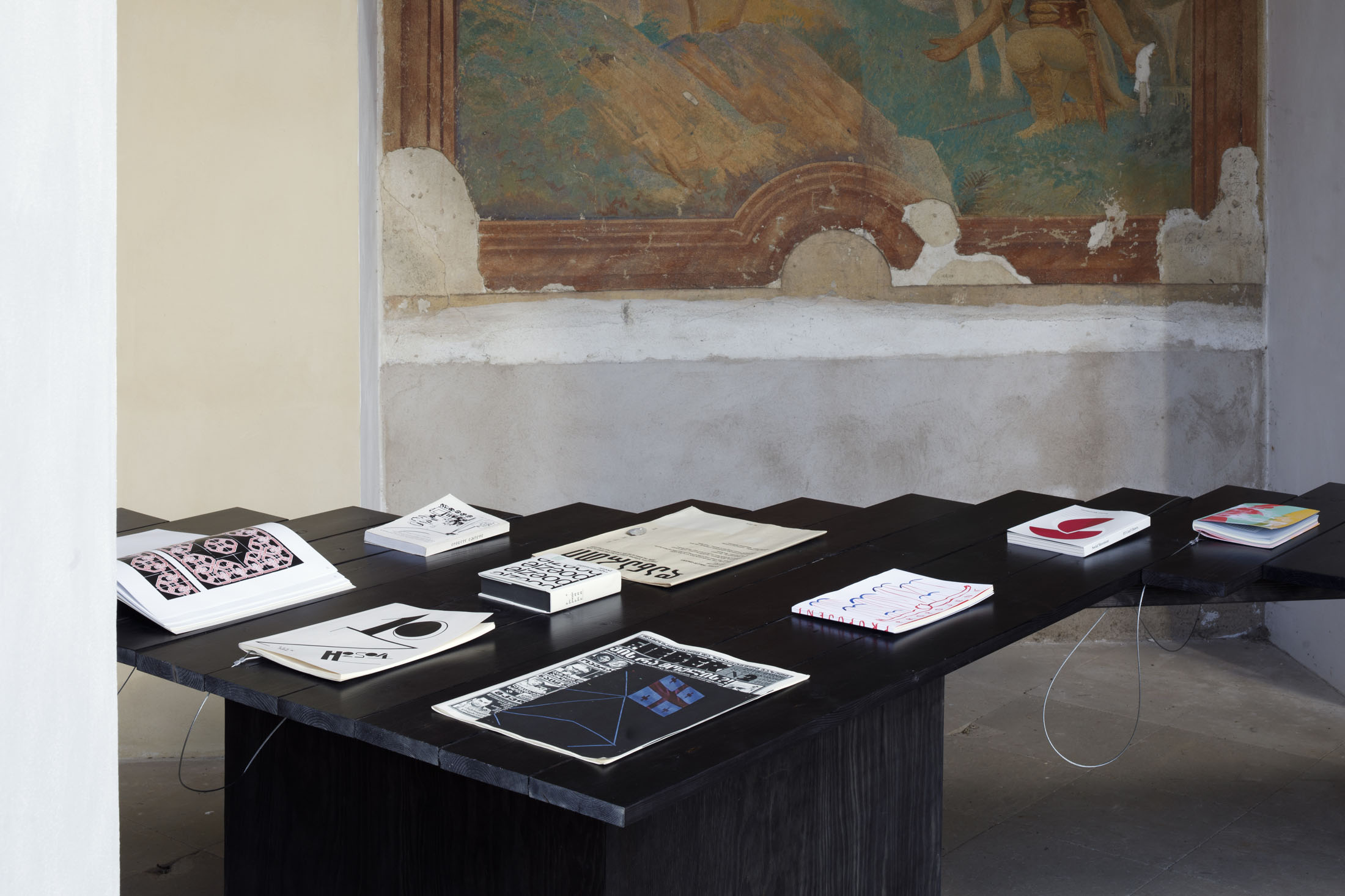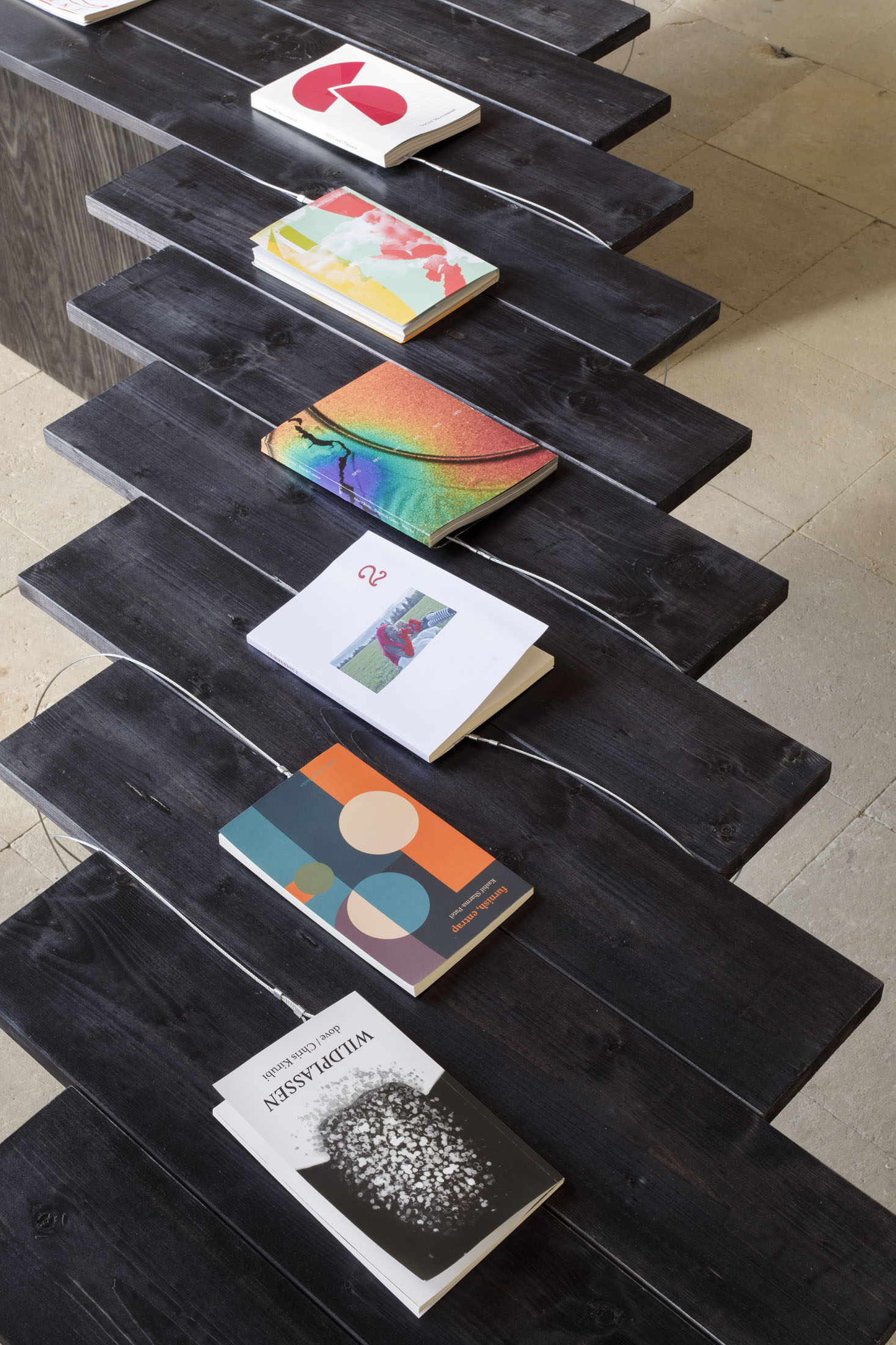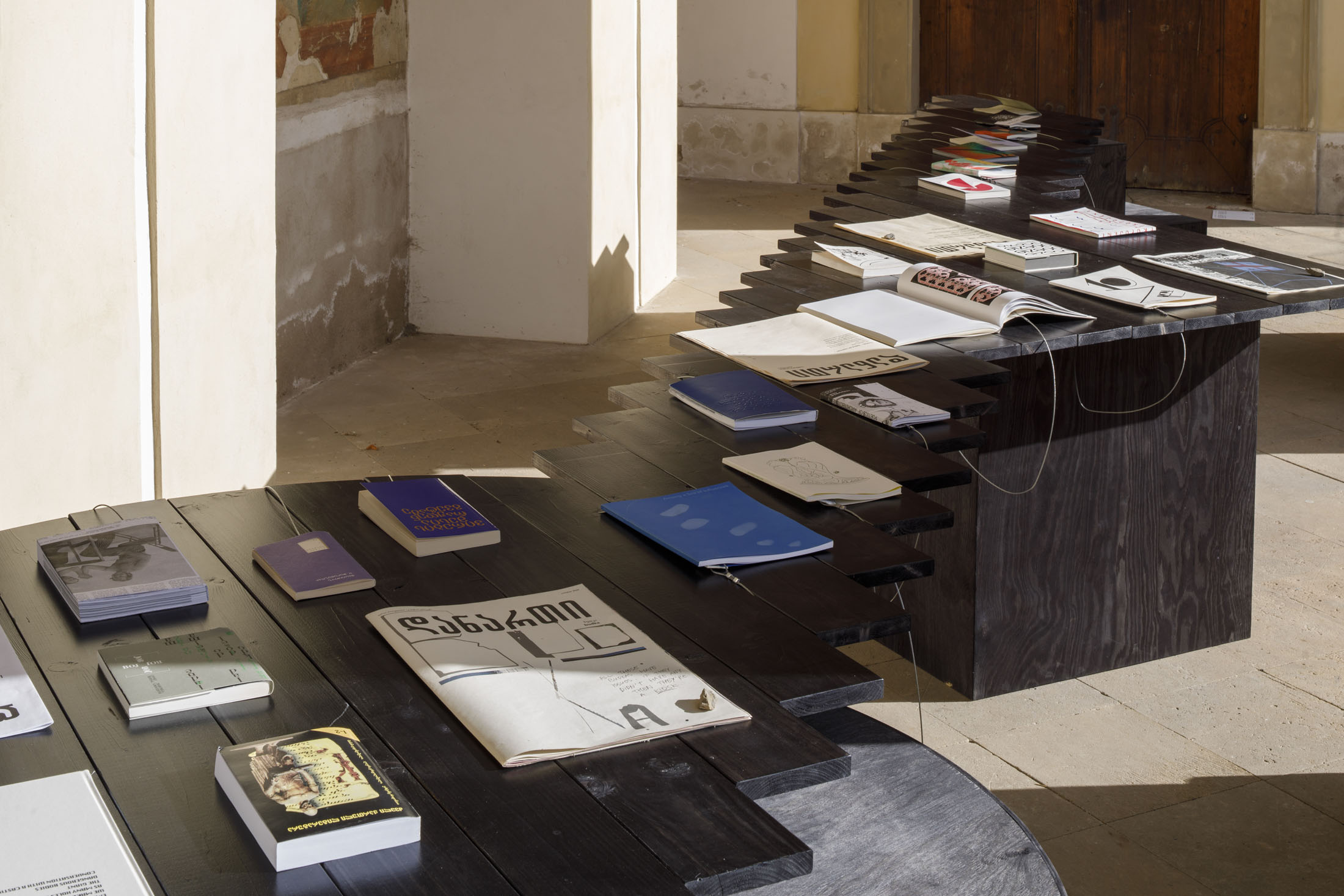 One of the central aspects of the exhibition is a curated library in the form of a dining table, conceived by the artist and product designer Lado Lomitashvili (b. 1994, Tbilisi, Georgia). It takes root in the Georgian traditional feast “Supra”, often led by poets while accompanied by a polyphonic choir. The table hosts a collection of publications selected by various independent bookshops, publishing houses and researchers. Dominated by the variety of languages, the publications focus on the ideas of polyphony, internationalism, and other topics explored within written text, be it poetry, fiction, critical thought and other.
