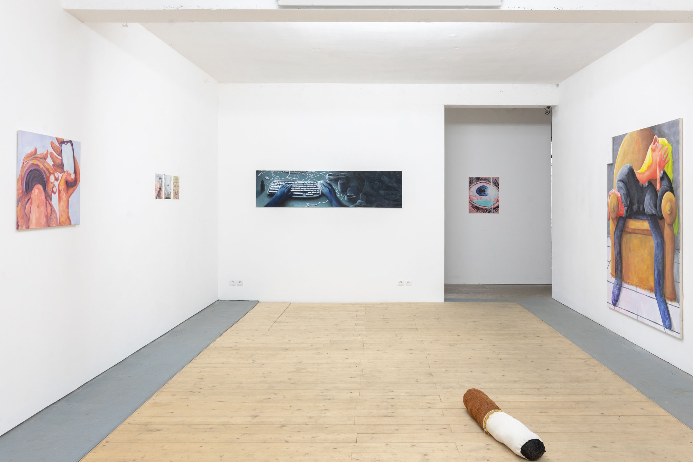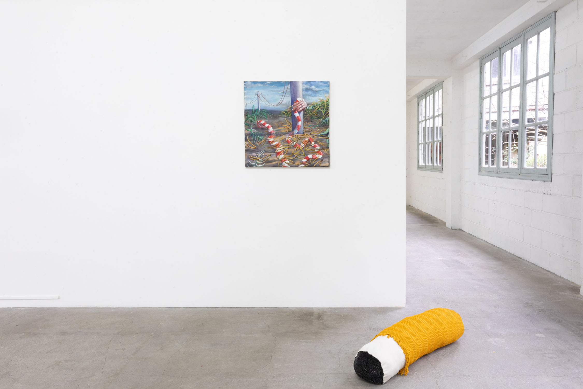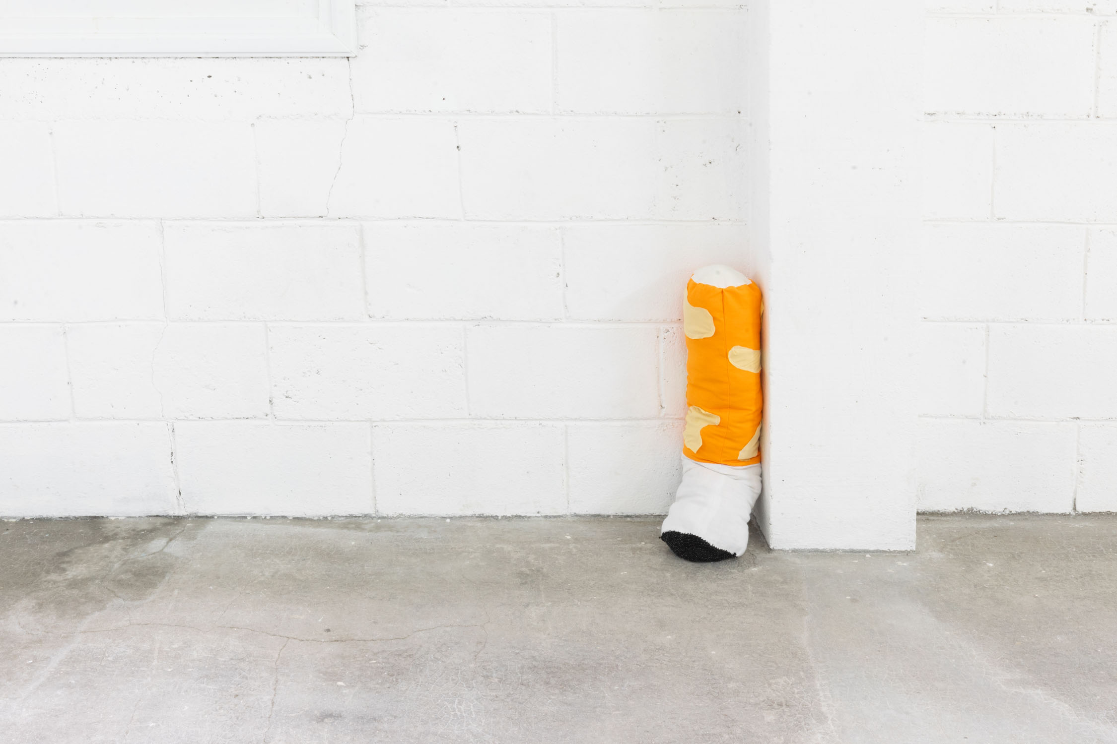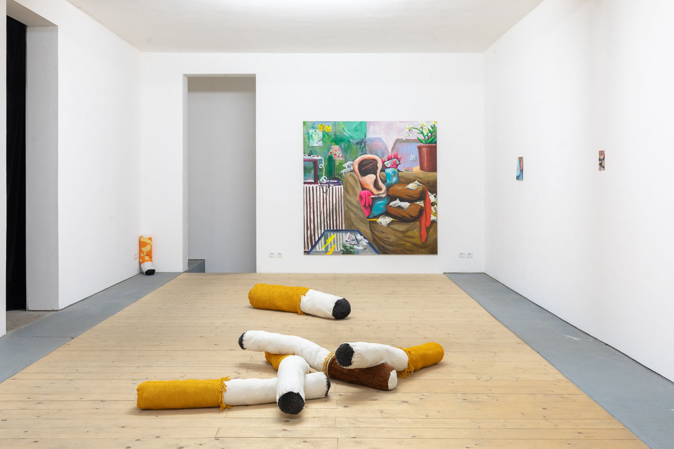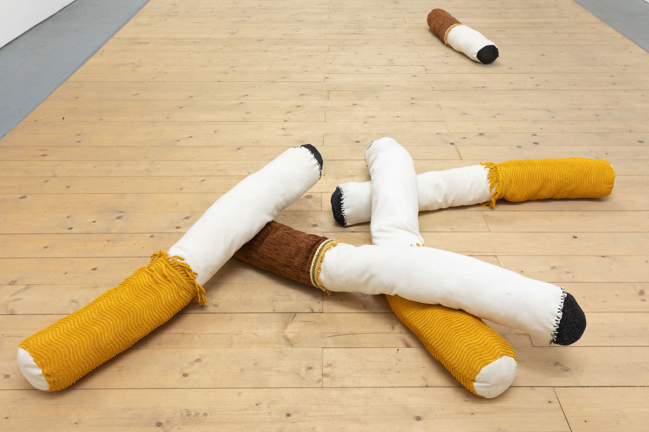 For the installation of Lazy Time, Riccardi has scattered a series of soft sculptures of smoked cigarettes throughout the spaces as if the exhibition is taking place in a waiting-room ashtray. Ricciardi portrays moments of intimacy, aloneness, as well as collective and social encounters, as distractions and passing time; smoking, sitting on the toilet doom scrolling, and hanging-out taking selfies. The characters of this world are exhausting themselves in pastimes and entertainment in more and more futile attempts to escape a profound boredom which threatens to destabilise how they bring meaning and value into their lives. This is not a boredom with things, but a more profound boredom that saturates and makes visible contemporary life.