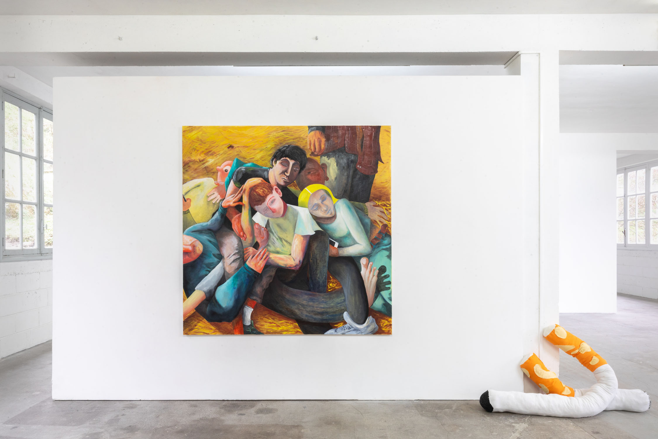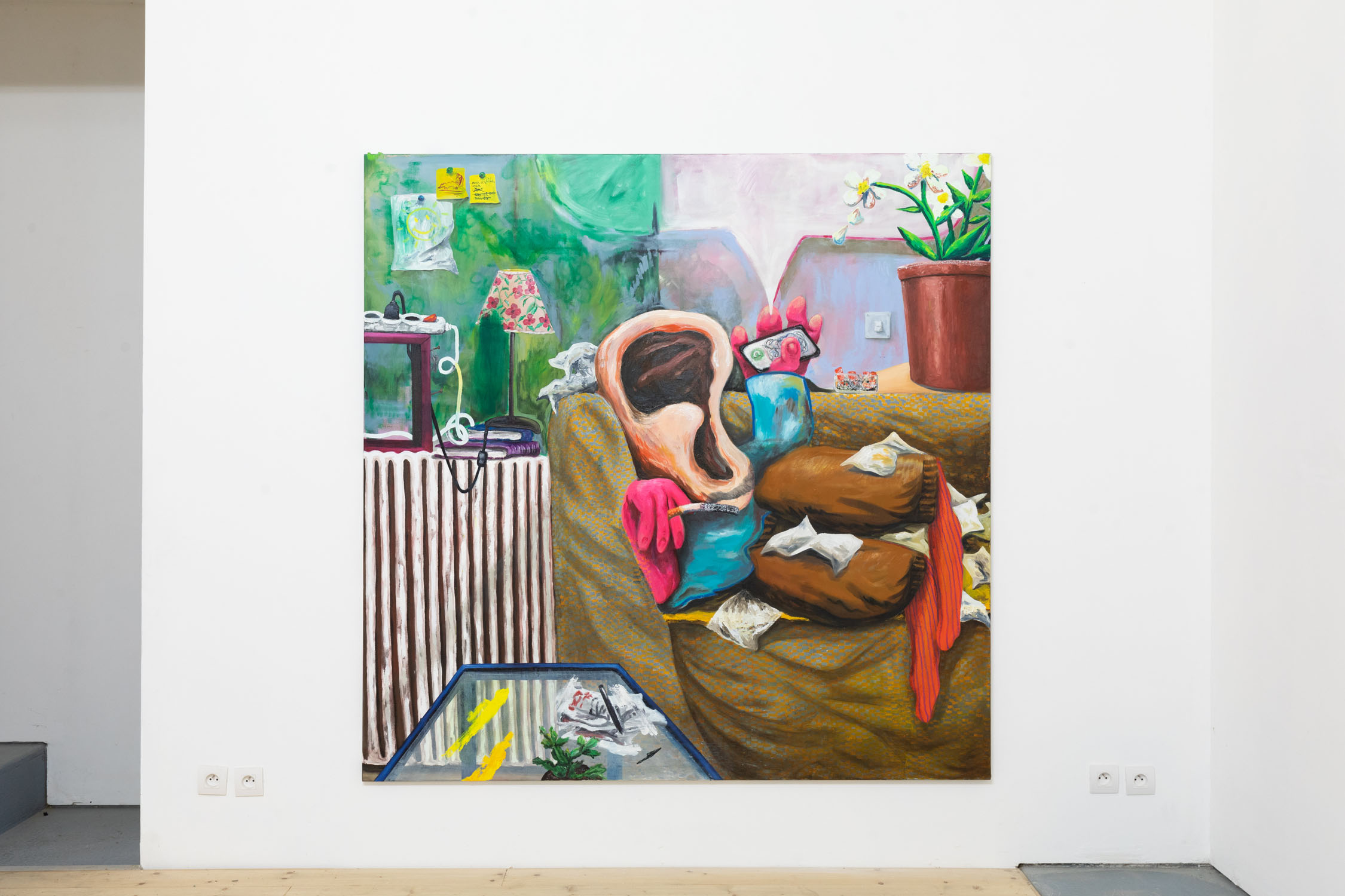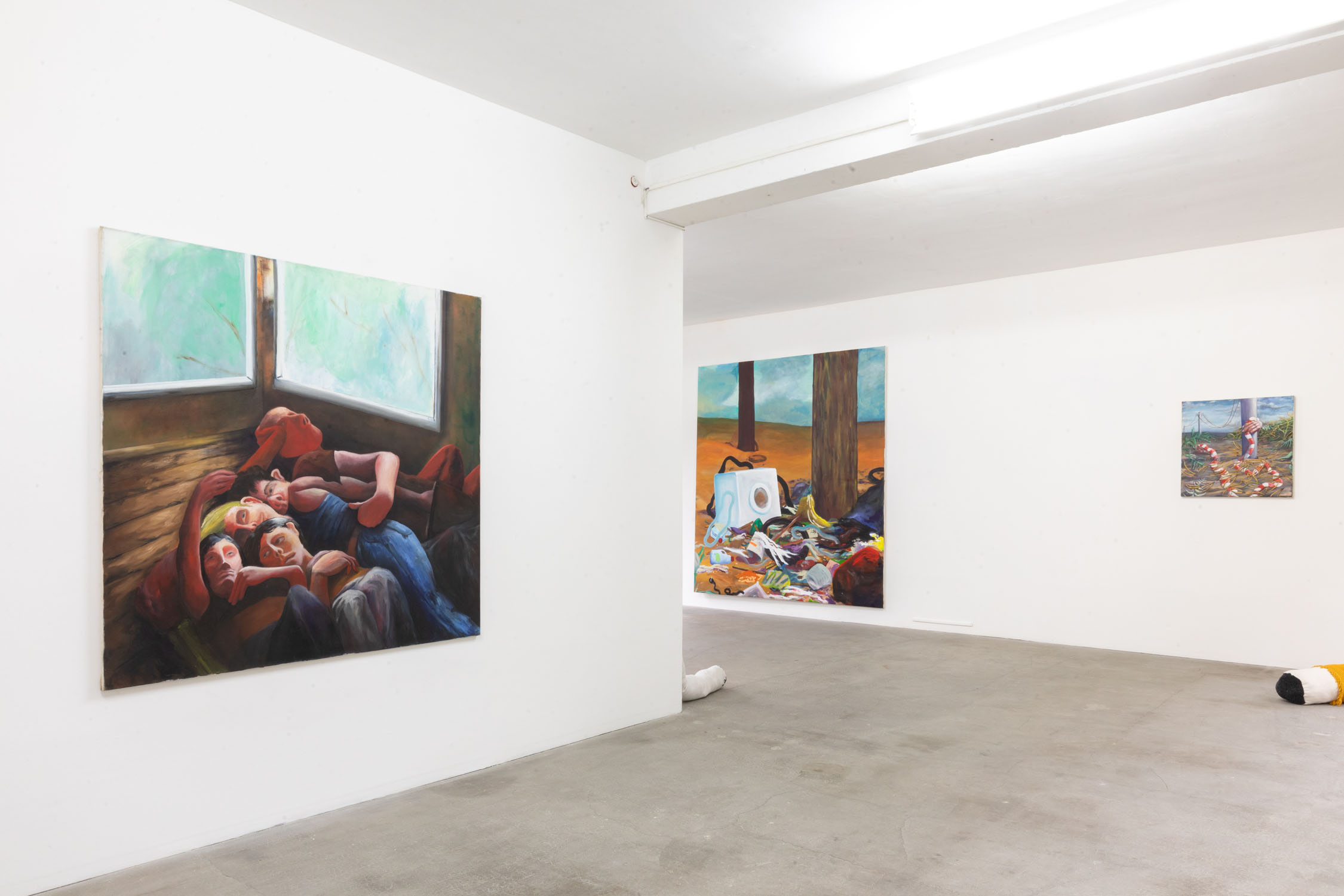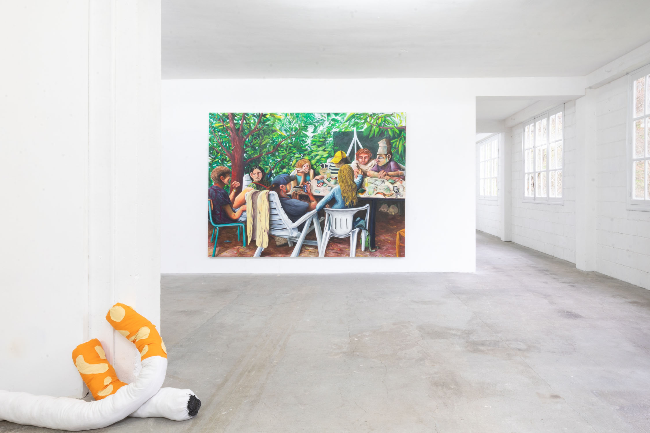 For the installation of Lazy Time, Riccardi has scattered a series of soft sculptures of smoked cigarettes throughout the spaces as if the exhibition is taking place in a waiting-room ashtray. Ricciardi portrays moments of intimacy, aloneness, as well as collective and social encounters, as distractions and passing time; smoking, sitting on the toilet doom scrolling, and hanging-out taking selfies. The characters of this world are exhausting themselves in pastimes and entertainment in more and more futile attempts to escape a profound boredom which threatens to destabilise how they bring meaning and value into their lives. This is not a boredom with things, but a more profound boredom that saturates and makes visible contemporary life.