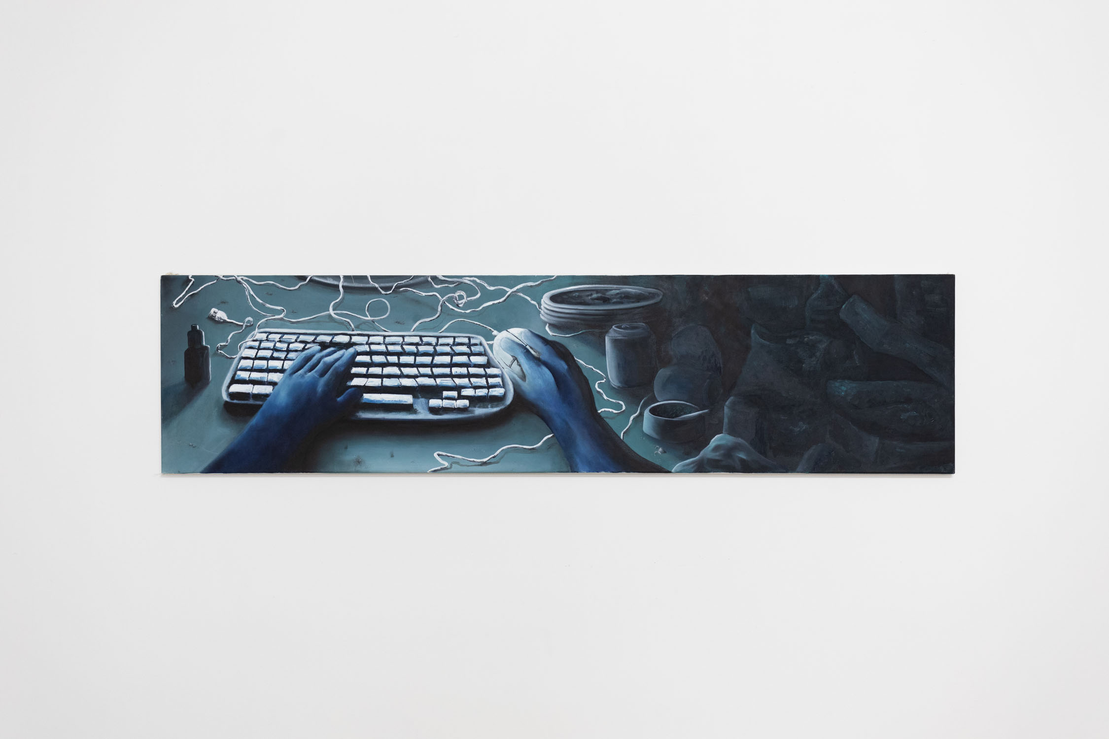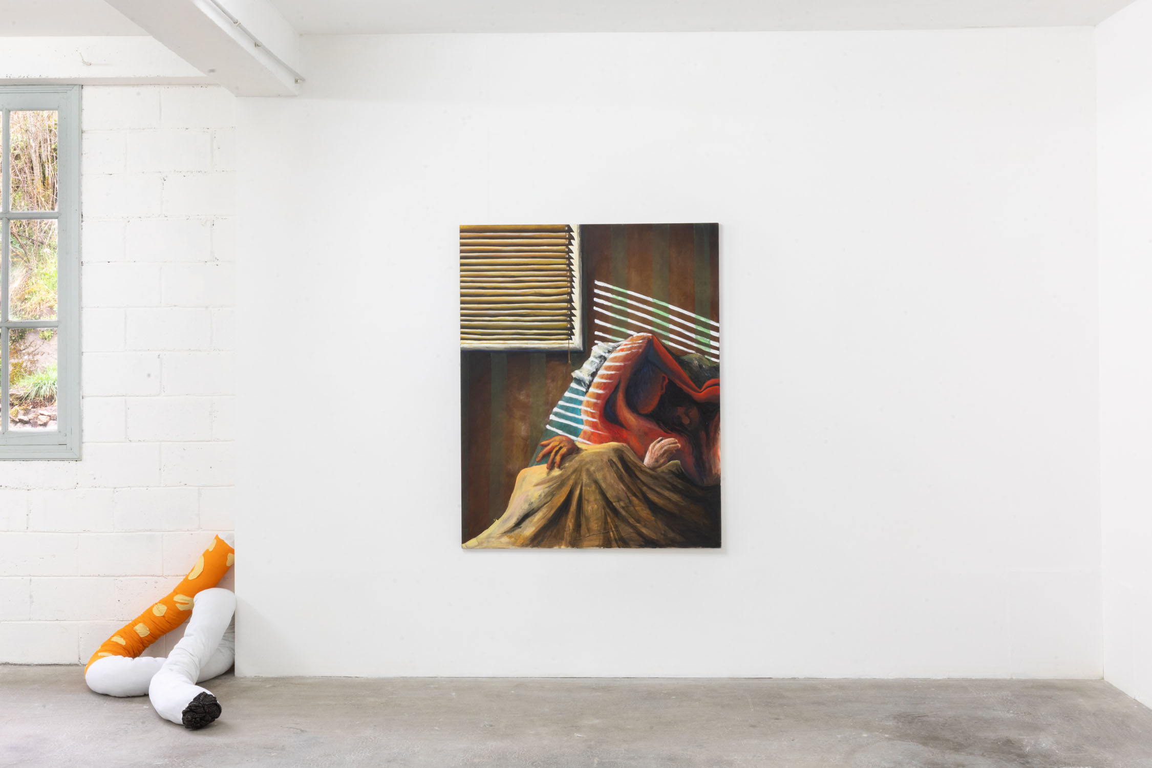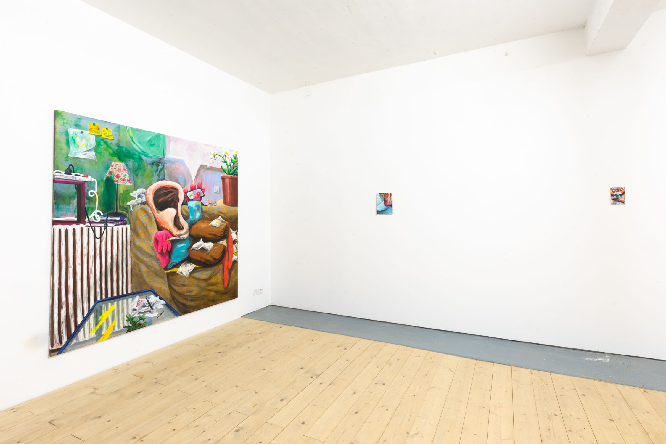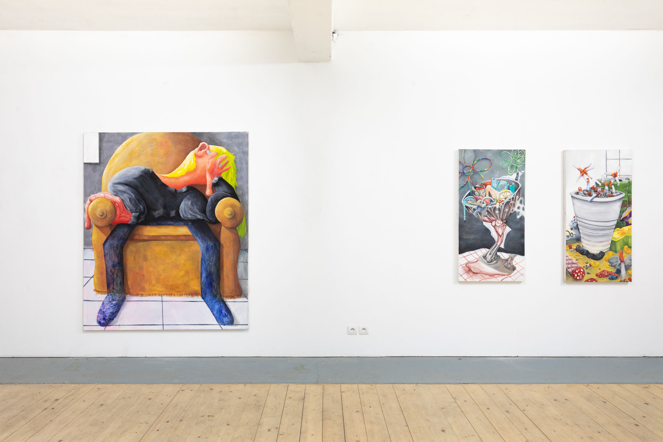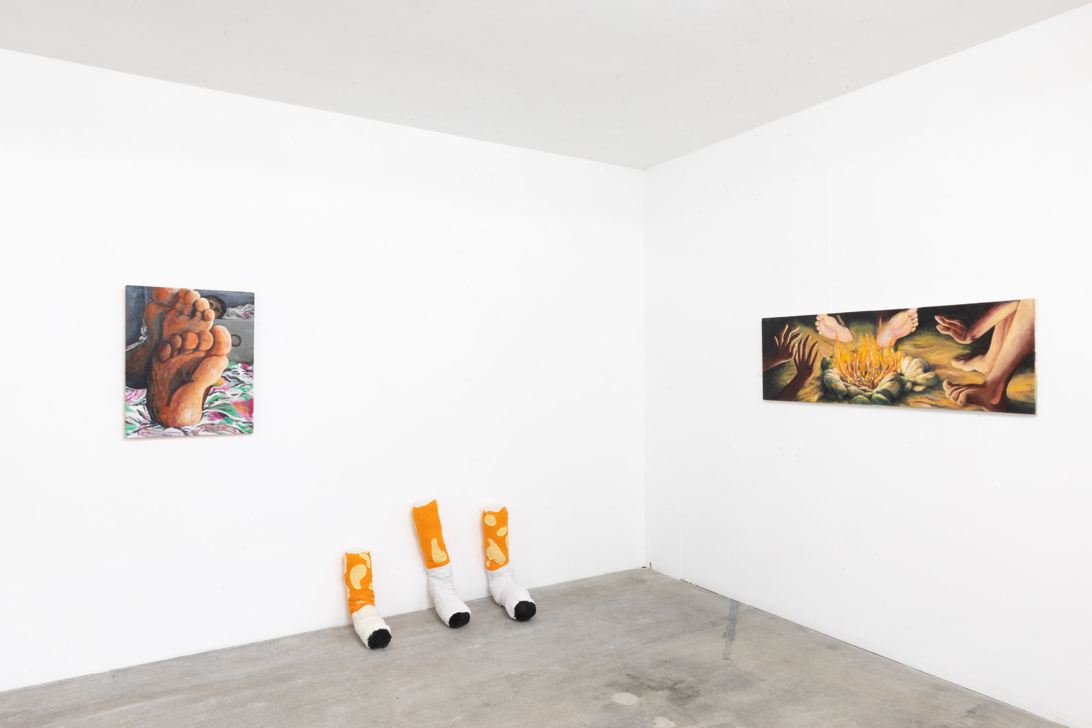 For the installation of Lazy Time, Riccardi has scattered a series of soft sculptures of smoked cigarettes throughout the spaces as if the exhibition is taking place in a waiting-room ashtray. Ricciardi portrays moments of intimacy, aloneness, as well as collective and social encounters, as distractions and passing time; smoking, sitting on the toilet doom scrolling, and hanging-out taking selfies. The characters of this world are exhausting themselves in pastimes and entertainment in more and more futile attempts to escape a profound boredom which threatens to destabilise how they bring meaning and value into their lives. This is not a boredom with things, but a more profound boredom that saturates and makes visible contemporary life.