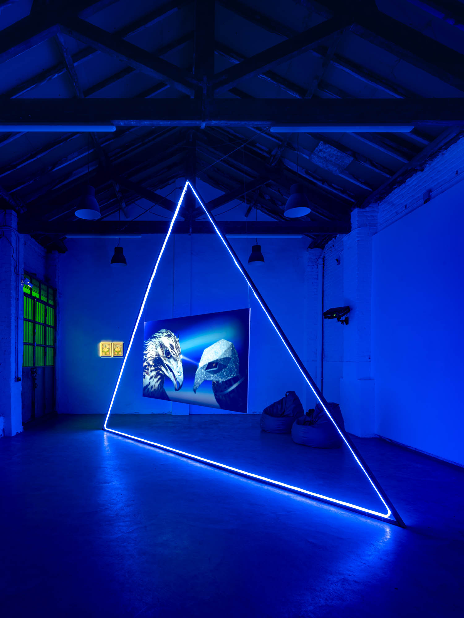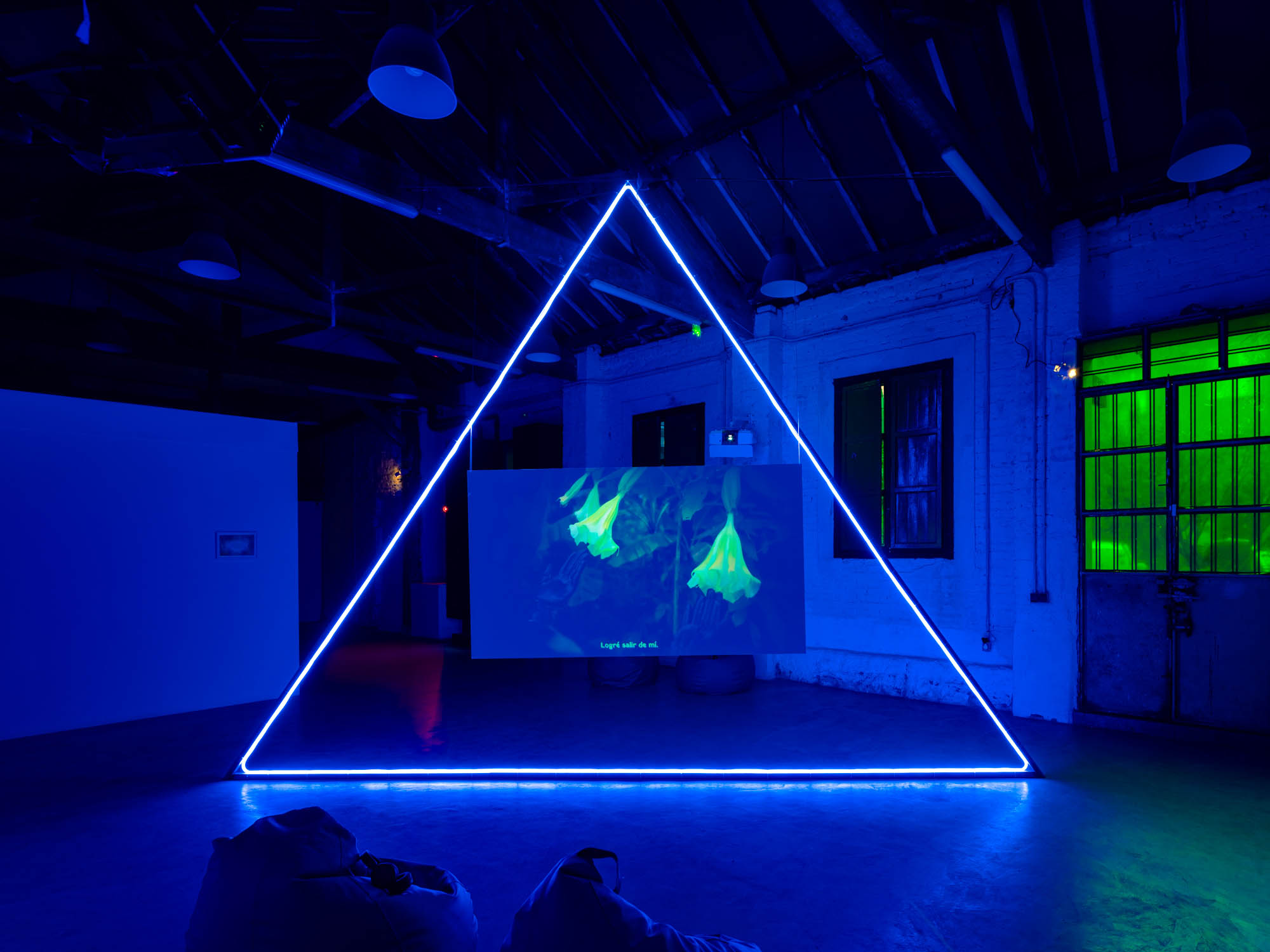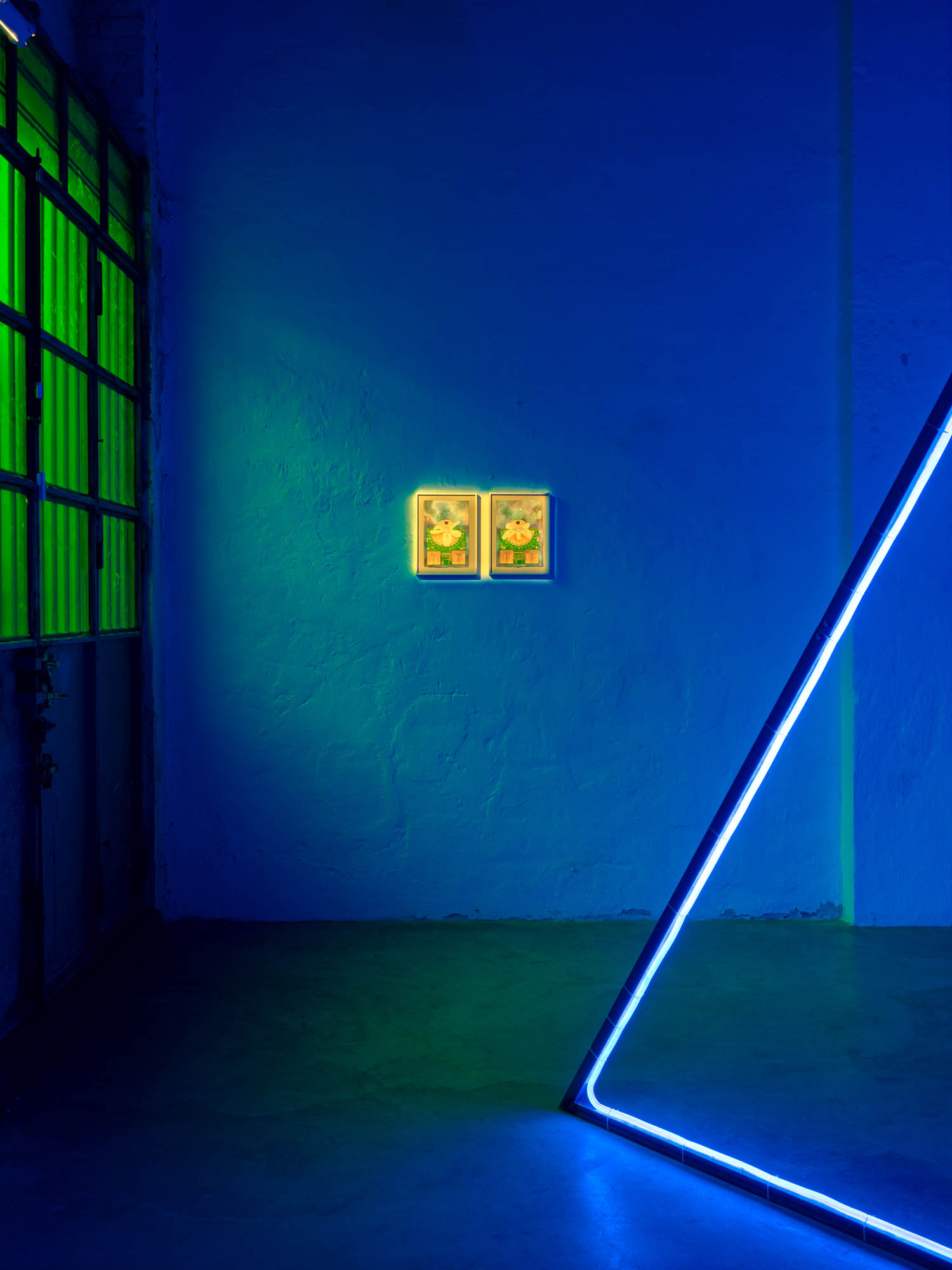 The concept of “portal” frames the intention behind bringing together video, photographic, sculptural, and pictorial works in one space: Lactómeda . In theoretical physics, portals are attempts to understand how different worlds interact with each other to form the space we live in. This is a recurring theme in the language of physical sciences, describing entanglement, connection, and the transport from one world to another. Elevators, phone screens, and airplanes—metaphors for portals—recur throughout Domínguez’s oeuvre. The exhibition design, which presents a balance of blue and green in an immersive light-altering space, takes the form of a portal.
