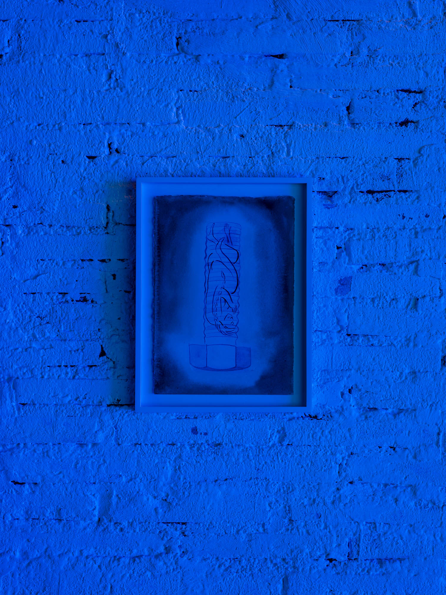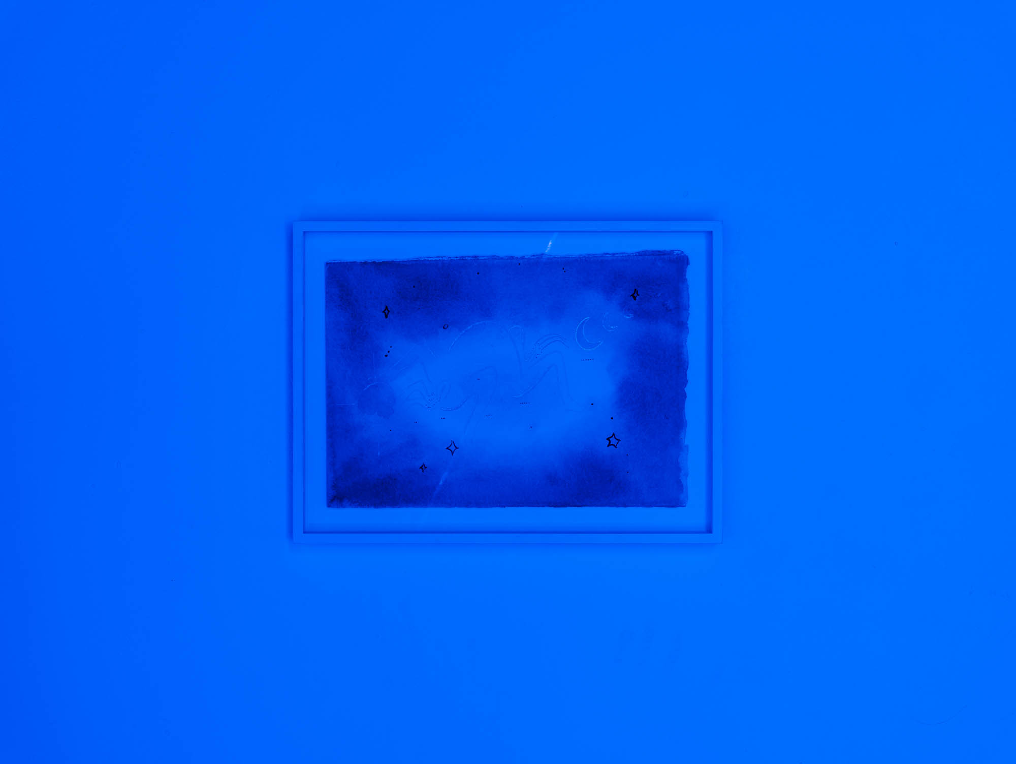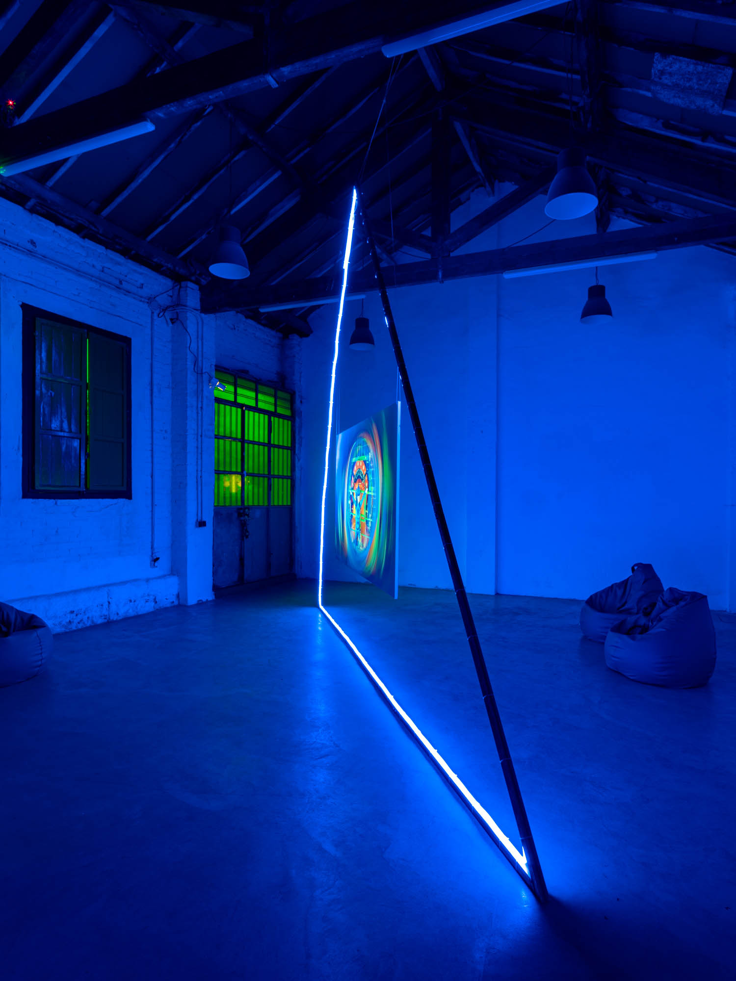 The concept of “portal” frames the intention behind bringing together video, photographic, sculptural, and pictorial works in one space: Lactómeda . In theoretical physics, portals are attempts to understand how different worlds interact with each other to form the space we live in. This is a recurring theme in the language of physical sciences, describing entanglement, connection, and the transport from one world to another. Elevators, phone screens, and airplanes—metaphors for portals—recur throughout Domínguez’s oeuvre. The exhibition design, which presents a balance of blue and green in an immersive light-altering space, takes the form of a portal.