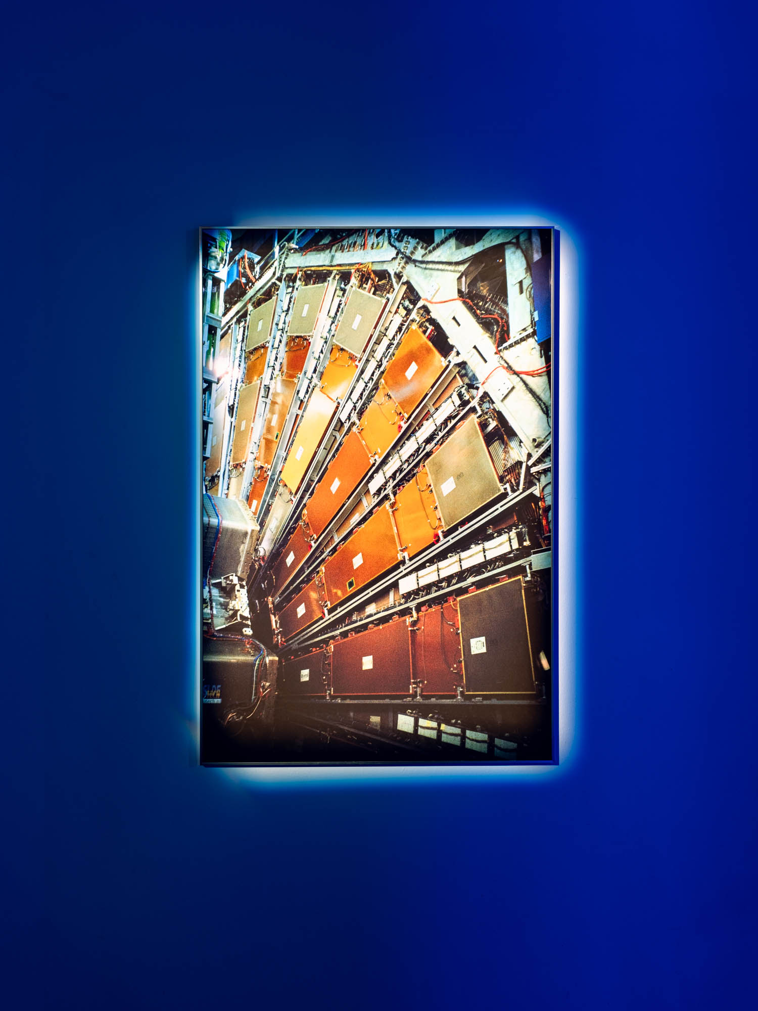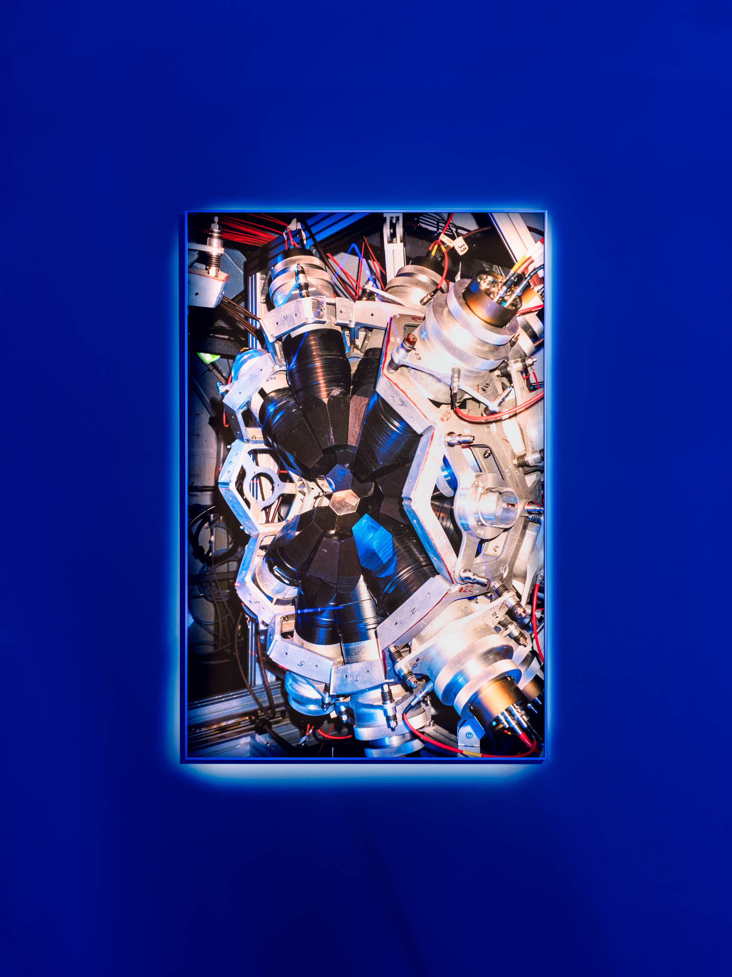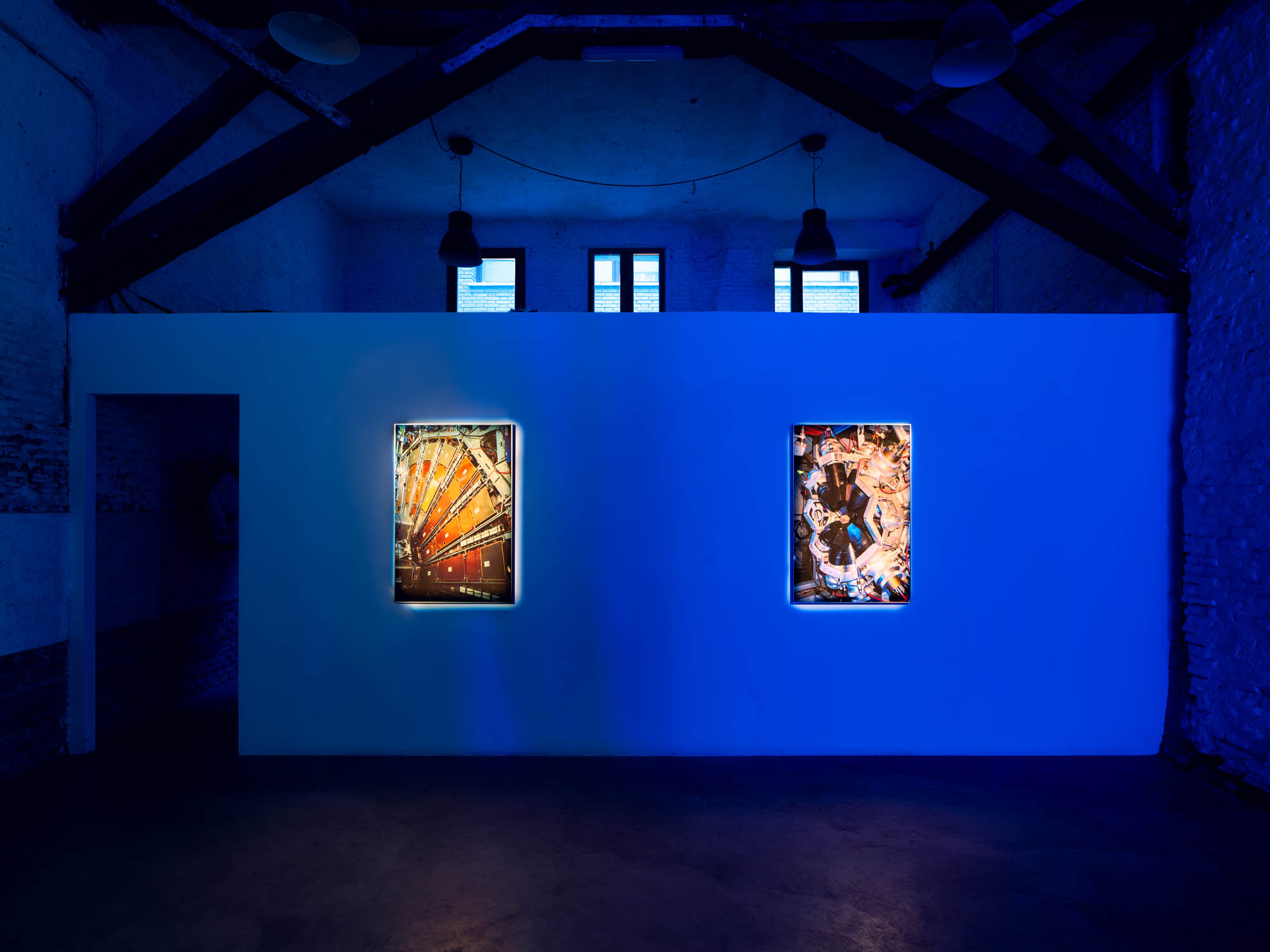 Quantum entanglement is a counterintuitive phenomenon in which a change in one particle instantly affects another, regardless of the distance between them. Two particles can share states and communicate, even when separated by billions of light-years. Tres Lunas Más Abajo and the analog photographs taken inside CERN tell an emotional story of entanglement, as a protagonist searches for their lost particle with the help of a robotic bird, which also appears (twice) within this exhibition space. The analog photographs capture the beating heart of contemporary technological mechanisms at CERN through the older technological medium of analog photography. Through this, the artist establishes a dialogue between the old and the new in science, where past and future devices unite in a luminous dance of relativity.