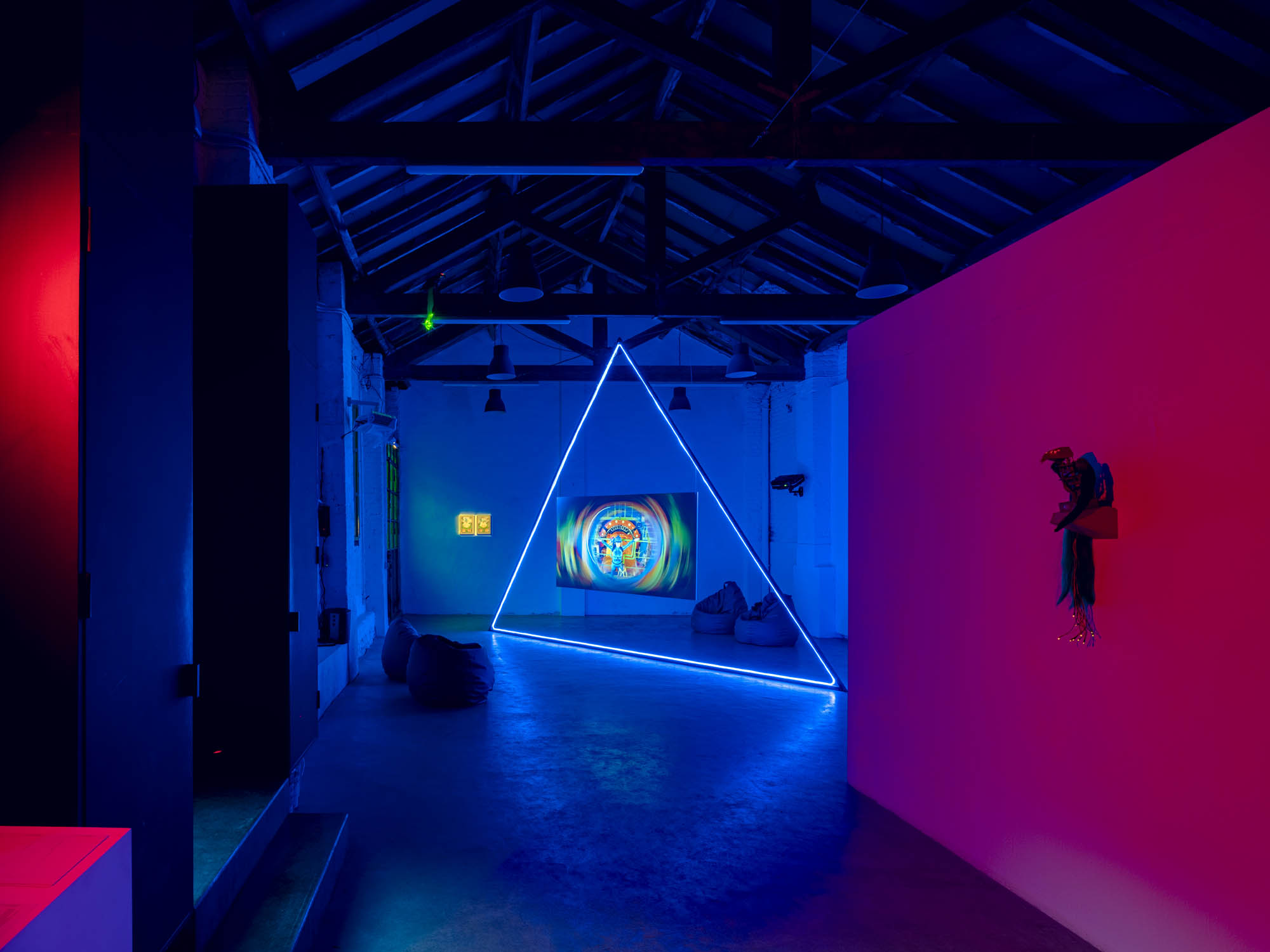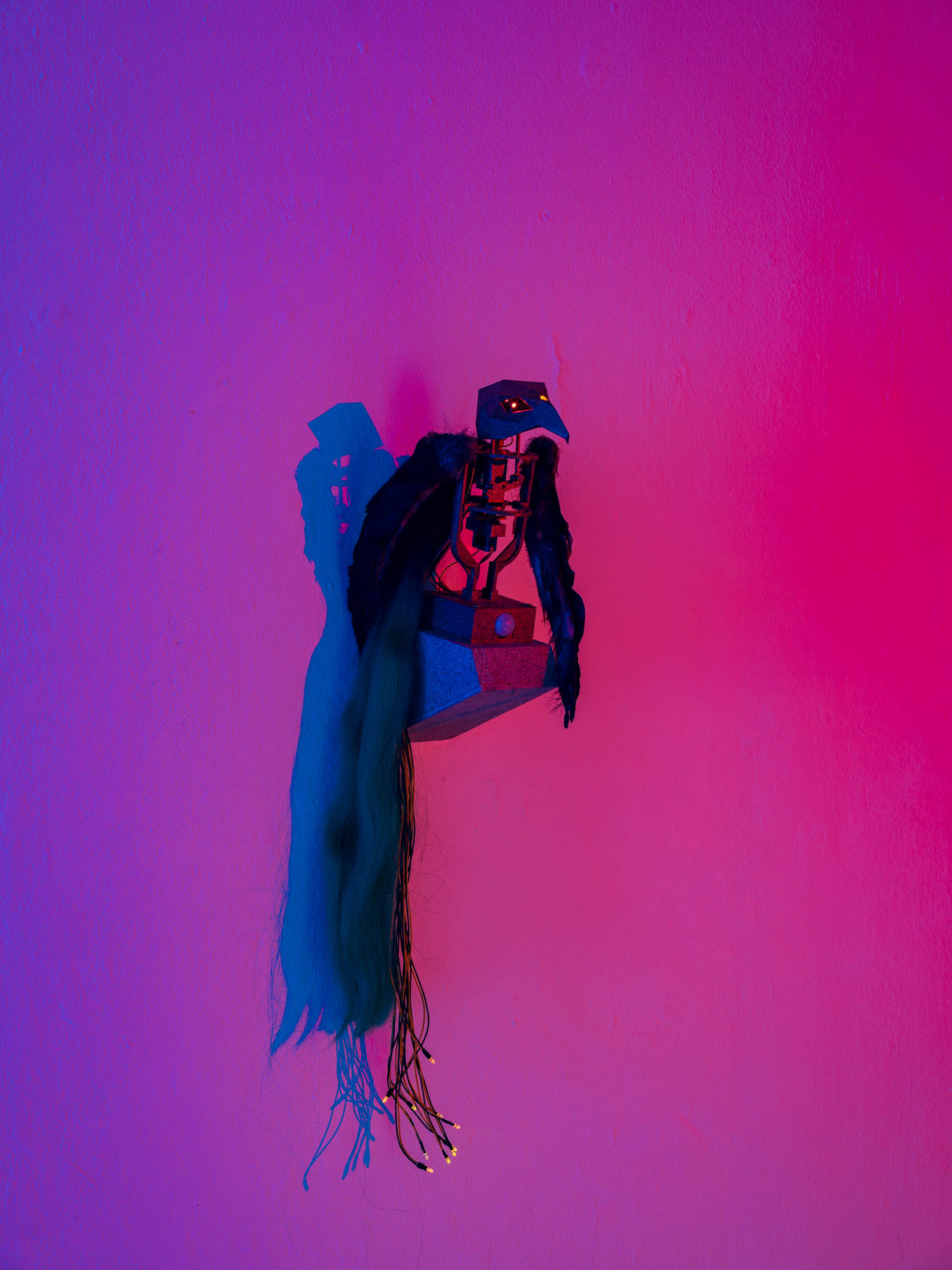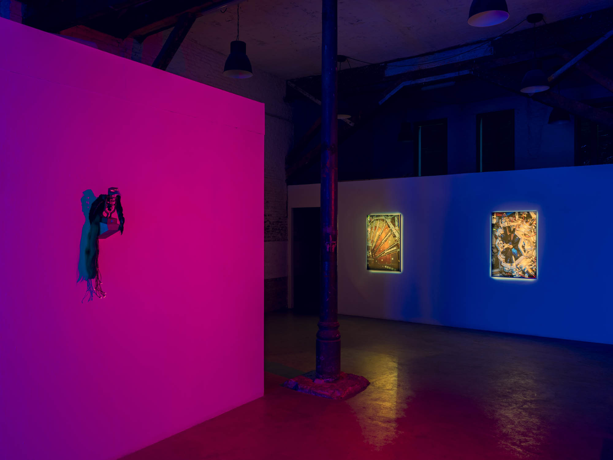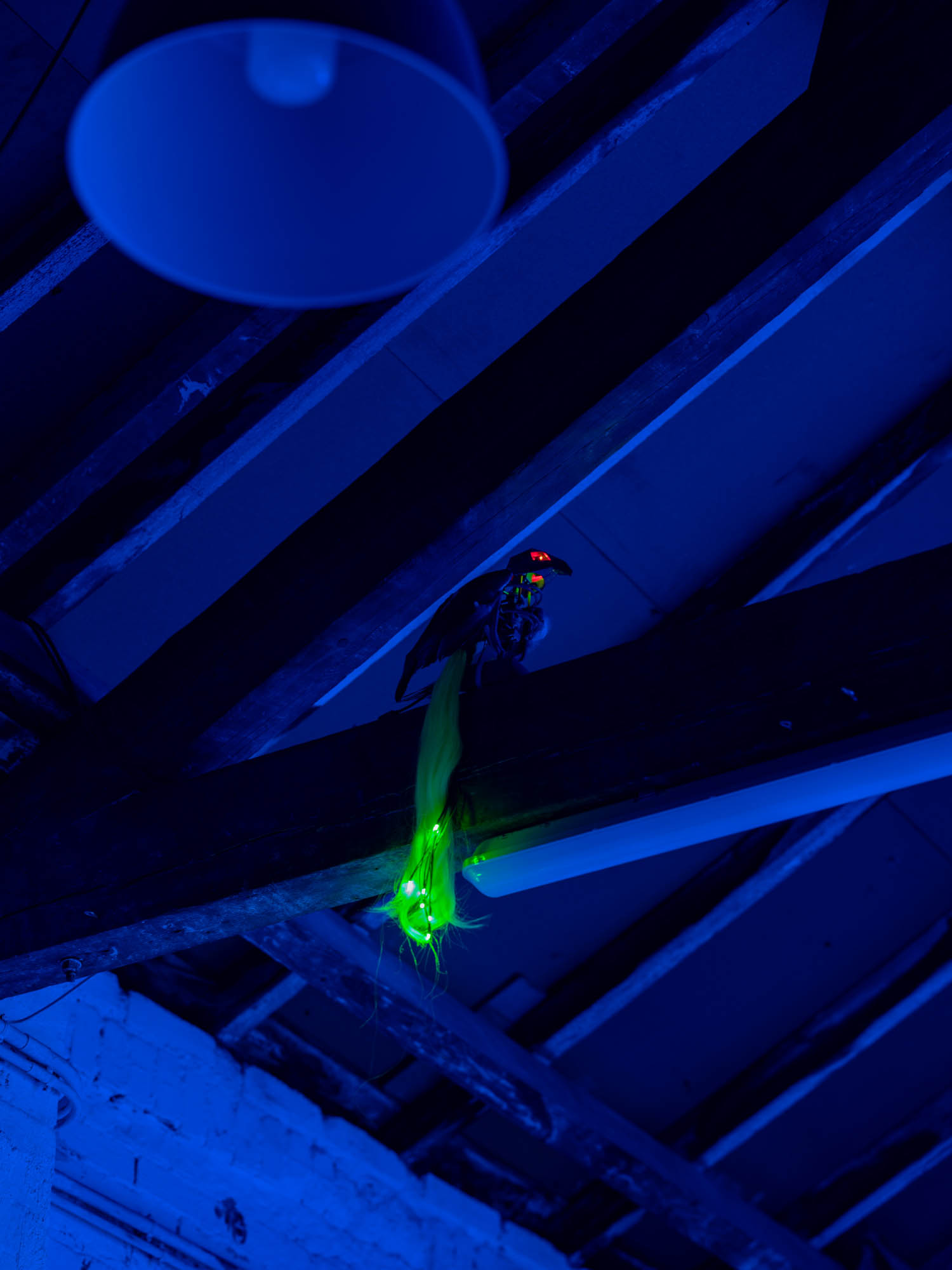 Quantum entanglement is a counterintuitive phenomenon in which a change in one particle instantly affects another, regardless of the distance between them. Two particles can share states and communicate, even when separated by billions of light-years. Tres Lunas Más Abajo and the analog photographs taken inside CERN tell an emotional story of entanglement, as a protagonist searches for their lost particle with the help of a robotic bird, which also appears (twice) within this exhibition space. The analog photographs capture the beating heart of contemporary technological mechanisms at CERN through the older technological medium of analog photography. Through this, the artist establishes a dialogue between the old and the new in science, where past and future devices unite in a luminous dance of relativity.