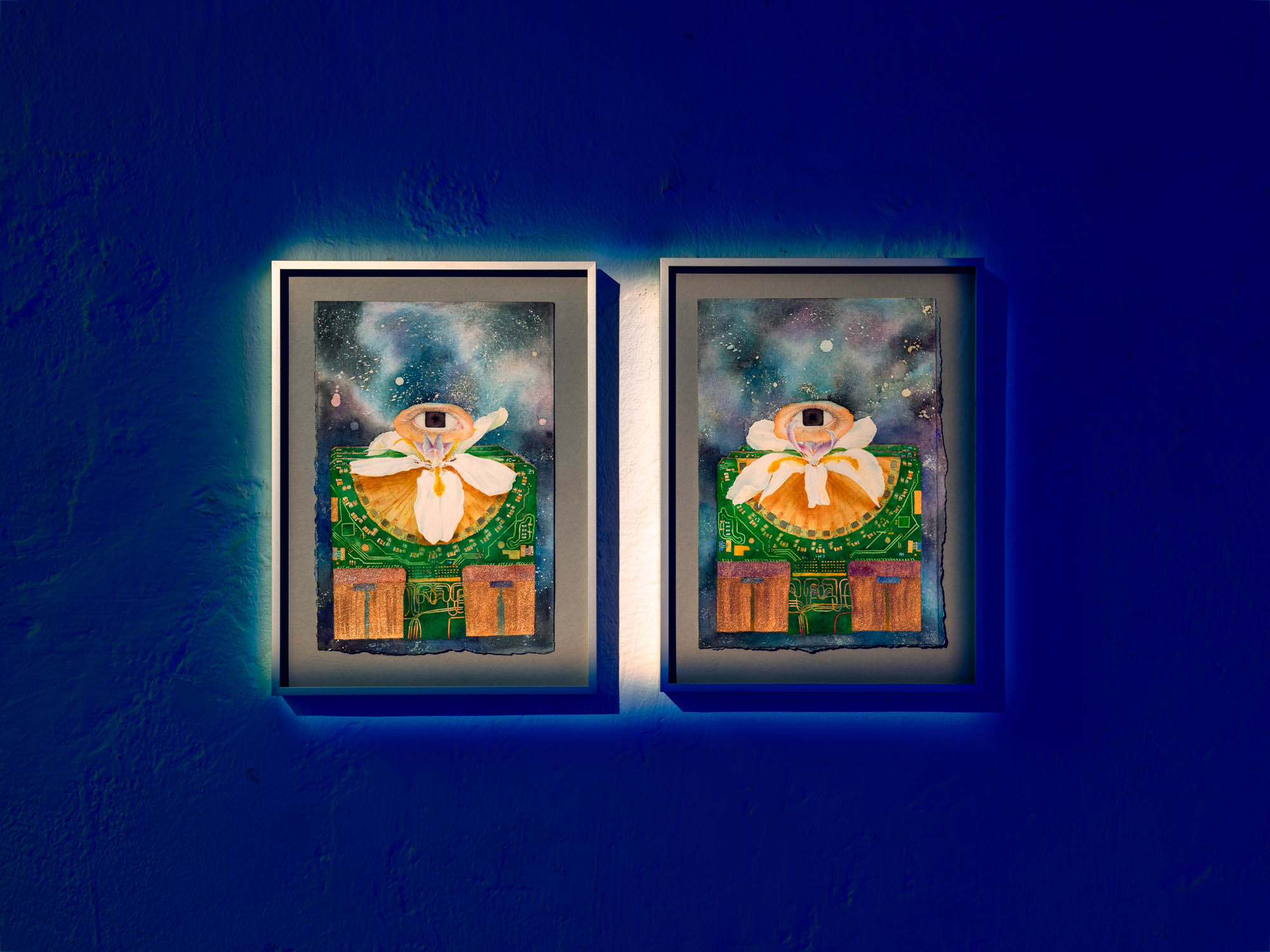 At the ALMA radio telescope and the ESO astronomical facilities, Domínguez used enormous telescopes to look outward, observing stars and galaxies. These conceptions of interstellar universes, and the theories of technological interconnection that illustrate their presence, can be read through Pupilas Geométricas. In these watercolors, we enter the artist’s dream of a flight from Switzerland to Chile. The travelers have rectangular pupils that transform into inter-somatic and surreal portals toward an alternative consciousness.