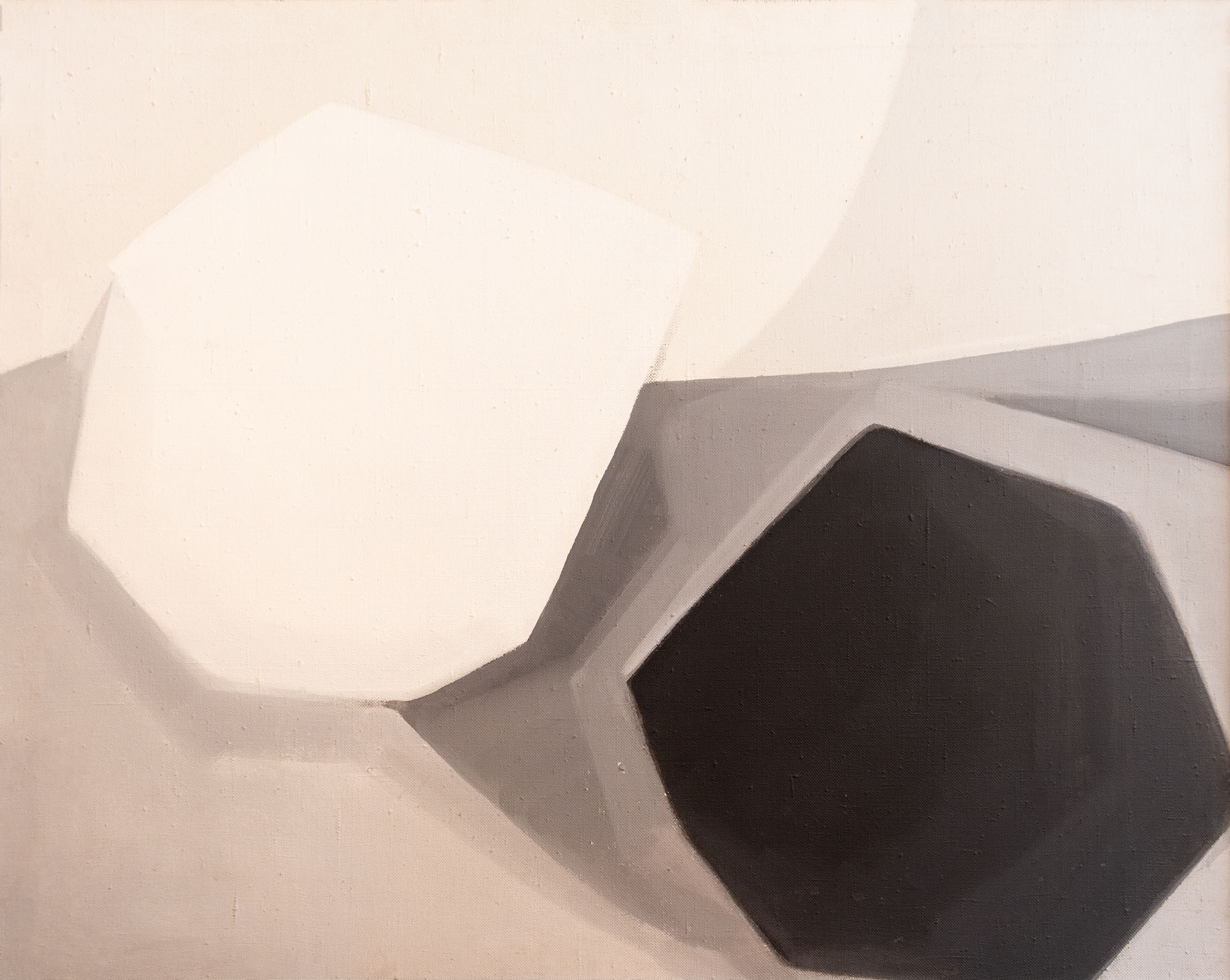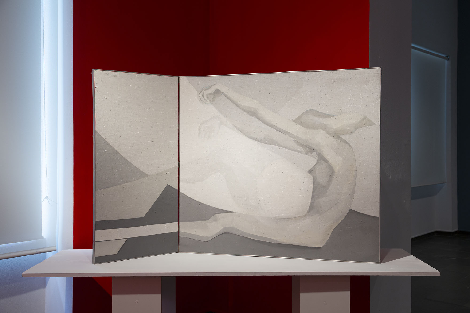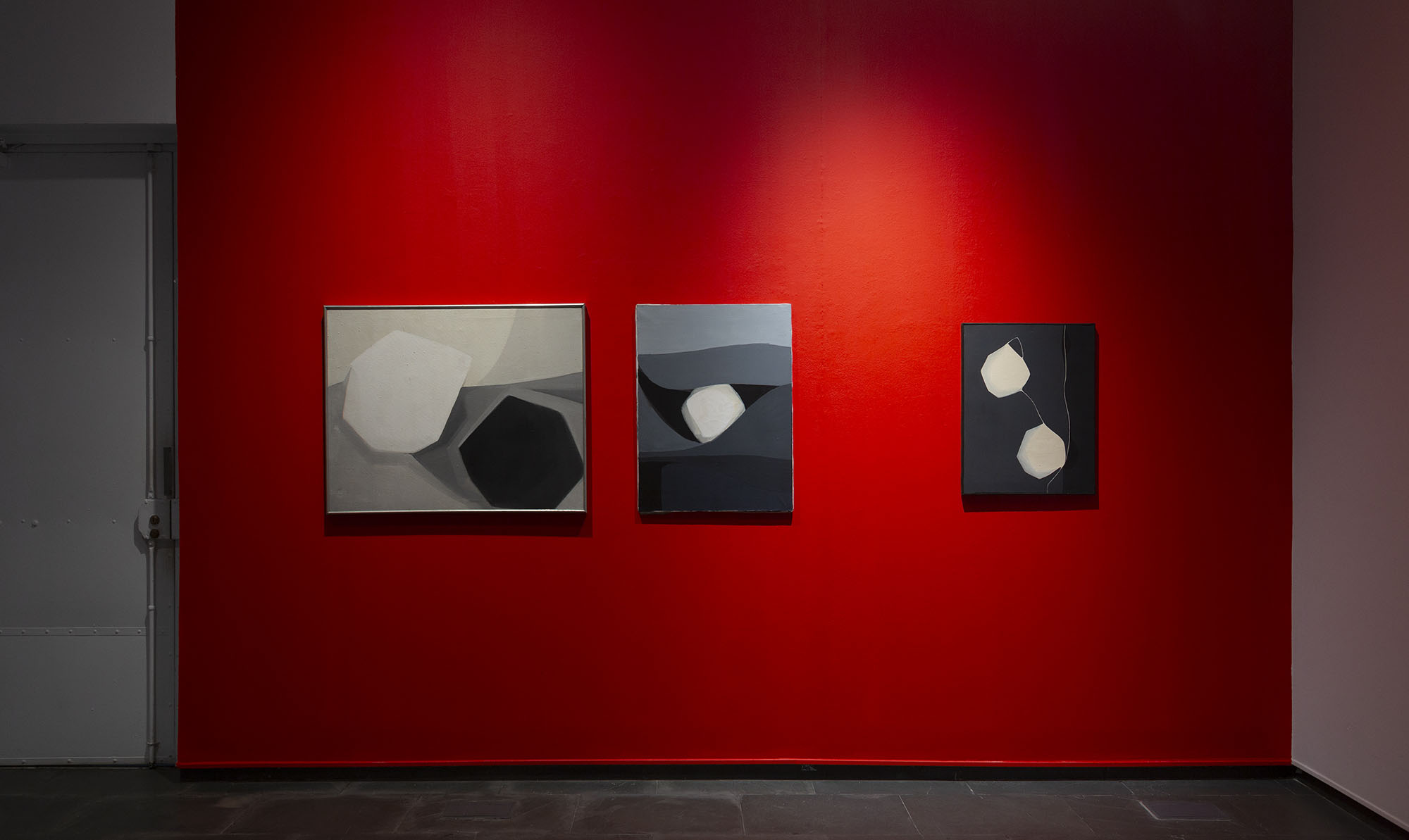 However, disregarding the artist’s student work, the exhibit commences with a figurative painting. This is an apparently three-dimensional diptych that can be presented as a free-standing figure by the use of hinges that join both parts. It shows a nude female figure being pushed backwards by a giant white ball. Painted in 1970 as a grisaille, this piece connects with the following series Grises —the black, white and grey palette— and use of acrylics as well as the white ball in the centre around which the work is composed. The ball renders the nude female figure incapable of movement, an iconography that María Lara considers coherent because “Pepe was very feminist although she was not an active member of the movement. She believed deeply in equality and cared little about the difficulties of being a woman in a man’s world”.6 I mentioned on another occasion that “Whether this be a metaphor of a creation that imbibes from the essentialist feminism common in the 70s or more literally is about the imponderables that pushed women backwards and prevented their advancement, the ball appears in the Grises series as a punctum in the Barthesian sense as the element round which everything turns”.7 I believe that this painting represents the change in Caballero’s direction, towards the abstraction that followed, with the elimination of any figurative element which, as I undertand it, she considered extraneous, reducing her work to a symbolic element, the meaning of which we may sense but that essentially is unkown to us.