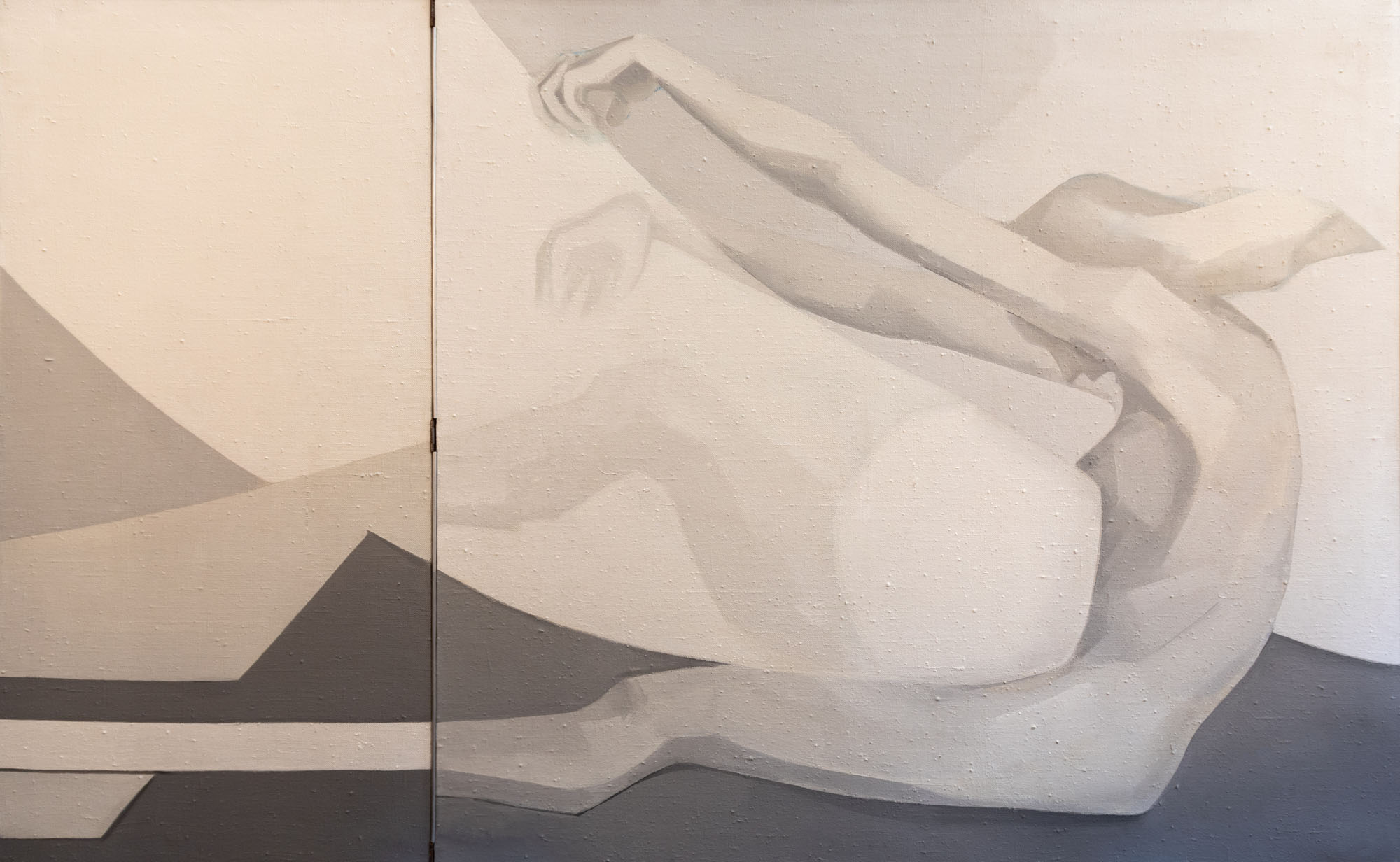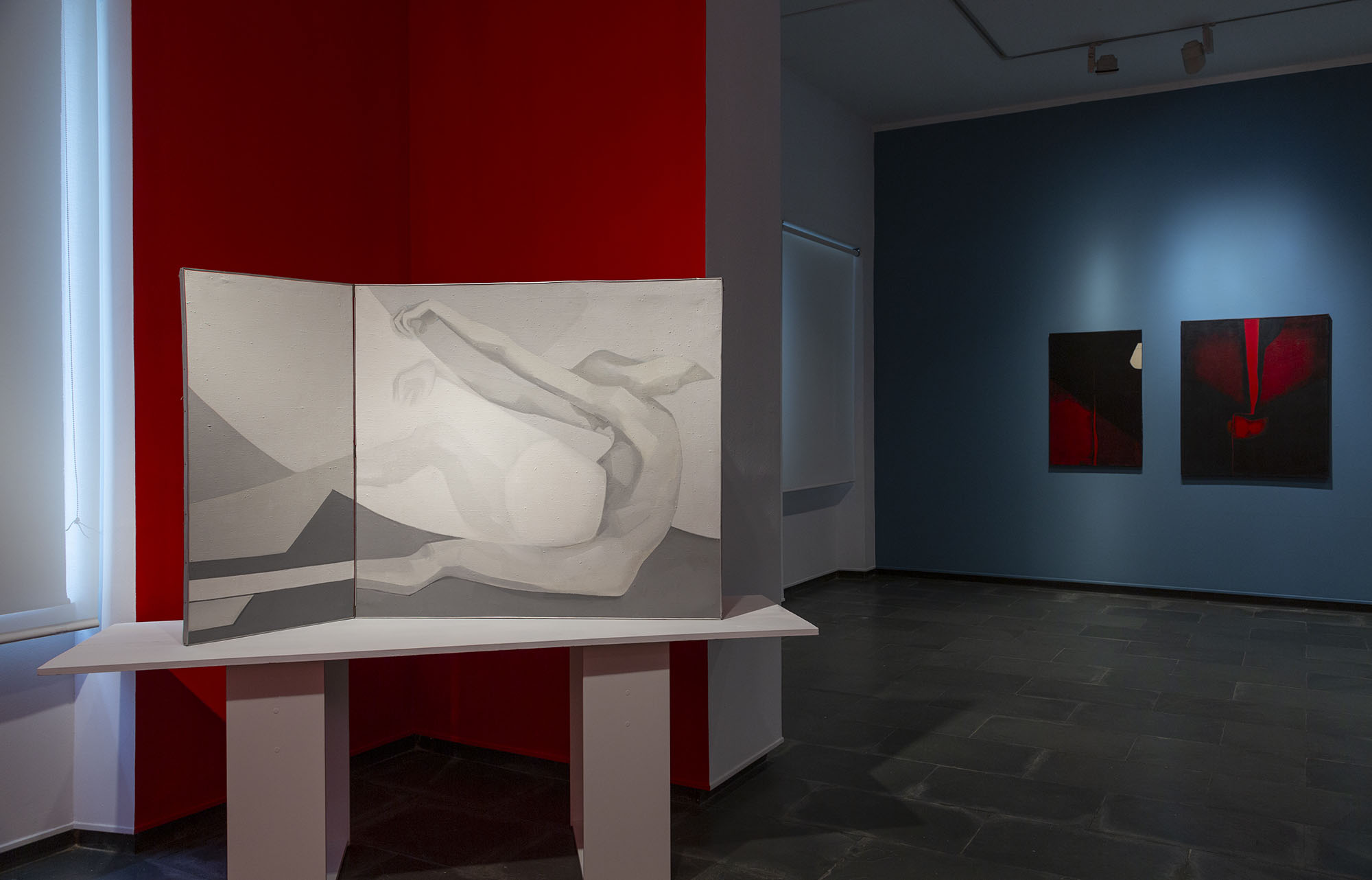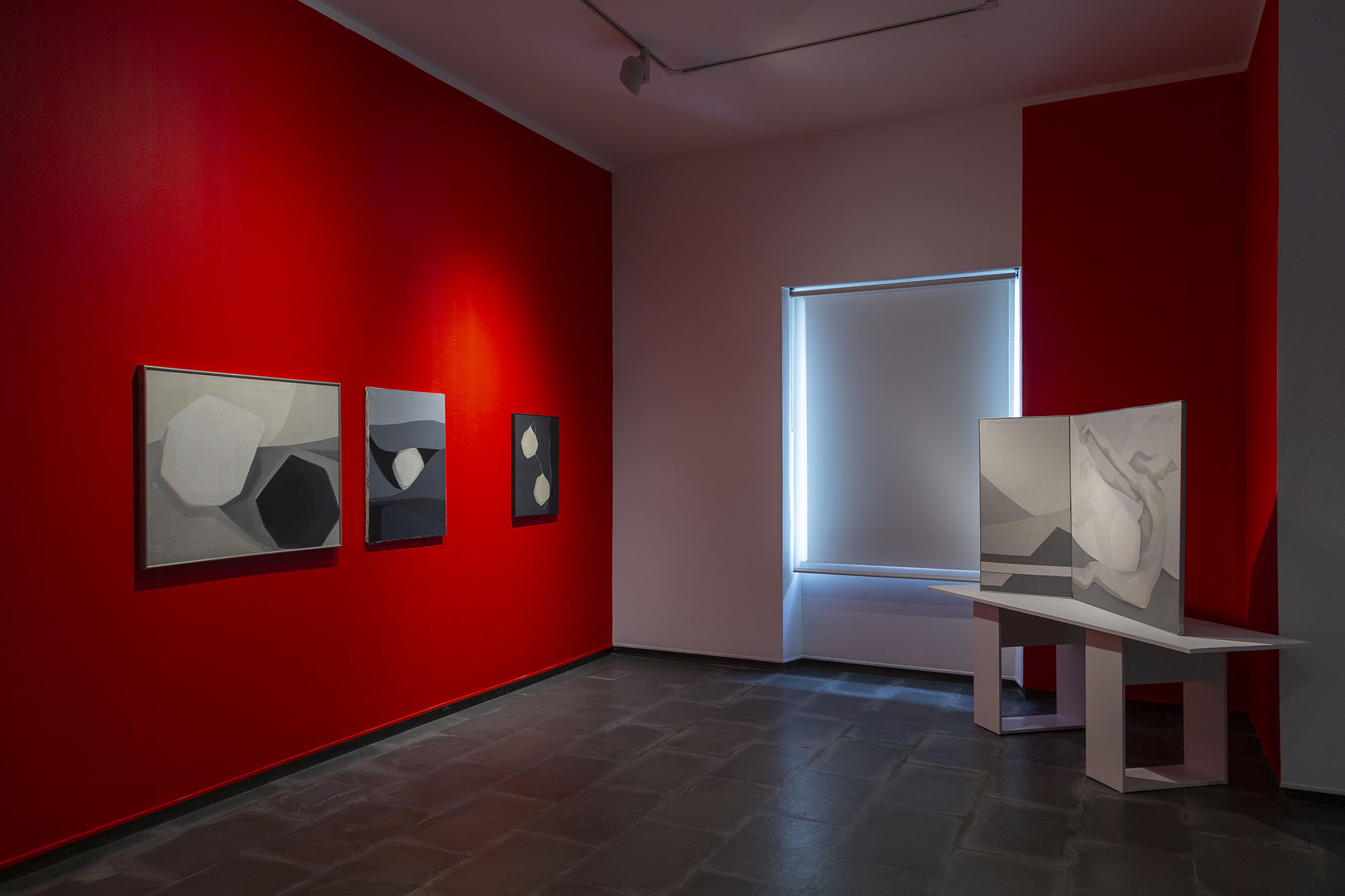 However, disregarding the artist’s student work, the exhibit commences with a figurative painting. This is an apparently three-dimensional diptych that can be presented as a free-standing figure by the use of hinges that join both parts. It shows a nude female figure being pushed backwards by a giant white ball. Painted in 1970 as a grisaille, this piece connects with the following series Grises —the black, white and grey palette— and use of acrylics as well as the white ball in the centre around which the work is composed. The ball renders the nude female figure incapable of movement, an iconography that María Lara considers coherent because “Pepe was very feminist although she was not an active member of the movement. She believed deeply in equality and cared little about the difficulties of being a woman in a man’s world”.6 I mentioned on another occasion that “Whether this be a metaphor of a creation that imbibes from the essentialist feminism common in the 70s or more literally is about the imponderables that pushed women backwards and prevented their advancement, the ball appears in the Grises series as a punctum in the Barthesian sense as the element round which everything turns”.7 I believe that this painting represents the change in Caballero’s direction, towards the abstraction that followed, with the elimination of any figurative element which, as I undertand it, she considered extraneous, reducing her work to a symbolic element, the meaning of which we may sense but that essentially is unkown to us.