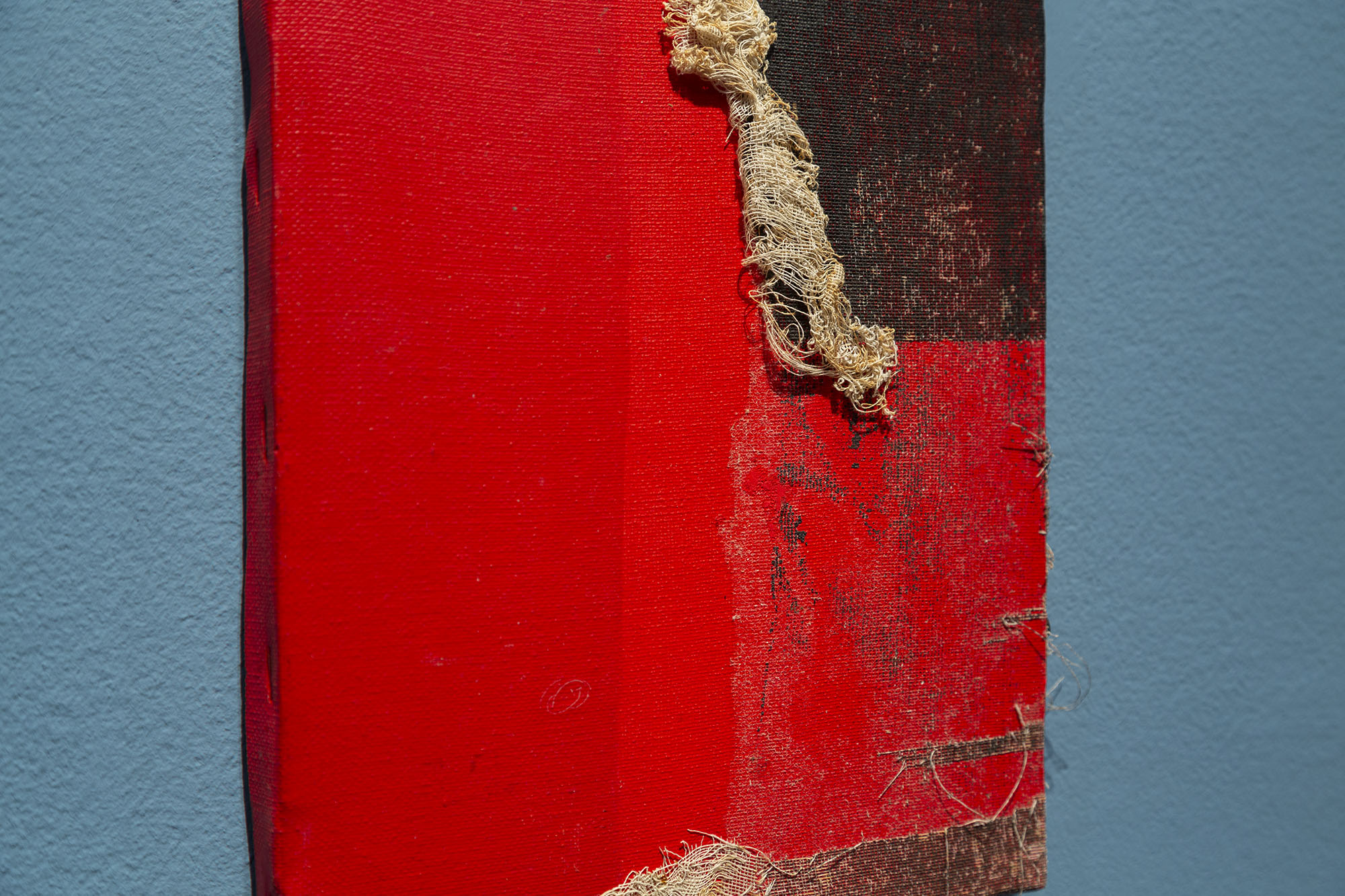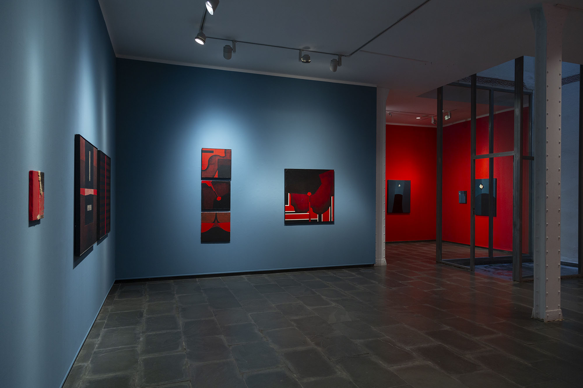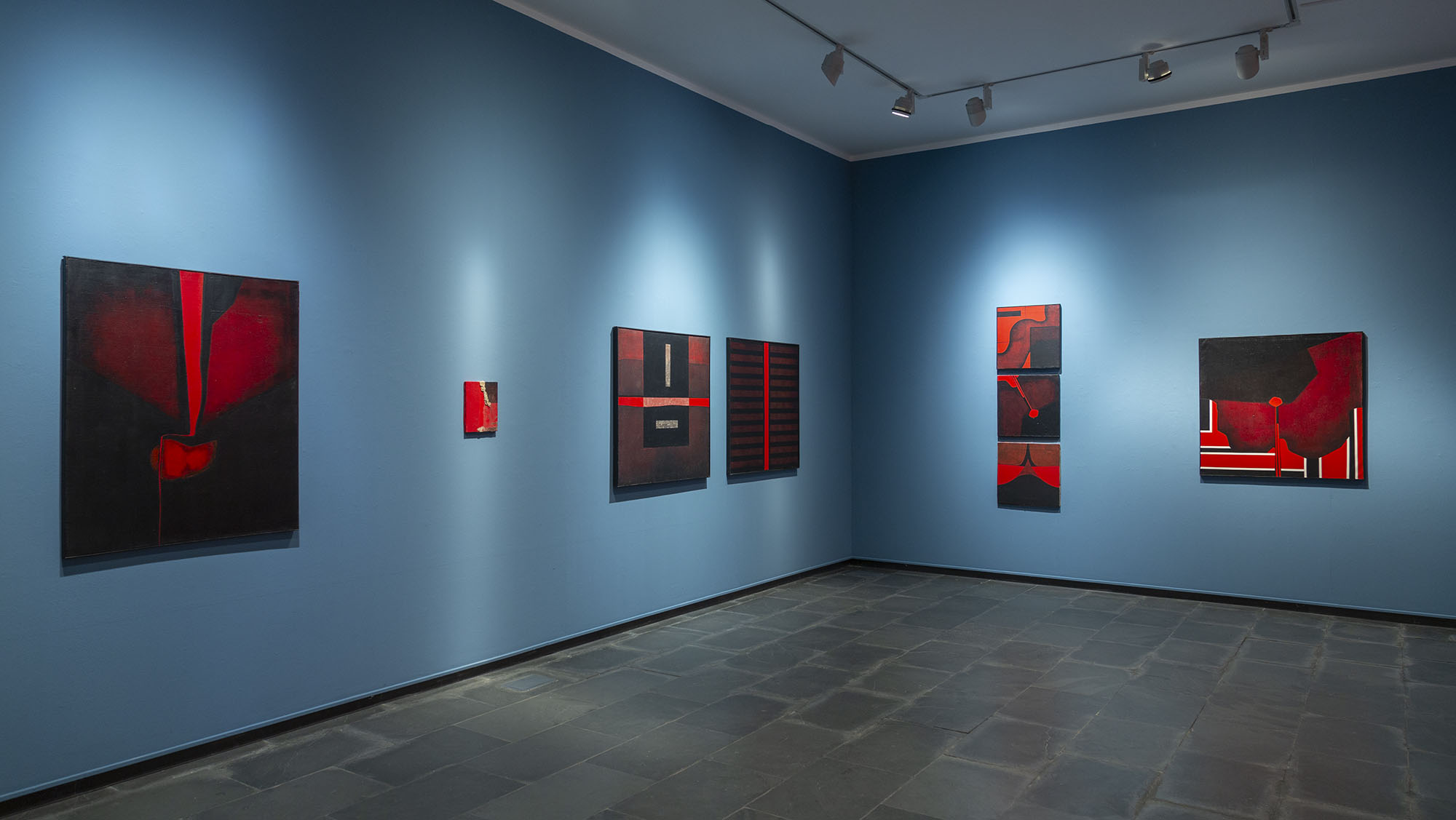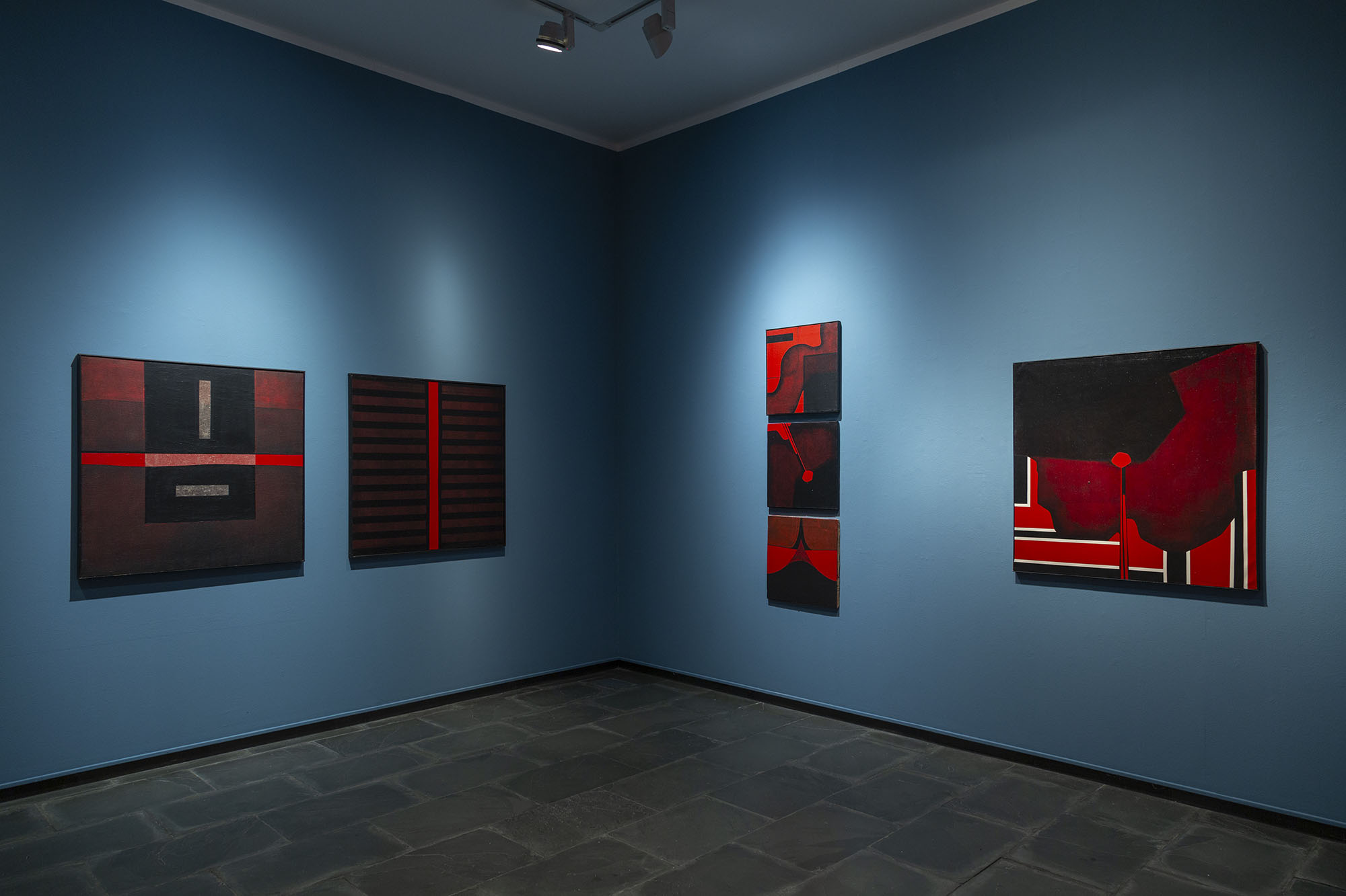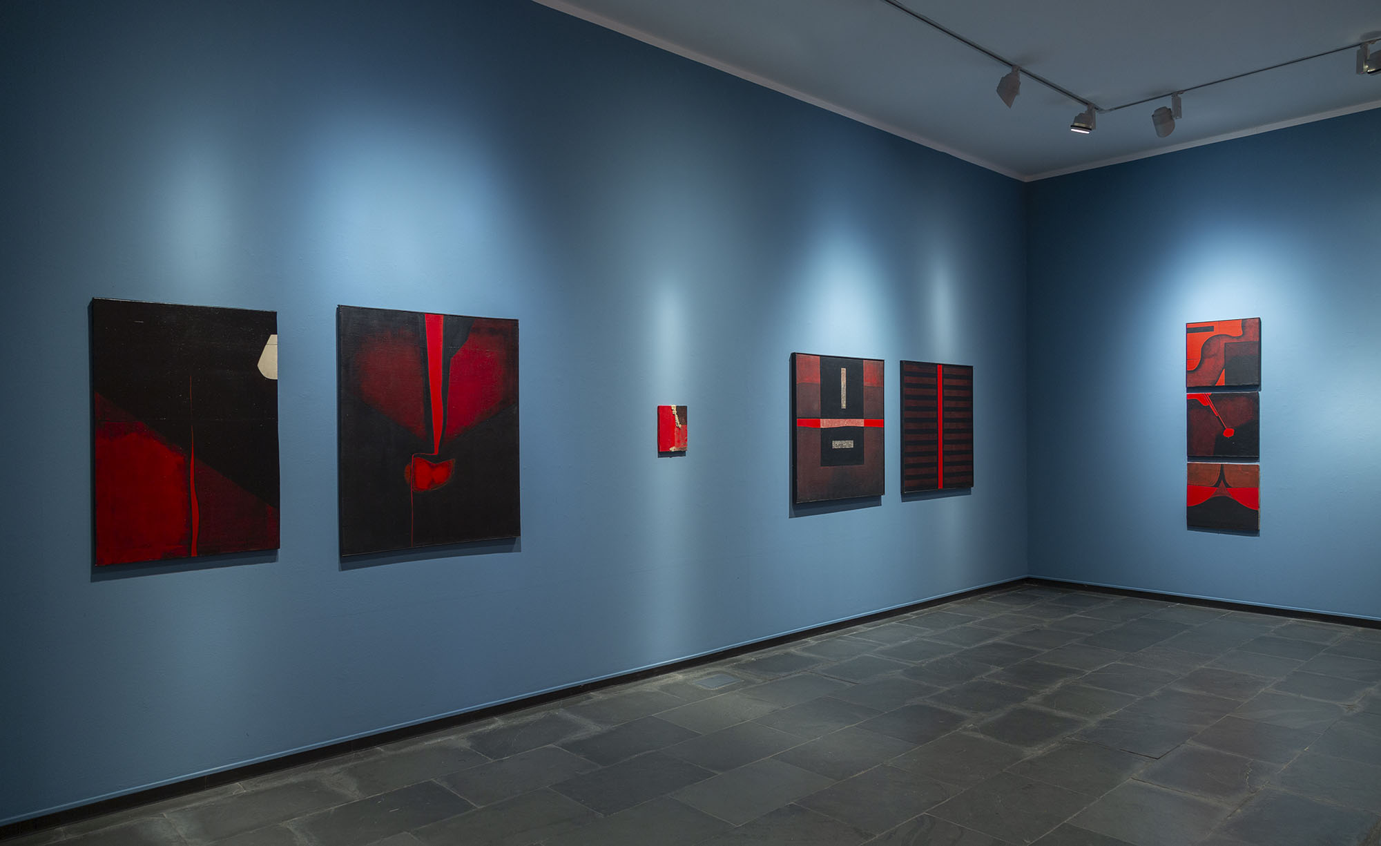 The next series in the exhibition —in reds and blues— belong in the linguistic sphere of abstraction. However, in some cases we can still recognise vestiges that appear to represent organic shapes that penetrate and are penetrated and which to me seem to have a sexual significance. It is interesting to see that she was so comfortable with red, always accompanied by black, the palette that extends across Spanish informalism. I also examined her use of the hessian, less as a support for the paint but as a superimposed element, some times stuck on and at others apparently sewn on. Hessian or burlap is a poor material, easily recognisable in the European informalism.