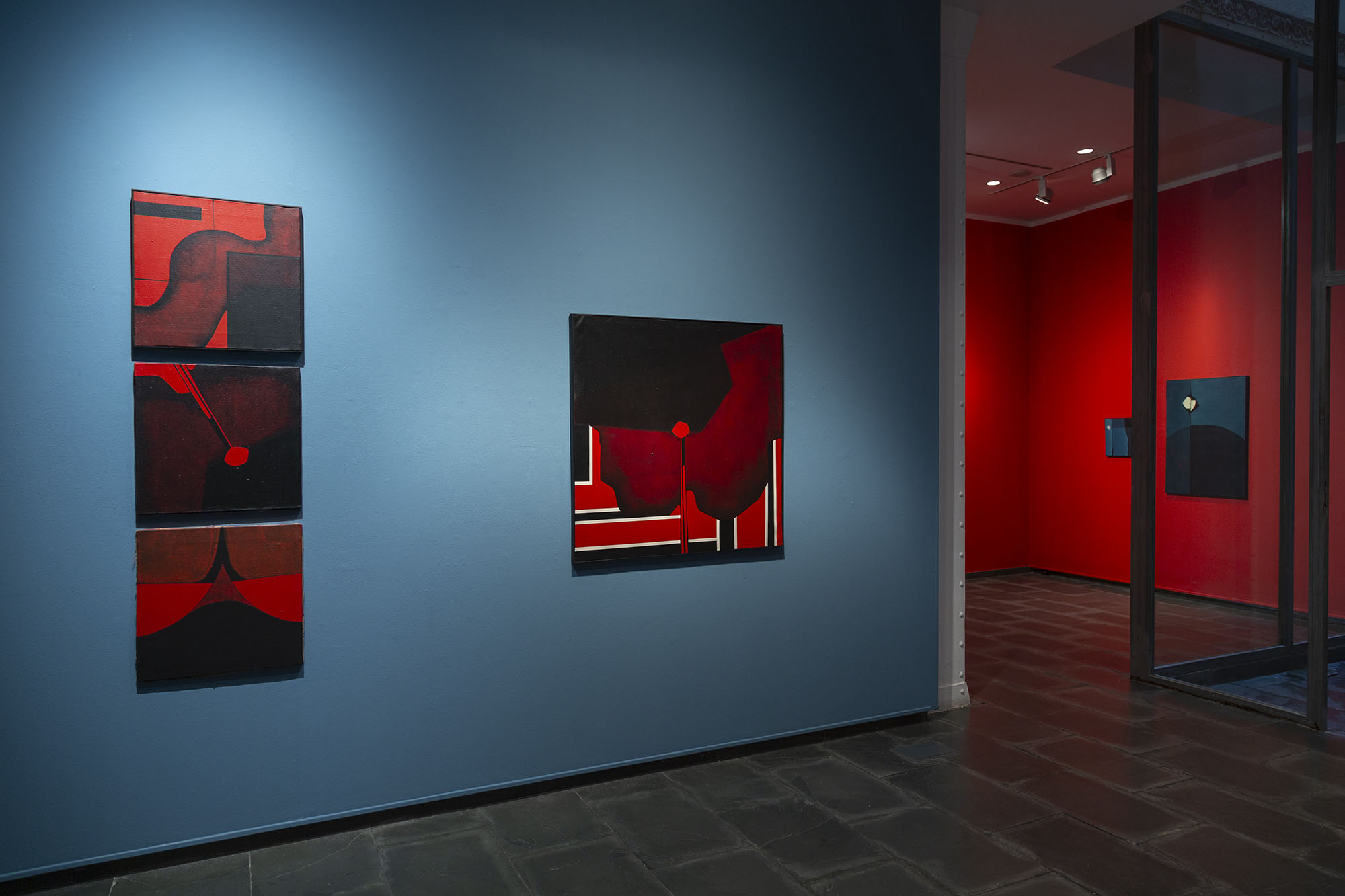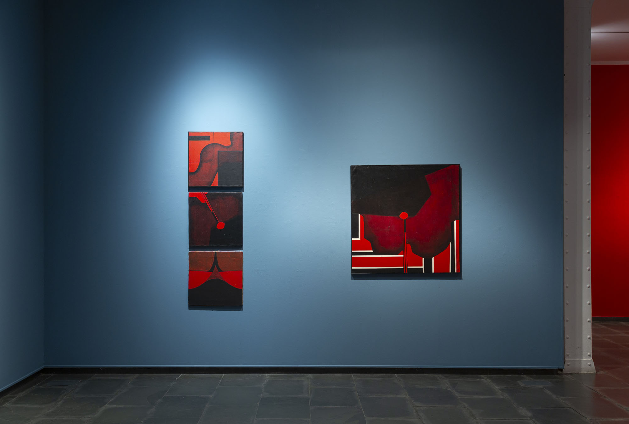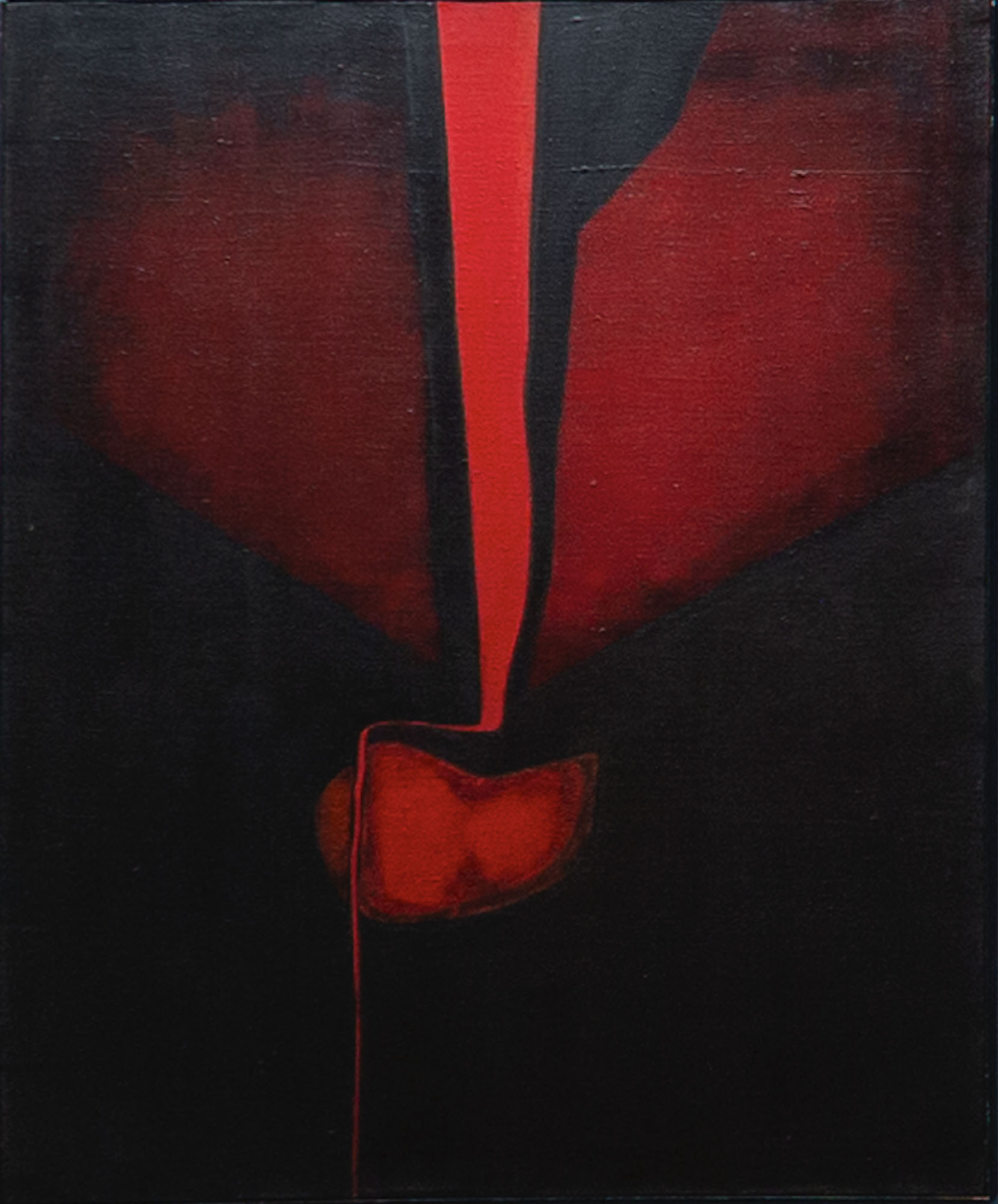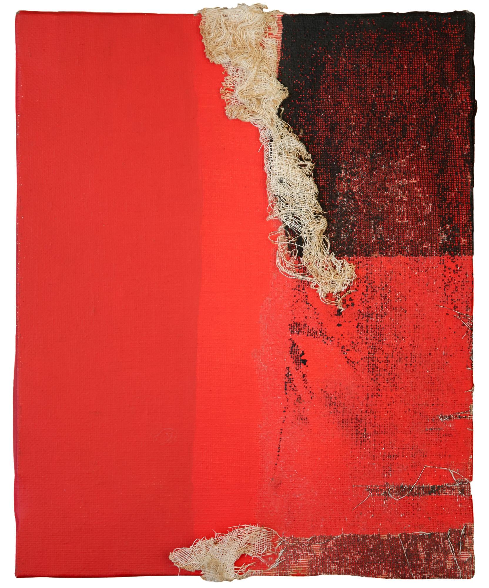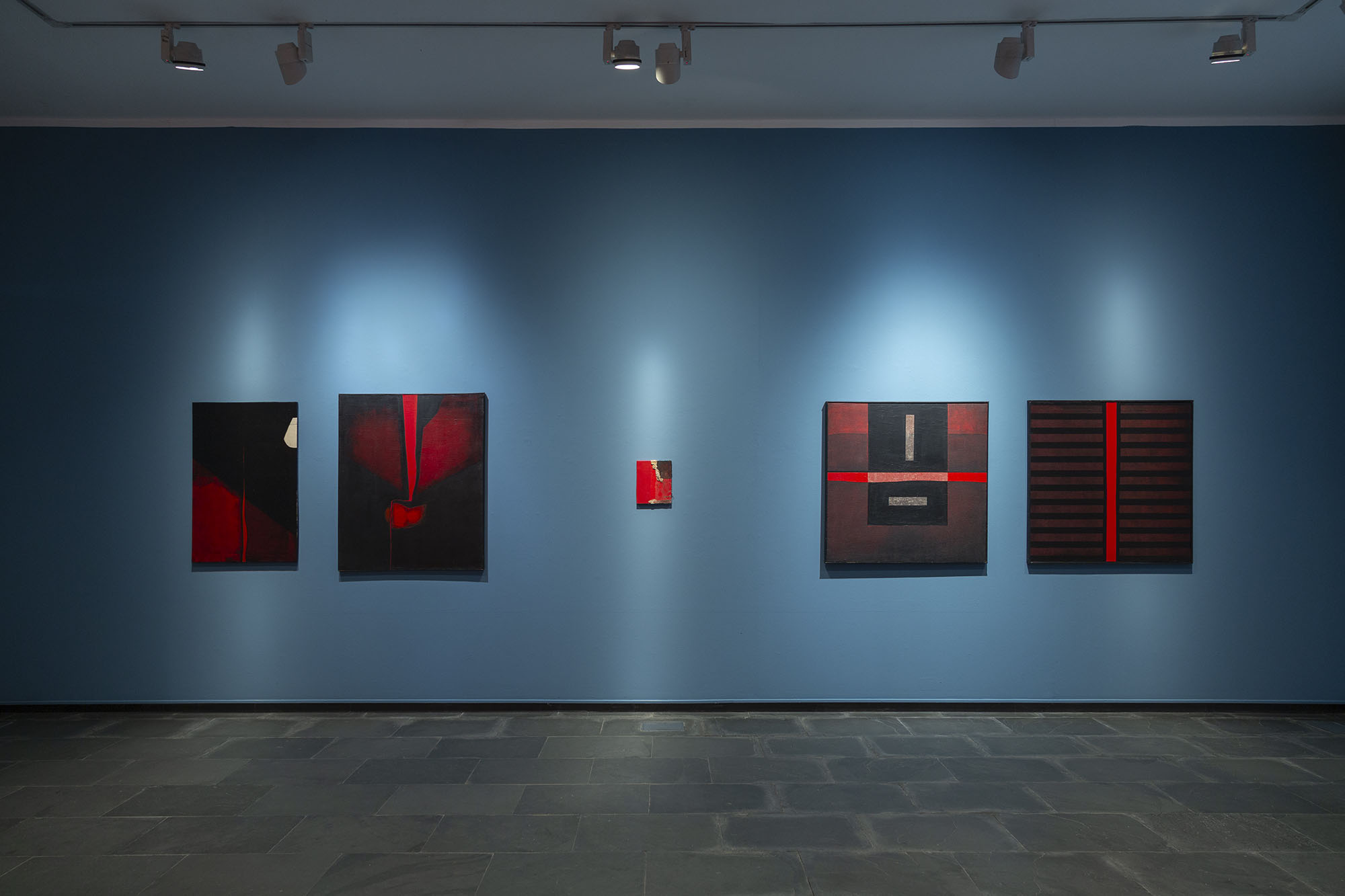 The next series in the exhibition —in reds and blues— belong in the linguistic sphere of abstraction. However, in some cases we can still recognise vestiges that appear to represent organic shapes that penetrate and are penetrated and which to me seem to have a sexual significance. It is interesting to see that she was so comfortable with red, always accompanied by black, the palette that extends across Spanish informalism. I also examined her use of the hessian, less as a support for the paint but as a superimposed element, some times stuck on and at others apparently sewn on. Hessian or burlap is a poor material, easily recognisable in the European informalism.