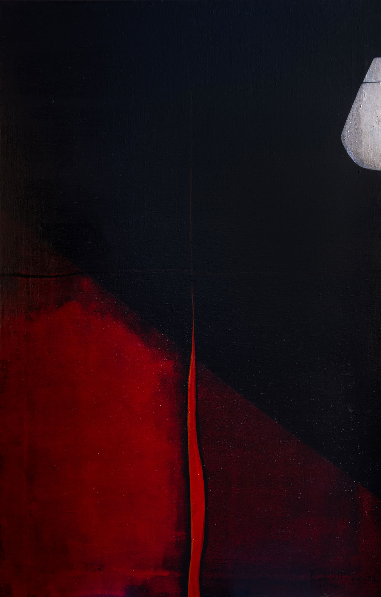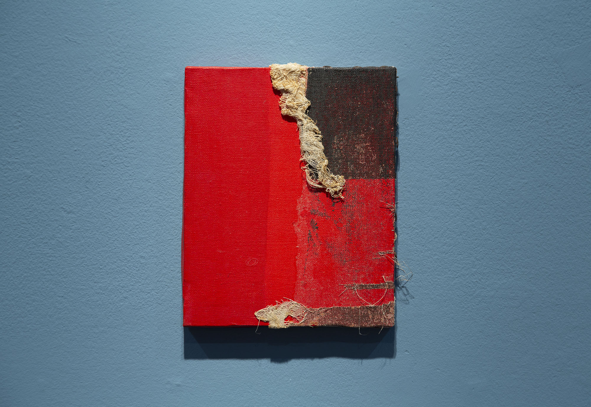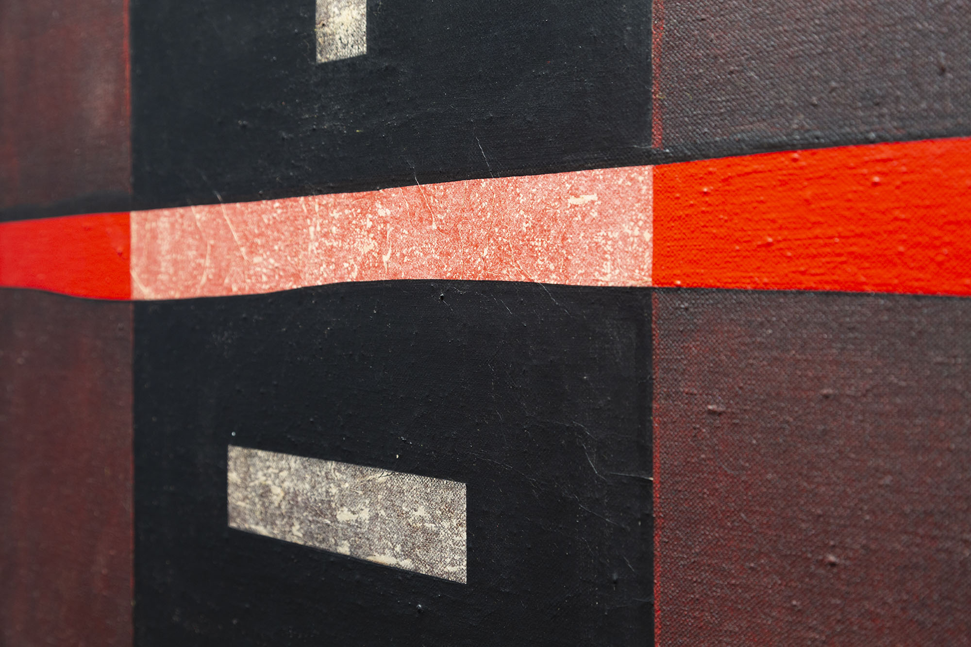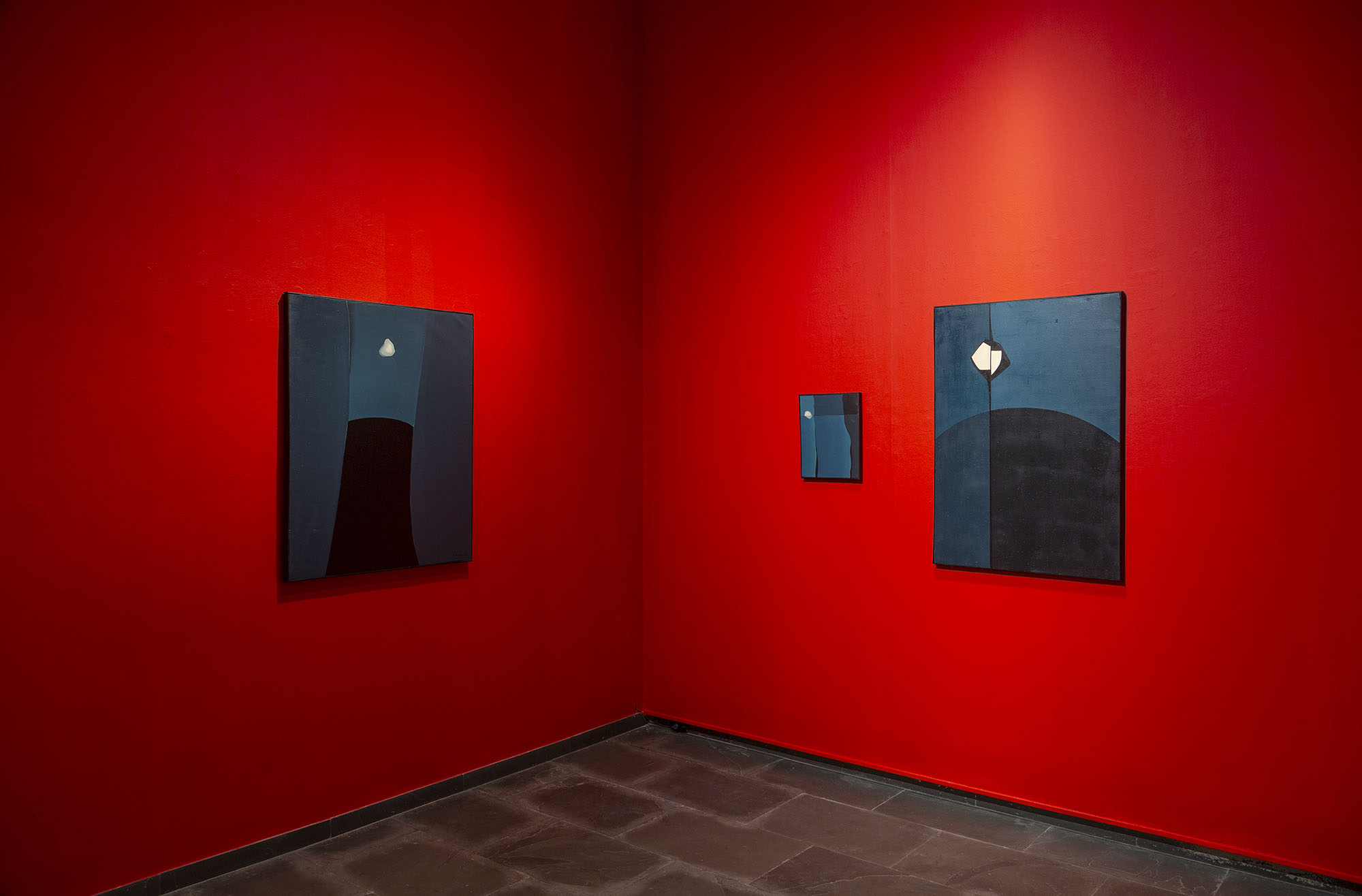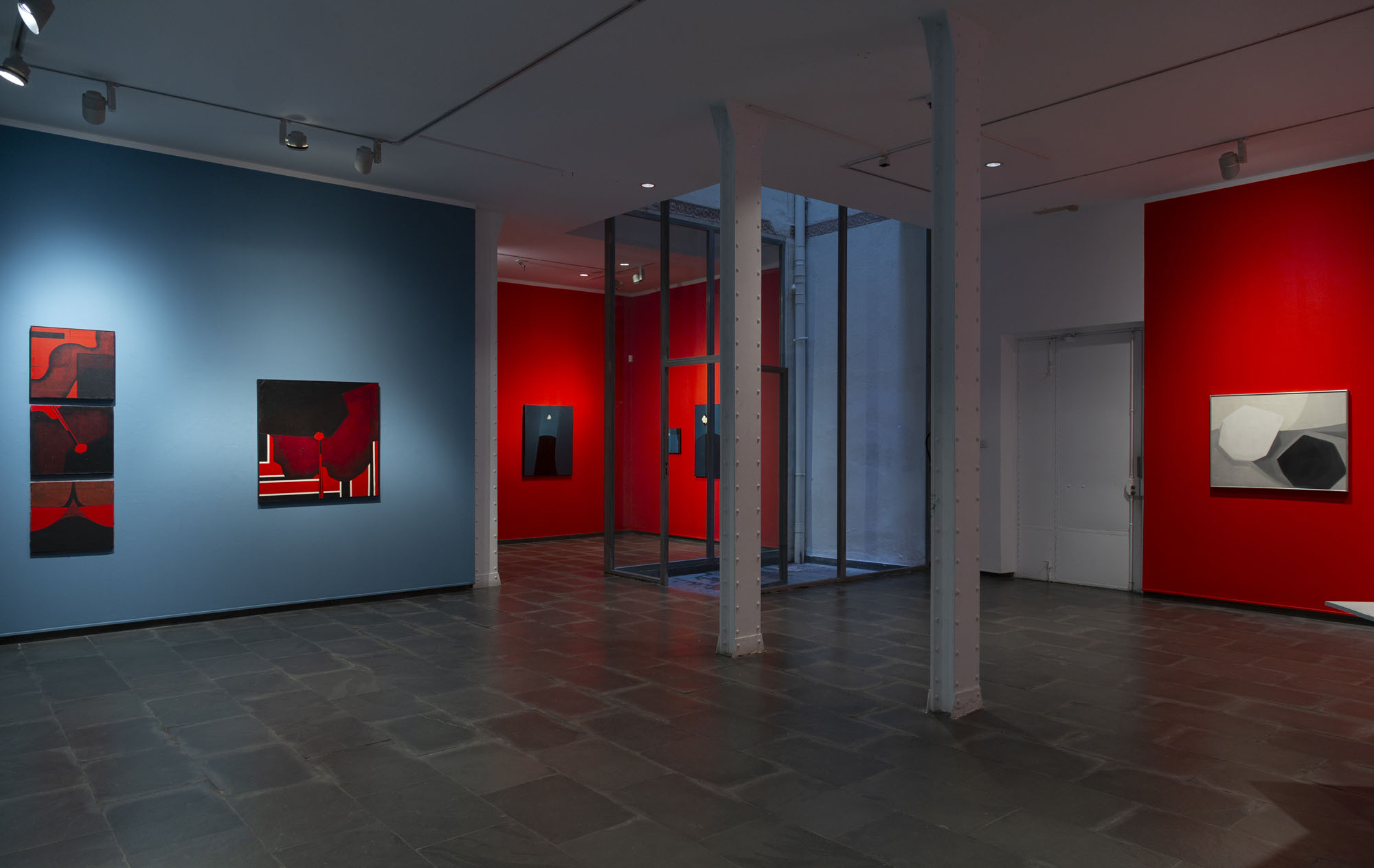The next series in the exhibition —in reds and blues— belong in the linguistic sphere of abstraction. However, in some cases we can still recognise vestiges that appear to represent organic shapes that penetrate and are penetrated and which to me seem to have a sexual significance. It is interesting to see that she was so comfortable with red, always accompanied by black, the palette that extends across Spanish informalism. I also examined her use of the hessian, less as a support for the paint but as a superimposed element, some times stuck on and at others apparently sewn on. Hessian or burlap is a poor material, easily recognisable in the European informalism.