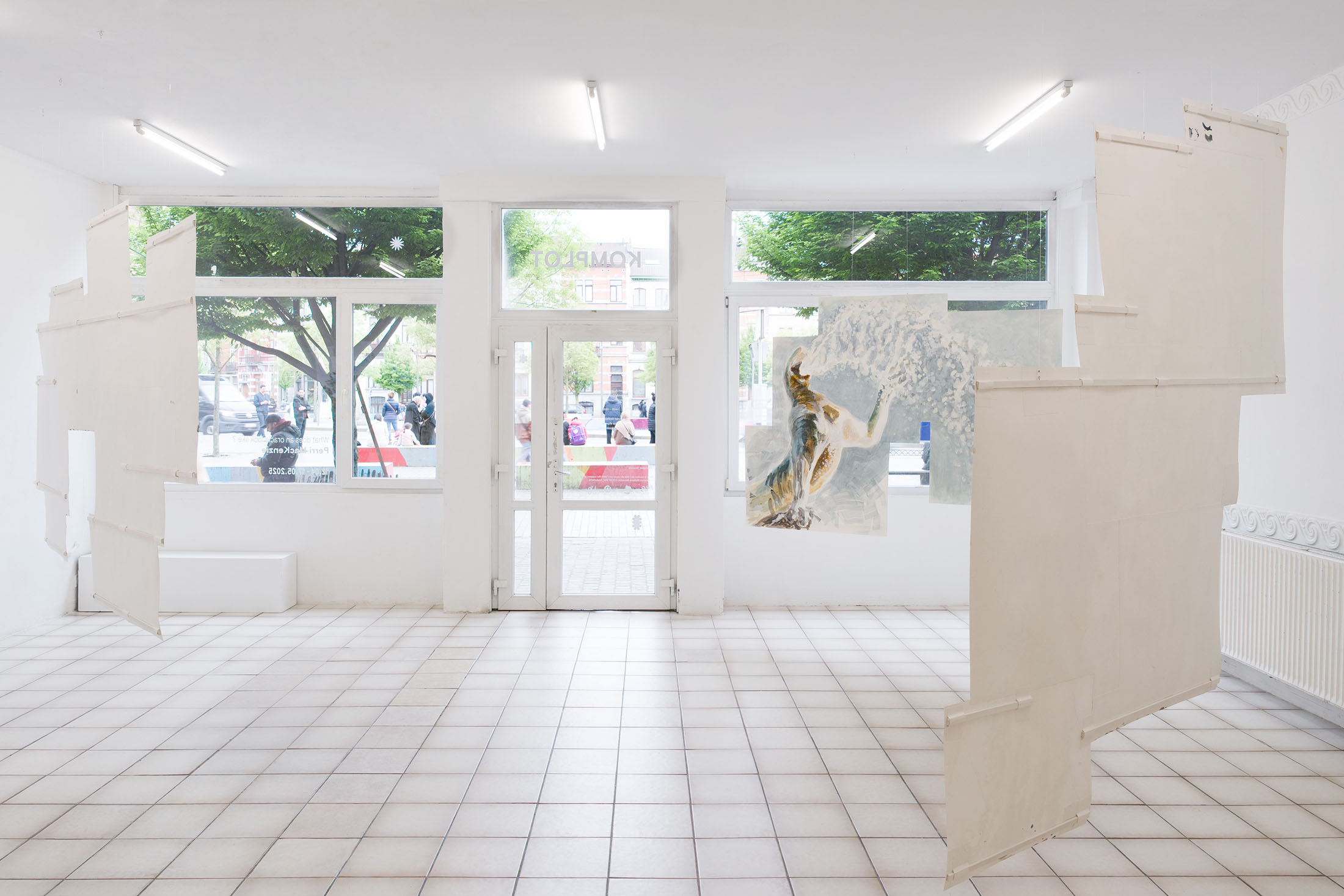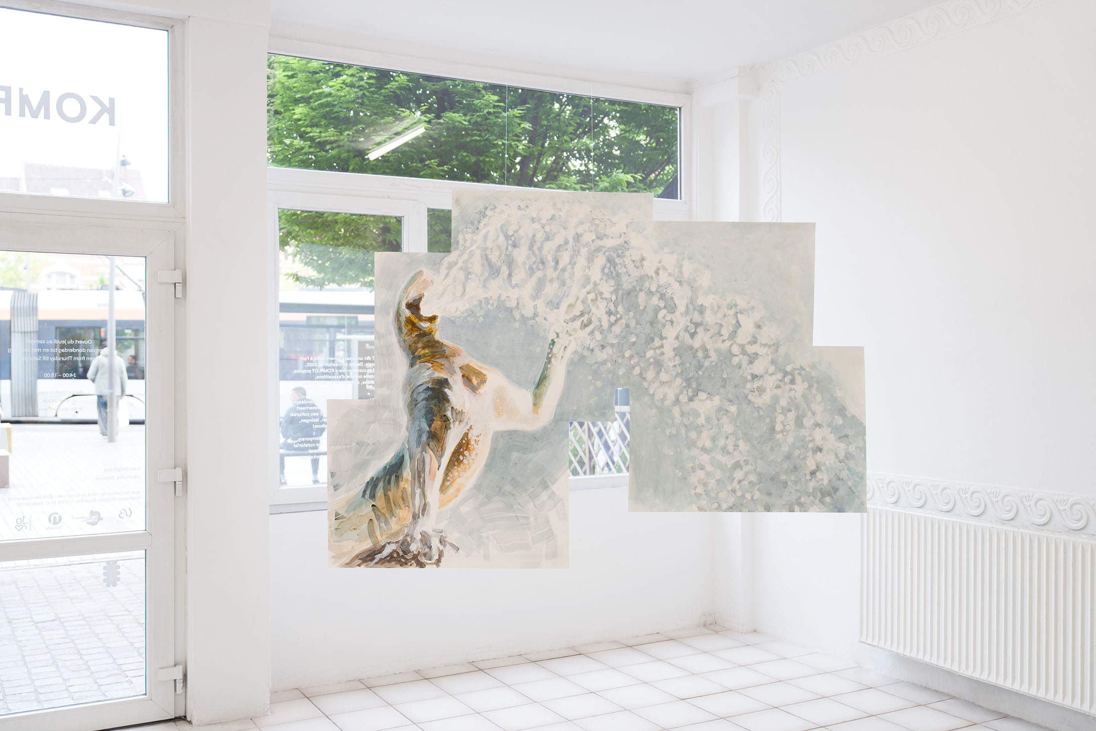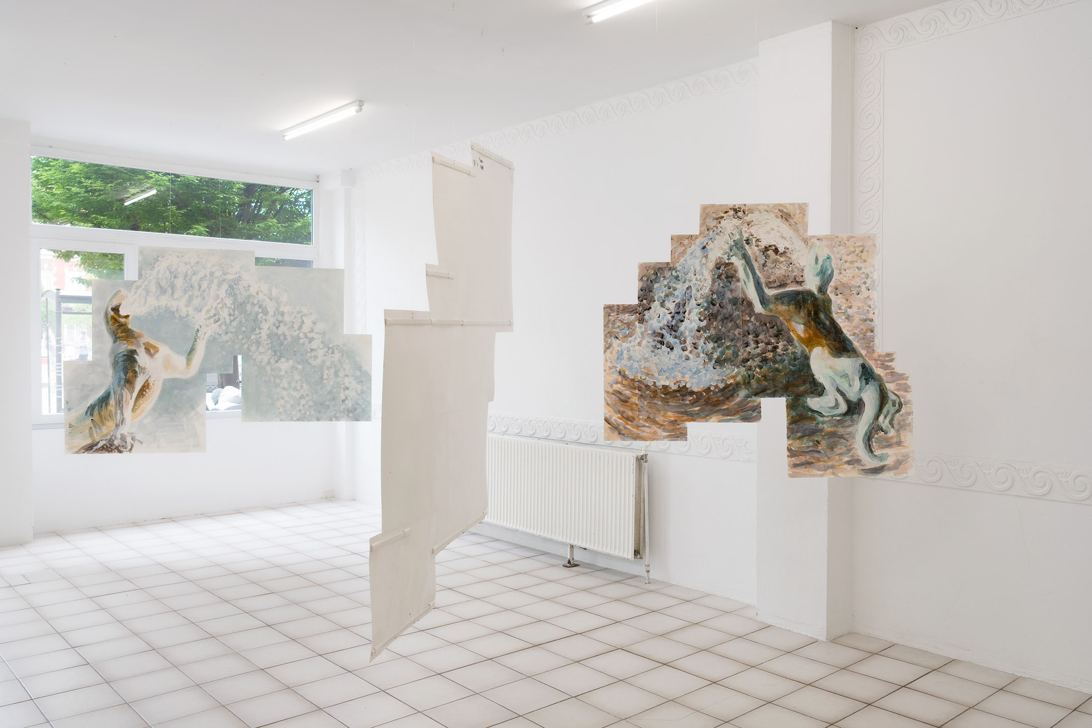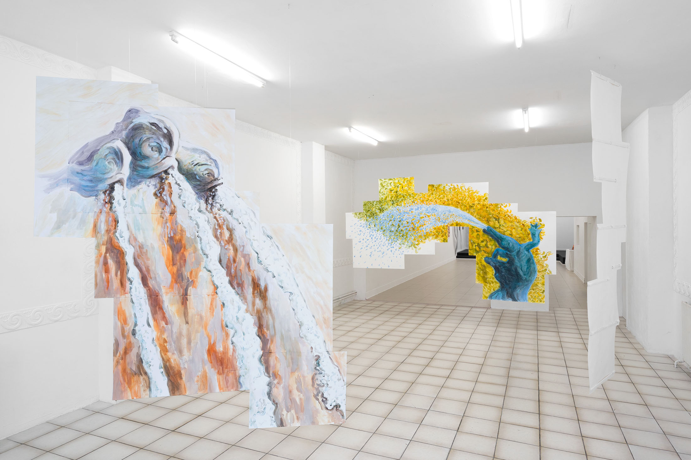 For Komplot, Perri MacKenzie will present a new installation of large-scale collage paintings on paper depicting the animal fountains of Sainte-Catherine, Brussels (sculpted by Georges Houstont and Godefroid Devreese, c.1895). For MacKenzie, the water gushing out of the fountain’s mouths is an energetic materialisation of voice, which is further amplified by the unruly dimensionality of the paintings. The exhibition additionally brings together drawings and screenprints alongside a presentation of her book. A graphical way of thinking pervades the works in the exhibition: an exploration into the leaky spaces of image, line, text, and voice.