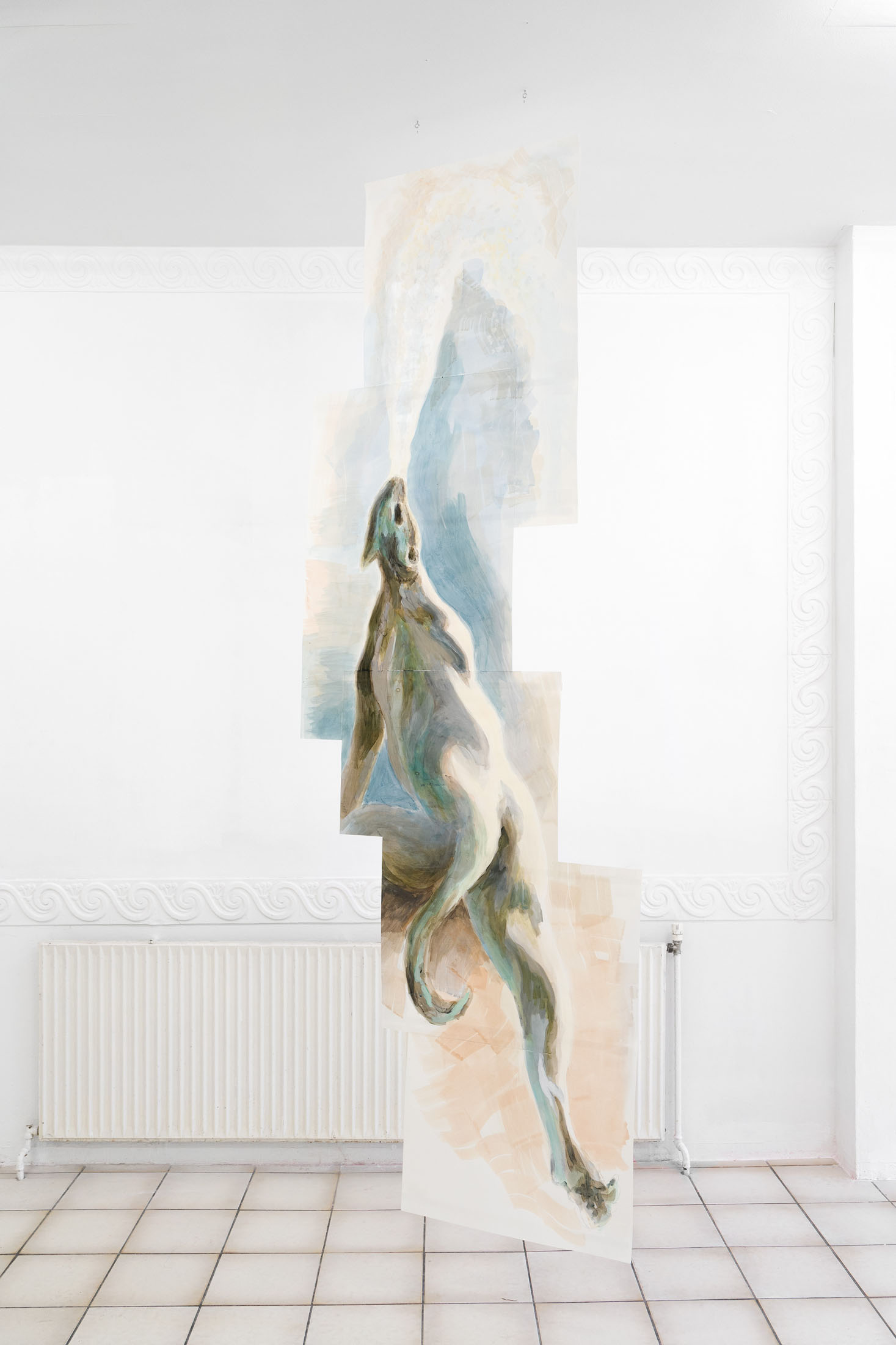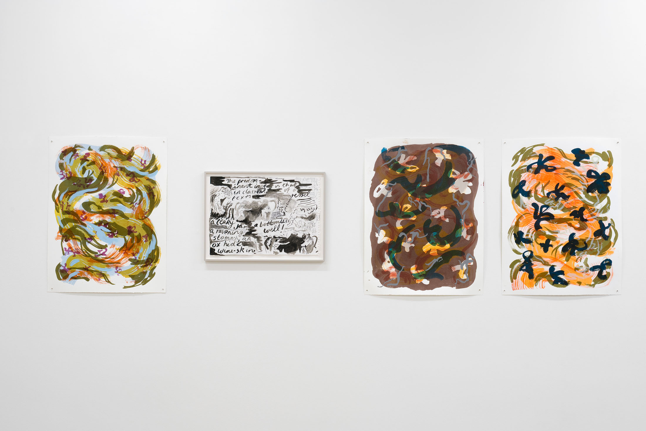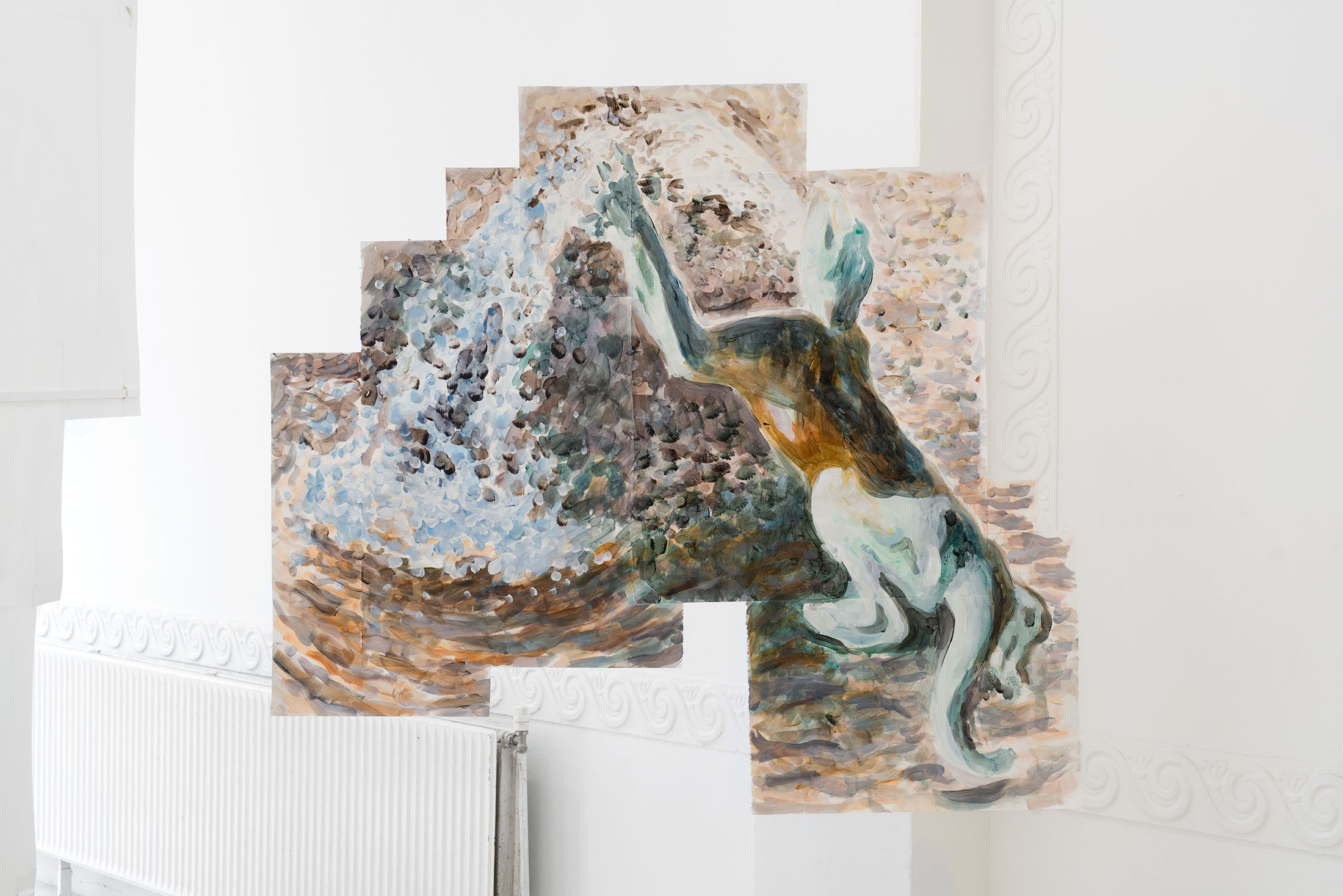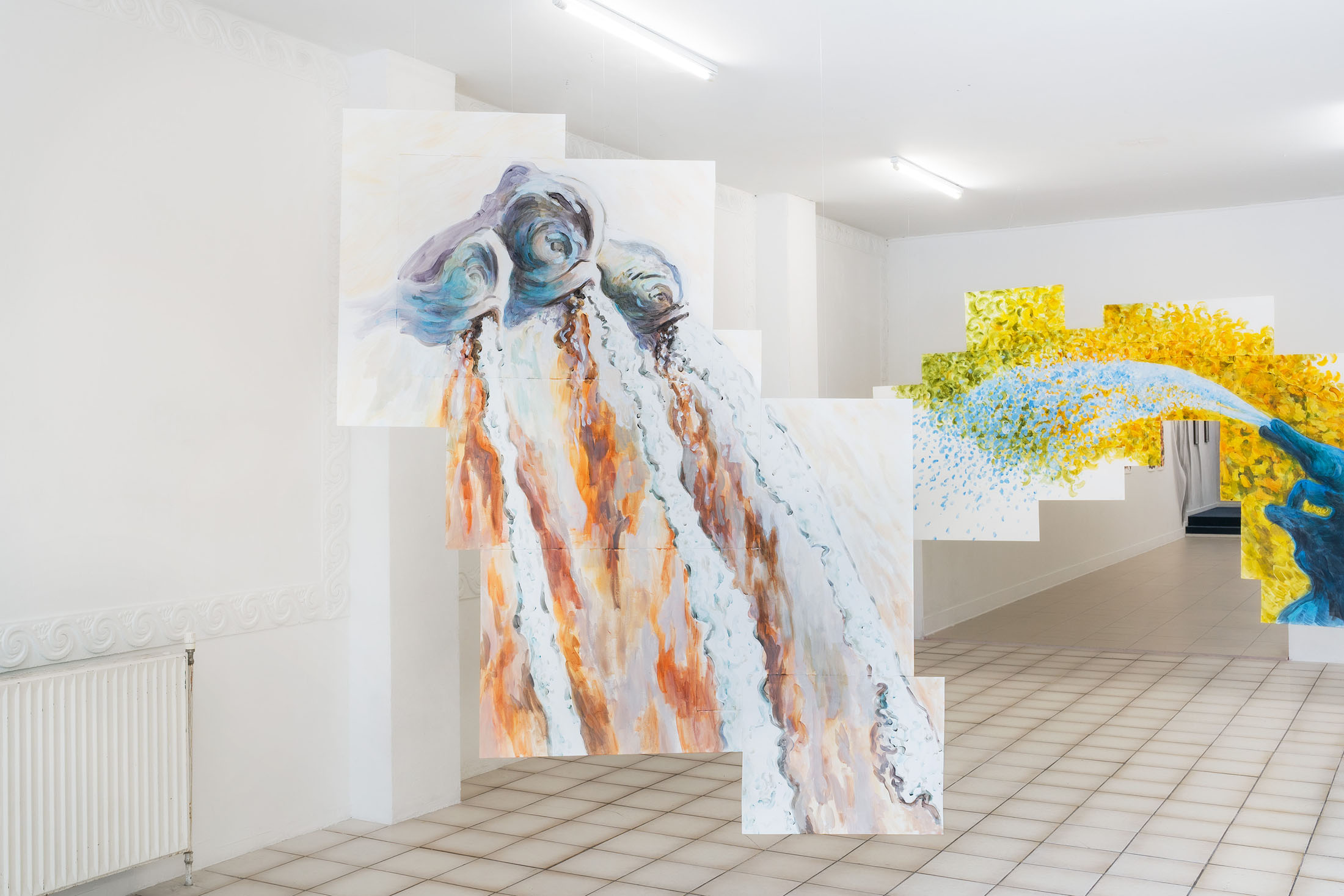 For Komplot, Perri MacKenzie will present a new installation of large-scale collage paintings on paper depicting the animal fountains of Sainte-Catherine, Brussels (sculpted by Georges Houstont and Godefroid Devreese, c.1895). For MacKenzie, the water gushing out of the fountain’s mouths is an energetic materialisation of voice, which is further amplified by the unruly dimensionality of the paintings. The exhibition additionally brings together drawings and screenprints alongside a presentation of her book. A graphical way of thinking pervades the works in the exhibition: an exploration into the leaky spaces of image, line, text, and voice.