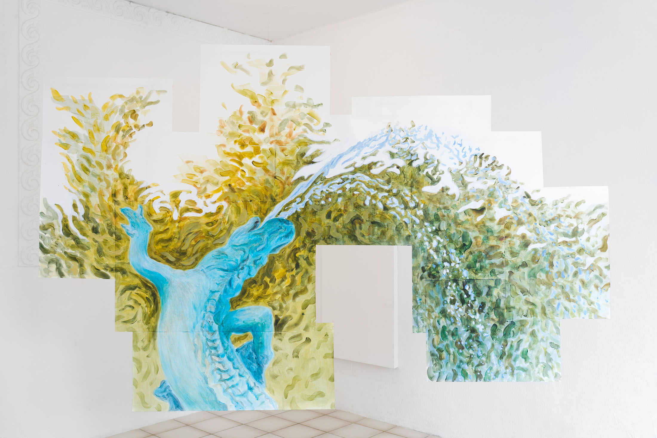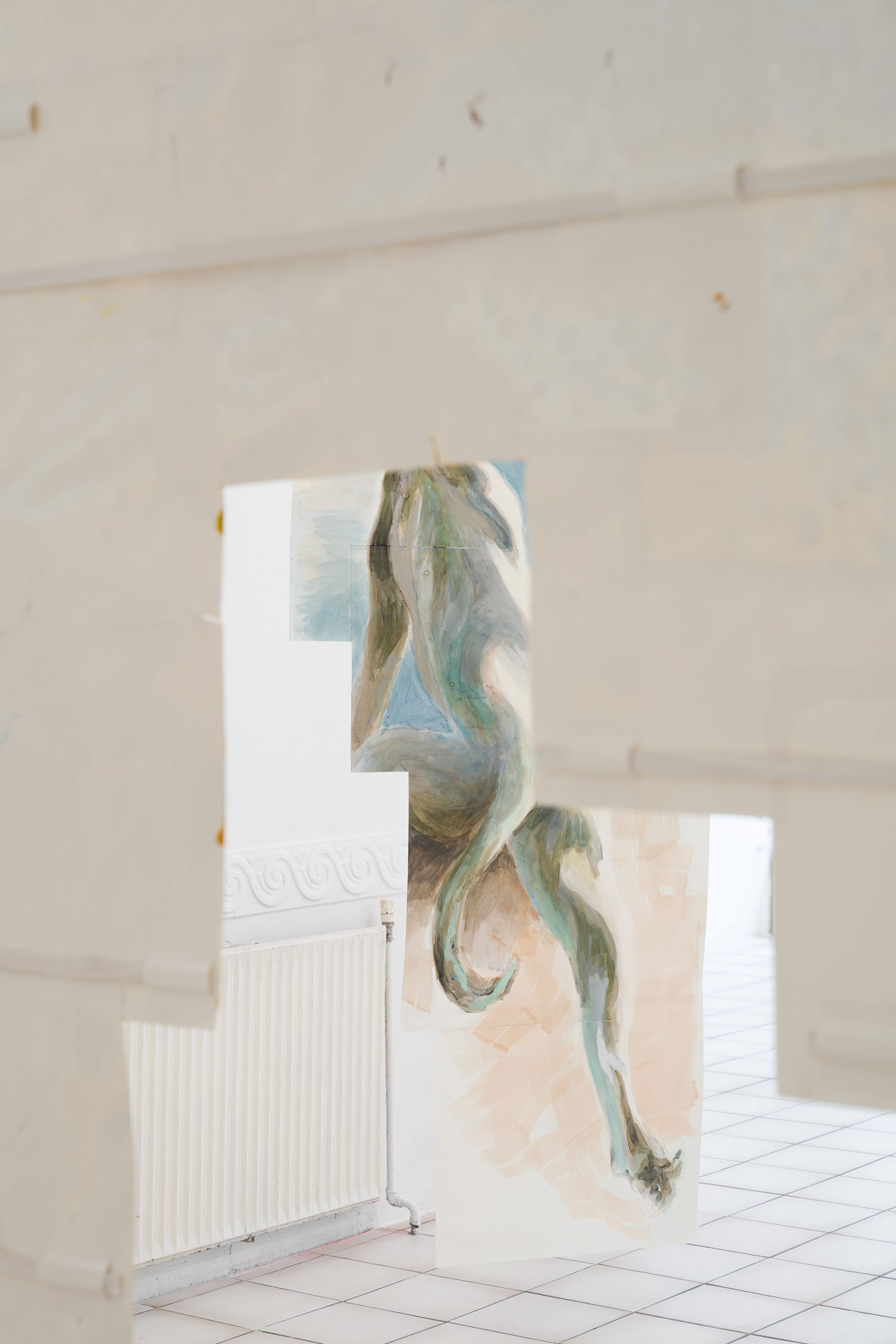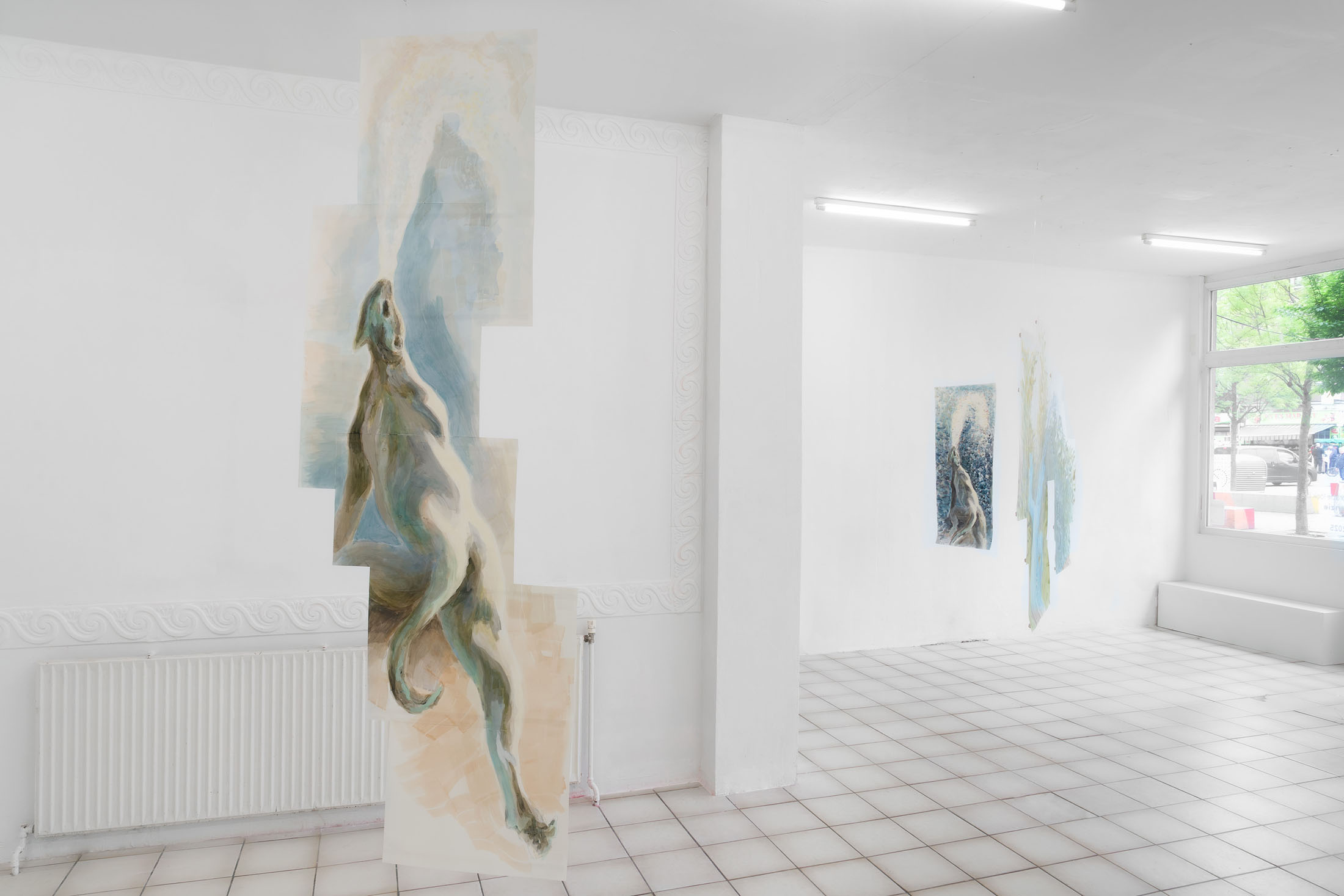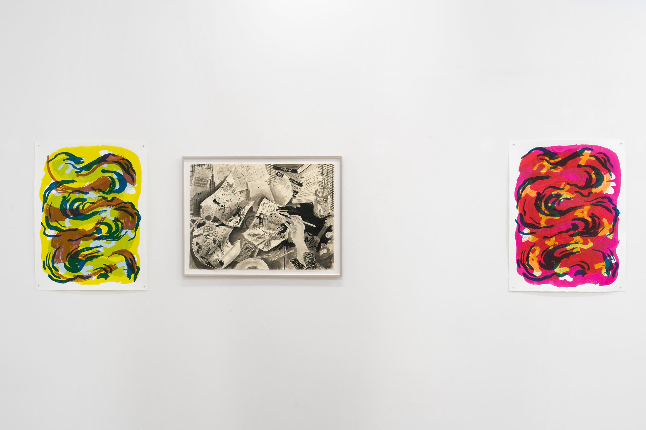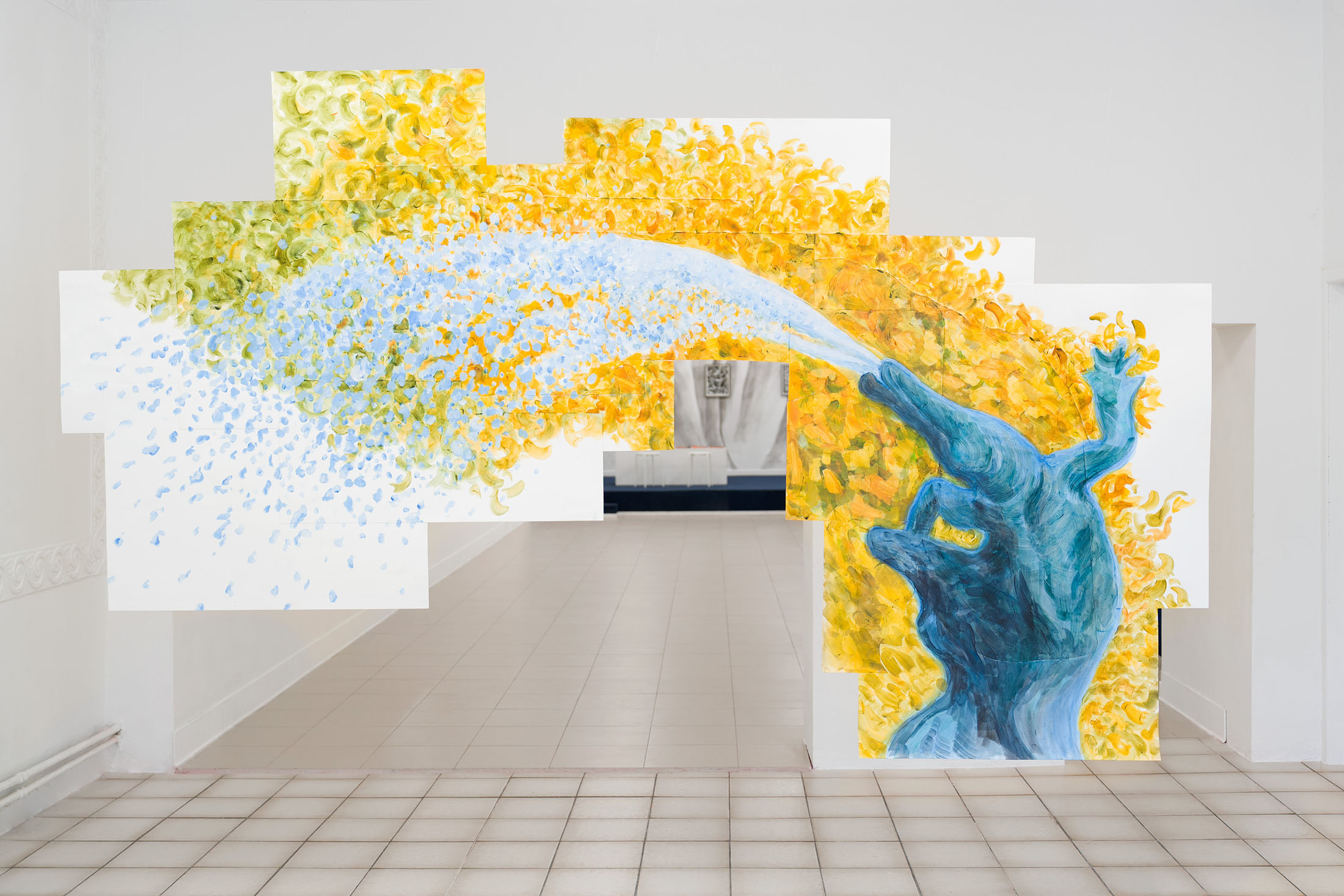 For Komplot, Perri MacKenzie will present a new installation of large-scale collage paintings on paper depicting the animal fountains of Sainte-Catherine, Brussels (sculpted by Georges Houstont and Godefroid Devreese, c.1895). For MacKenzie, the water gushing out of the fountain’s mouths is an energetic materialisation of voice, which is further amplified by the unruly dimensionality of the paintings. The exhibition additionally brings together drawings and screenprints alongside a presentation of her book. A graphical way of thinking pervades the works in the exhibition: an exploration into the leaky spaces of image, line, text, and voice.