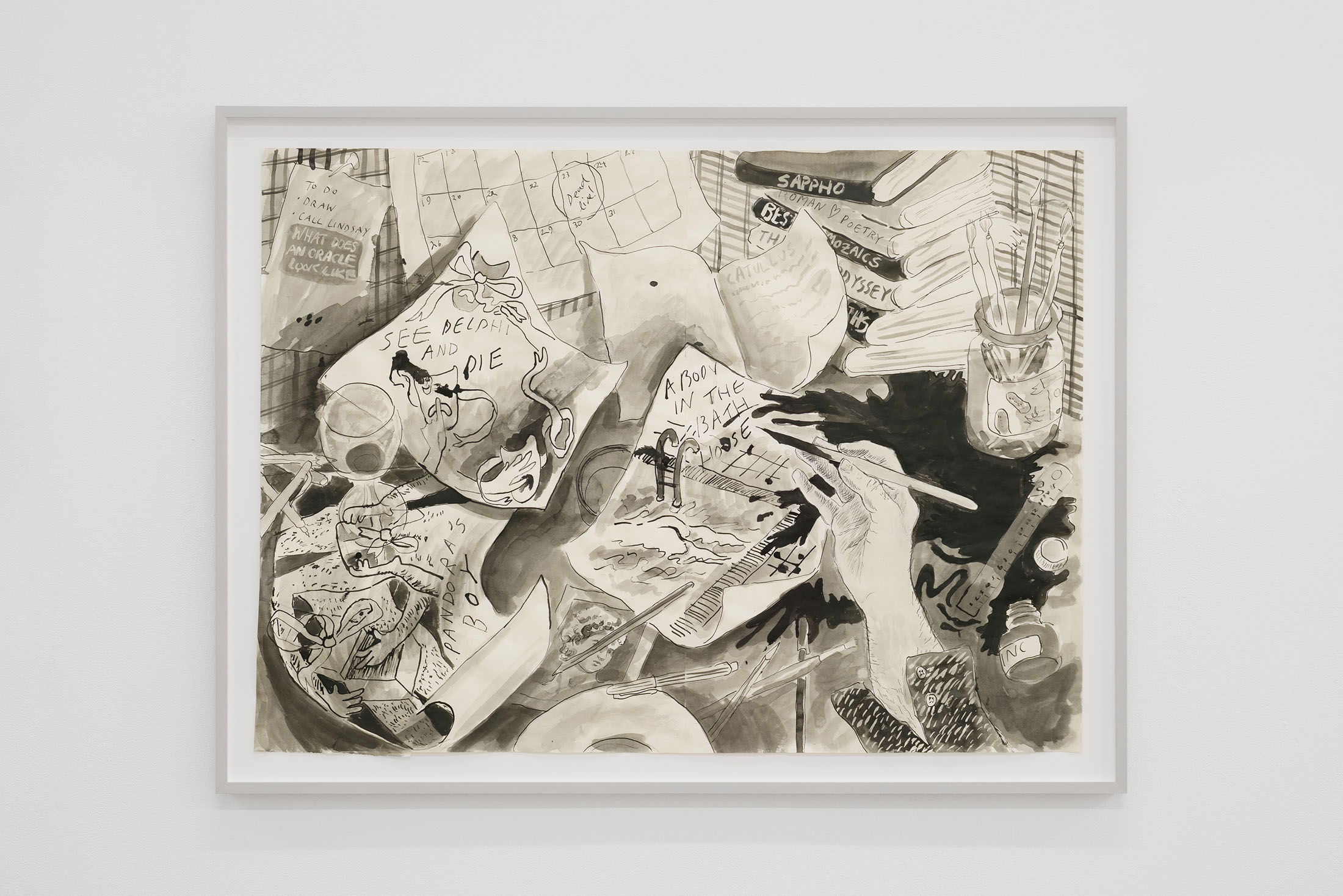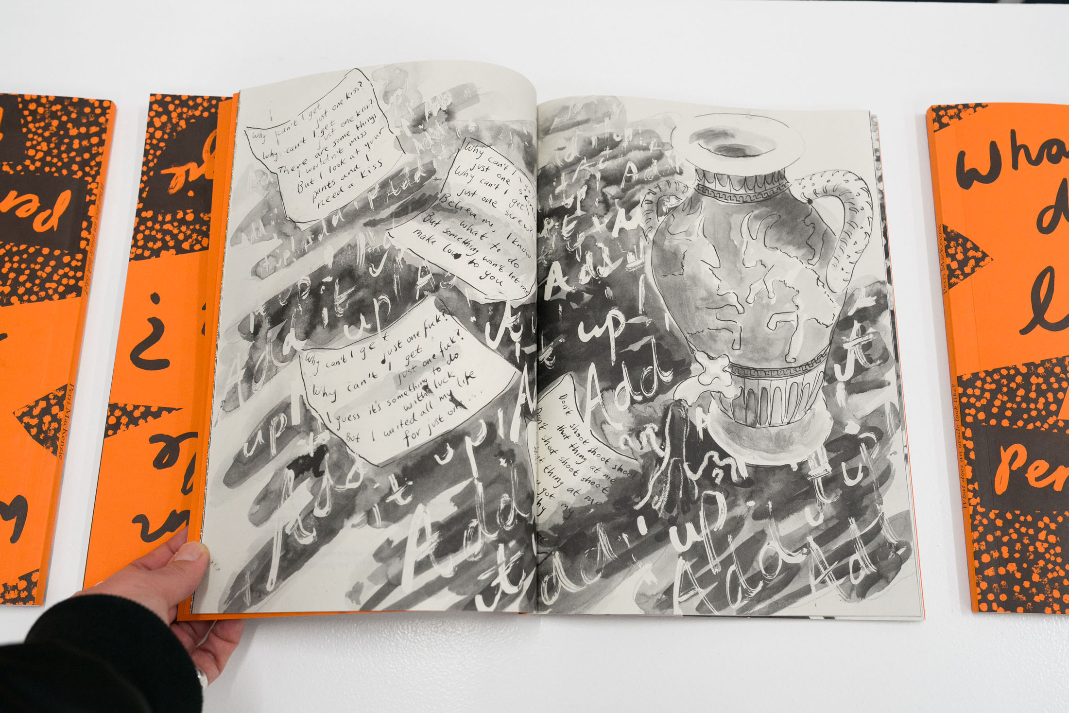What does an oracle look like? gathers essays and drawings made by Perri MacKenzie between 2020 and 2024, themed loosely around pottery painting and vocal expression. The drawings, rendered in splashy India ink and collage, range from expressive sketches to theatrical still lives and experimental bandes dessinées. The book presents for the first time the essay ‘Cathedral’. Part memoir, part literary/sonic investigation, it meditates on the vocal texture of a Hollywood actor.