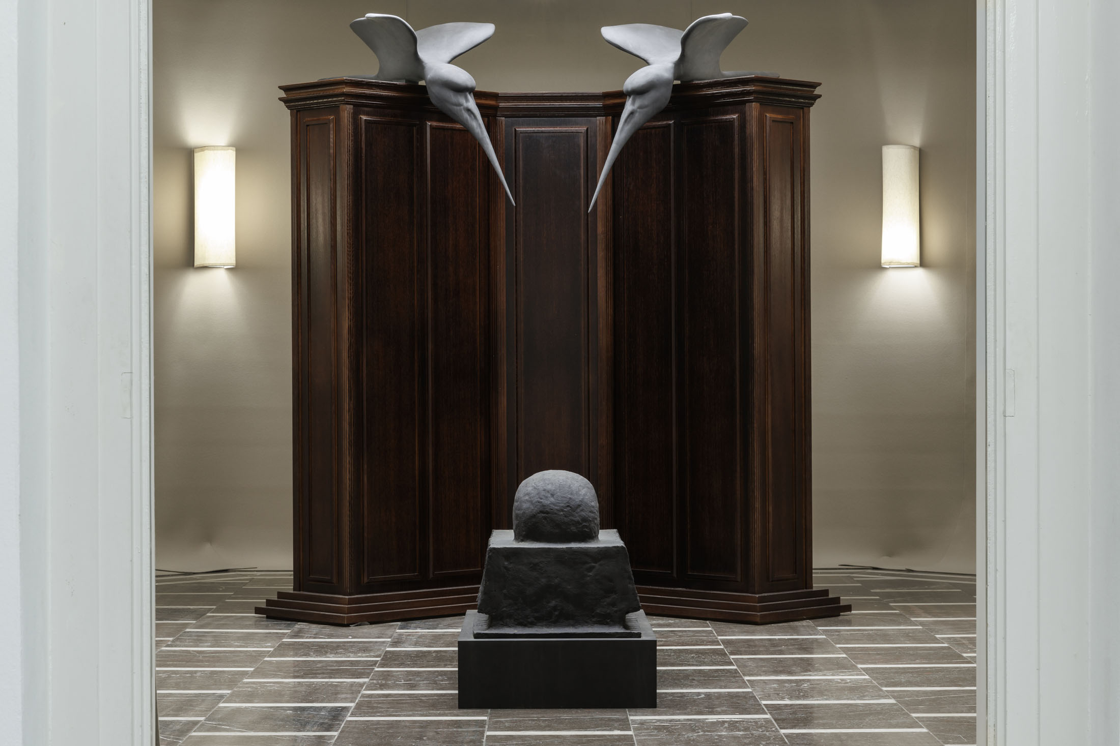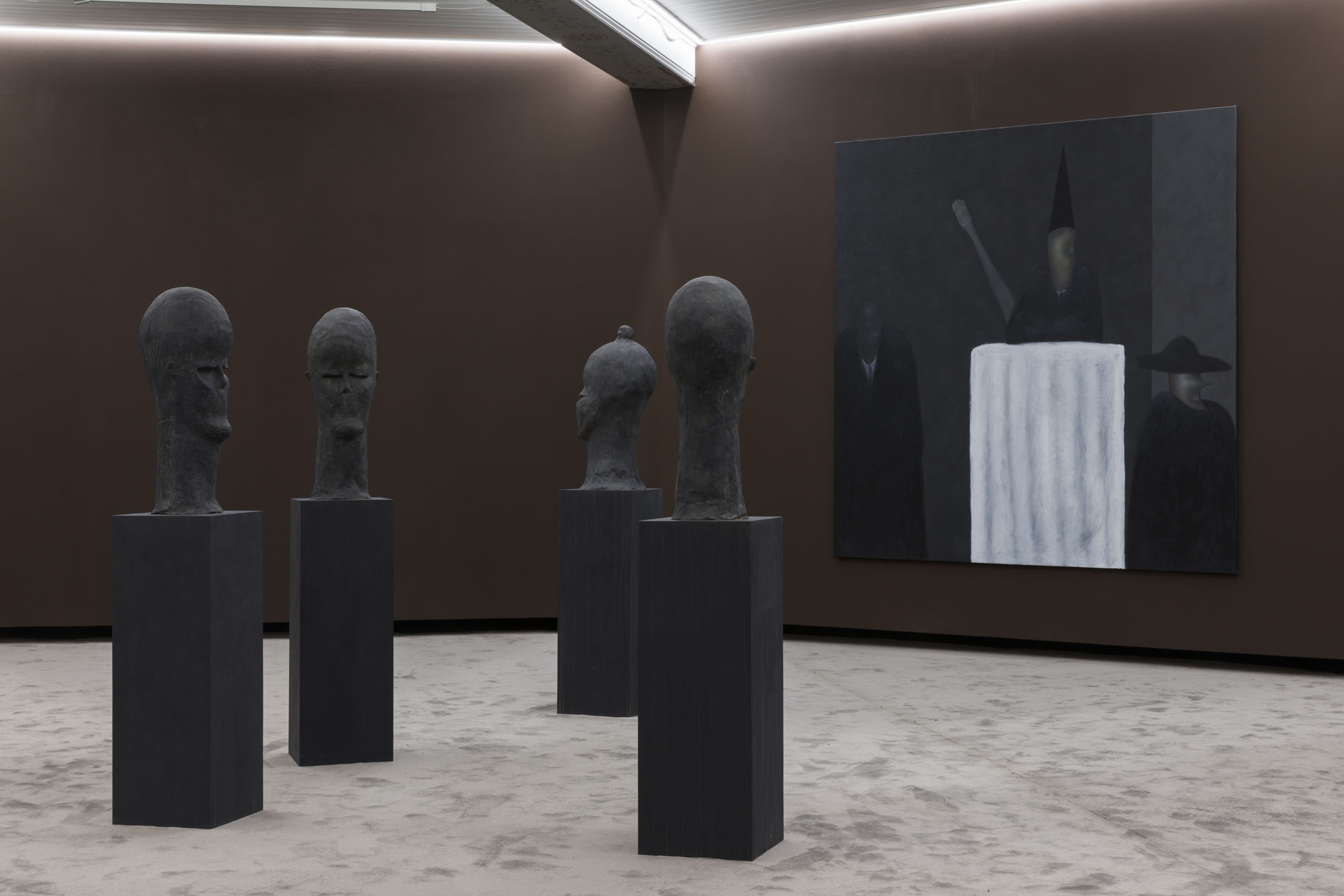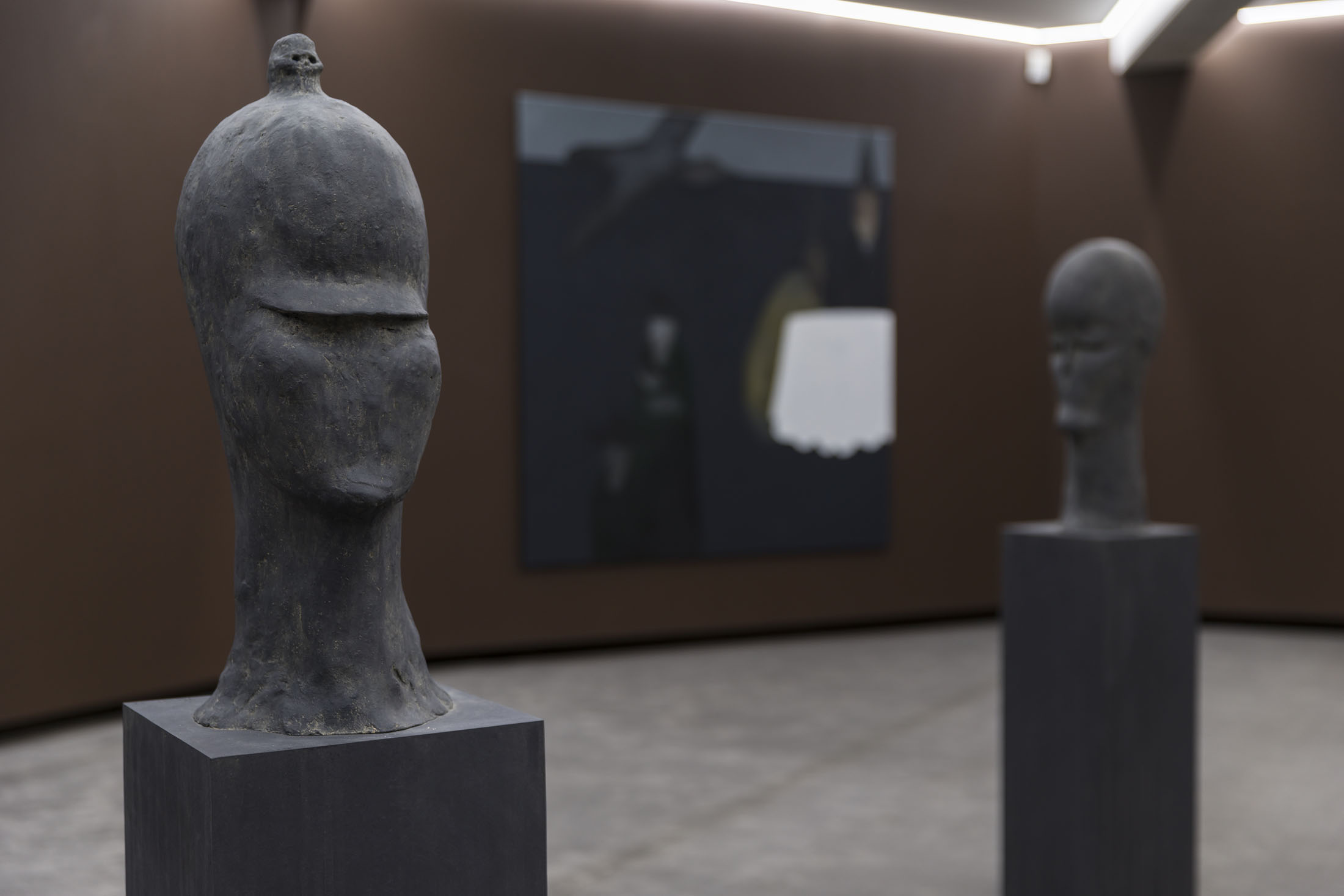 The architecture of Schinkel Pavillon, which is enclosed on the ground floor but opens into a glass-walled space above, mirrors the contrasts present in Taburet’s work—between interior and exterior, concealment and revelation. His paintings depict creatures merging human and animal characteristics, rendered with a mix of airbrushed gradients and precise brushstrokes. These figures oscillate between presence and absence, reflecting his interest in shifting identities and psychological states. Alongside his paintings, the exhibition features bronze sculptures that bring his pictorial subjects into three-dimensional space, reinforcing themes of metamorphosis and duality.