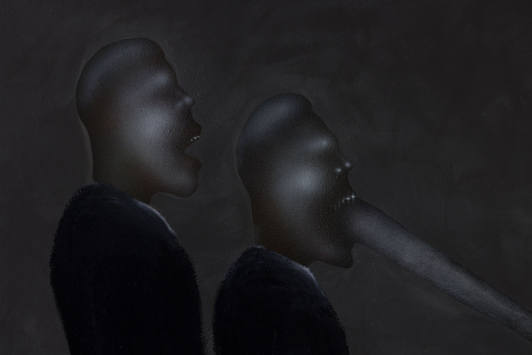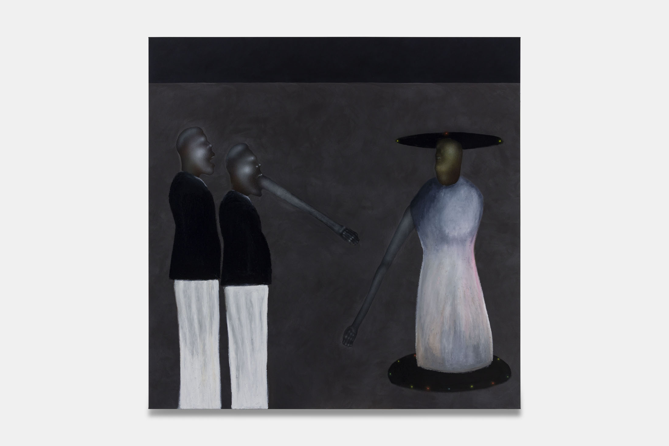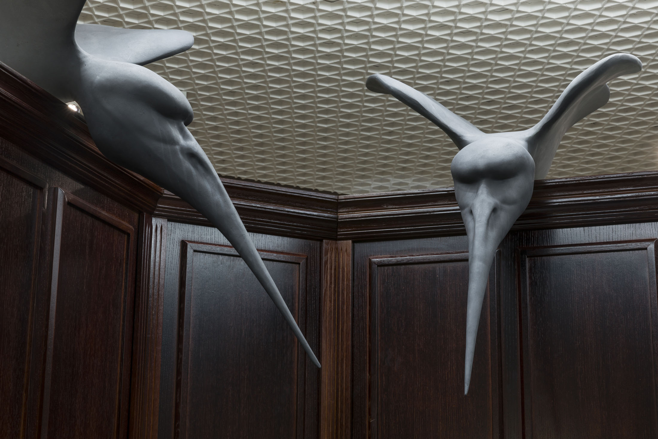 The architecture of Schinkel Pavillon, which is enclosed on the ground floor but opens into a glass-walled space above, mirrors the contrasts present in Taburet’s work—between interior and exterior, concealment and revelation. His paintings depict creatures merging human and animal characteristics, rendered with a mix of airbrushed gradients and precise brushstrokes. These figures oscillate between presence and absence, reflecting his interest in shifting identities and psychological states. Alongside his paintings, the exhibition features bronze sculptures that bring his pictorial subjects into three-dimensional space, reinforcing themes of metamorphosis and duality.