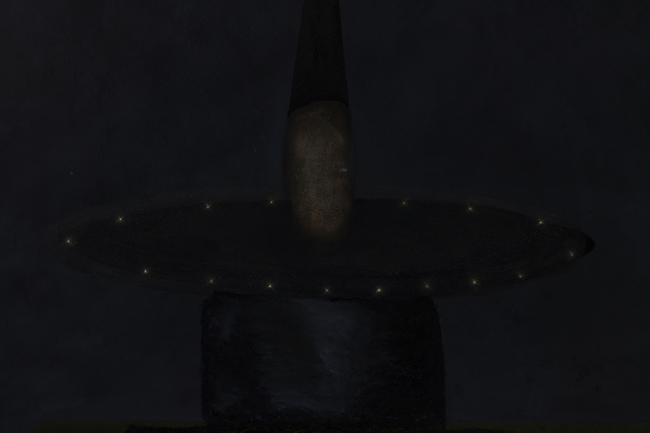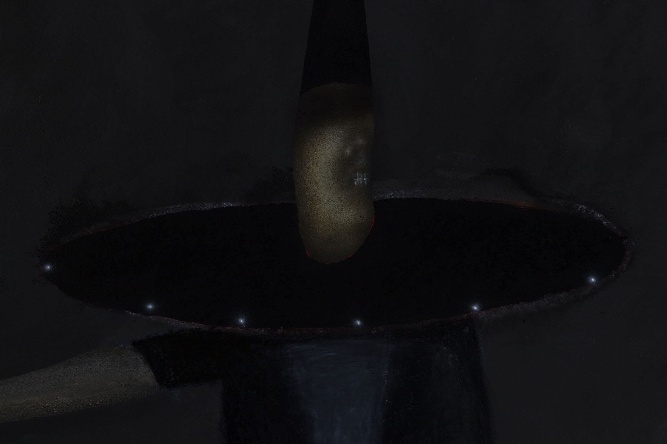 At the heart of the exhibition lies the legend of Papa Tonnerre, a mute figure burdened with the secrets of others. In his silence, he becomes the village’s confessor, carrying the weight of desires, vices, and fears on his body. Seeking release, he strikes a deal with a witch, gaining speech in exchange for a set of stolen relics: a bell, a trumpet, a beast-headed vial, and some pepper. But his newfound voice leads to his downfall—overcome by rage, he betrays those who once trusted him, unleashing their darkest truths upon the world. His punishment is exile, condemned to speak forever into the void, never to be heard again.