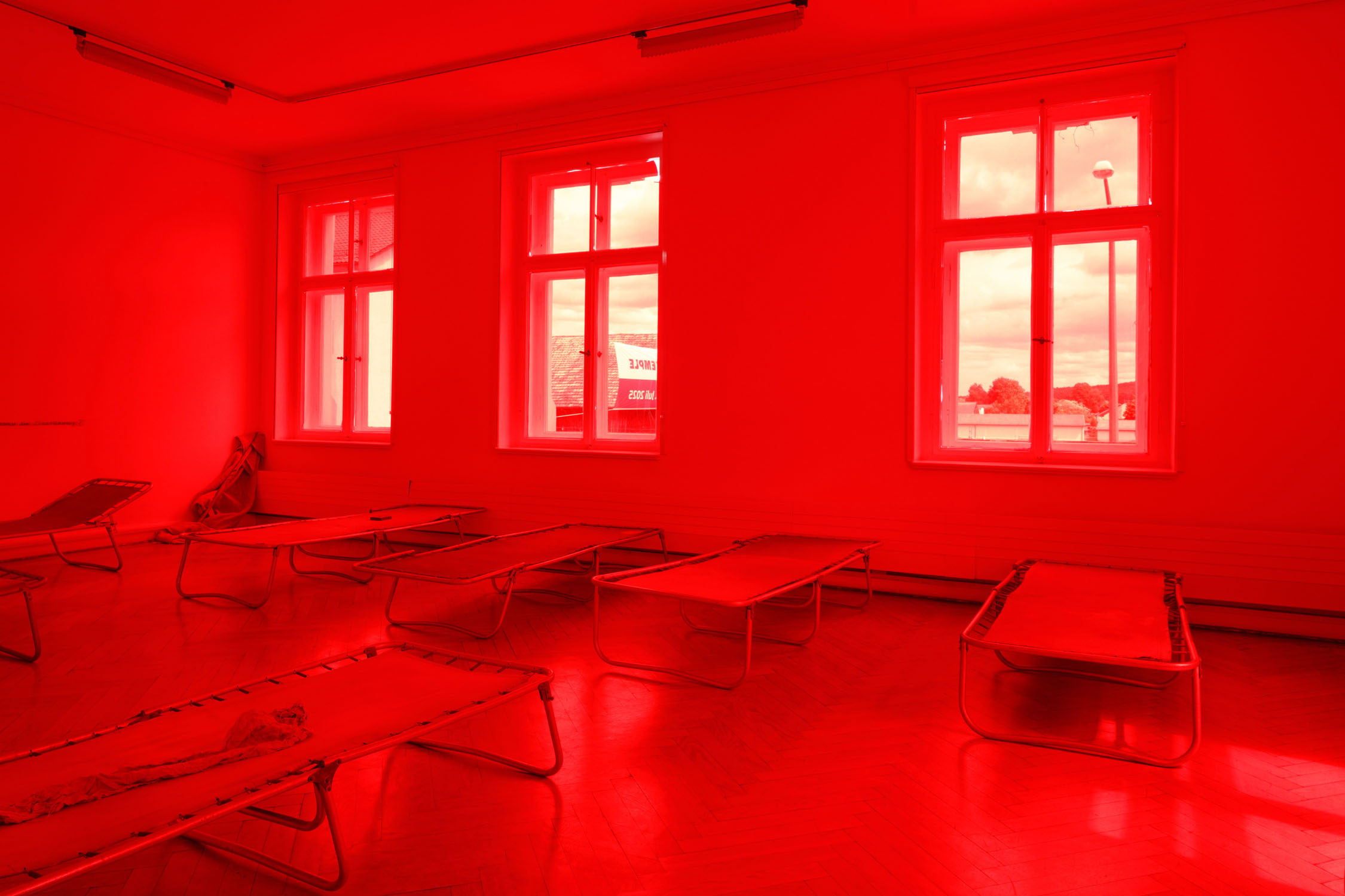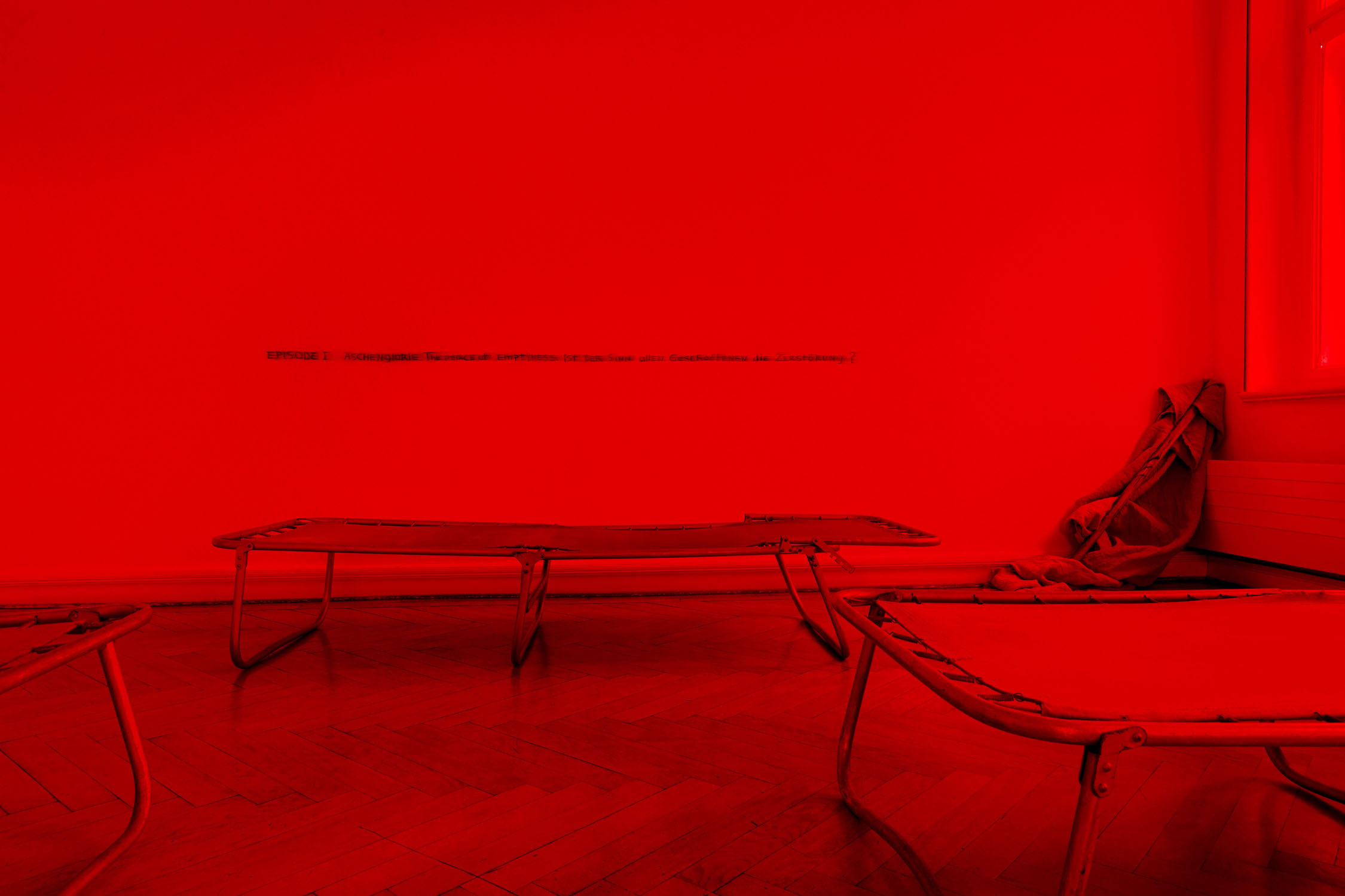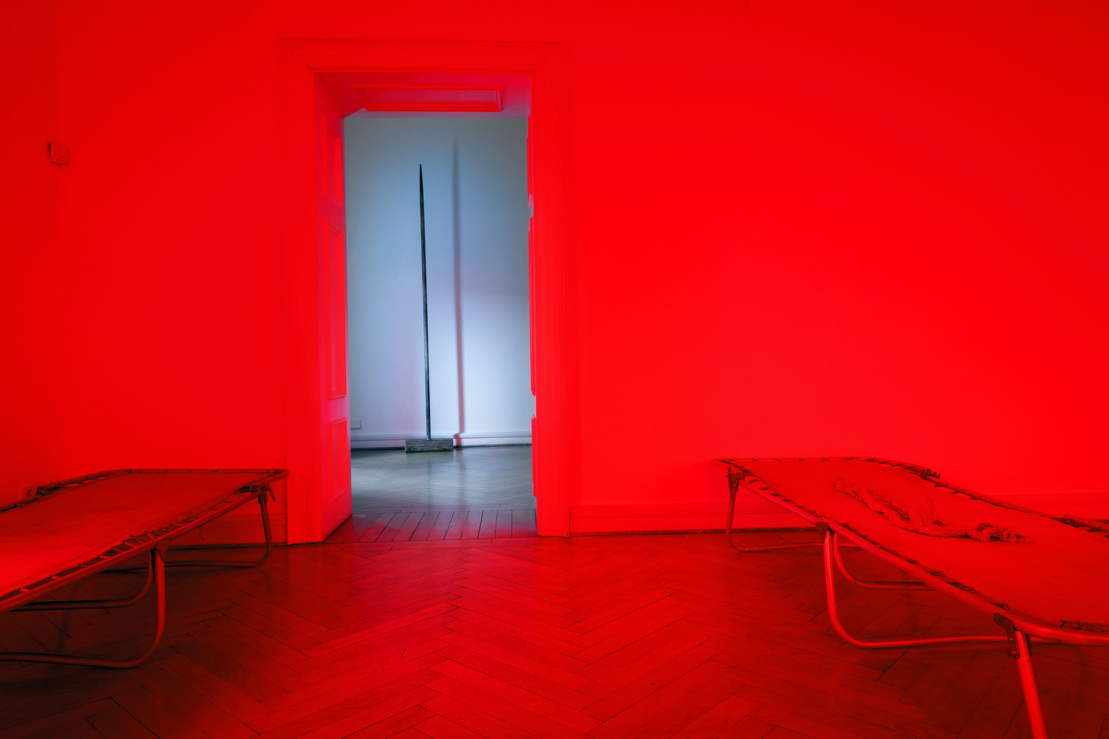 In this room, the viewer is invited to sit on the floor between the beds and contemplate the place of emptiness, becoming a part of it. Imagine that everything around has disappeared, except for yourself there is nothing left, this world has reached its apogee, having gained complete control, has lost everything. It is about political oppression that destroyed everything around, but this room and the landscape outside the window have stood and we can contemplate this red light of a new world.