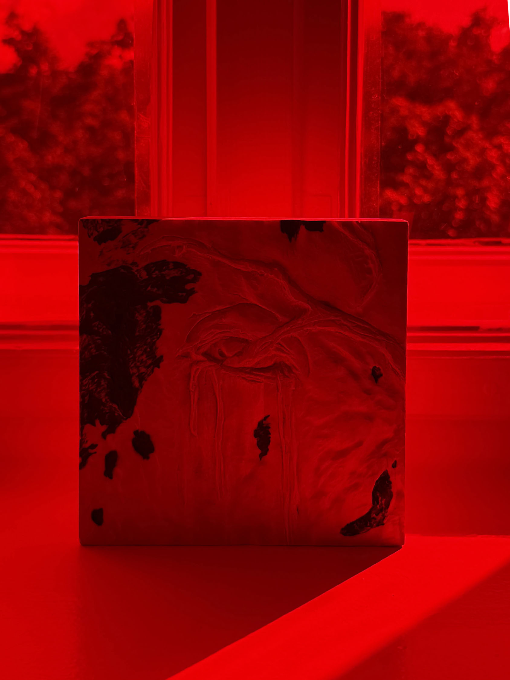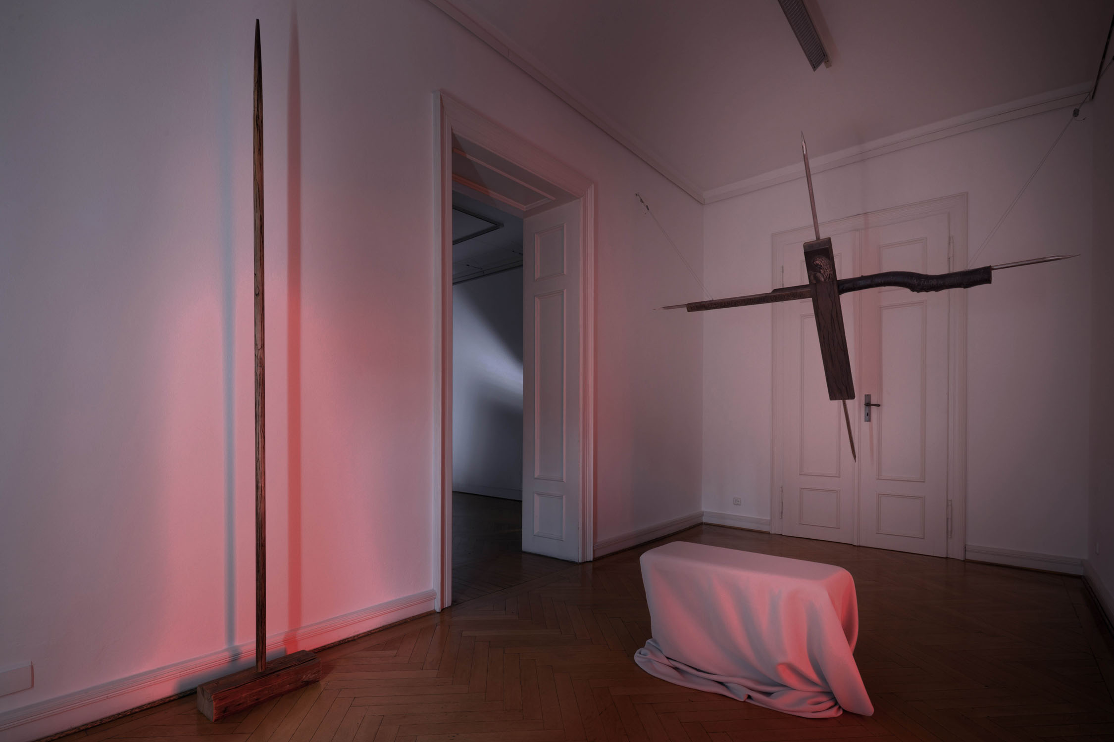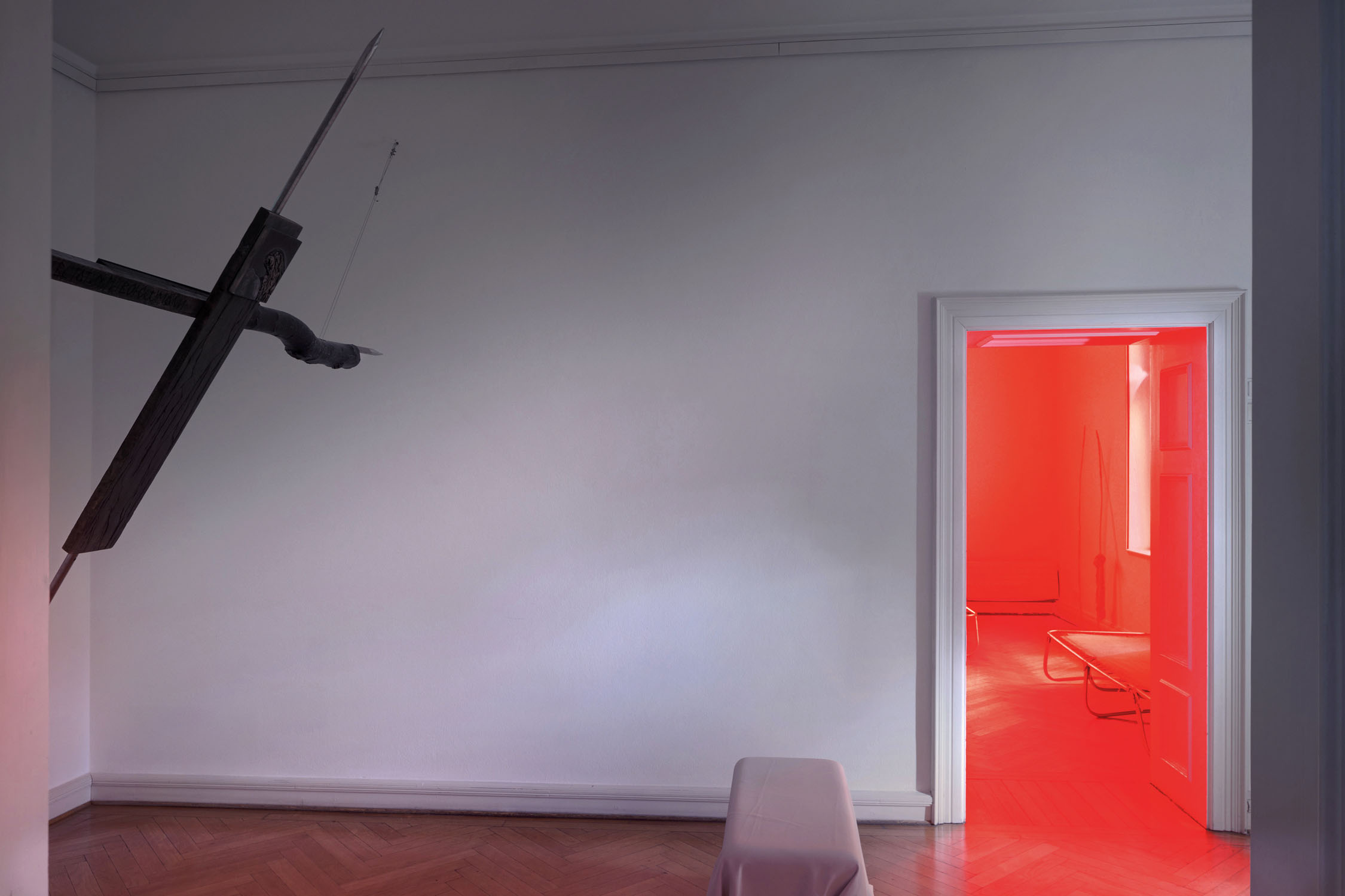 In this room, the viewer is invited to sit on the floor between the beds and contemplate the place of emptiness, becoming a part of it. Imagine that everything around has disappeared, except for yourself there is nothing left, this world has reached its apogee, having gained complete control, has lost everything. It is about political oppression that destroyed everything around, but this room and the landscape outside the window have stood and we can contemplate this red light of a new world.