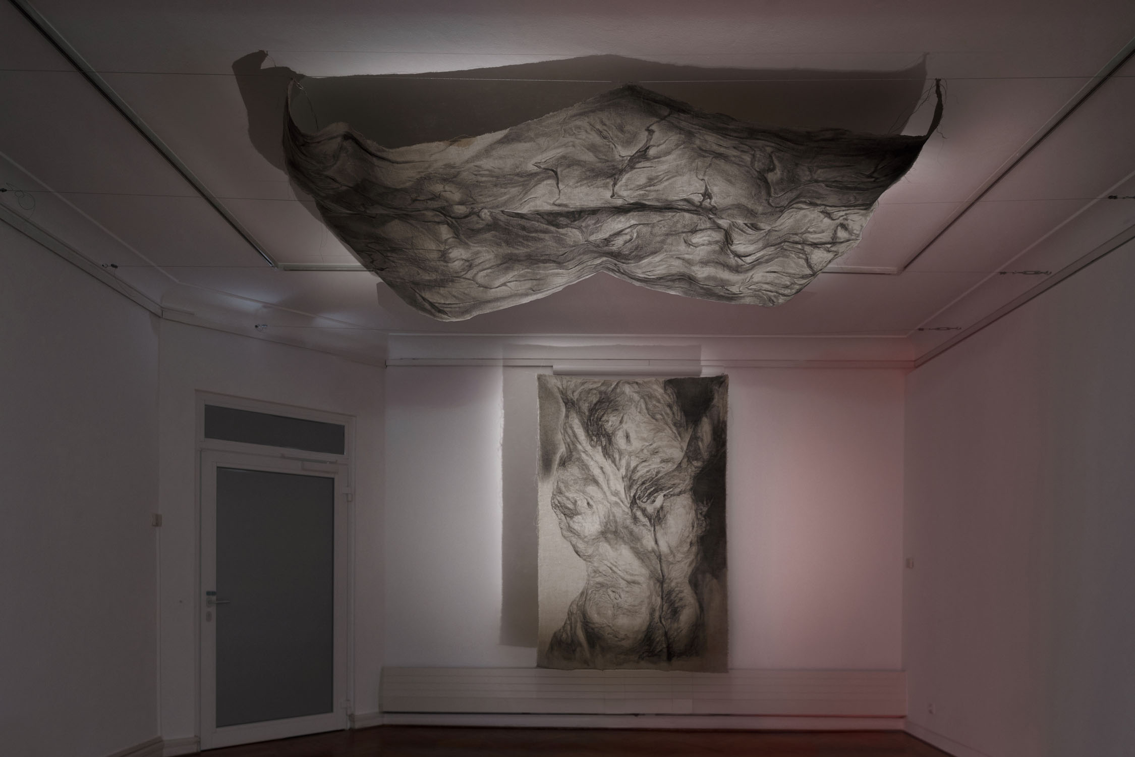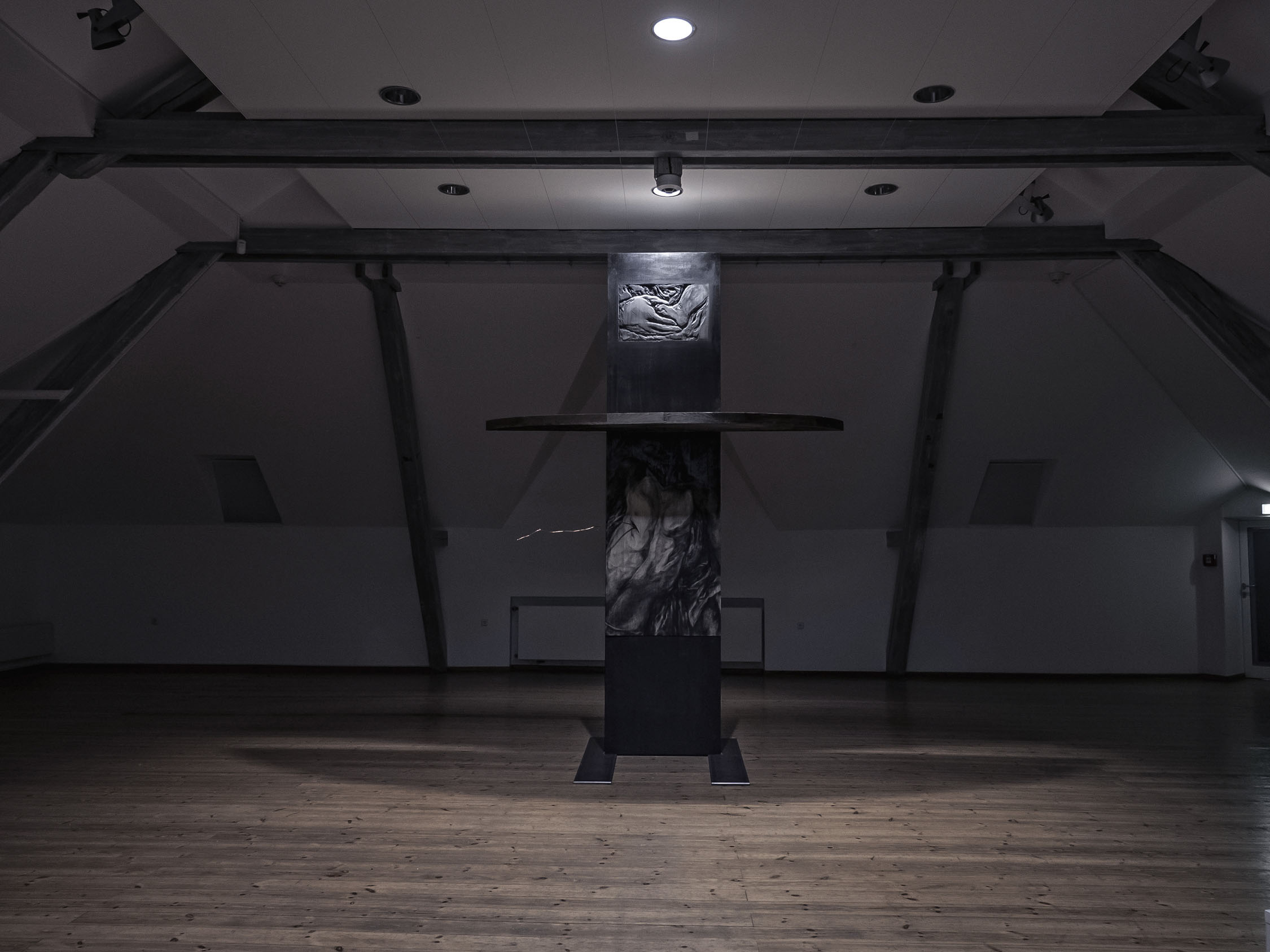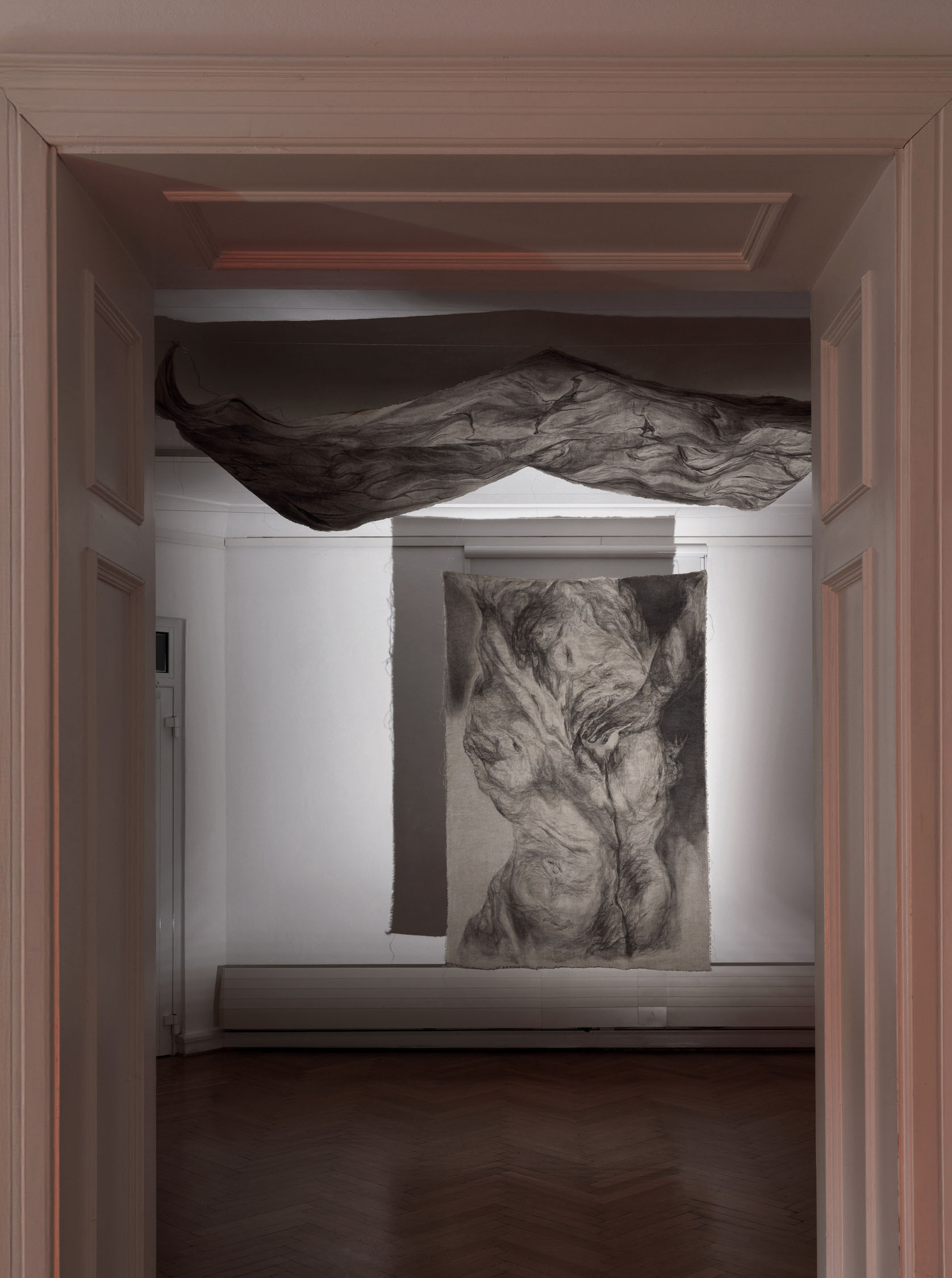 The exhibition will include paintings, on unprimed linen fabric with special author palette of dark pigments, carved/burned -paintings that growing into monumental installations, all works made during the 2023−25 years