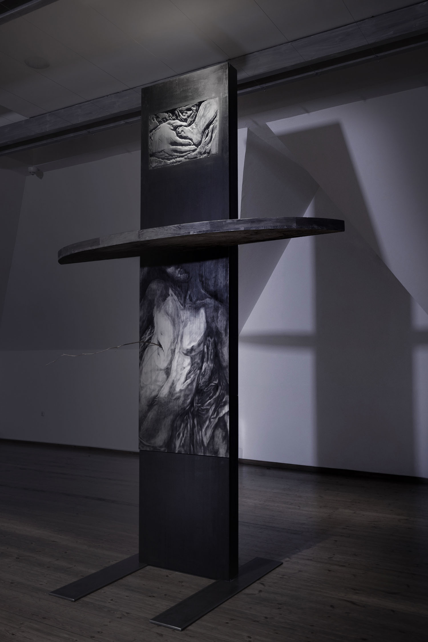 From an aesthetic and sense point of view, the exhibition is reminiscent of a temple, but with sacred images as artifacts of pain in the modern world through the prism of suffering Christian images such as crucifixion.