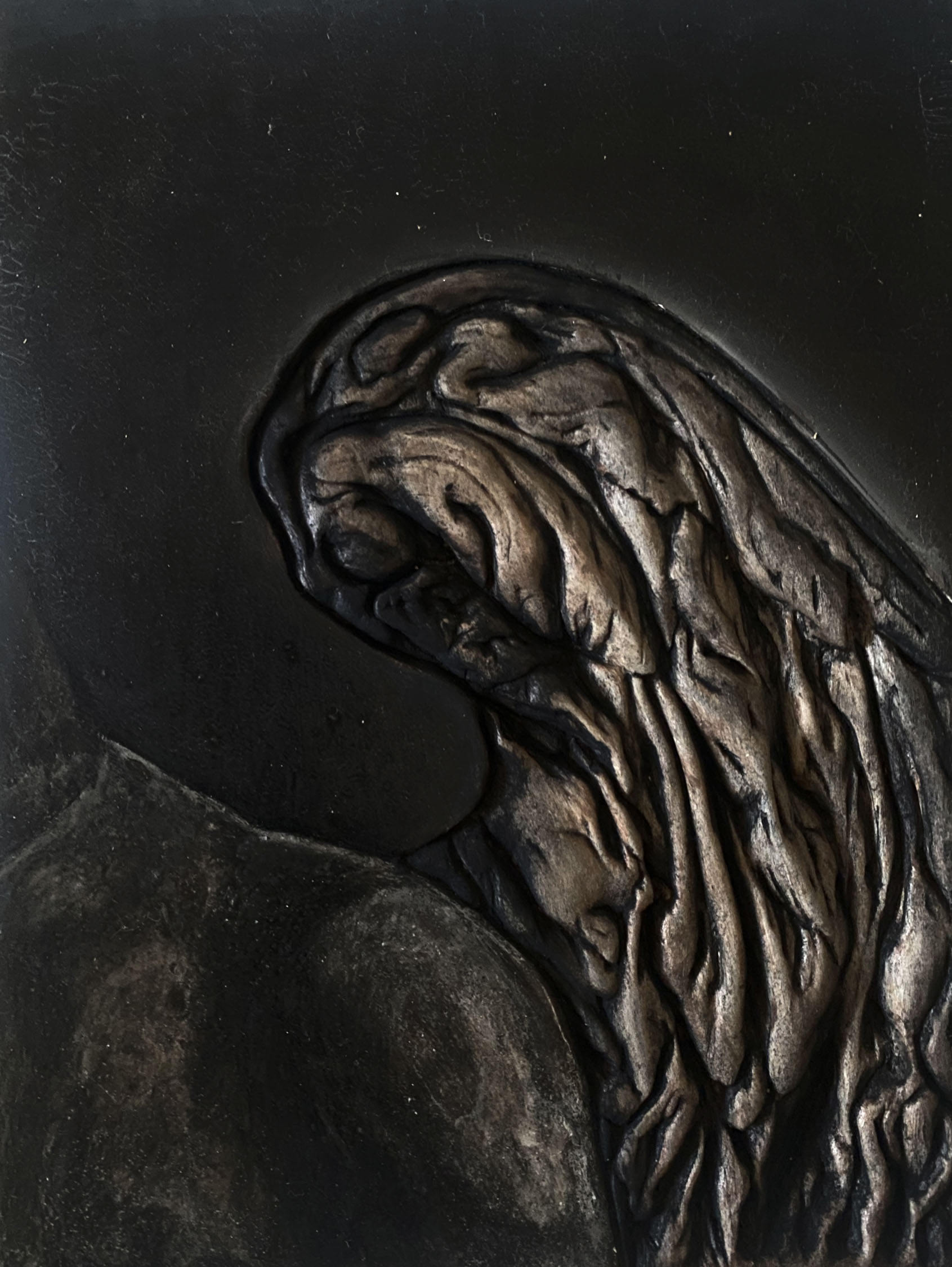 In the crowning image of the painting, an important conflict is birth while contemplating death, which is the highest point of the stele, where the mother’s hand holds the leg of her son, which refers to the Madonna and Child, it seems that resurrection for a person is about overcoming time, when you can rewind memories to the moment that was filled with the greatest happiness, perhaps this will also provoke reality.