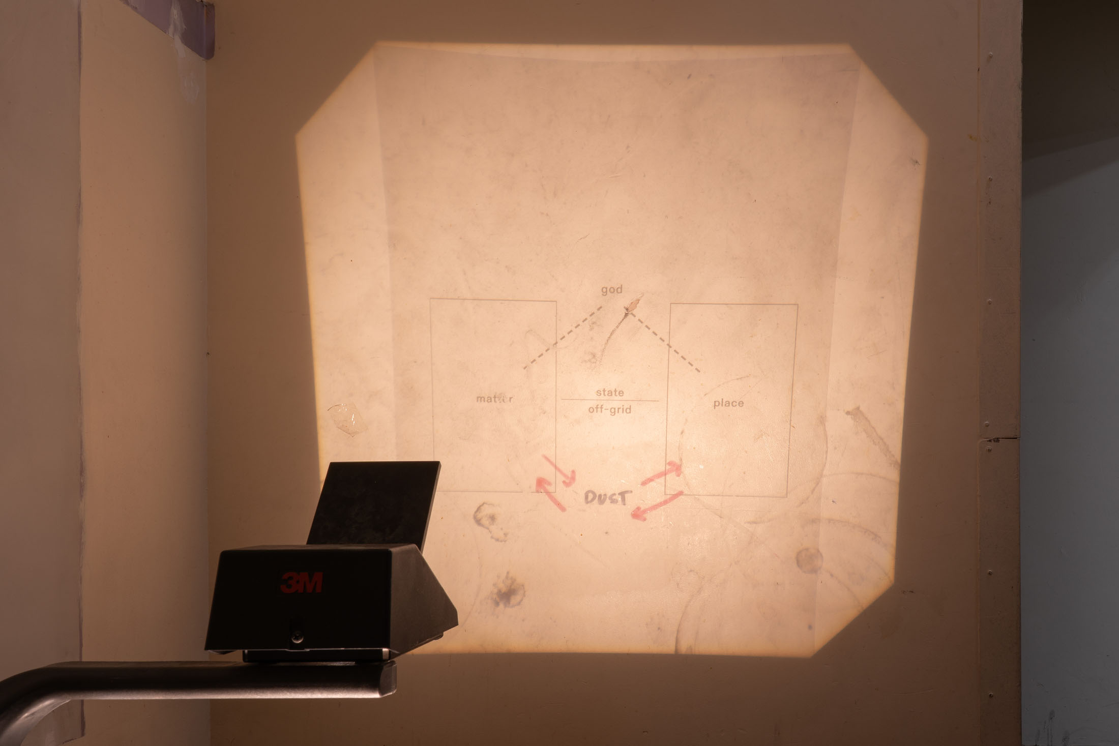 At the base of the stairwell, a projector echoes this networked logic. Surrounded by detritus within the deconstructed space, the projector reads not as a neutral viewing apparatus but as a working technology; popularized in the late 1940s for use in education, business, and military training, the projector carries with it a history of didactic authority and visual control. Here, it sits in marked contrast to the instability of the space it occupies, its continued operation underscoring a tension between function and obsolescence. The projected diagram introduces a theological register that the visual field pointedly fails to stabilize; religious language persists as a cultural force, yet its capacity to organize meaning has collapsed. It situates dust at the base, while divine authority sanctions the state above, holding matter and place in a vertical tension. Yet this hierarchy does not resolve into coherence. Instead, the diagram stages belief as a system whose organizing force persists culturally even as its visual and ideological foundations have eroded. Religious language remains operative, but no longer orders the field with certainty.