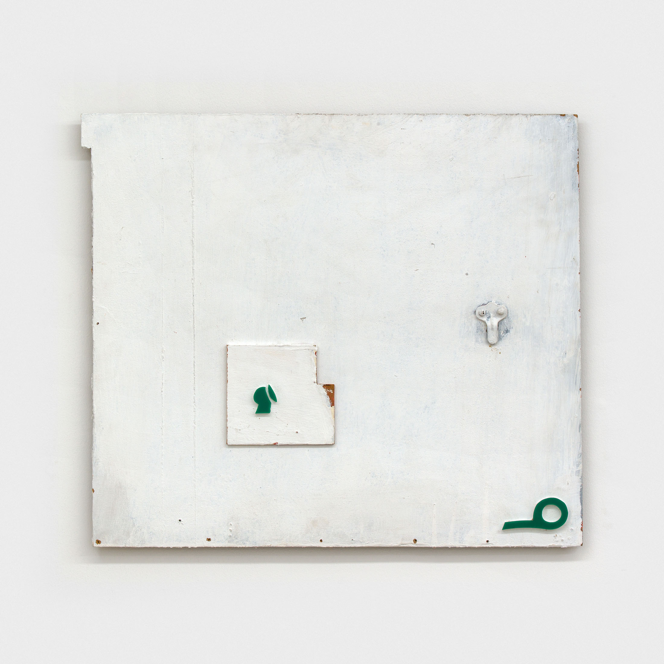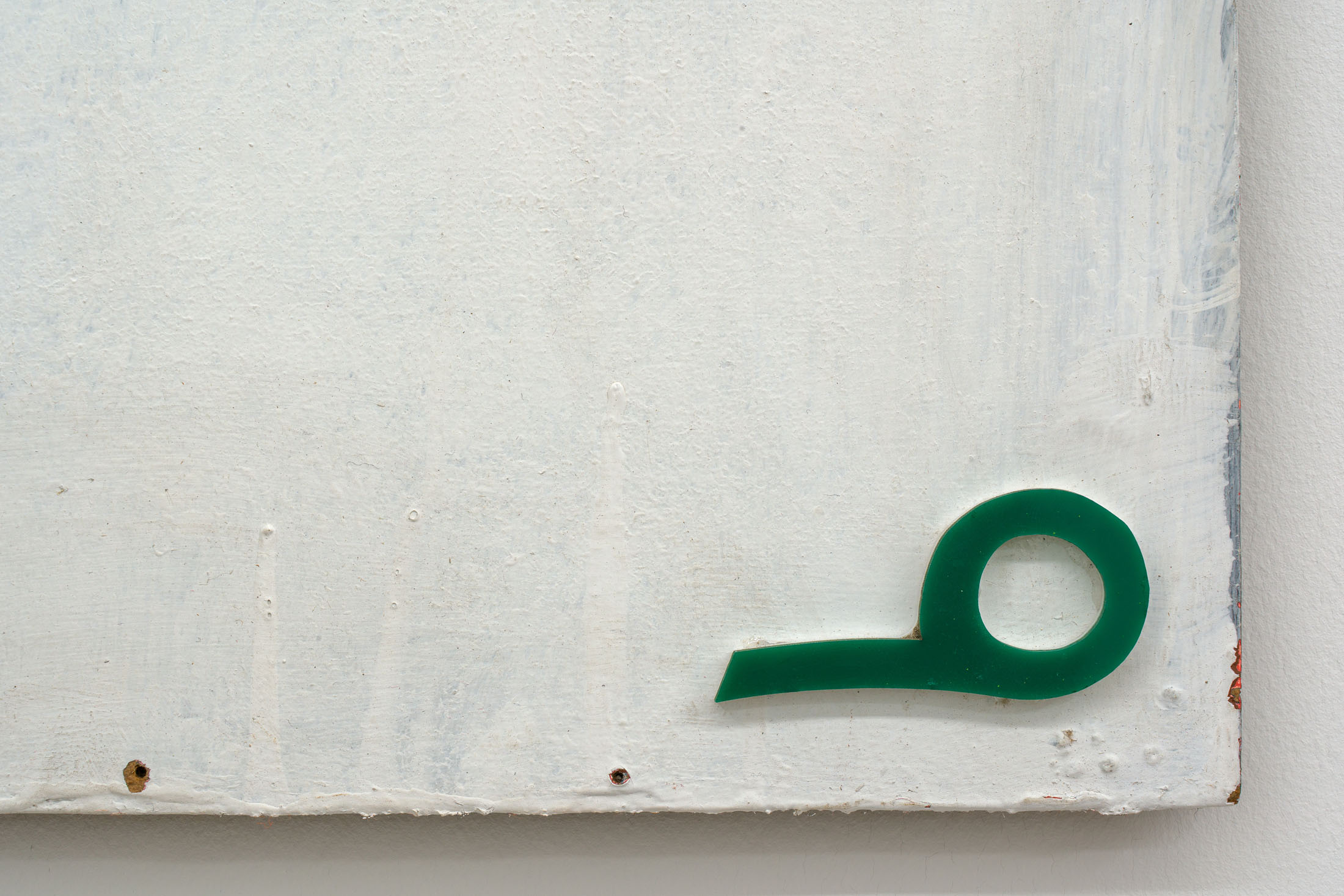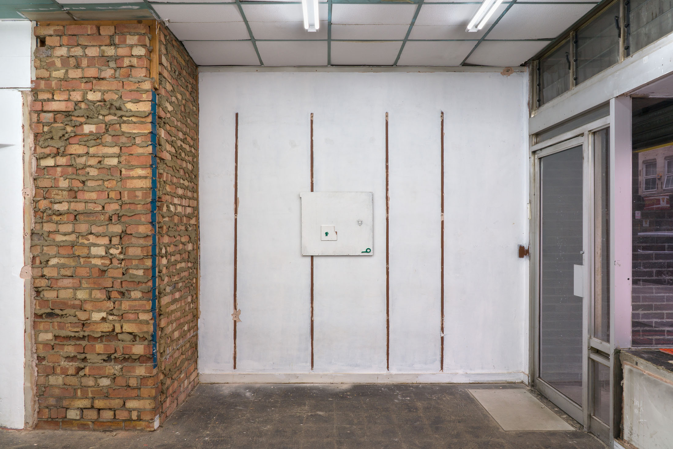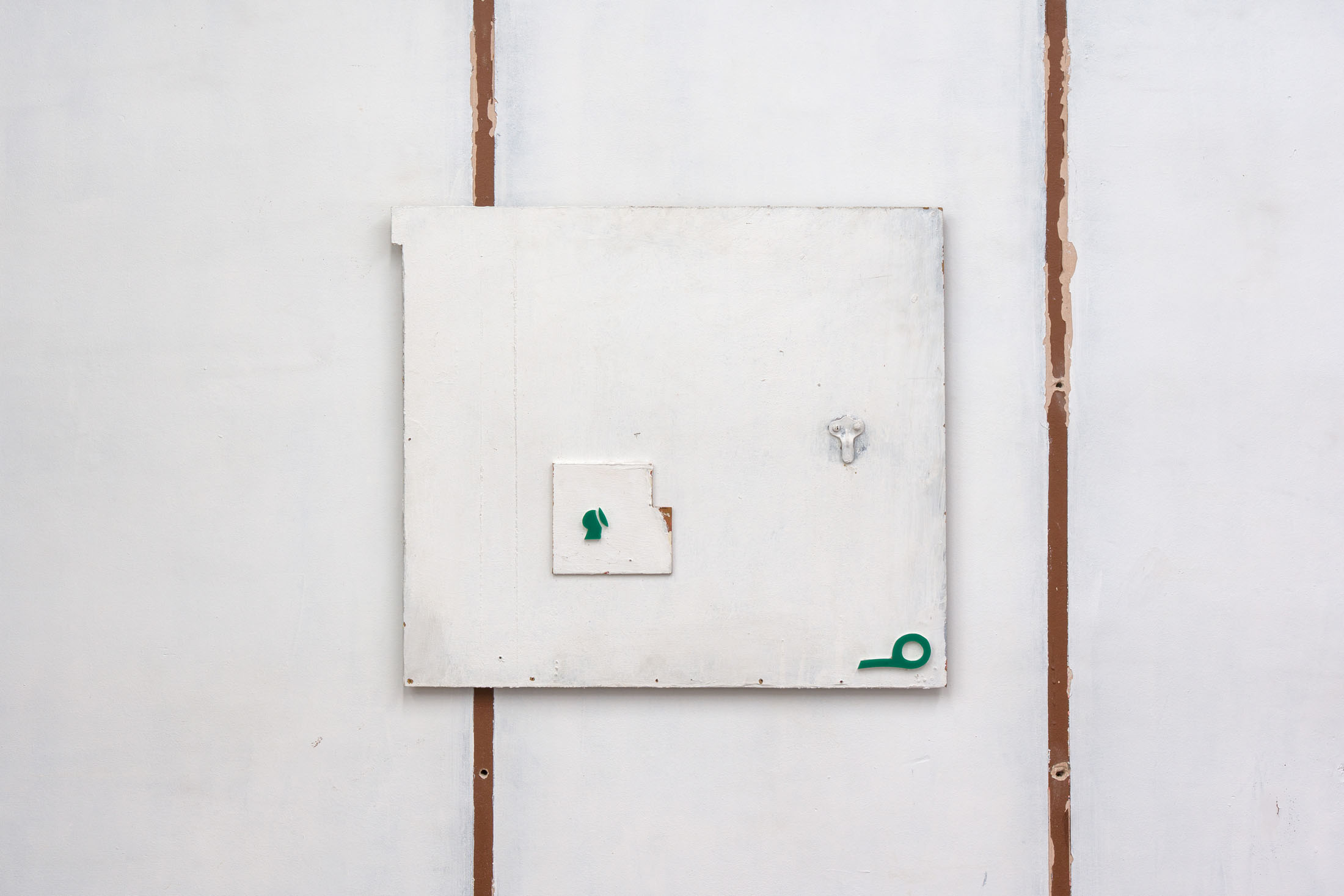 Through the floor tiles, brick bonds and ceiling panels, the grid surfaces in the architecture of the gallery’s ground floor. Absent shelf supports score sites of removal in regular intervals, each leaving a shallow rectangular scar, its edges softened by successive coats of paint. Moving through the space, the viewer encounters a grid that no longer stabilizes the visual field but instead indexes absence and erosion. This is the grid hollowed out: retained as a visual schema while stripped of its capacity to order meaning.