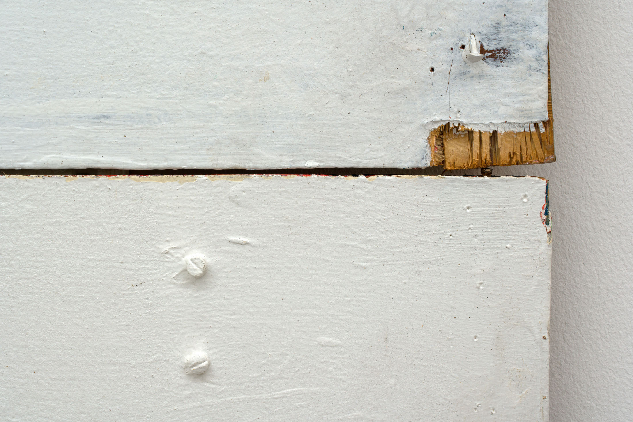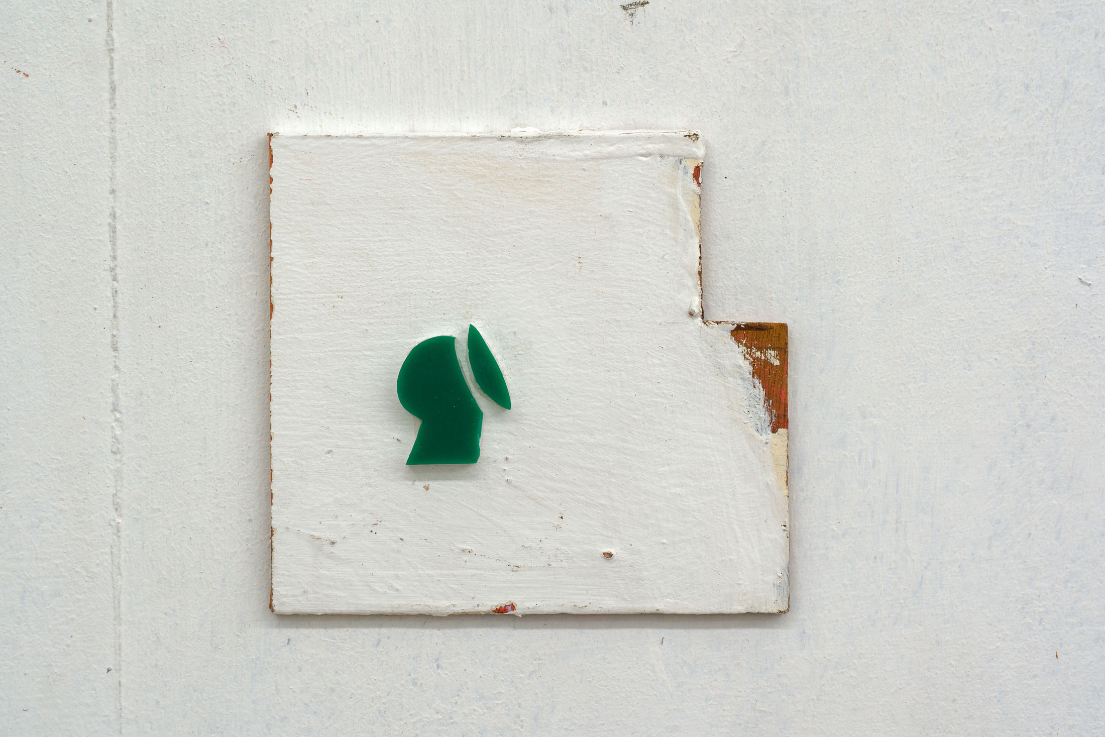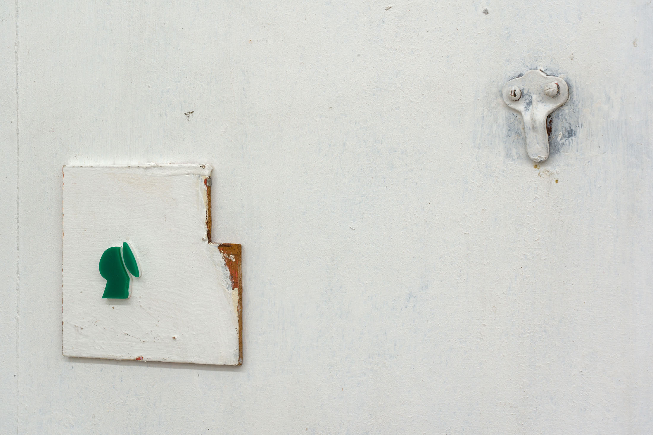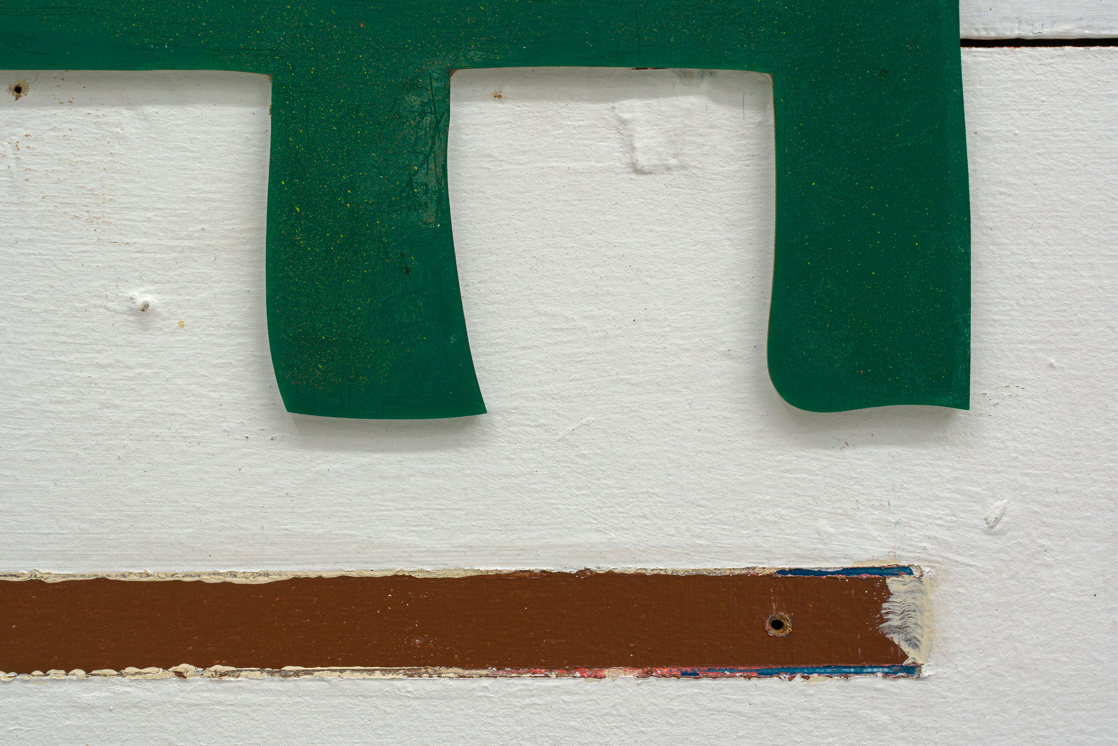 Through the floor tiles, brick bonds and ceiling panels, the grid surfaces in the architecture of the gallery’s ground floor. Absent shelf supports score sites of removal in regular intervals, each leaving a shallow rectangular scar, its edges softened by successive coats of paint. Moving through the space, the viewer encounters a grid that no longer stabilizes the visual field but instead indexes absence and erosion. This is the grid hollowed out: retained as a visual schema while stripped of its capacity to order meaning.