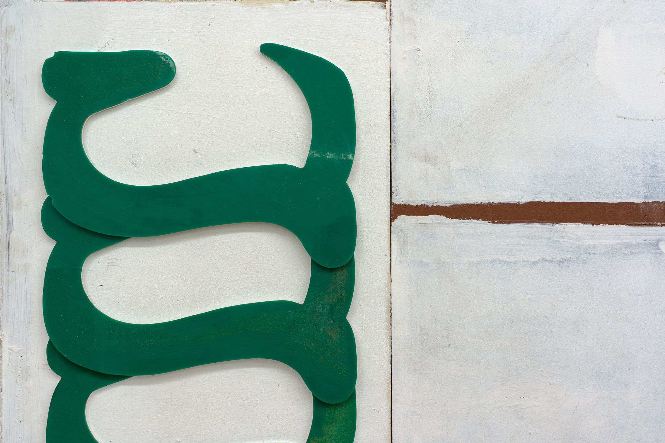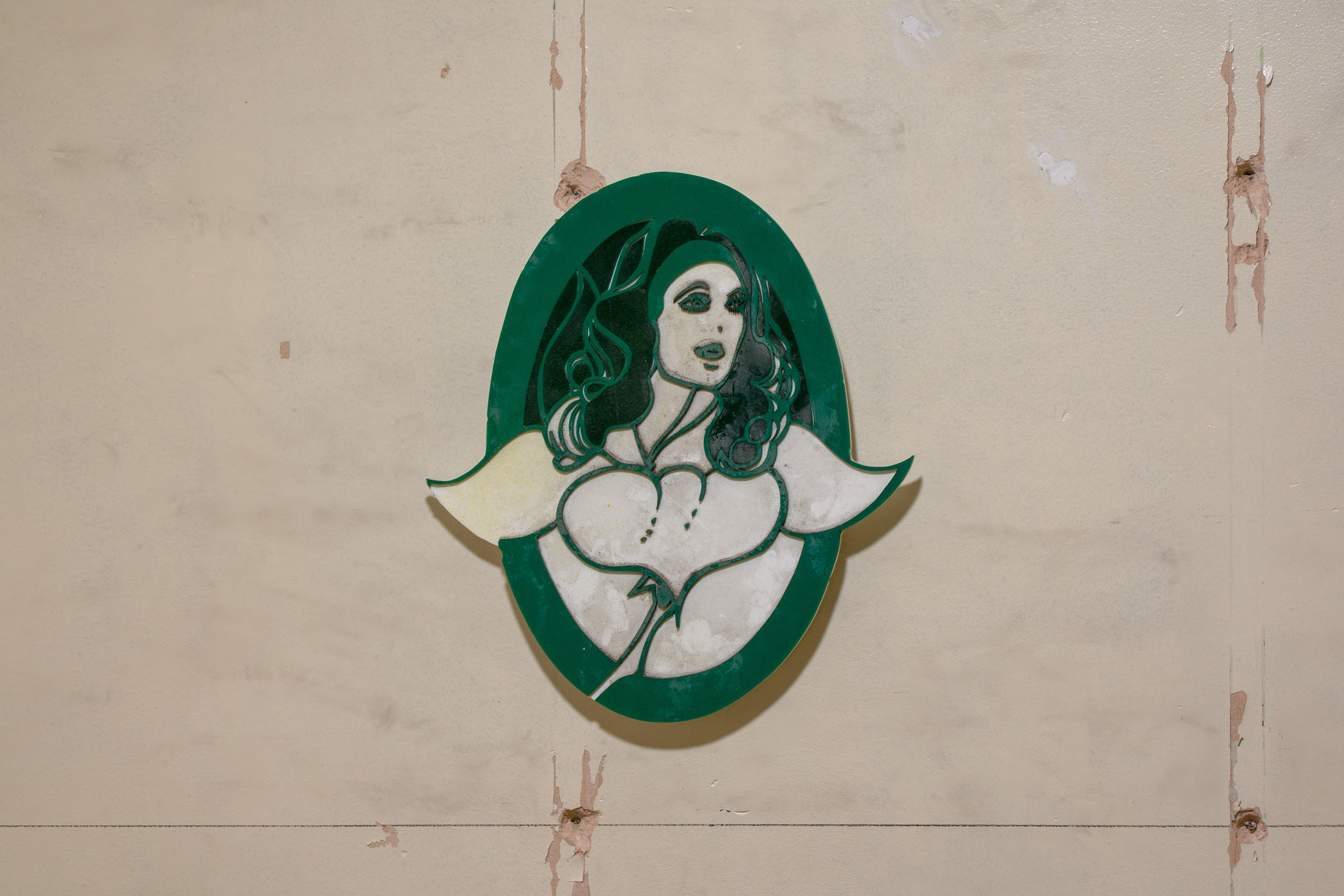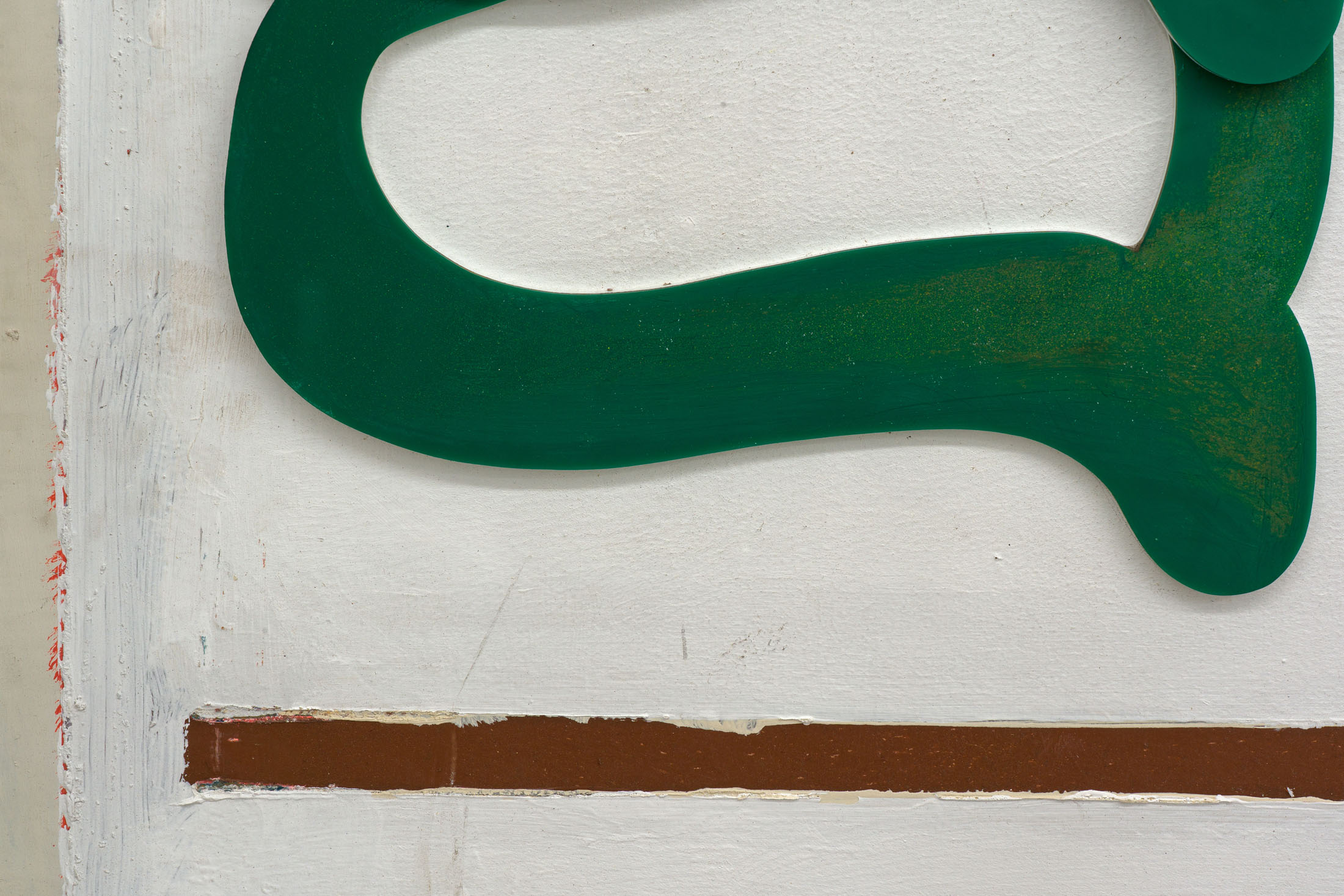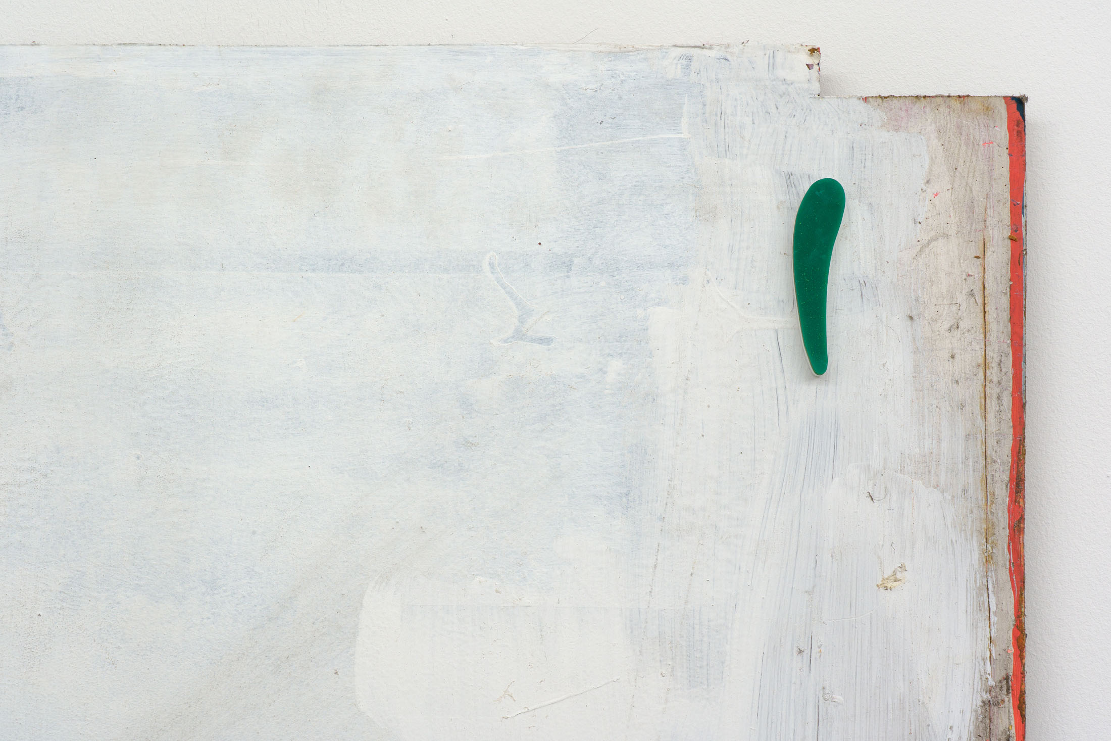 Through the floor tiles, brick bonds and ceiling panels, the grid surfaces in the architecture of the gallery’s ground floor. Absent shelf supports score sites of removal in regular intervals, each leaving a shallow rectangular scar, its edges softened by successive coats of paint. Moving through the space, the viewer encounters a grid that no longer stabilizes the visual field but instead indexes absence and erosion. This is the grid hollowed out: retained as a visual schema while stripped of its capacity to order meaning.